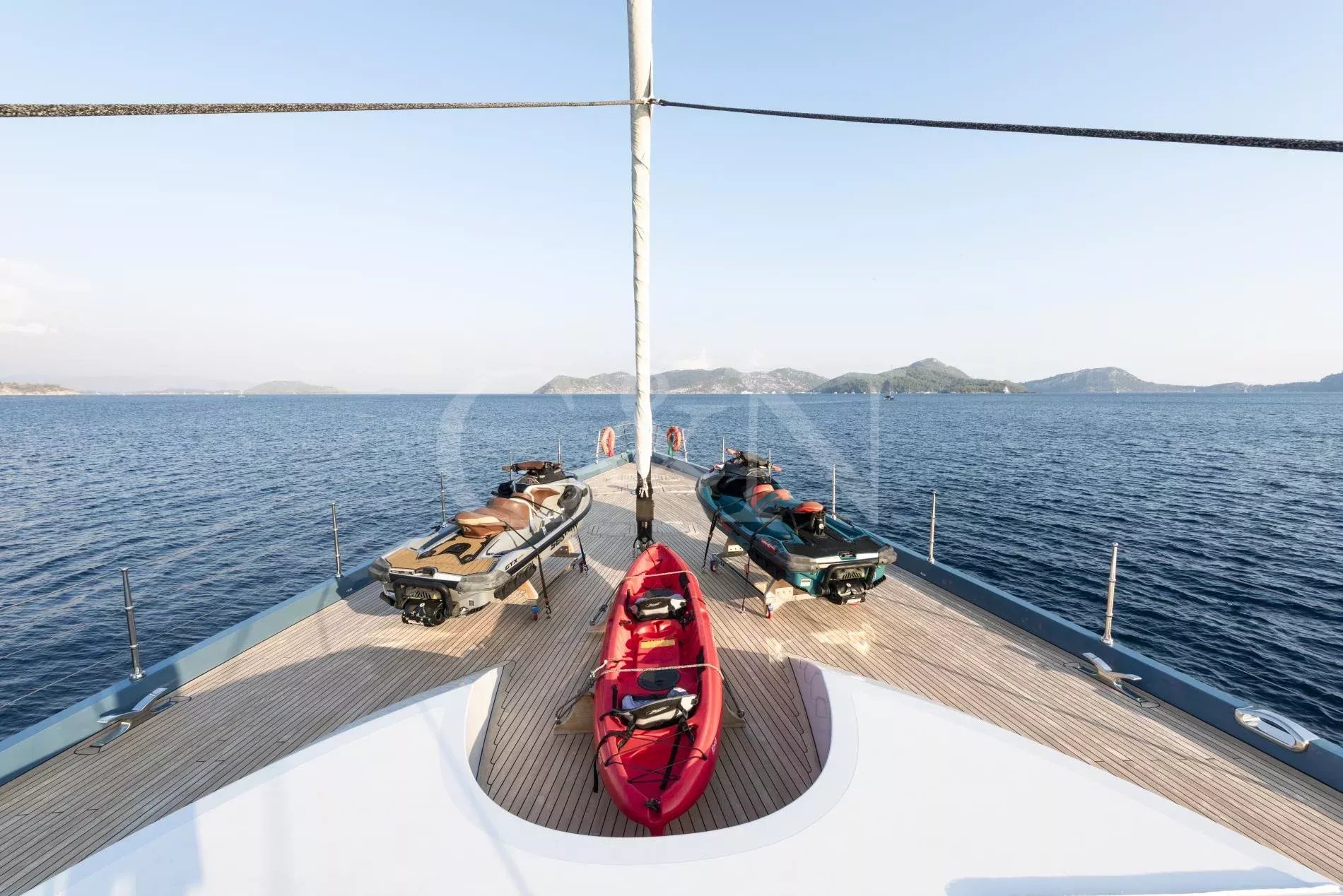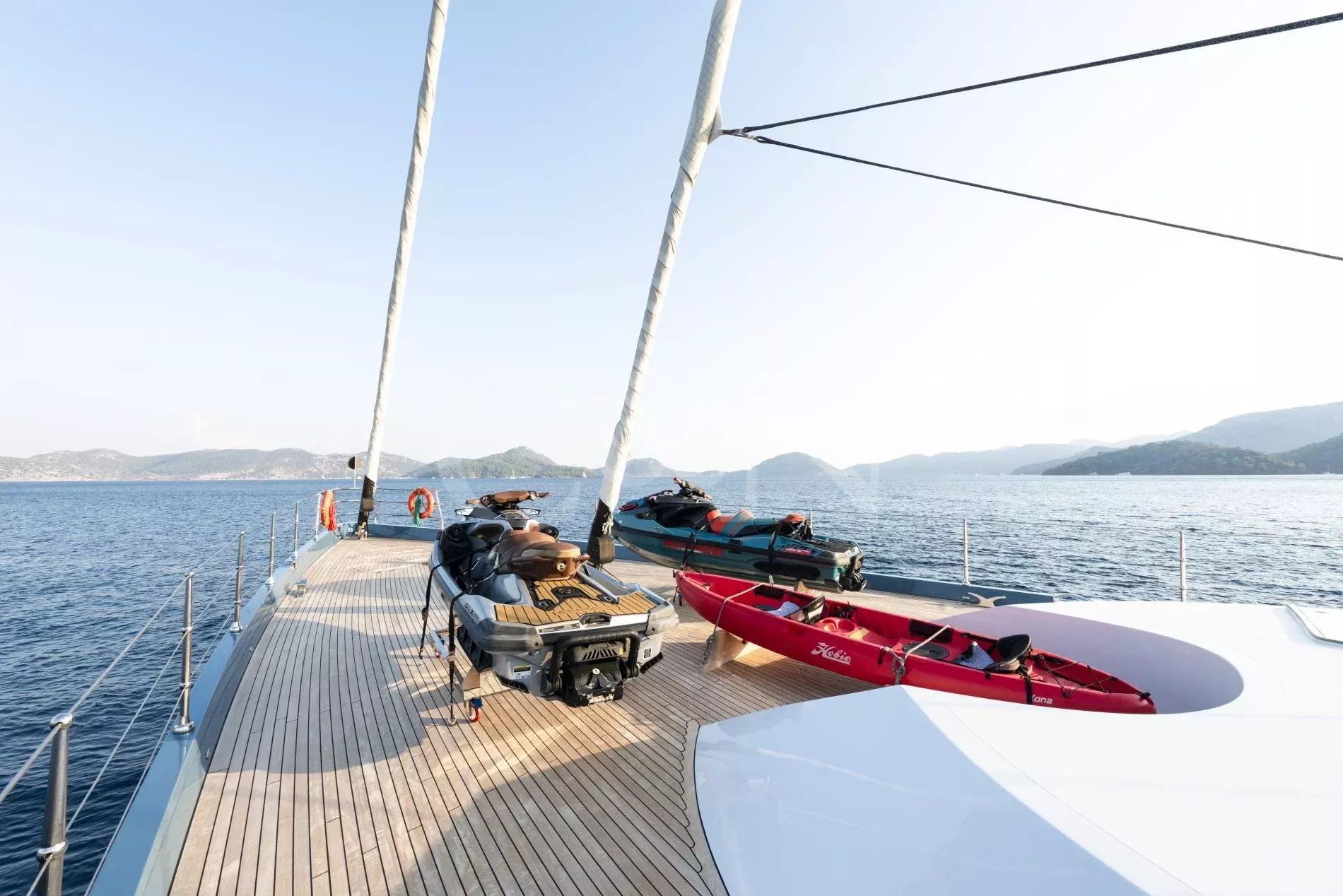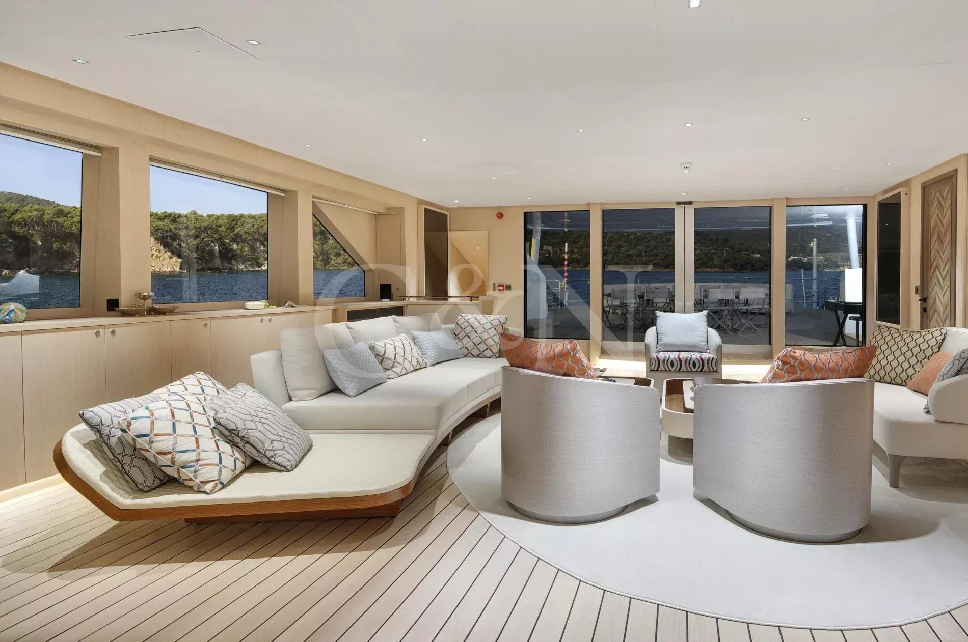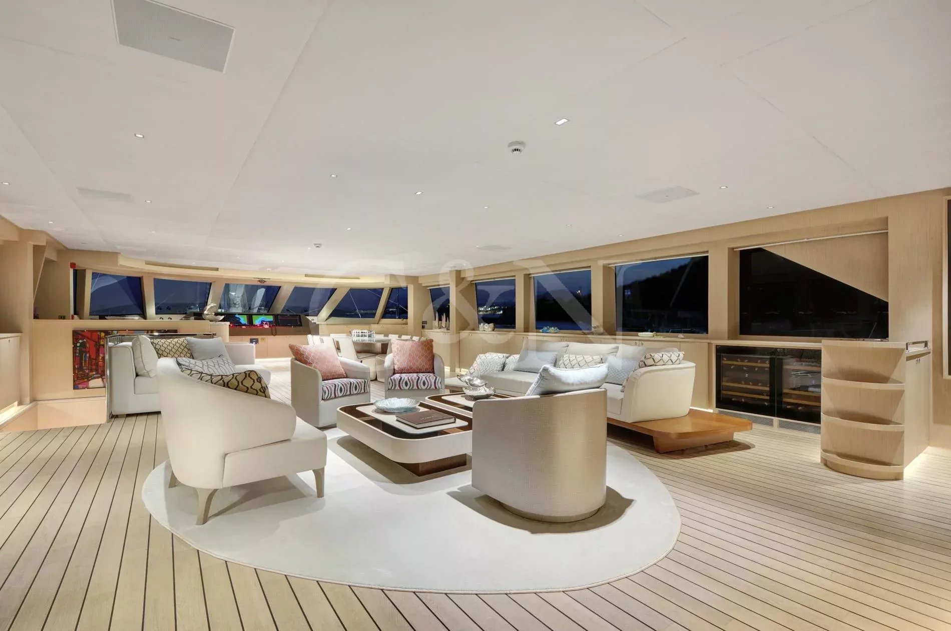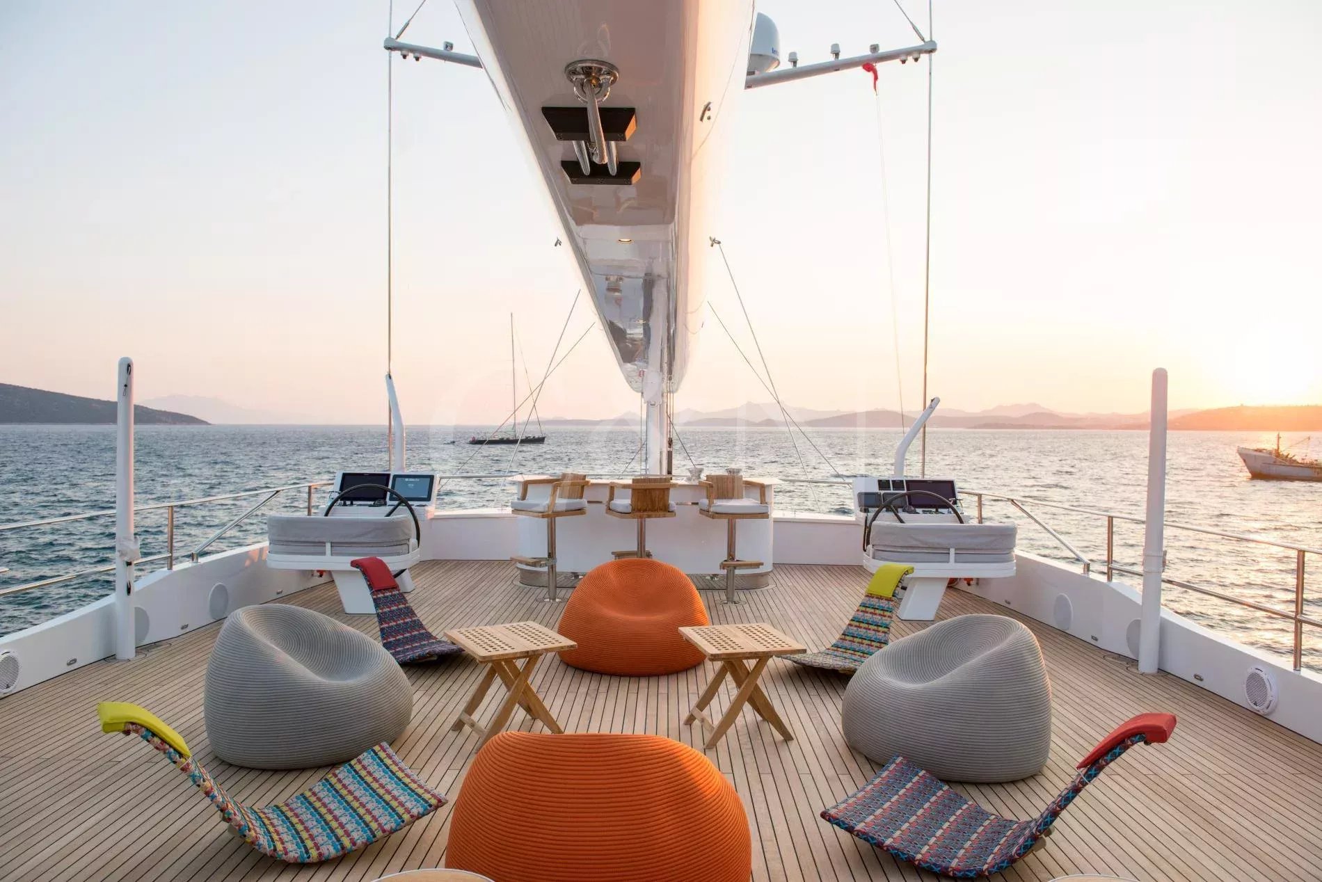 Built by Ada Yacht Works and designed by Ginton Naval Architects, All About U blends the grace of a sailing yacht with the power, and comfort of a motor yacht. Delivered in 2018 and presented in immaculate condition, she offers modern interiors by CT Mimarlik, expansive decks and a high-spec sail plan featuring Lewmar captive winches and Doyle sails. With a steel hull, commercial compliance and generous guest capacity, All About U is equally suited for private use or charter operation.With expansive open-plan decks, All About U is built for life outdoors. A vast 65-square-metre flybridge is made for entertaining, complete with 360-degree views, a sit-up bar, sunpads, lounge seating, twin helm stations, fridge, and ice maker. Below, the main deck aft features a fan of sunpads alongside a dining table shaded by the flybridge overhang. At the stern, the transom door folds down to reveal a 26-square-metre beach club with pop-up parasols and a swim ladder for easy access to the sea.Inside, All About U is bright, modern, and pared-back with wood flooring throughout. Wraparound windows bathe the main salon in natural light, offering panoramic views and a sense of openness. The lounge, dining area, and wheelhouse are arranged as a single, continuous space, with optional partitions to separate bridge operations from the guest areas. The main salon is also home to a built-in wine cooler and large flatscreen TV, while a spacious galley with central island and adjacent crew pantry ensures smooth, efficient service even when hosting larger groups.All About U accommodates 12 guests in a well-balanced layout. A full-beam master suite features a large walk-in wardrobe with a central island for jewellery and watch storage. A full-beam VIP cabin and four large double guest cabins complete the arrangement, each with an en suite. Additional cabins sleep a crew of 10.All About U is powered by twin CAT C18 engines, delivering a cruising speed of 12 knots and a top speed of 14.8 knots. With a range of 3,000 nautical miles at 10 knots, she offers reliable cruising performance. Classified by RINA, she is fully commercially compliant and charter ready.