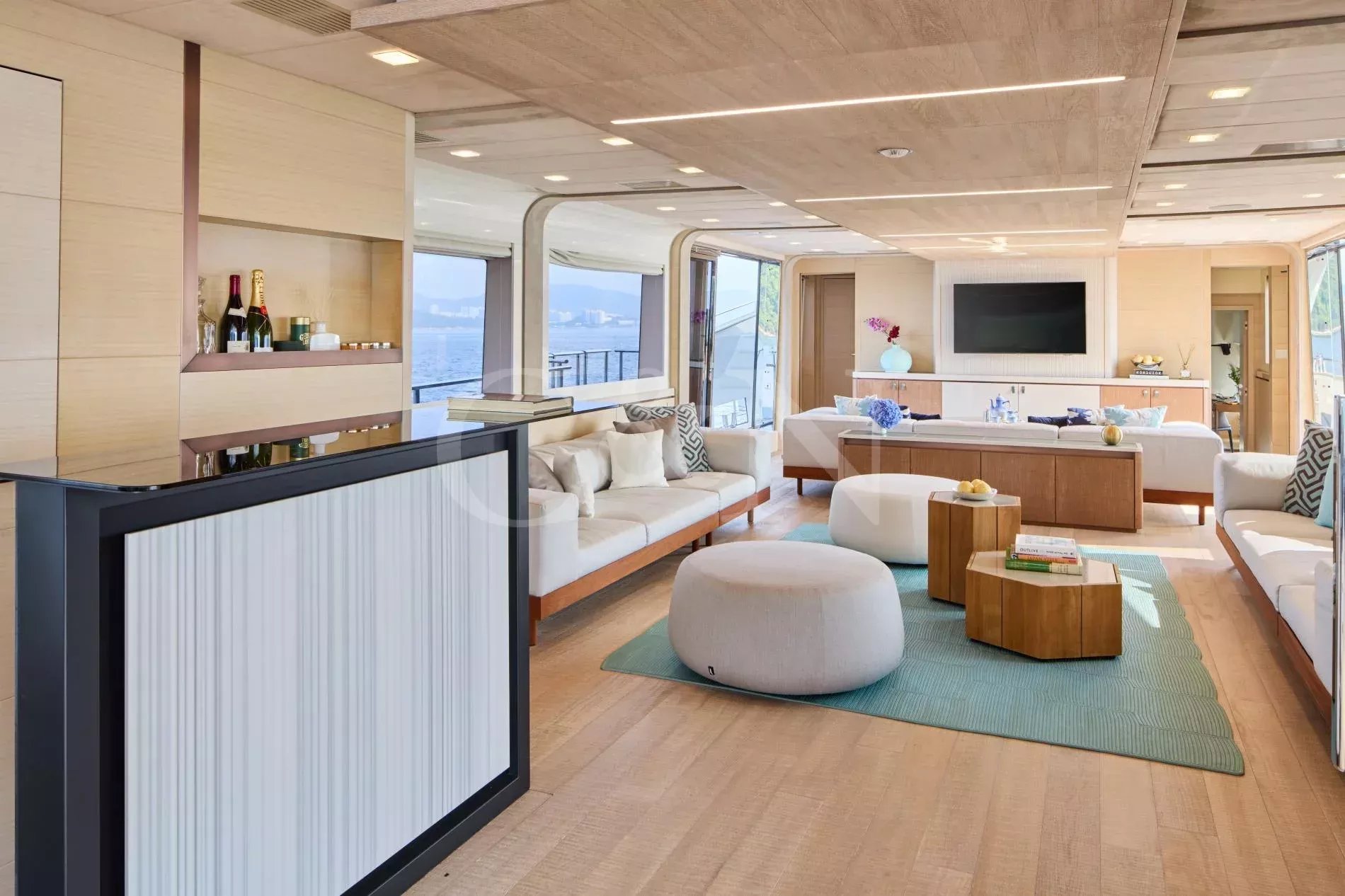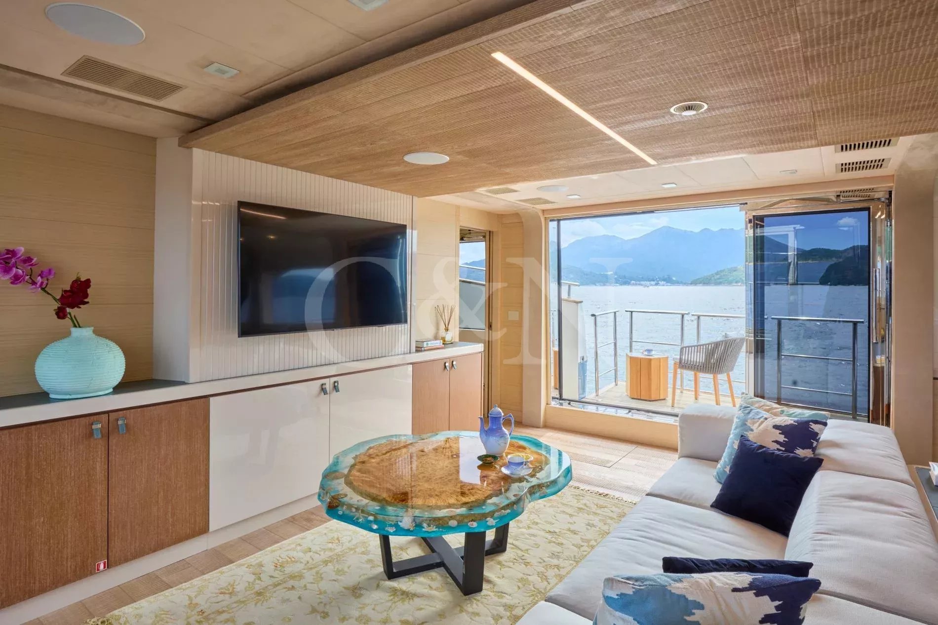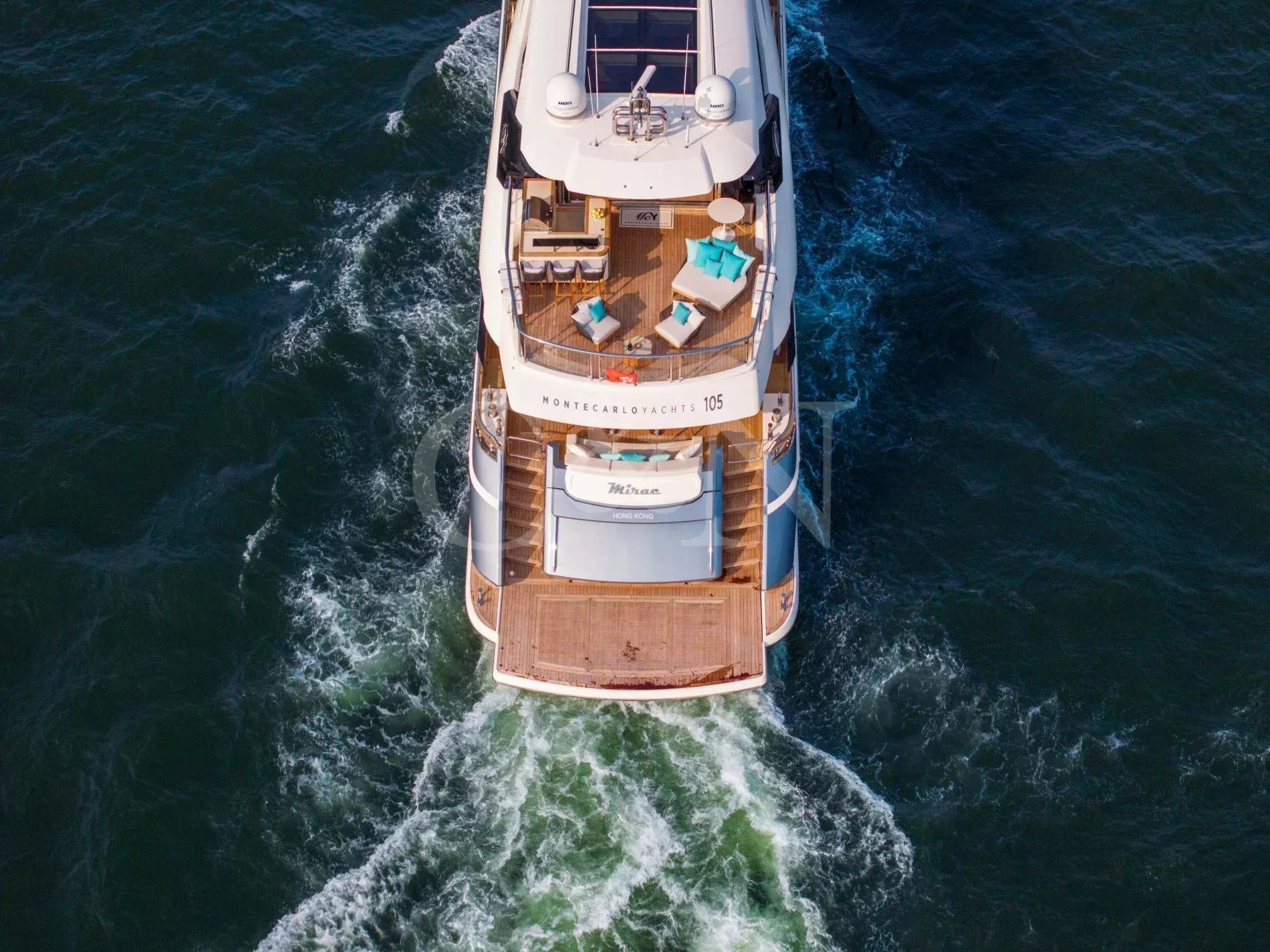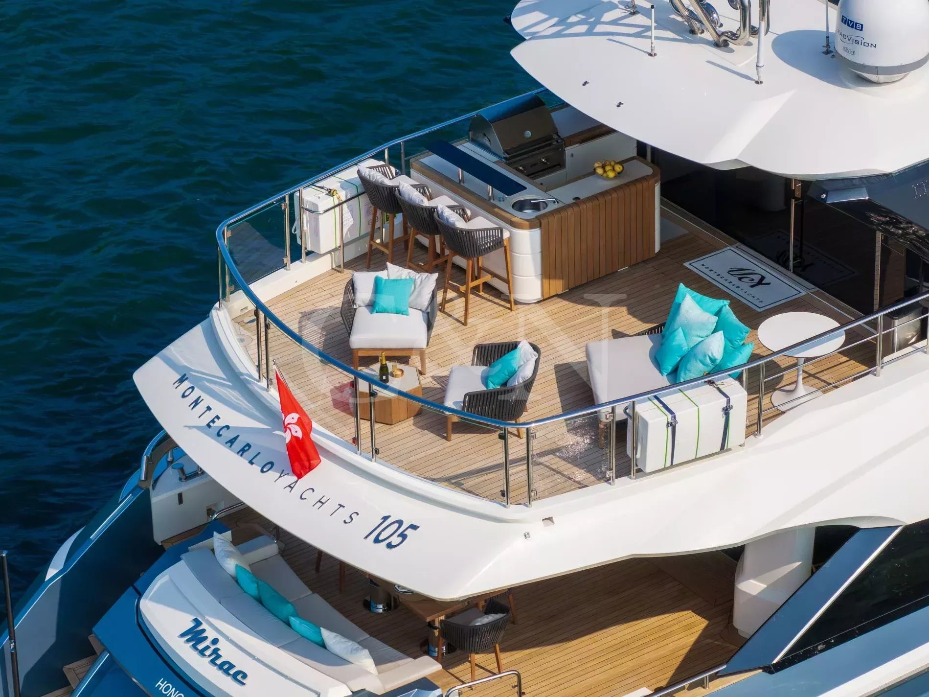 MIRAE stands apart from her sisterships as the only MCY 105 Skylounge built with an enclosed bridge deck — a custom enhancement that adds volume and all-seasons versatility to Monte Carlo Yachts’ flagship model. Designed by Nuvolari Lenard, she features the shipyard’s signature circular portholes and brings large yacht thinking to a 32m platform, with drop-down balconies, extended glazing, and flexible exterior decks. Launched in 2023 and still under her original ownership, MIRAE is equipped for global cruising, with tropical-grade air conditioning and a shore power converter ensuring comfort and compatibility wherever she voyages.MIRAE’s exterior spaces are exceptionally versatile, offering a variety of settings that seamlessly transition from day to night. At the bow, a configurable lounge allows for both relaxed coffee settings and full dining, thanks to convertible tables and built-in sofas. Aft, the main deck features integrated seating with high-low tables and an indoor-outdoor bar that serves both the aft deck and main salon. A third outdoor entertainment area is found on the sky lounge aft, complete with an open-air galley equipped with a fridge, sink, an electric grill and a professional BBQ.MIRAE offers a bright and open interior with a fresh, beach-house feel. On the main deck, the salon opens to the sea on both sides, with drop-down balconies accessed via full height sliding glass doors. That sense of openness continues in the sky lounge, where wraparound glazing and overhead skylights illuminate the space and offer near-360-degree views. A circular, custom-made dining table extends to seat eight to ten guests, while a pair of comfortable sofas creates a welcoming lounge area. The helm station is discreetly partitioned from the lounge, and in fair weather, folding patio-style glass doors open the sky lounge to the aft deck, creating a seamless indoor-outdoor space. Light woods, accents of teal and aquamarine and refined materials create a contemporary feel throughout.Accommodation aboard MIRAE is arranged across five cabins, comfortably sleeping up to 12 guests. The master suite sits forward on the main deck and features a skylight that offers plenty of natural light, chaise longue, desk, his-and-hers wardrobes, and an en suite. On the lower deck, two mirror-image VIP doubles are joined by two twin cabins, each with a Pullman bunk and beds that can be converted into doubles. In the VIP suites, the Monte Carlo Yachts’ signature intersecting portholes adds a distinctive design detail to the light-filled spaces. State-of-the-art navigation systems—including GPS, radar, and autopilot—ensure accurate, stress-free cruising. Safety is paramount, with life rafts, fire suppression systems, and advanced communication tools providing reliable protection at sea. Smart home integration allows effortless control of lighting, climate, and entertainment from anywhere on board. A tropical-grade 324,000 BTU air conditioning system keeps interiors cool and comfortable in any climate, while Seakeeper stabilisers ensure a smooth, stable ride in all sea conditions. Designed for both relaxation and adventure, MIRAE features a hydraulic swim platform with a 1,200kg lifting capacity for easy tender launch and recovery. A spacious garage securely houses a 4.45m tender and a jet ski, maximizing deck space. A shore power converter adds global versatility, allowing seamless connection to varying electrical systems worldwide.