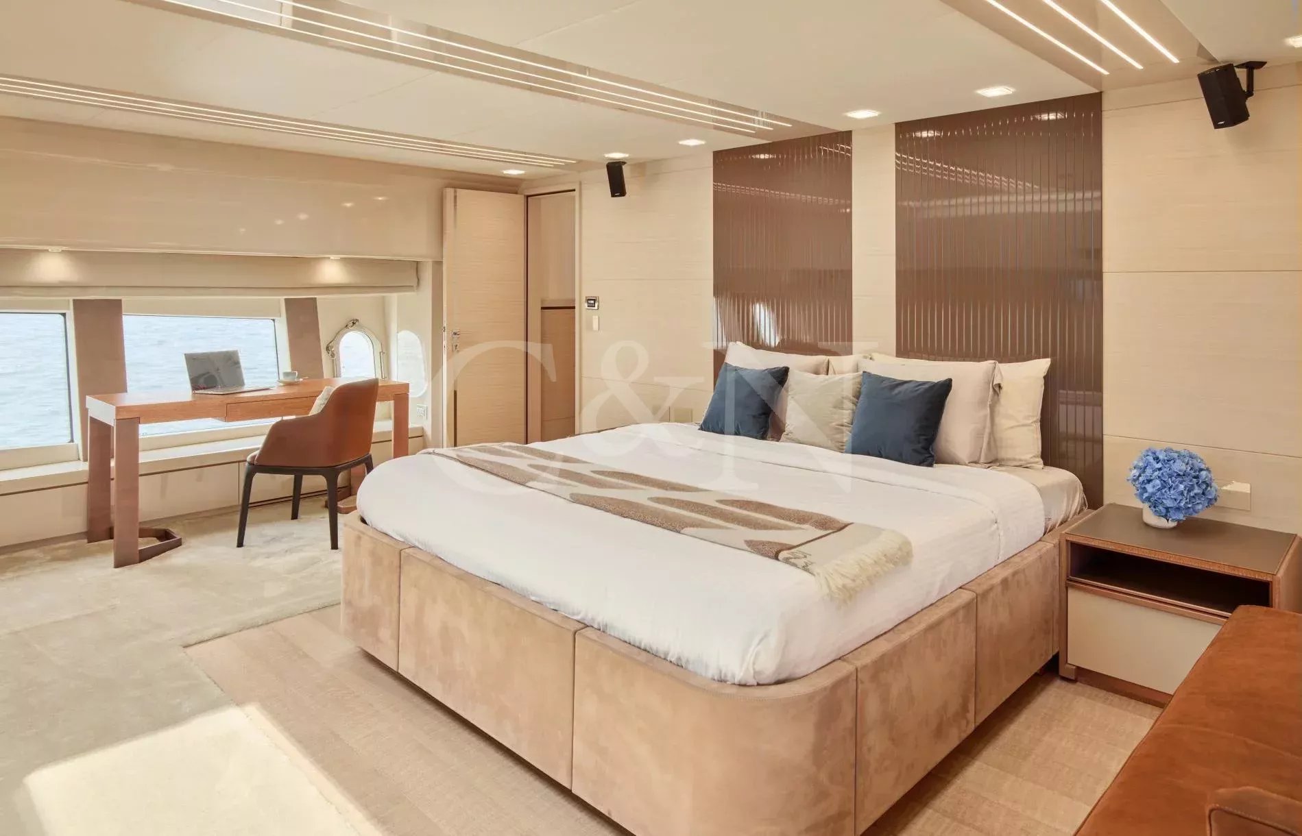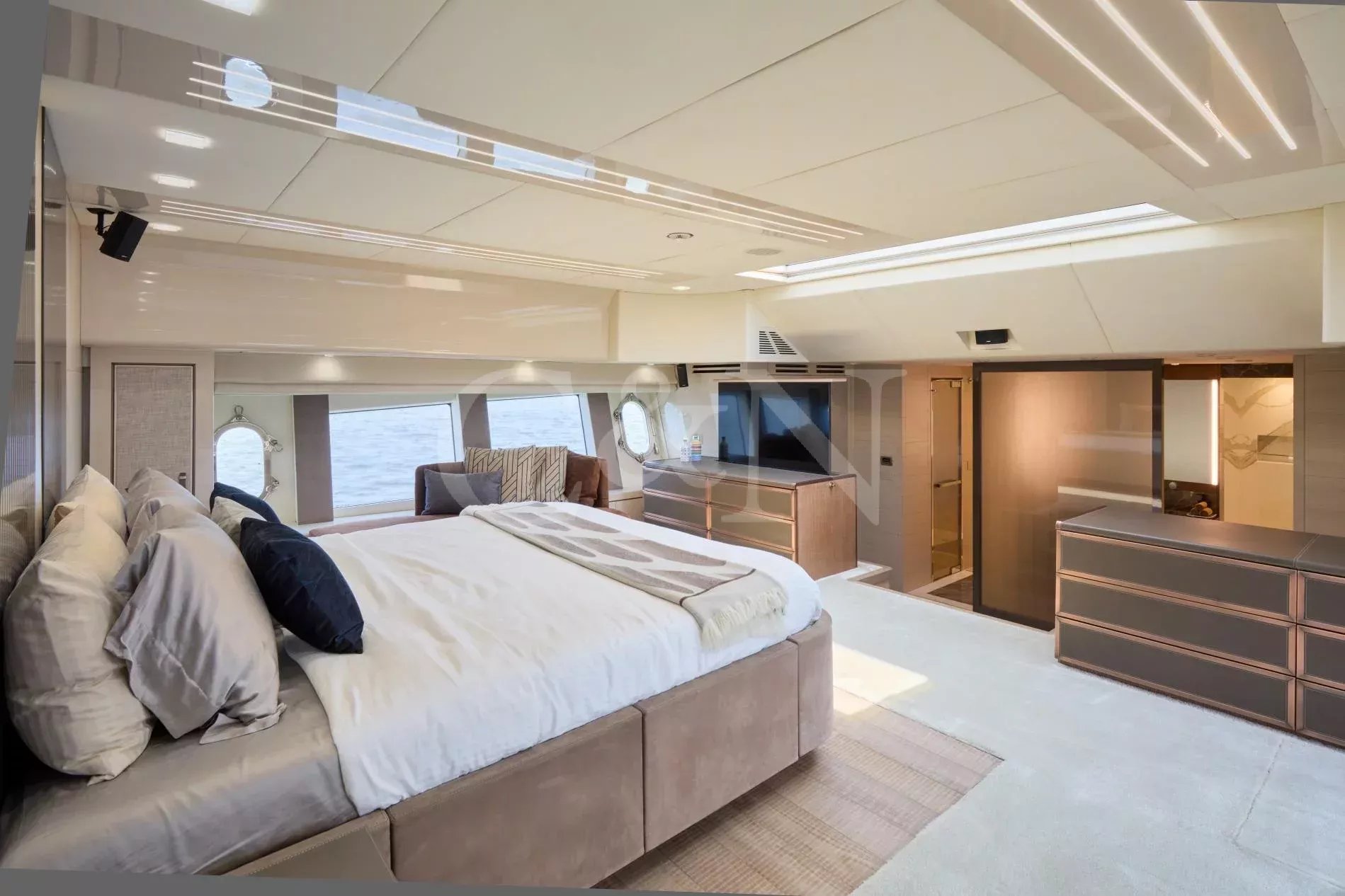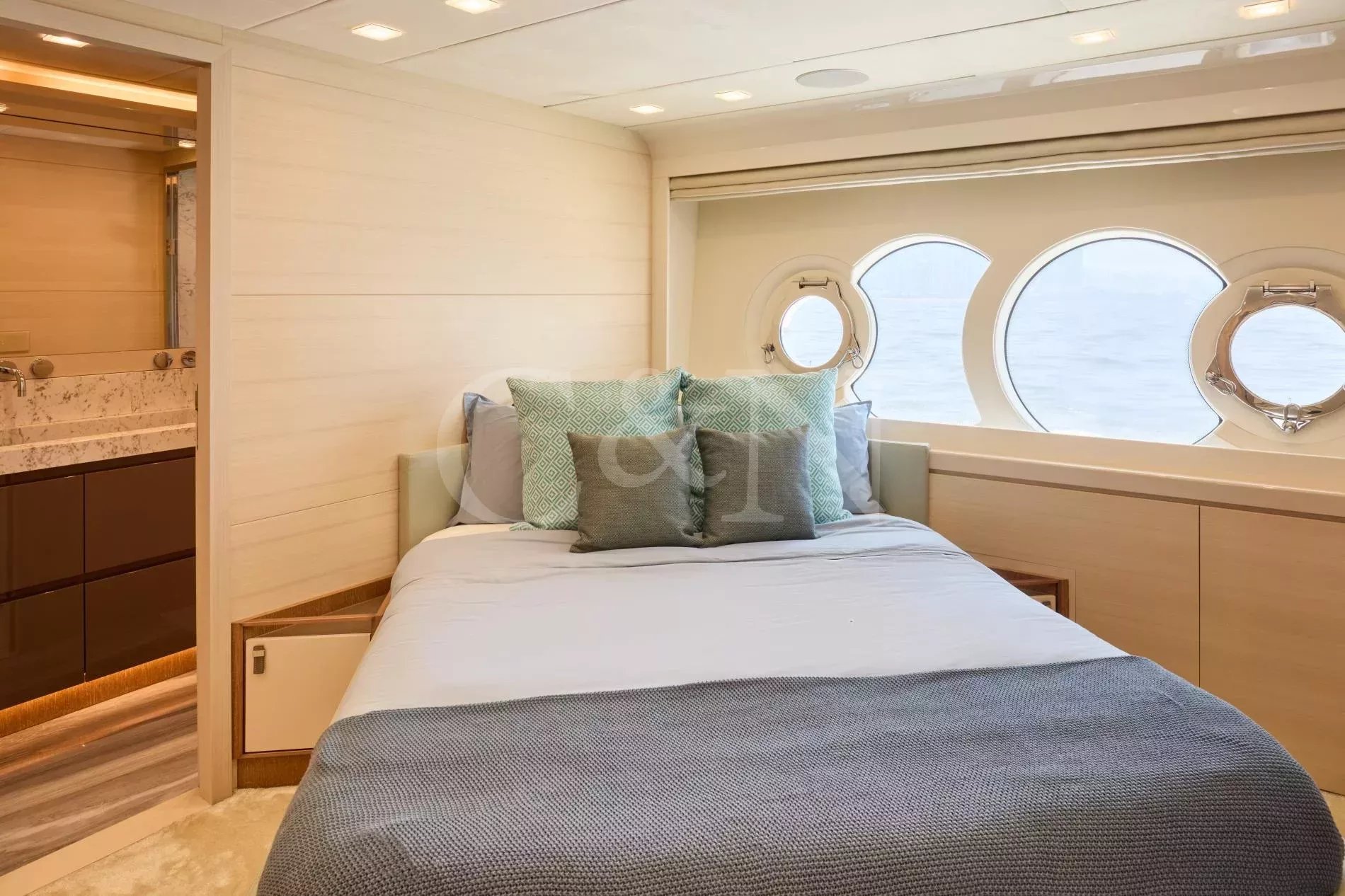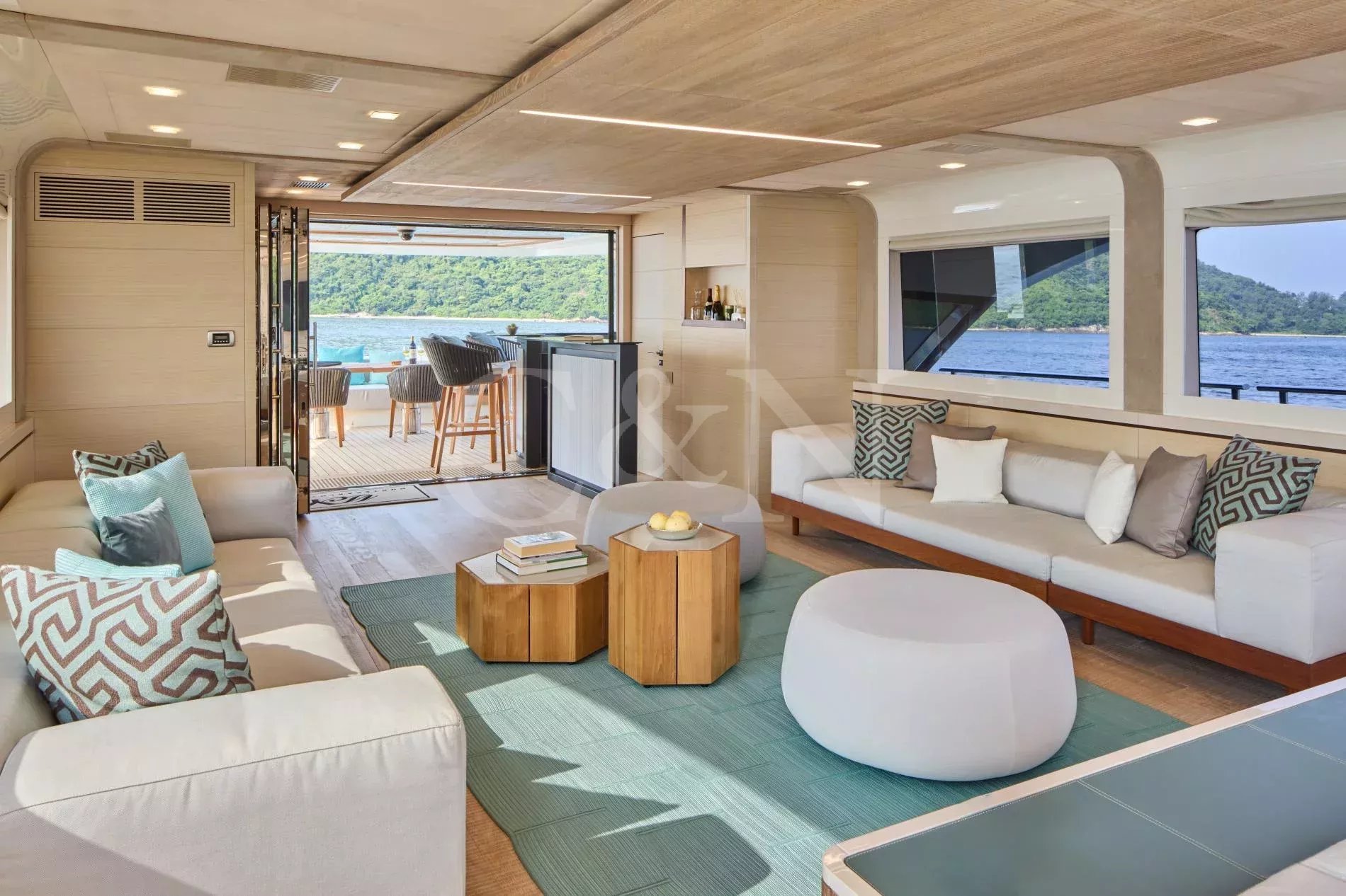 MIRAE stands apart from her sisterships as the only MCY 105 Skylounge built with an enclosed bridge deck — a custom enhancement that adds volume and all-seasons versatility to Monte Carlo Yachts’ flagship model. Designed by Nuvolari Lenard, she features the shipyard’s signature circular portholes and brings large yacht thinking to a 32m platform, with drop-down balconies, extended glazing, and flexible exterior decks. Launched in 2023 and still under her original ownership, MIRAE is equipped for global cruising, with tropical-grade air conditioning and a shore power converter ensuring comfort and compatibility wherever she voyages.MIRAE’s exterior spaces are exceptionally versatile, offering a variety of settings that seamlessly transition from day to night. At the bow, a configurable lounge allows for both relaxed coffee settings and full dining, thanks to convertible tables and built-in sofas. Aft, the main deck features integrated seating with high-low tables and an indoor-outdoor bar that serves both the aft deck and main salon. A third outdoor entertainment area is found on the sky lounge aft, complete with an open-air galley equipped with a fridge, sink, an electric grill and a professional BBQ.MIRAE offers a bright and open interior with a fresh, beach-house feel. On the main deck, the salon opens to the sea on both sides, with drop-down balconies accessed via full height sliding glass doors. That sense of openness continues in the sky lounge, where wraparound glazing and overhead skylights illuminate the space and offer near-360-degree views. A circular, custom-made dining table extends to seat eight to ten guests, while a pair of comfortable sofas creates a welcoming lounge area. The helm station is discreetly partitioned from the lounge, and in fair weather, folding patio-style glass doors open the sky lounge to the aft deck, creating a seamless indoor-outdoor space. Light woods, accents of teal and aquamarine and refined materials create a contemporary feel throughout.Accommodation aboard MIRAE is arranged across five cabins, comfortably sleeping up to 12 guests. The master suite sits forward on the main deck and features a skylight that offers plenty of natural light, chaise longue, desk, his-and-hers wardrobes, and an en suite. On the lower deck, two mirror-image VIP doubles are joined by two twin cabins, each with a Pullman bunk and beds that can be converted into doubles. In the VIP suites, the Monte Carlo Yachts’ signature intersecting portholes adds a distinctive design detail to the light-filled spaces. State-of-the-art navigation systems—including GPS, radar, and autopilot—ensure accurate, stress-free cruising. Safety is paramount, with life rafts, fire suppression systems, and advanced communication tools providing reliable protection at sea. Smart home integration allows effortless control of lighting, climate, and entertainment from anywhere on board. A tropical-grade 324,000 BTU air conditioning system keeps interiors cool and comfortable in any climate, while Seakeeper stabilisers ensure a smooth, stable ride in all sea conditions. Designed for both relaxation and adventure, MIRAE features a hydraulic swim platform with a 1,200kg lifting capacity for easy tender launch and recovery. A spacious garage securely houses a 4.45m tender and a jet ski, maximizing deck space. A shore power converter adds global versatility, allowing seamless connection to varying electrical systems worldwide.