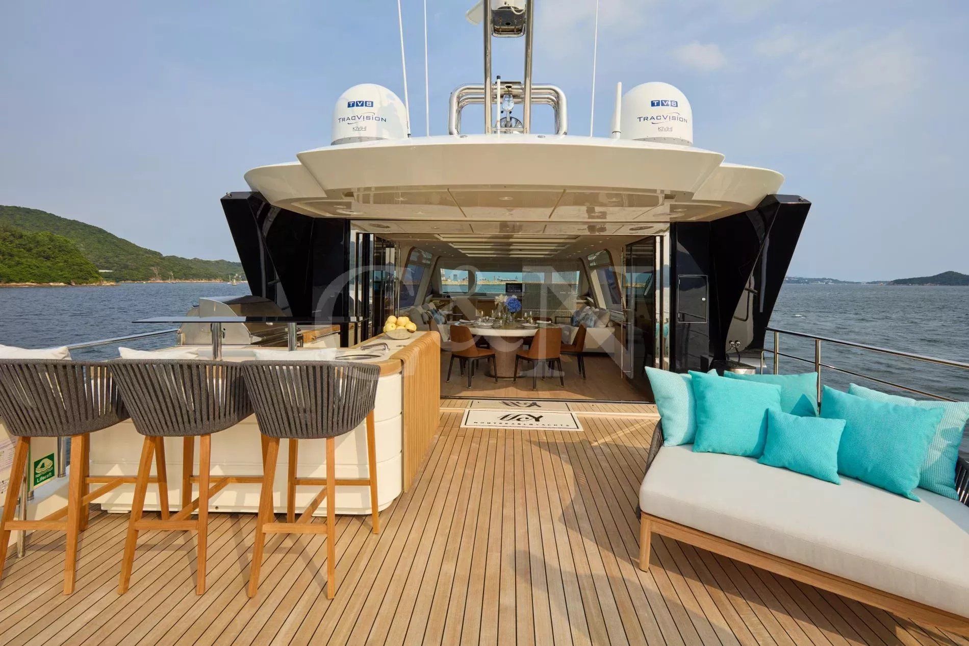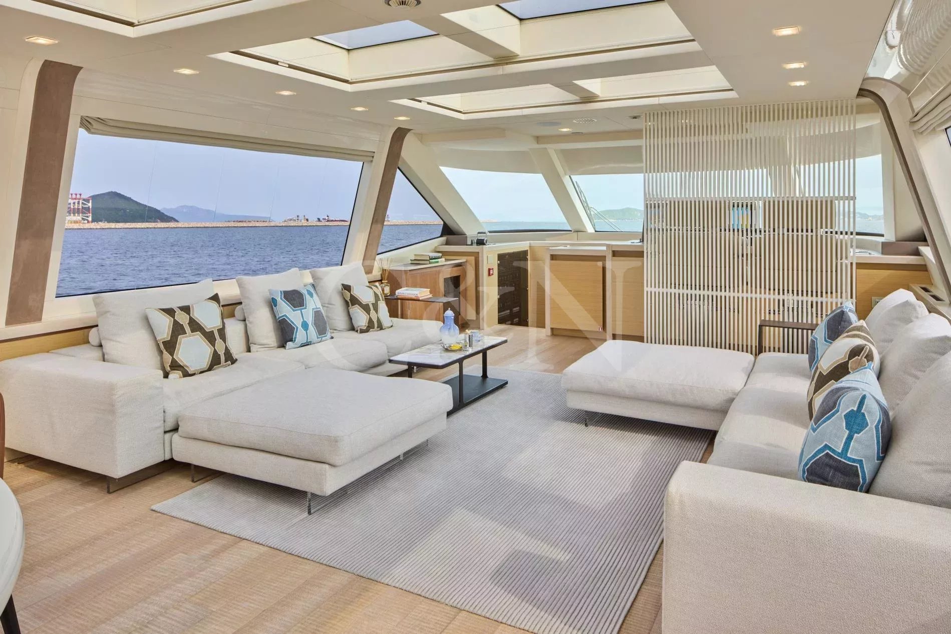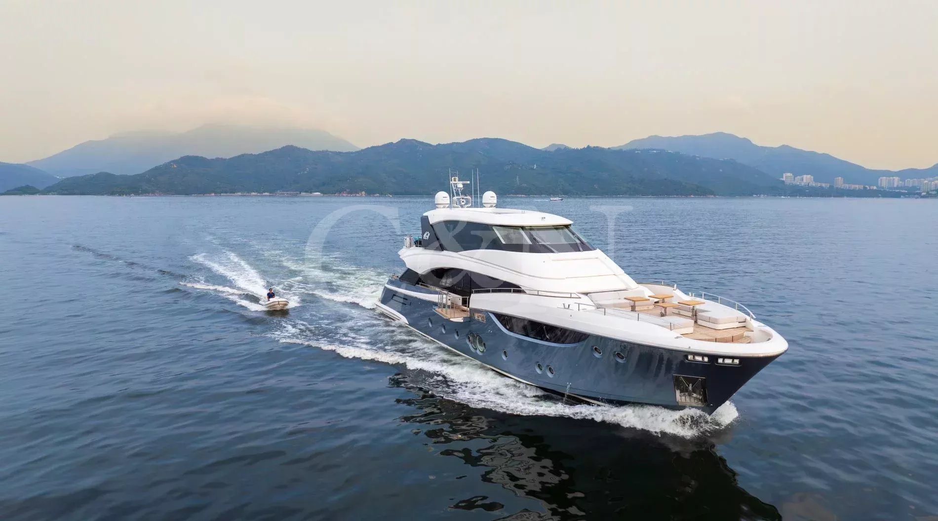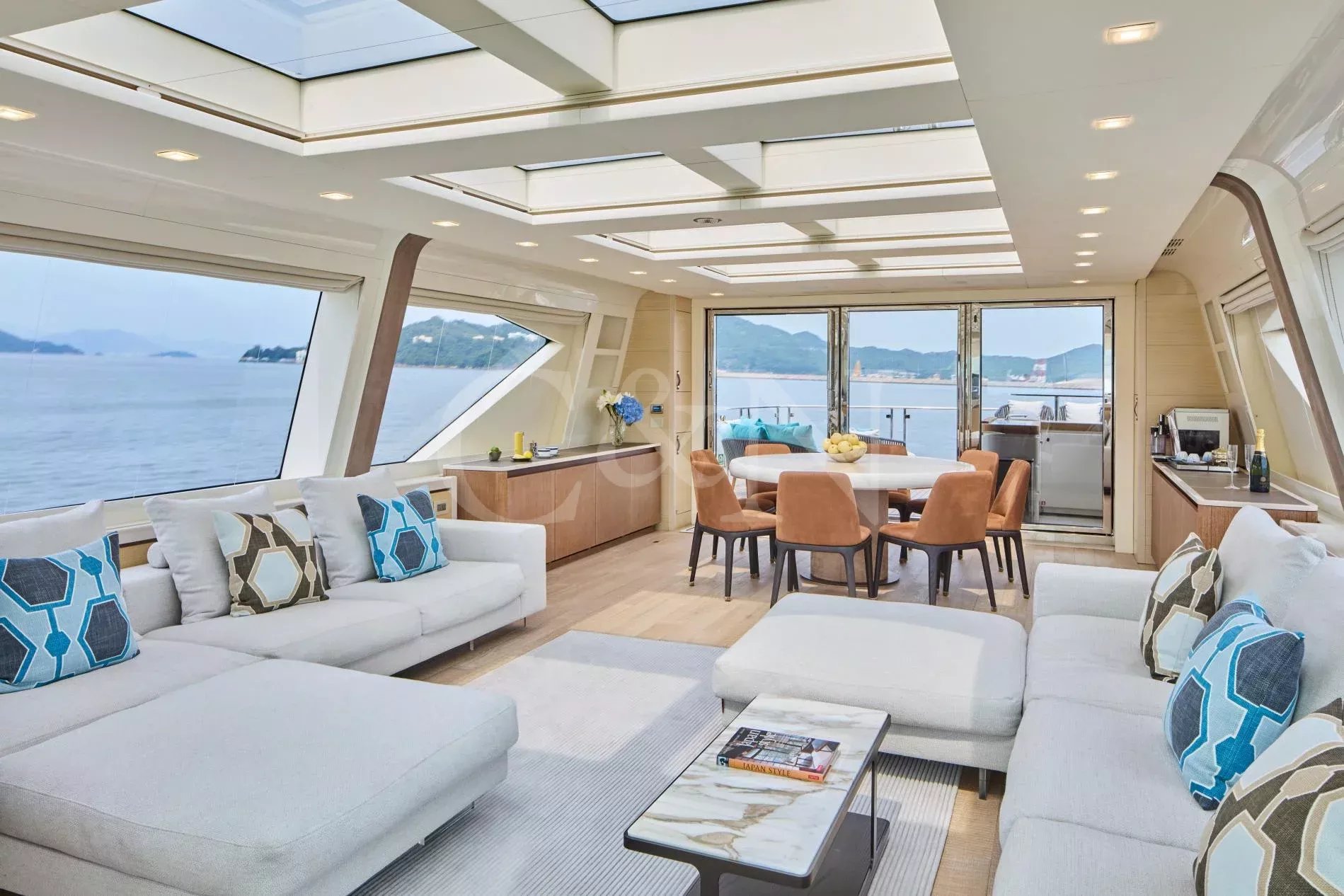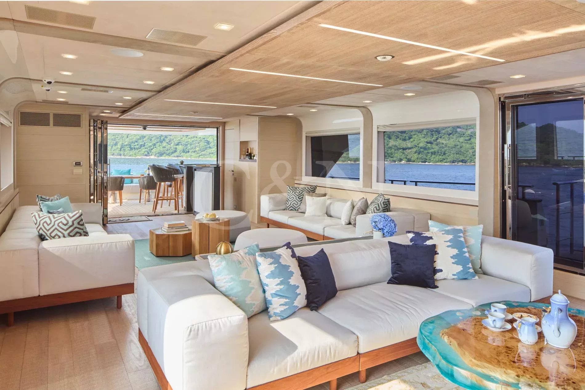 MIRAE stands apart from her sisterships as the only MCY 105 Skylounge built with an enclosed bridge deck — a custom enhancement that adds volume and all-seasons versatility to Monte Carlo Yachts’ flagship model. Designed by Nuvolari Lenard, she features the shipyard’s signature circular portholes and brings large yacht thinking to a 32m platform, with drop-down balconies, extended glazing, and flexible exterior decks. Launched in 2023 and still under her original ownership, MIRAE is equipped for global cruising, with tropical-grade air conditioning and a shore power converter ensuring comfort and compatibility wherever she voyages.MIRAE’s exterior spaces are exceptionally versatile, offering a variety of settings that seamlessly transition from day to night. At the bow, a configurable lounge allows for both relaxed coffee settings and full dining, thanks to convertible tables and built-in sofas. Aft, the main deck features integrated seating with high-low tables and an indoor-outdoor bar that serves both the aft deck and main salon. A third outdoor entertainment area is found on the sky lounge aft, complete with an open-air galley equipped with a fridge, sink, an electric grill and a professional BBQ.MIRAE offers a bright and open interior with a fresh, beach-house feel. On the main deck, the salon opens to the sea on both sides, with drop-down balconies accessed via full height sliding glass doors. That sense of openness continues in the sky lounge, where wraparound glazing and overhead skylights illuminate the space and offer near-360-degree views. A circular, custom-made dining table extends to seat eight to ten guests, while a pair of comfortable sofas creates a welcoming lounge area. The helm station is discreetly partitioned from the lounge, and in fair weather, folding patio-style glass doors open the sky lounge to the aft deck, creating a seamless indoor-outdoor space. Light woods, accents of teal and aquamarine and refined materials create a contemporary feel throughout.Accommodation aboard MIRAE is arranged across five cabins, comfortably sleeping up to 12 guests. The master suite sits forward on the main deck and features a skylight that offers plenty of natural light, chaise longue, desk, his-and-hers wardrobes, and an en suite. On the lower deck, two mirror-image VIP doubles are joined by two twin cabins, each with a Pullman bunk and beds that can be converted into doubles. In the VIP suites, the Monte Carlo Yachts’ signature intersecting portholes adds a distinctive design detail to the light-filled spaces. State-of-the-art navigation systems—including GPS, radar, and autopilot—ensure accurate, stress-free cruising. Safety is paramount, with life rafts, fire suppression systems, and advanced communication tools providing reliable protection at sea. Smart home integration allows effortless control of lighting, climate, and entertainment from anywhere on board. A tropical-grade 324,000 BTU air conditioning system keeps interiors cool and comfortable in any climate, while Seakeeper stabilisers ensure a smooth, stable ride in all sea conditions. Designed for both relaxation and adventure, MIRAE features a hydraulic swim platform with a 1,200kg lifting capacity for easy tender launch and recovery. A spacious garage securely houses a 4.45m tender and a jet ski, maximizing deck space. A shore power converter adds global versatility, allowing seamless connection to varying electrical systems worldwide.