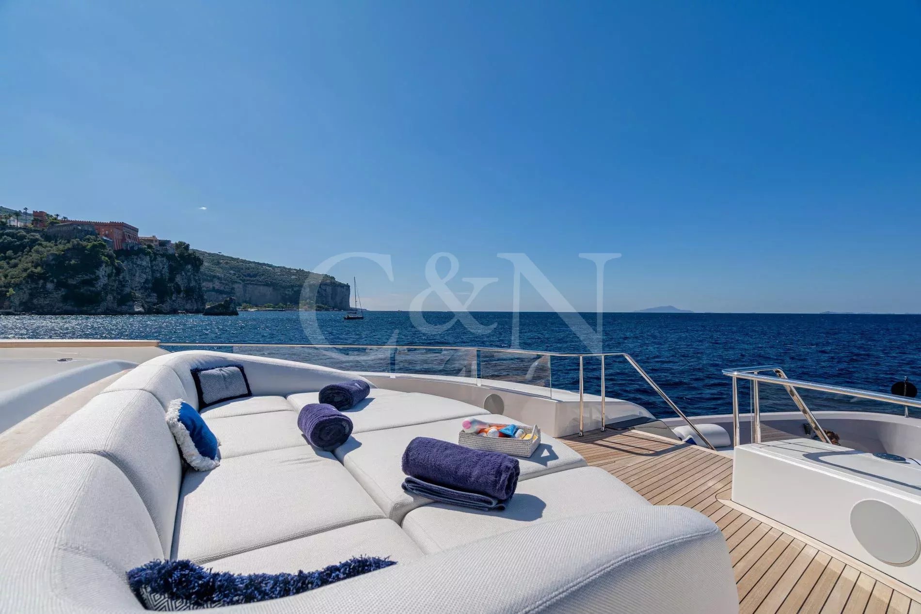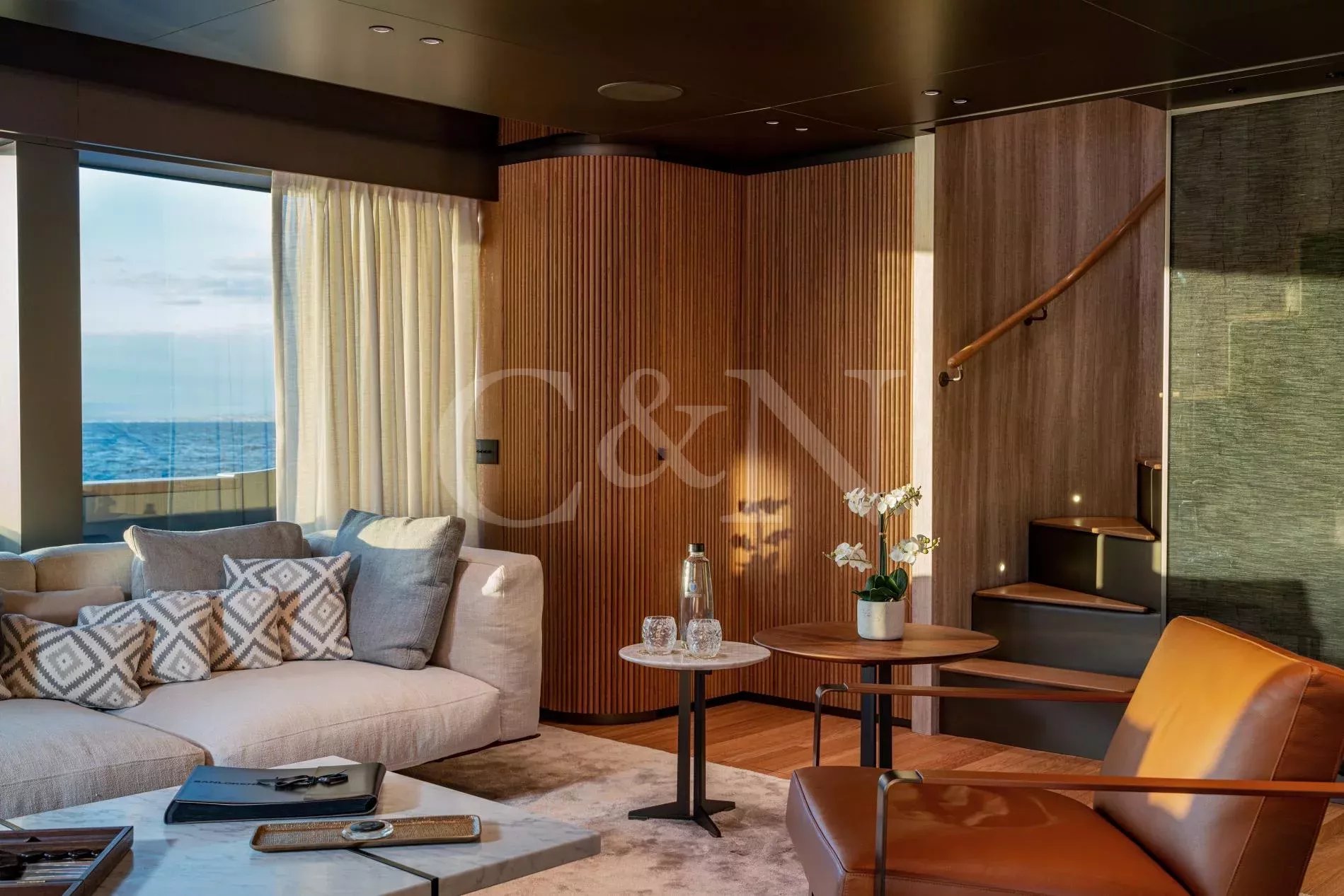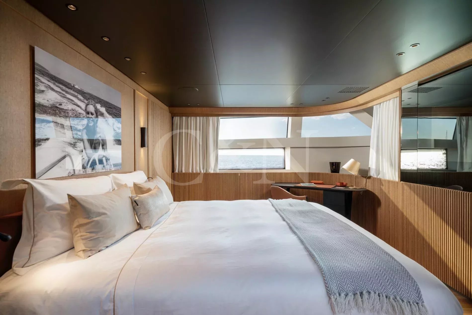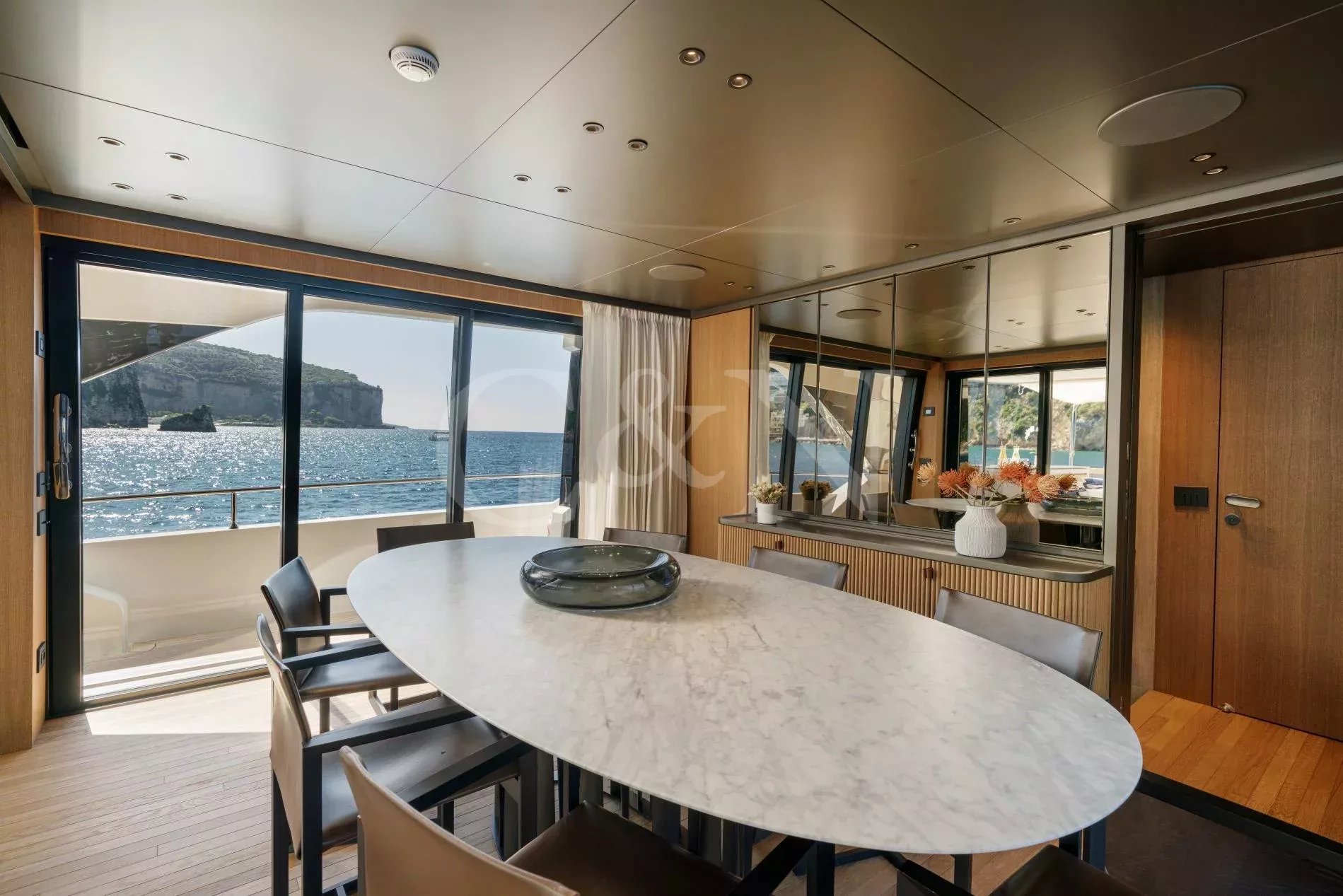 At 28 metres, the Sanlorenzo SD96 is part of the yard’s widely popular semi-displacement SD line, and Invictus is an outstanding example. Maintained by a single owner since new, she is commercially compliant and equipped with a high level of options and upgrades. Combining efficient cruising with an award-winning and versatile layout, she represents an exceptional opportunity within this sought-after series.The main deck aft serves as the yacht’s principal al fresco dining area, with an extendable table that can also be converted into two coffee tables. Forward of the wheelhouse, a built-in sofa with a high-low table sits beneath an awning, while one of the SD96’s most distinctive features lies just ahead: a private bow lounge accessed via steps leading down from the foredeck. This secluded retreat is arranged with two generous daybeds. Above, the upper deck aft provides dedicated sun lounging with an optional awning, and offers a relaxed dining option, complete with comfortable sofas and a coffee/cocktail table.Large sliding doors open to the main salon, which features a refined fluted-wood motif complemented by leather armchairs and a low-slung sofa, creating a calm and contemporary atmosphere. This model offers notable flexibility, and in this case the owner opted for a sky lounge arranged for formal dining, with sliding doors on three sides that foster a seamless indoor–outdoor connection.The master suite sits on the main deck for privacy and convenience, while the lower deck offers two double cabins and two versatile twin cabins that can be converted into doubles when needed. One of the convertible cabins is also equipped with a Pullman berth, providing additional flexibility for guests.Invictus is powered by twin Caterpillar C18 ACERT engines, under extended warranty, delivering a top speed of 18 knots and exceptional efficiency with a cruising range of 1,700 nm at 11 knots. Comfort is further enhanced by Naiad Dynamics electric fin stabilisers, complemented by an upgraded Simrad “Diamond” navigation suite.