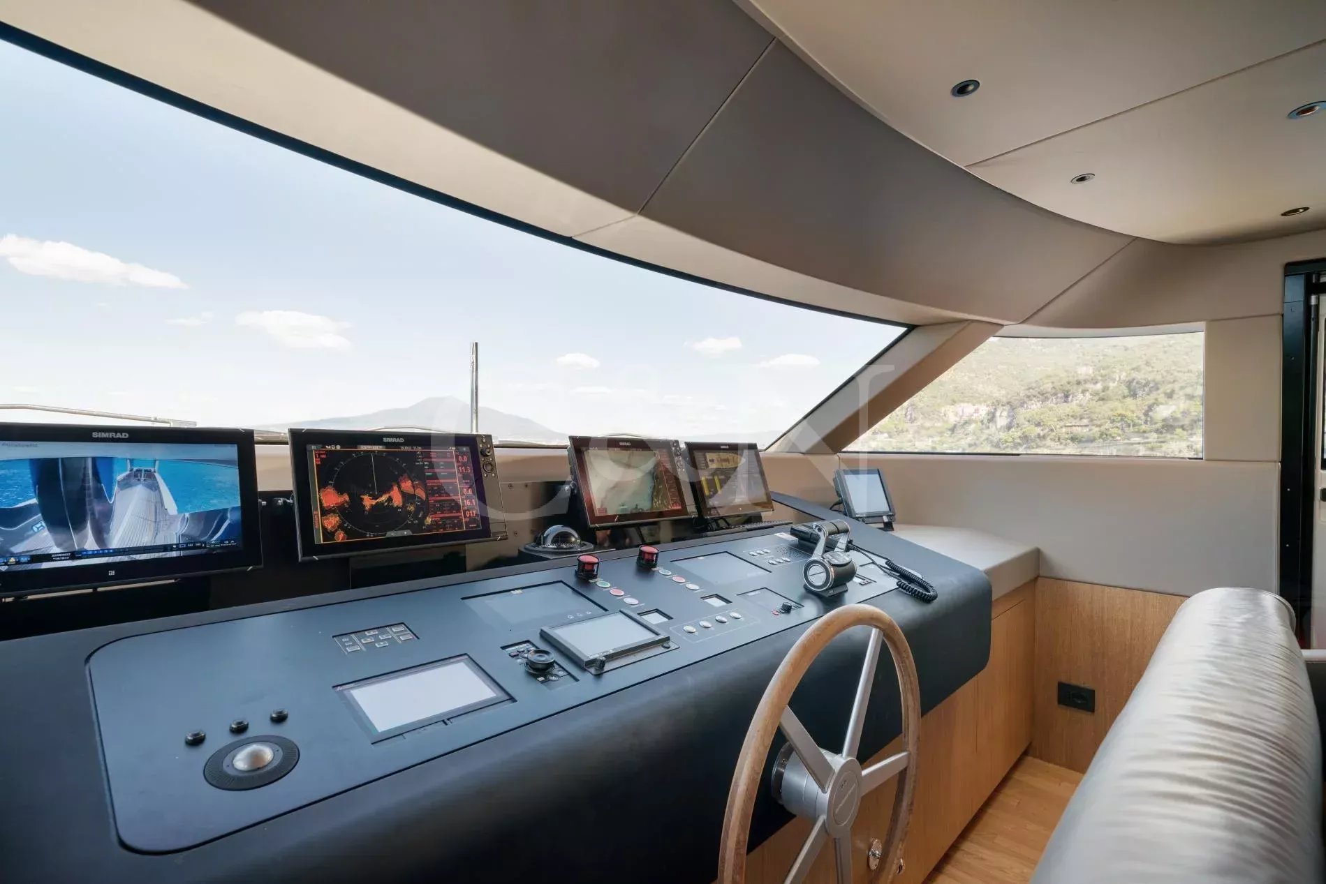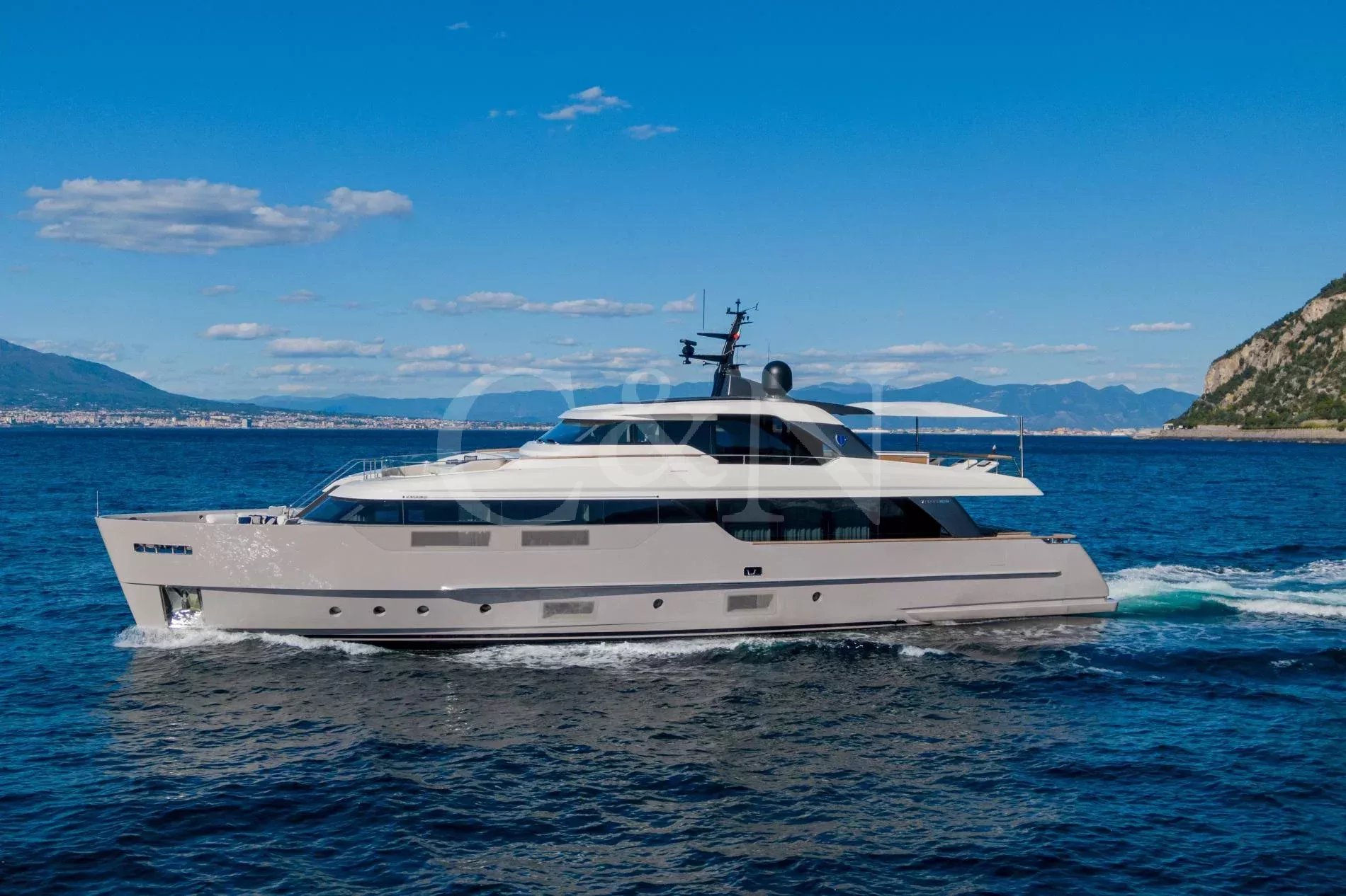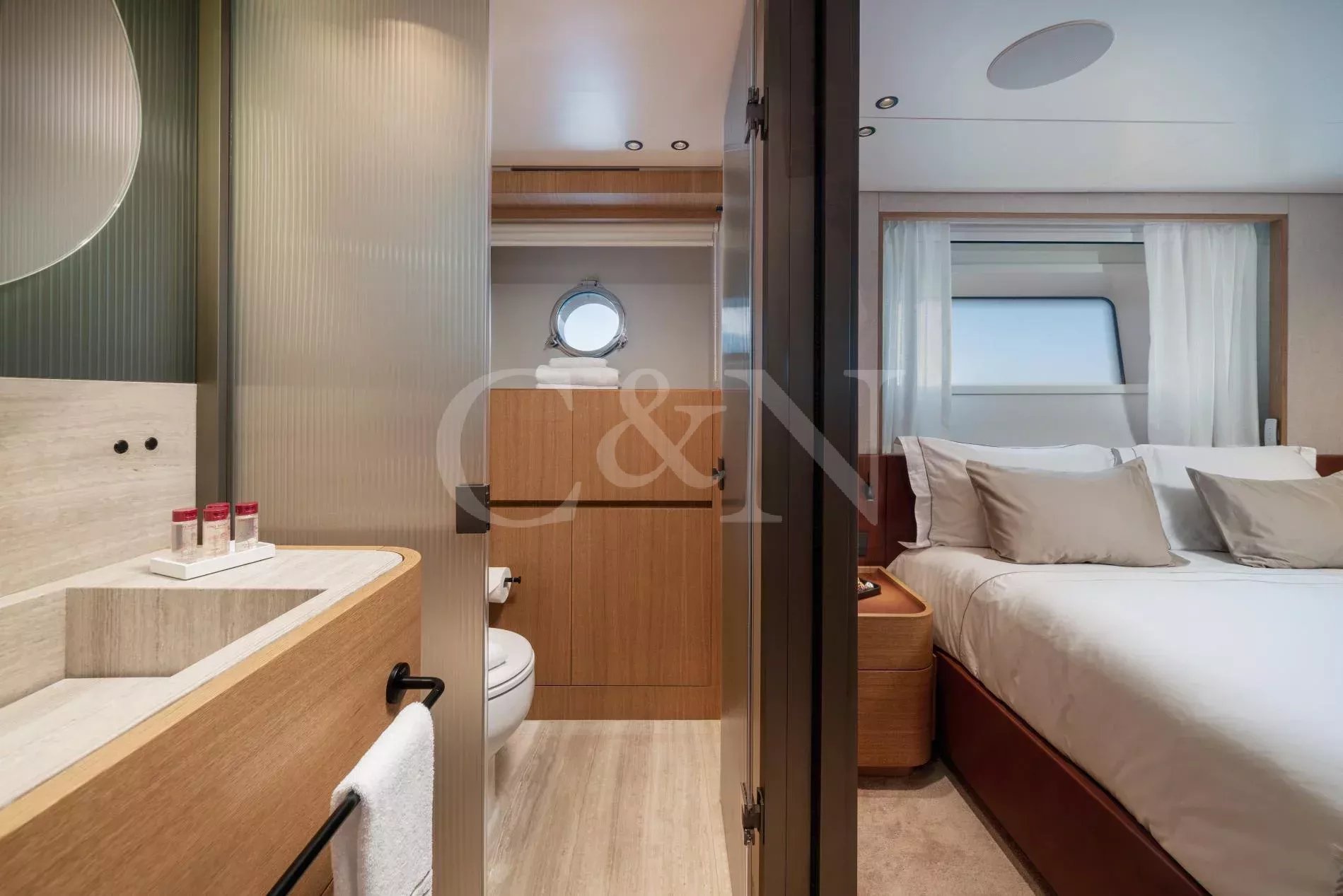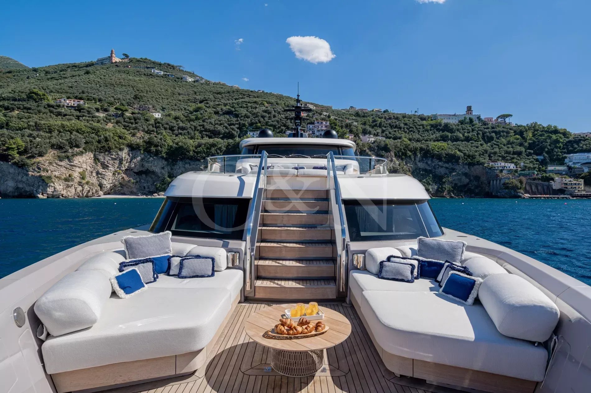 At 28 metres, the Sanlorenzo SD96 is part of the yard’s widely popular semi-displacement SD line, and Invictus is an outstanding example. Maintained by a single owner since new, she is commercially compliant and equipped with a high level of options and upgrades. Combining efficient cruising with an award-winning and versatile layout, she represents an exceptional opportunity within this sought-after series.The main deck aft serves as the yacht’s principal al fresco dining area, with an extendable table that can also be converted into two coffee tables. Forward of the wheelhouse, a built-in sofa with a high-low table sits beneath an awning, while one of the SD96’s most distinctive features lies just ahead: a private bow lounge accessed via steps leading down from the foredeck. This secluded retreat is arranged with two generous daybeds. Above, the upper deck aft provides dedicated sun lounging with an optional awning, and offers a relaxed dining option, complete with comfortable sofas and a coffee/cocktail table.Large sliding doors open to the main salon, which features a refined fluted-wood motif complemented by leather armchairs and a low-slung sofa, creating a calm and contemporary atmosphere. This model offers notable flexibility, and in this case the owner opted for a sky lounge arranged for formal dining, with sliding doors on three sides that foster a seamless indoor–outdoor connection.The master suite sits on the main deck for privacy and convenience, while the lower deck offers two double cabins and two versatile twin cabins that can be converted into doubles when needed. One of the convertible cabins is also equipped with a Pullman berth, providing additional flexibility for guests.Invictus is powered by twin Caterpillar C18 ACERT engines, under extended warranty, delivering a top speed of 18 knots and exceptional efficiency with a cruising range of 1,700 nm at 11 knots. Comfort is further enhanced by Naiad Dynamics electric fin stabilisers, complemented by an upgraded Simrad “Diamond” navigation suite.
