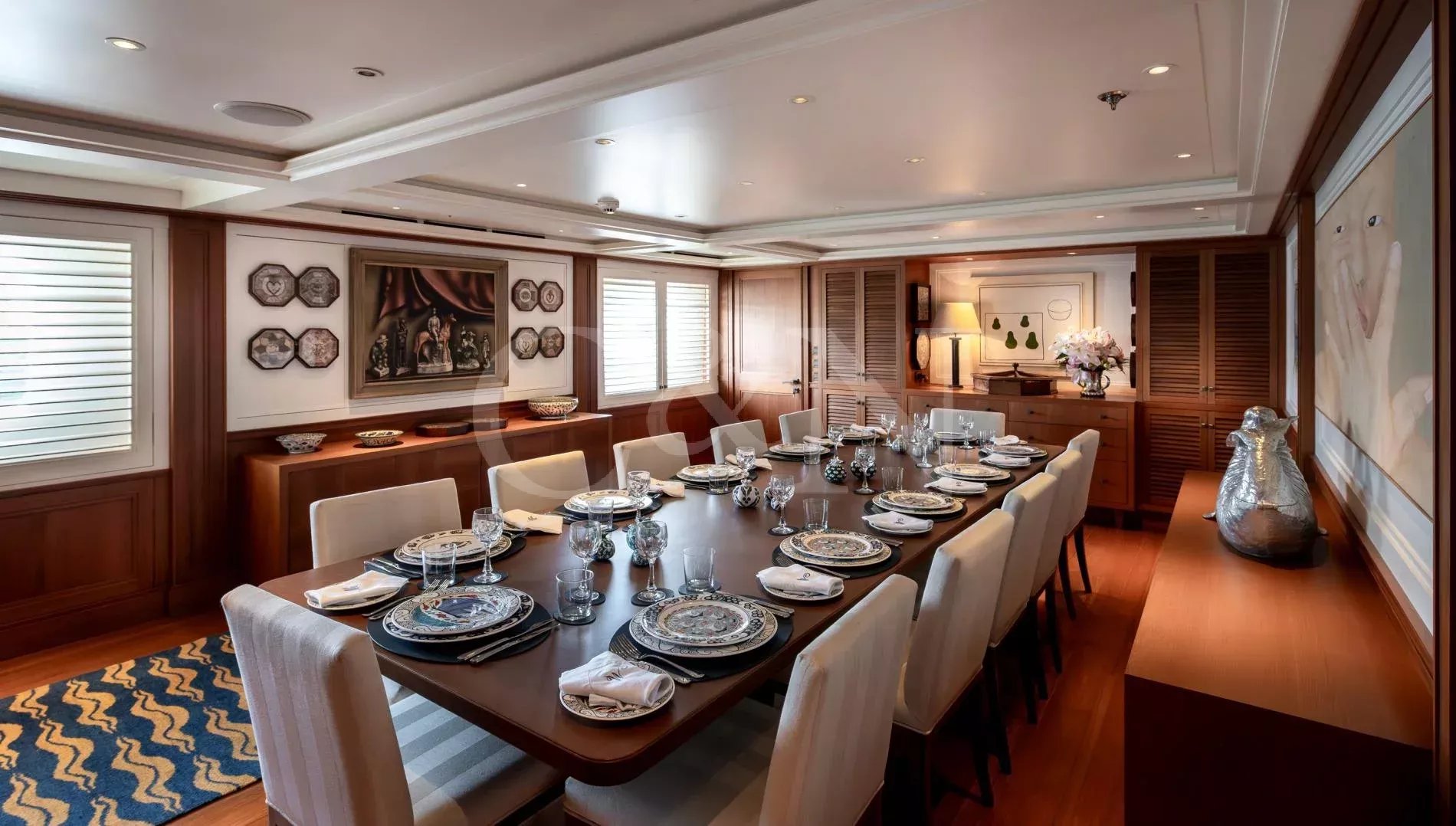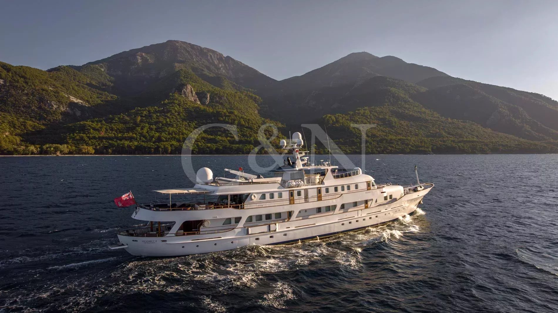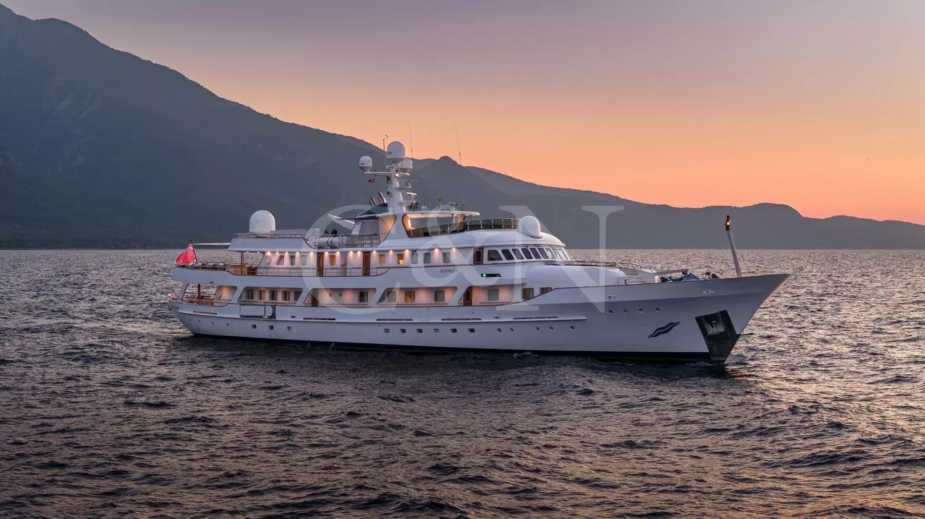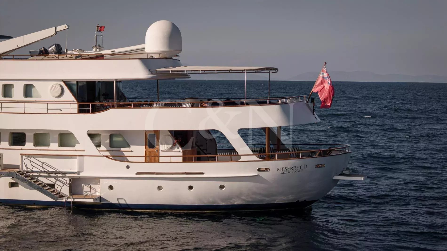 When Cammenga Jachtbouw launched MESERRET II in 1978, it marked the height of the Dutch yard’s ambitions. Drawn by De Vries Lentsch, one of the most influential names in yacht design, she ranked among the largest private yachts in the world, placing the boutique shipyard alongside the era’s most prestigious Northern European builders. She was conceived as a true passagemaker, engineered for long-range independence with a graceful canoe stern. More than four decades later, MESERRET II remains a study in endurance and careful stewardship. A comprehensive rebuild at RMK Marine saw her taken back to bare steel and renewed throughout, introducing modern systems and a new interior while preserving the integrity and character of her original design. With a 6,000-nautical-mile range and continuous Lloyd’s class maintenance, MESERRET II retains her place as one of the great Dutch-built yachts of her generation.On the main deck aft, a sociable seating area and bar offers a relaxed setting close to the water, complemented by a convertible passerelle that doubles as a swimming ladder. Hydraulic side platforms provide direct access for tender boarding or watersports. The bridge deck serves as the principal exterior lounge, with a shaded dining area and sunpads set into the curve of the aft deck. From here, wraparound decks lead forward to the foredeck with two sofas, jet-ski storage and a crane. Above, the sundeck is devoted to leisure, with a Jacuzzi encircled by a perfect curve of sunpads and a bar built around the funnel structure. Two tenders are stored aft, each with its own crane, and when launched the cleared deck transforms into additional seating, sunbathing, or open-air event space.Between 2014 and 2015, MESERRET II underwent a full interior reconstruction at RMK Shipyard under Humphreys Yacht Design. The rebuild introduced a new layout and finish that respected her classic architecture while giving the yacht its distinctive personality. Burmese teak joinery and bespoke ironmongery run throughout, complemented by an extensive collection of artwork that brings each space to life. The main salon forms the social heart of the yacht: a bright, open space flowing naturally into the main lobby and onward to a formal dining room distinguished by hand-painted trompe-l’oeil panels. Reached by a spiral staircase, a smaller salon continues the display of art with a sofa and a built-in bookcase, one of many on board. The space opens directly onto the bridge deck aft.MESERRET II accommodates 13 guests in seven cabins arranged across three decks. Forward on the main deck, the owner’s suite includes a private lounge, dressing room, and large en suite, forming a self-contained residence within the yacht. A VIP suite occupies a space on the bridge deck, while the lower deck houses the remaining accommodation, comprising a second VIP suite, two double cabins, one twin, and one single. Further accommodation sleeps a crew of 18, with two additional single cabins for extra staff or specialist crew.Powered by twin Paxman Valenta 1,350 hp engines, MESERRET II cruises comfortably at 12 knots and reaches 16 knots at full speed. A 6,000-nautical-mile range allows for transoceanic passage with minimal refuelling. The engine room retains its original layout, continuously maintained and overhauled through successive refit periods. Mechanical systems include three Mercedes generators with parallel running capability, a Van Sway Holland chilled-water air-conditioning plant and Vosper stabilisers. Technical updates span decades of consistent care, with major shipyard periods at RMK Marine in 2014– 15, 2019–20, and 2021, covering full mechanical rebuilds, hull and shaft work, and extensive systems renewals. Between 2023 and 2024, further mechanical works included injector and fuel-system overhauls and electrical insulation testing across all major systems. MESERRET II remains fully maintained in Lloyd’s classification.