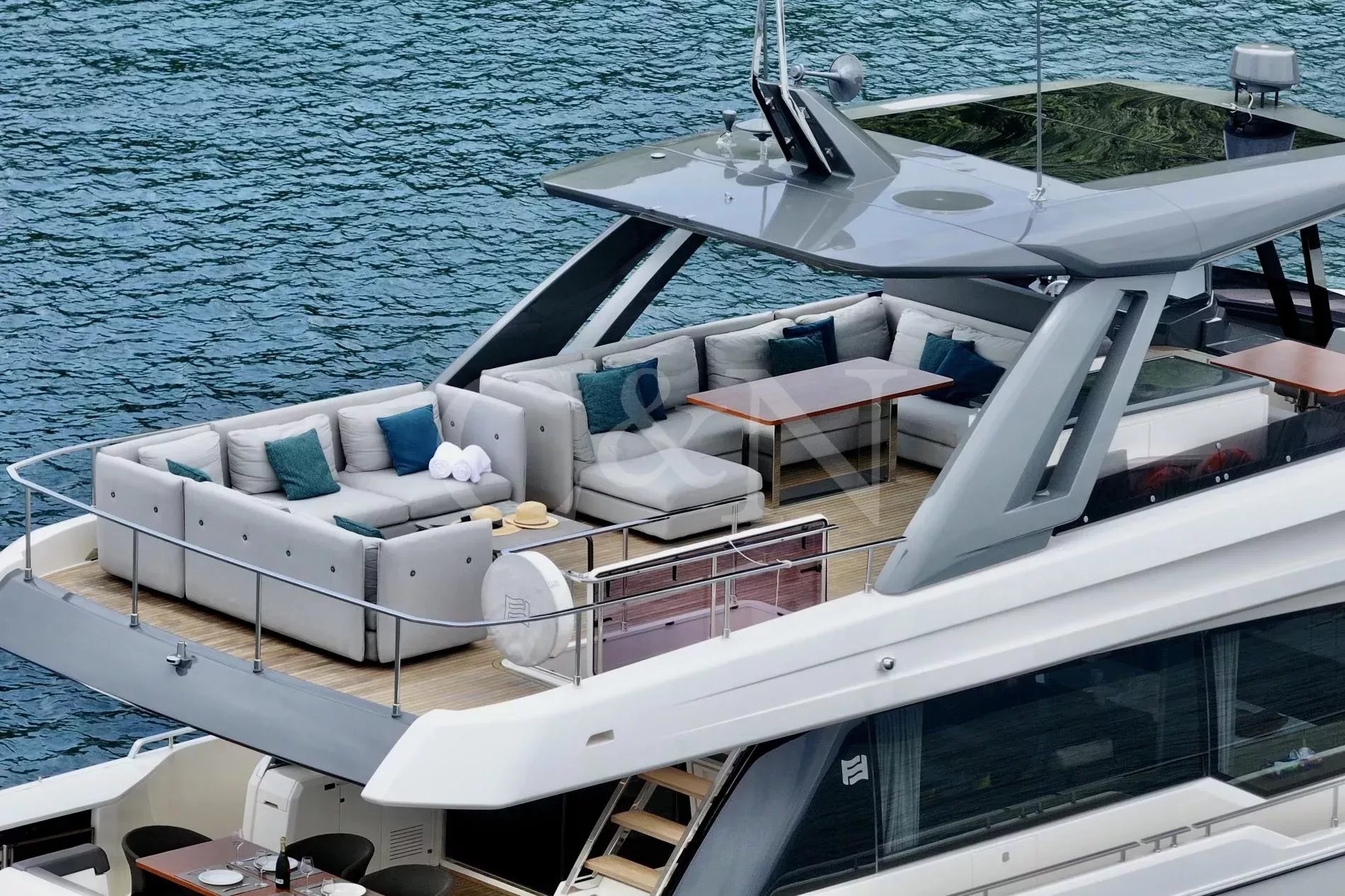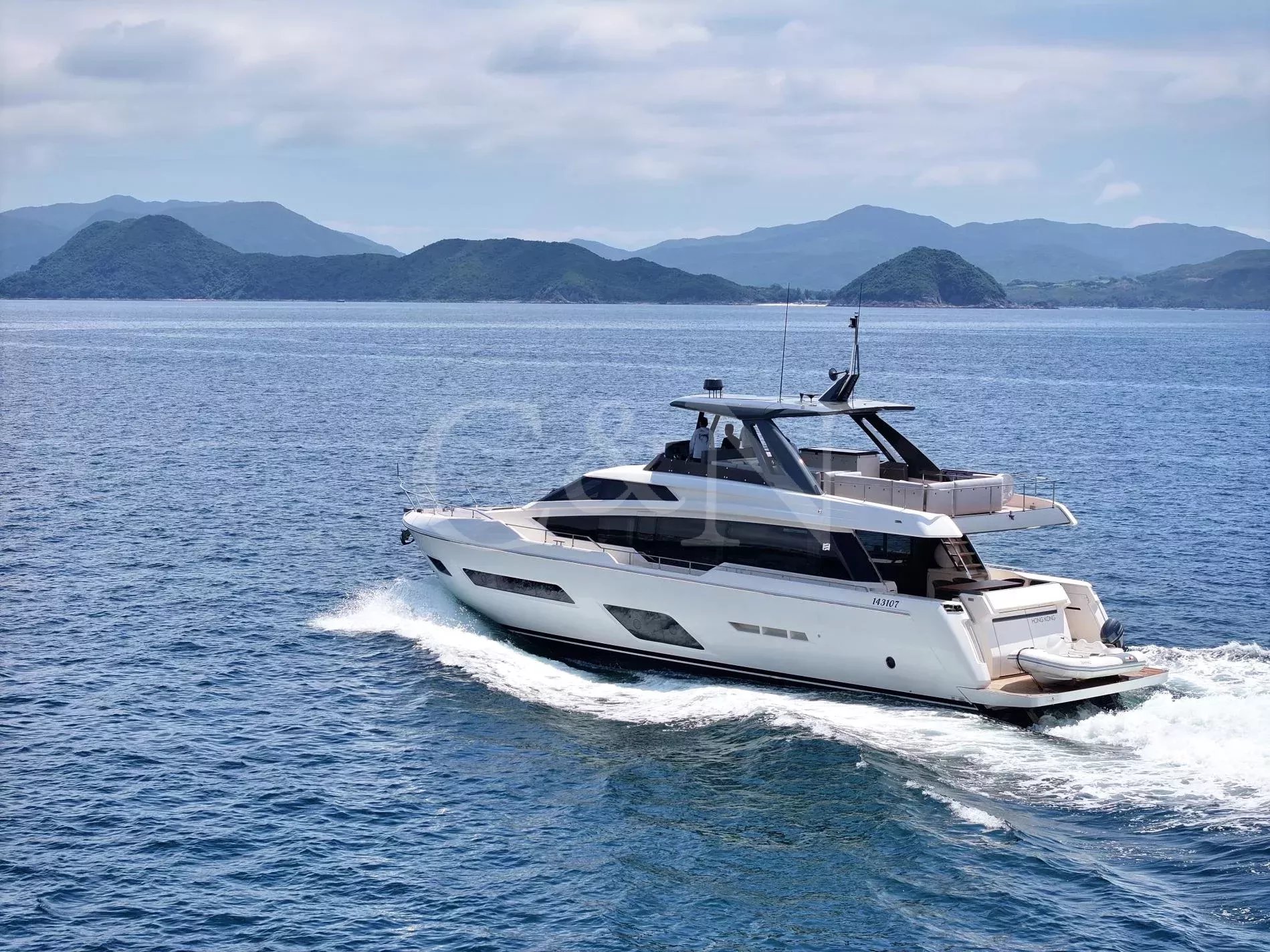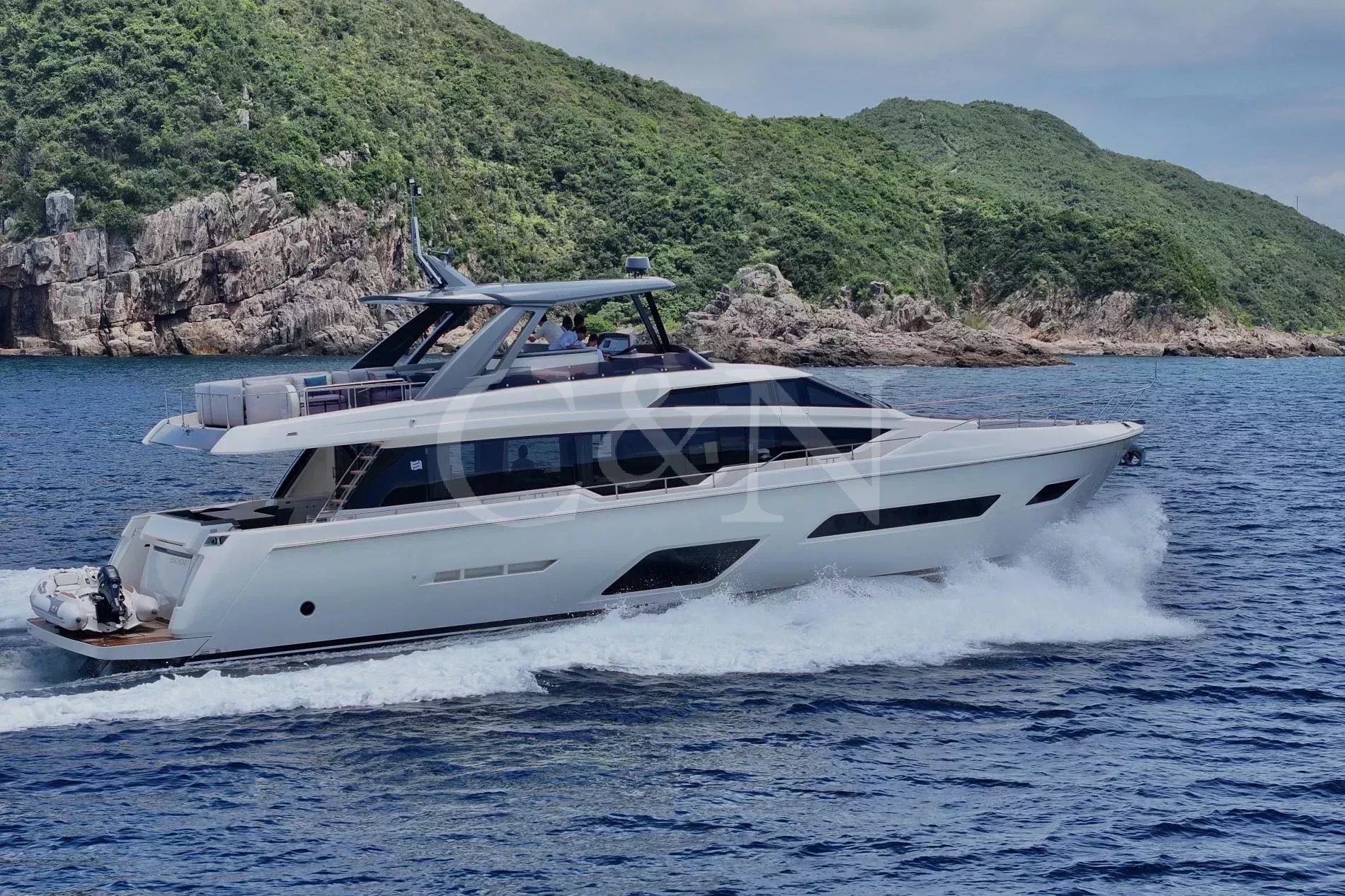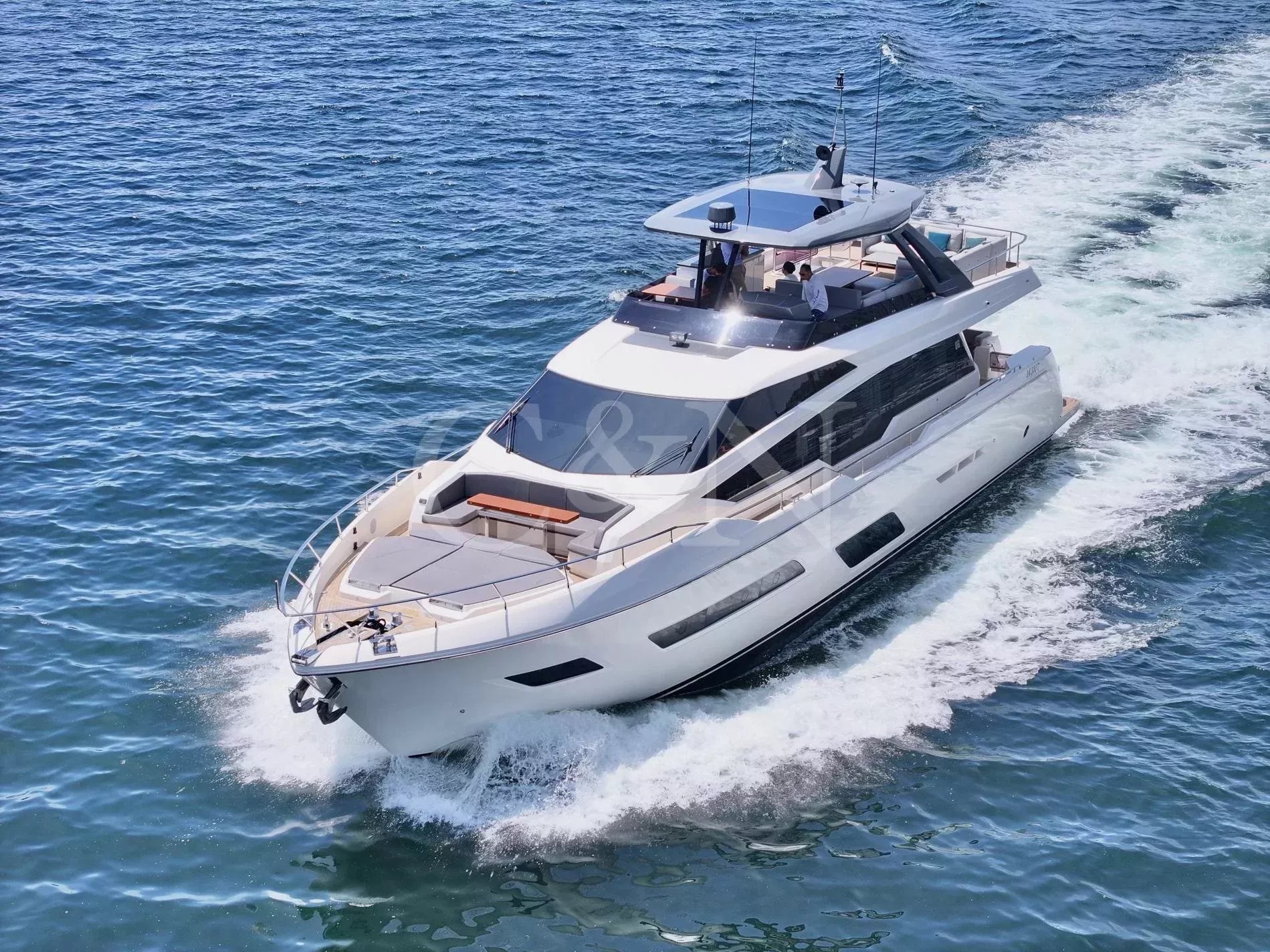 The Ferretti 780 represents one of the most successful models in the shipyard’s history. Launched to wide acclaim, it set a new standard for yachts in the sub-80-foot range with its intelligent layout and exceptional use of space. The series went on to win recognition at the World Yachts Trophies and Motor Boat Awards, for its combination of performance, comfort, and practicality.Delivered in 2018 with just one owner since new and exceptionally low engine hours, this model is offered in excellent condition and represents a substantial saving over the cost of a new yacht, with virtually no compromise.Outside is where the Ferretti 780 really shines. She has a large swim platform with a transom door that folds out to form a sunlounger overlooking action on the water. Hidden storage on either side keeps Seabobs and other toys neatly out of sight, while the aft deck provides a shaded dining area, ideal for breakfast or lunch at anchor. Above, the flybridge is the largest single space on board, spanning 37 square metres and ranking among the most spacious in its class. The layout includes generous seating with sofas and a dining table, along with a double BBQ, sink, and fridge, all beneath a carbon-reinforced hardtop with a glass inset. The aft section remains open to the sun with modular furniture can be rearranged to suit individual owner preferences.Forward, the bow area adds another outdoor zone, with a fold-out table, sunpad, and bench seating.The main salon features curved windows that enhance the sense of space and allow plenty of natural light, complemented by a three-section sliding glass door that opens directly to the aft deck.The space is open plan with large sofa and a dedicated dining area forward. The galley is well equipped with upgraded appliances and arranged for both private family use and efficient crew operation. Forward, a spacious wheelhouse provides excellent visibility and a comfortable driving position for longer passages.Accommodation is for eight guests in four cabins on the lower deck. The full-beam master suite amidships is exceptional for a yacht under 80 feet, offering ample floor space, a large en suite, and a generous wardrobe.Guests are accommodated in a forward VIP cabin and two twin guest cabins, with crew quarters aft. This layout suits family cruising perfectly, offering a balance between manageable size and comfort. Built using advanced resin-infusion techniques for strength and weight efficiency, the Ferretti 780 delivers quiet, stable performance across a cruising range of 16 to 25 knots thanks to twin MAN V12 engines. Fly-by-wire electro-hydraulic steering and a Simrad-Naviop integrated navigation suite provide precise control, while excellent sound insulation keeps the interior quiet underway.