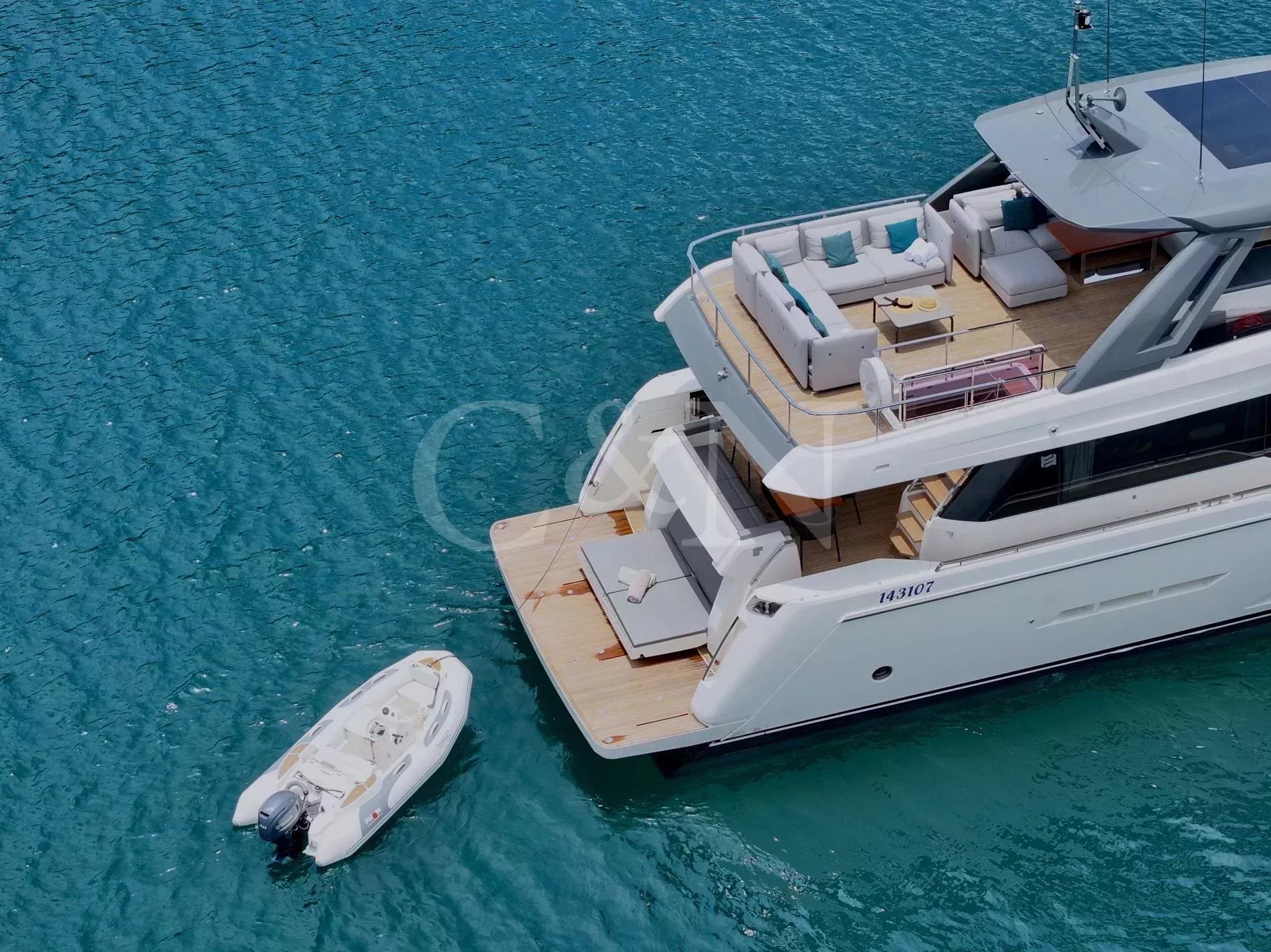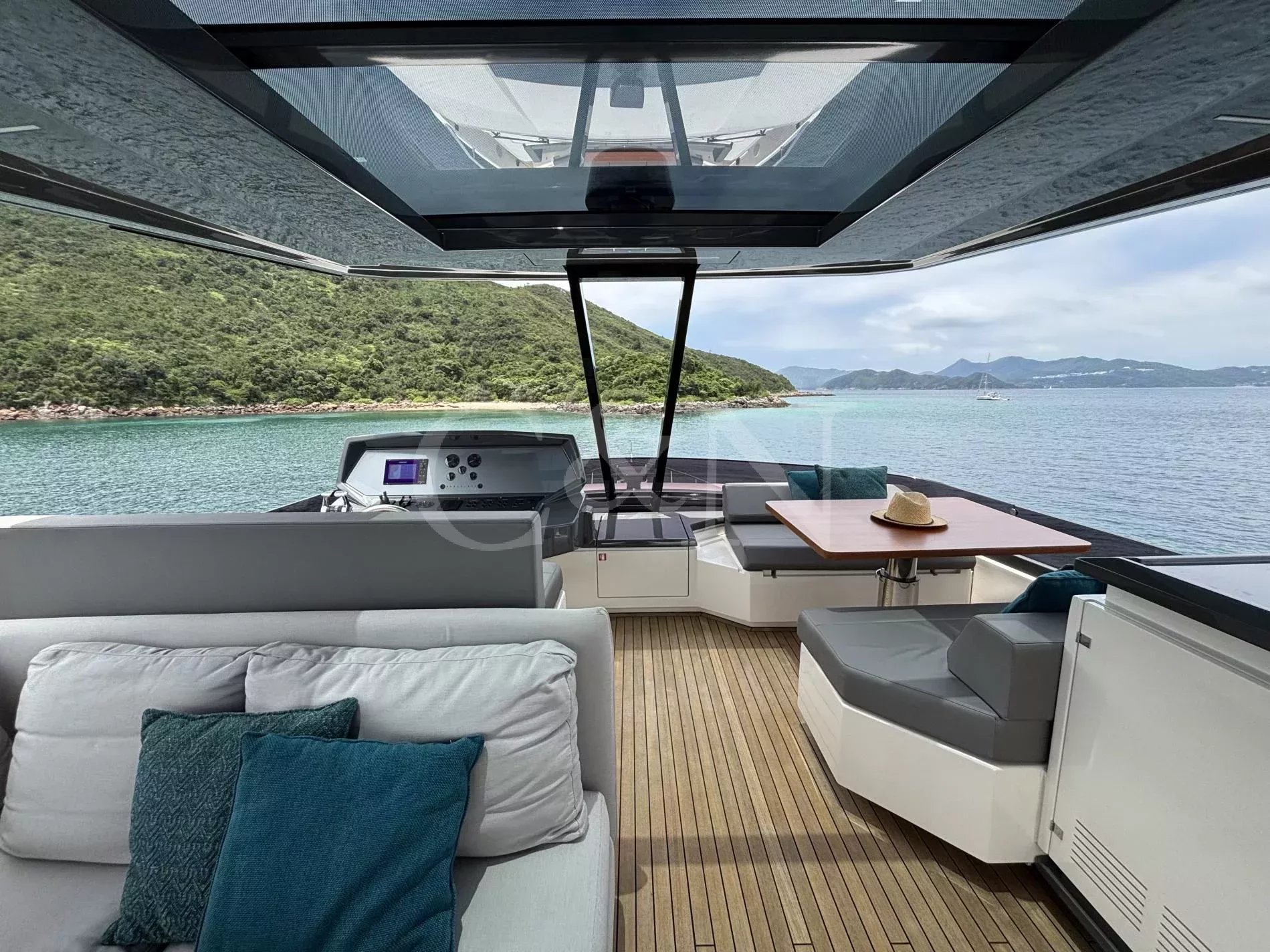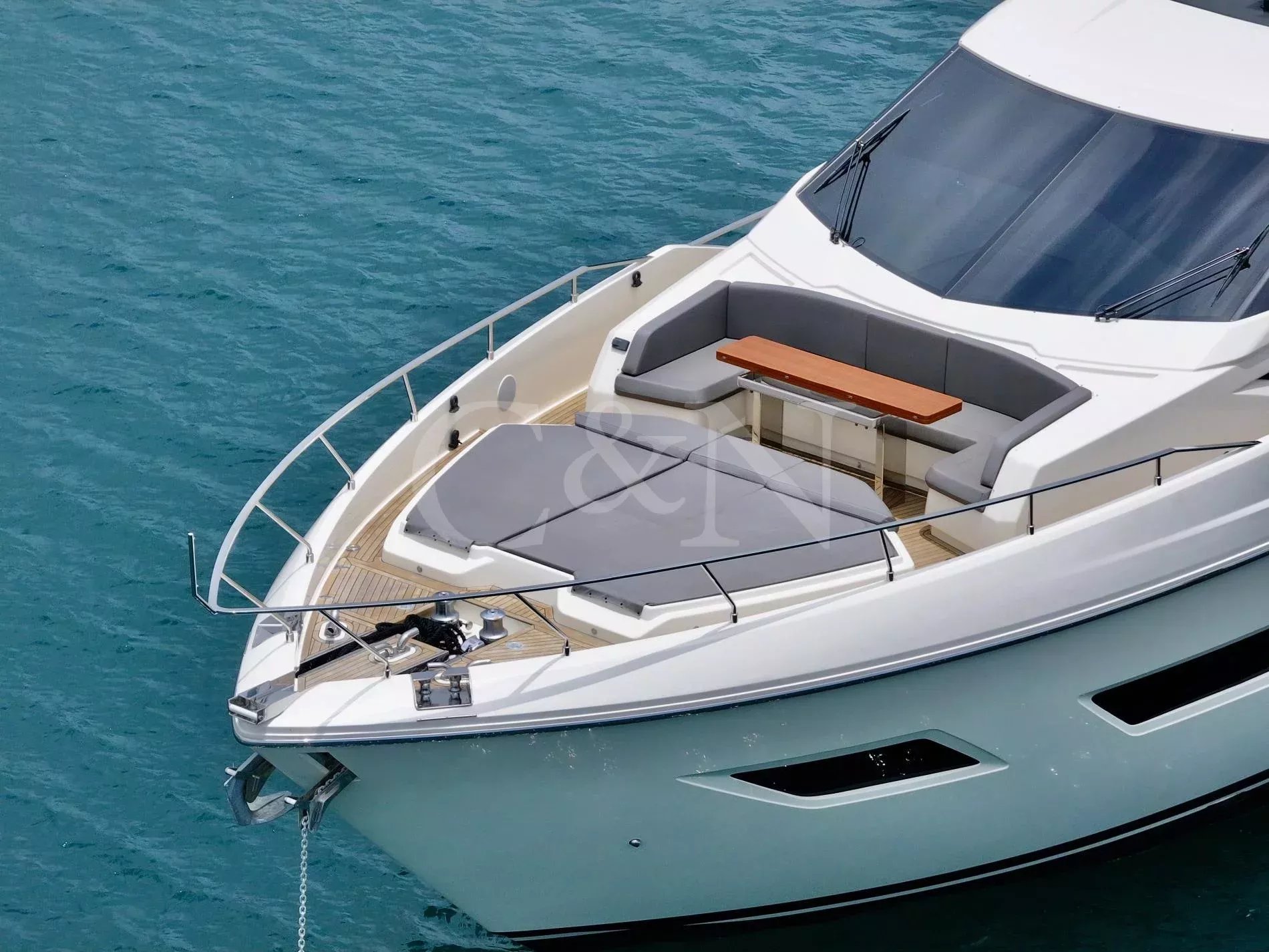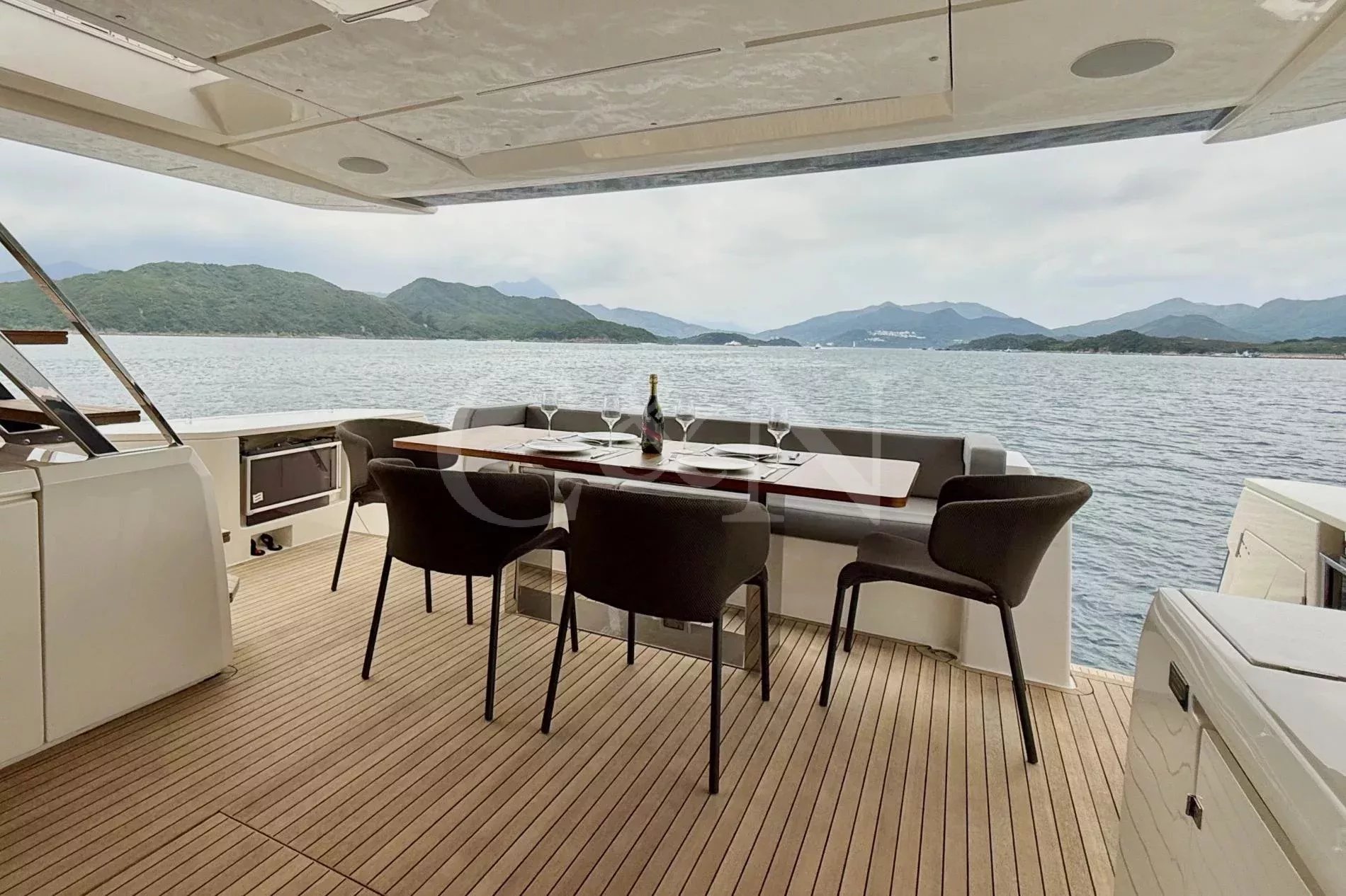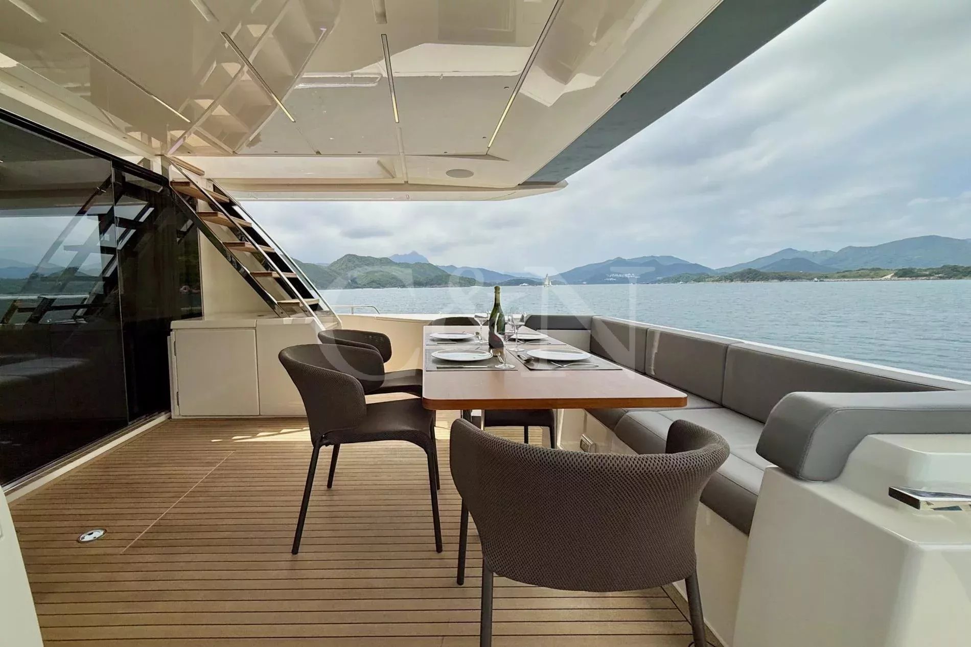 The Ferretti 780 represents one of the most successful models in the shipyard’s history. Launched to wide acclaim, it set a new standard for yachts in the sub-80-foot range with its intelligent layout and exceptional use of space. The series went on to win recognition at the World Yachts Trophies and Motor Boat Awards, for its combination of performance, comfort, and practicality.Delivered in 2018 with just one owner since new and exceptionally low engine hours, this model is offered in excellent condition and represents a substantial saving over the cost of a new yacht, with virtually no compromise.Outside is where the Ferretti 780 really shines. She has a large swim platform with a transom door that folds out to form a sunlounger overlooking action on the water. Hidden storage on either side keeps Seabobs and other toys neatly out of sight, while the aft deck provides a shaded dining area, ideal for breakfast or lunch at anchor. Above, the flybridge is the largest single space on board, spanning 37 square metres and ranking among the most spacious in its class. The layout includes generous seating with sofas and a dining table, along with a double BBQ, sink, and fridge, all beneath a carbon-reinforced hardtop with a glass inset. The aft section remains open to the sun with modular furniture can be rearranged to suit individual owner preferences.Forward, the bow area adds another outdoor zone, with a fold-out table, sunpad, and bench seating.The main salon features curved windows that enhance the sense of space and allow plenty of natural light, complemented by a three-section sliding glass door that opens directly to the aft deck.The space is open plan with large sofa and a dedicated dining area forward. The galley is well equipped with upgraded appliances and arranged for both private family use and efficient crew operation. Forward, a spacious wheelhouse provides excellent visibility and a comfortable driving position for longer passages.Accommodation is for eight guests in four cabins on the lower deck. The full-beam master suite amidships is exceptional for a yacht under 80 feet, offering ample floor space, a large en suite, and a generous wardrobe.Guests are accommodated in a forward VIP cabin and two twin guest cabins, with crew quarters aft. This layout suits family cruising perfectly, offering a balance between manageable size and comfort. Built using advanced resin-infusion techniques for strength and weight efficiency, the Ferretti 780 delivers quiet, stable performance across a cruising range of 16 to 25 knots thanks to twin MAN V12 engines. Fly-by-wire electro-hydraulic steering and a Simrad-Naviop integrated navigation suite provide precise control, while excellent sound insulation keeps the interior quiet underway.