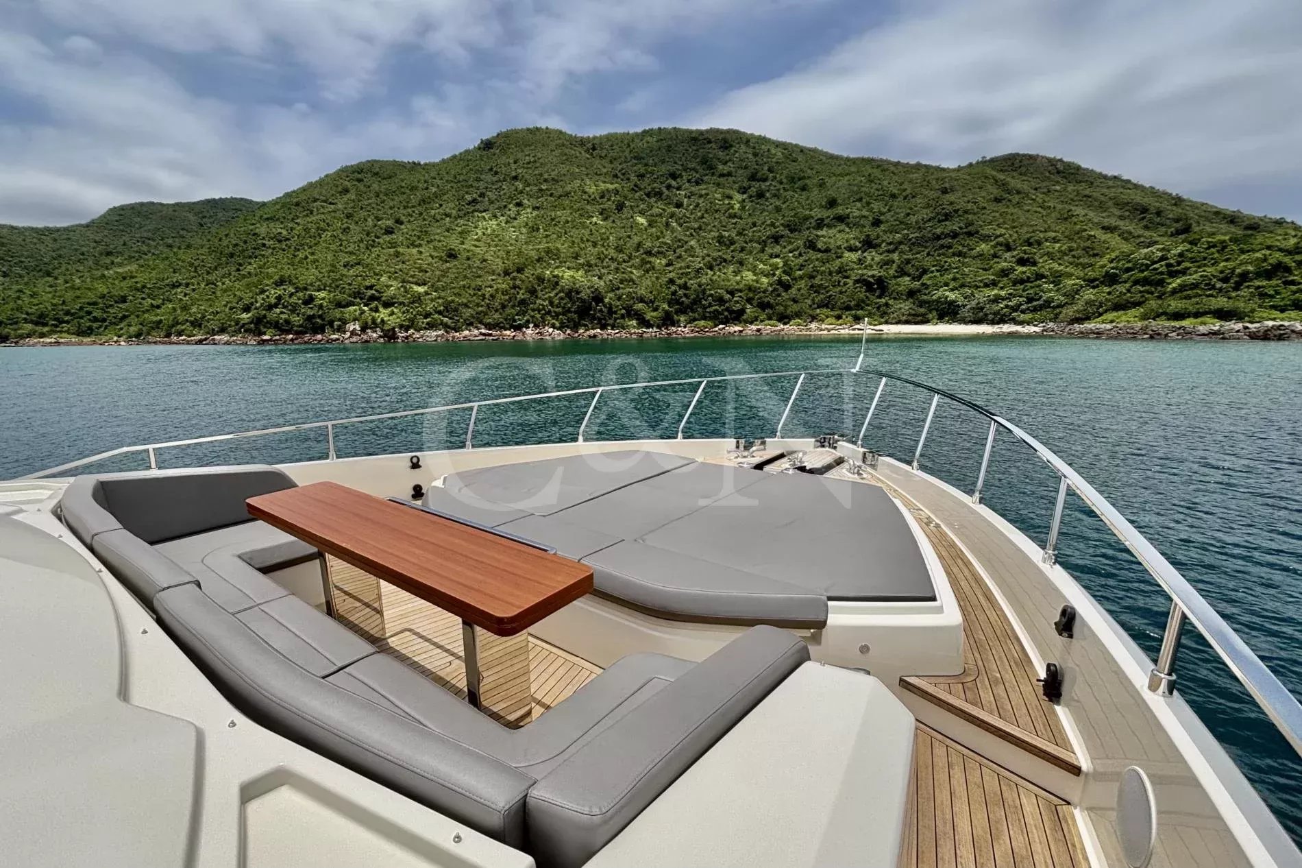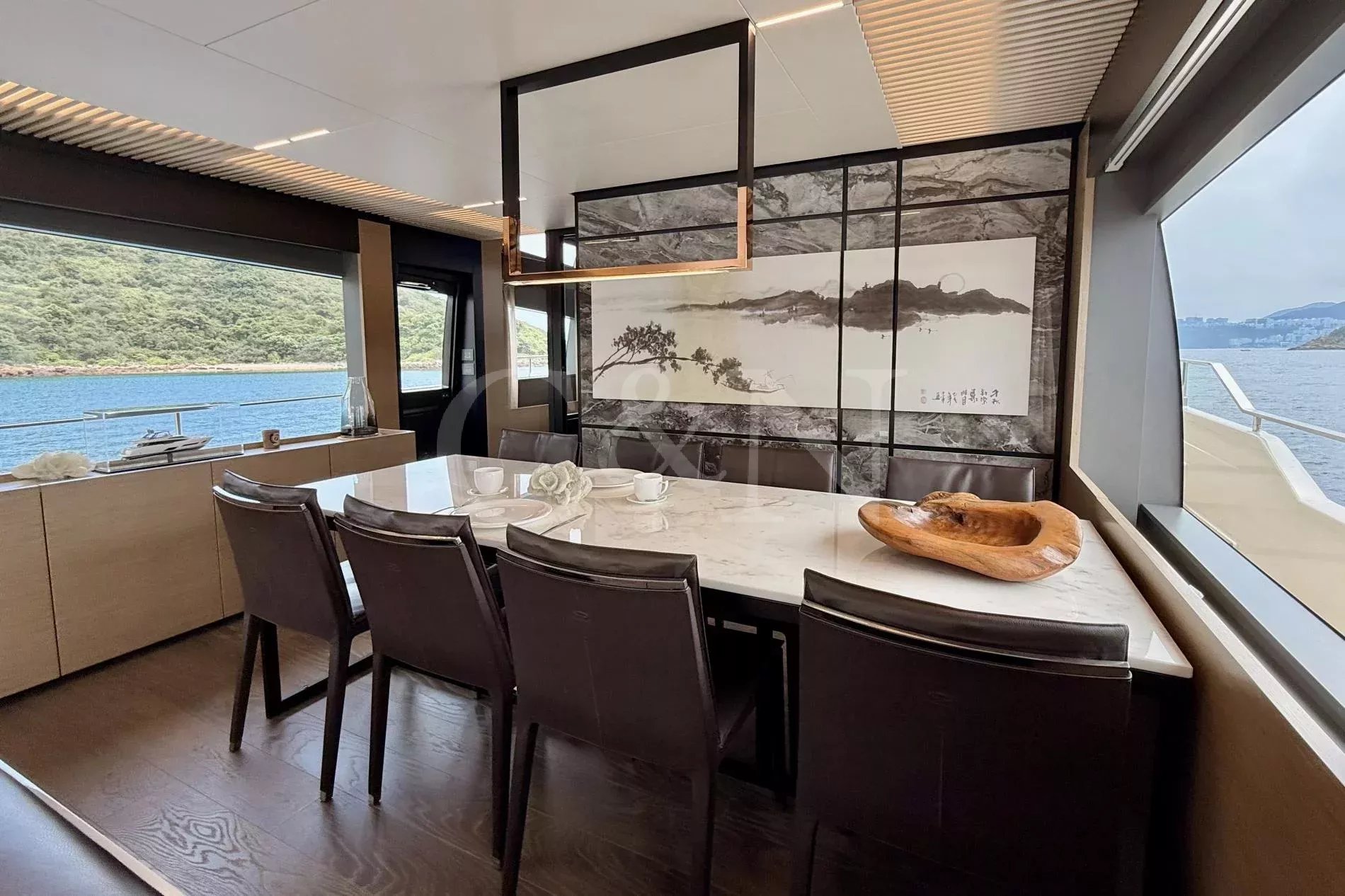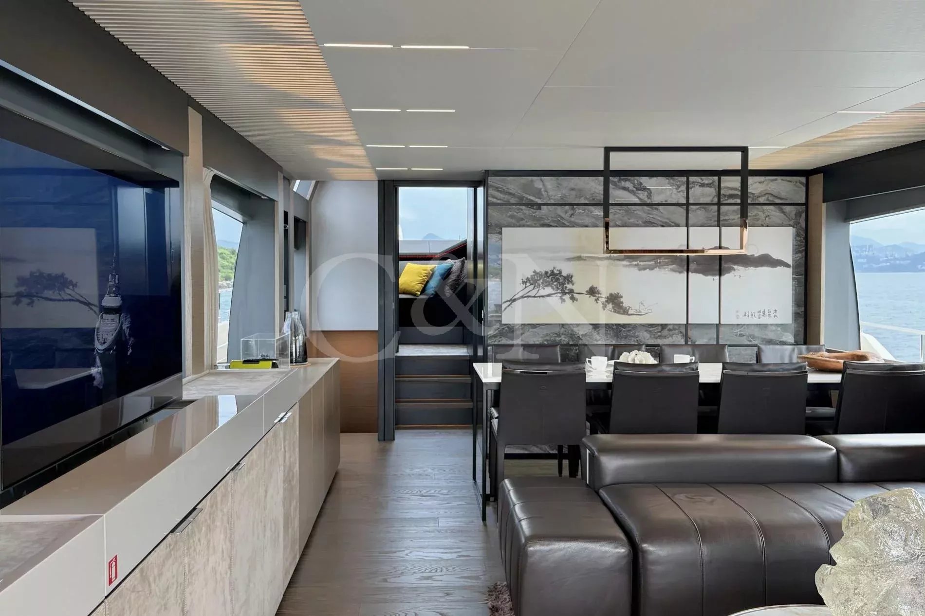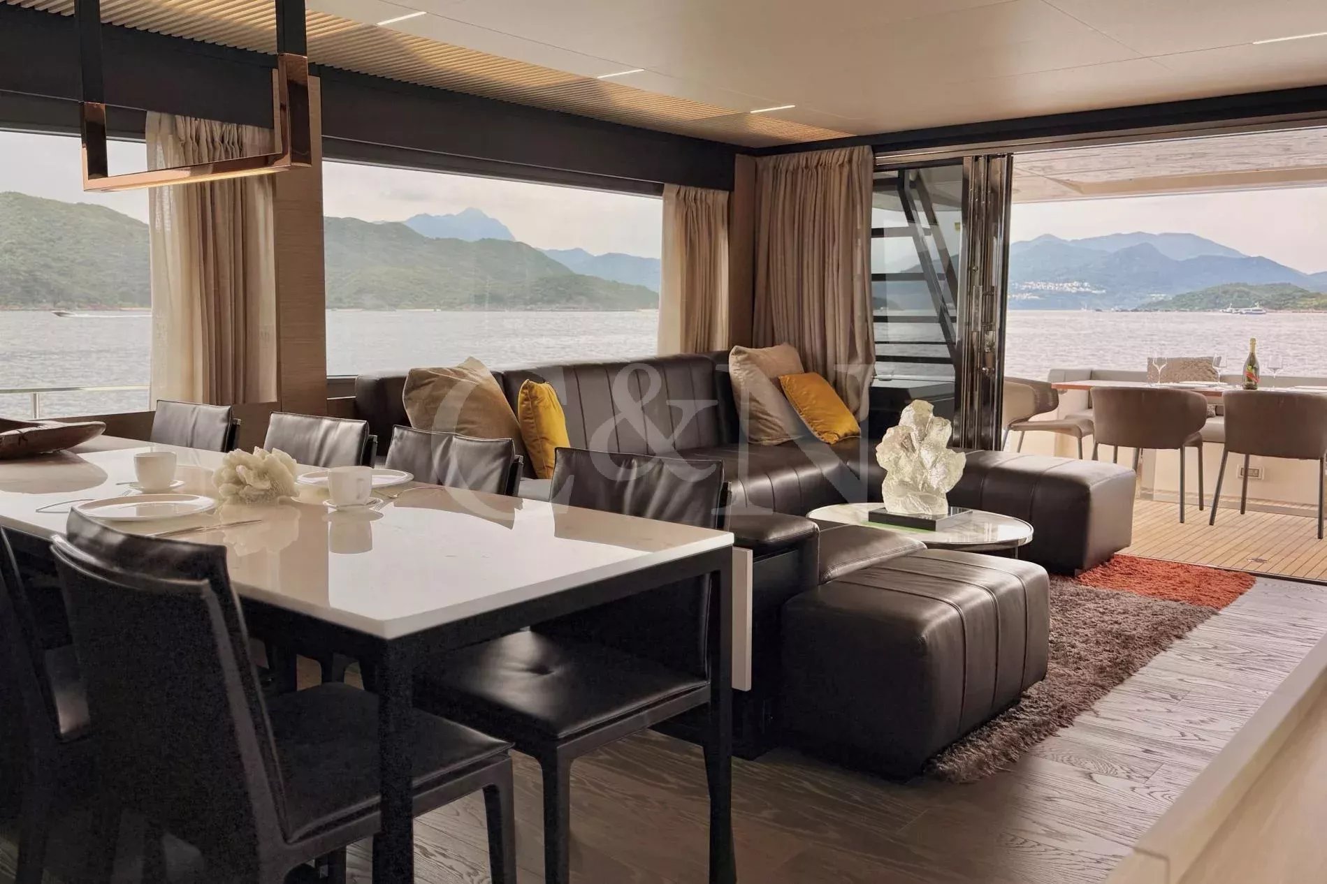 The Ferretti 780 represents one of the most successful models in the shipyard’s history. Launched to wide acclaim, it set a new standard for yachts in the sub-80-foot range with its intelligent layout and exceptional use of space. The series went on to win recognition at the World Yachts Trophies and Motor Boat Awards, for its combination of performance, comfort, and practicality.Delivered in 2018 with just one owner since new and exceptionally low engine hours, this model is offered in excellent condition and represents a substantial saving over the cost of a new yacht, with virtually no compromise.Outside is where the Ferretti 780 really shines. She has a large swim platform with a transom door that folds out to form a sunlounger overlooking action on the water. Hidden storage on either side keeps Seabobs and other toys neatly out of sight, while the aft deck provides a shaded dining area, ideal for breakfast or lunch at anchor. Above, the flybridge is the largest single space on board, spanning 37 square metres and ranking among the most spacious in its class. The layout includes generous seating with sofas and a dining table, along with a double BBQ, sink, and fridge, all beneath a carbon-reinforced hardtop with a glass inset. The aft section remains open to the sun with modular furniture can be rearranged to suit individual owner preferences.Forward, the bow area adds another outdoor zone, with a fold-out table, sunpad, and bench seating.The main salon features curved windows that enhance the sense of space and allow plenty of natural light, complemented by a three-section sliding glass door that opens directly to the aft deck.The space is open plan with large sofa and a dedicated dining area forward. The galley is well equipped with upgraded appliances and arranged for both private family use and efficient crew operation. Forward, a spacious wheelhouse provides excellent visibility and a comfortable driving position for longer passages.Accommodation is for eight guests in four cabins on the lower deck. The full-beam master suite amidships is exceptional for a yacht under 80 feet, offering ample floor space, a large en suite, and a generous wardrobe.Guests are accommodated in a forward VIP cabin and two twin guest cabins, with crew quarters aft. This layout suits family cruising perfectly, offering a balance between manageable size and comfort. Built using advanced resin-infusion techniques for strength and weight efficiency, the Ferretti 780 delivers quiet, stable performance across a cruising range of 16 to 25 knots thanks to twin MAN V12 engines. Fly-by-wire electro-hydraulic steering and a Simrad-Naviop integrated navigation suite provide precise control, while excellent sound insulation keeps the interior quiet underway.