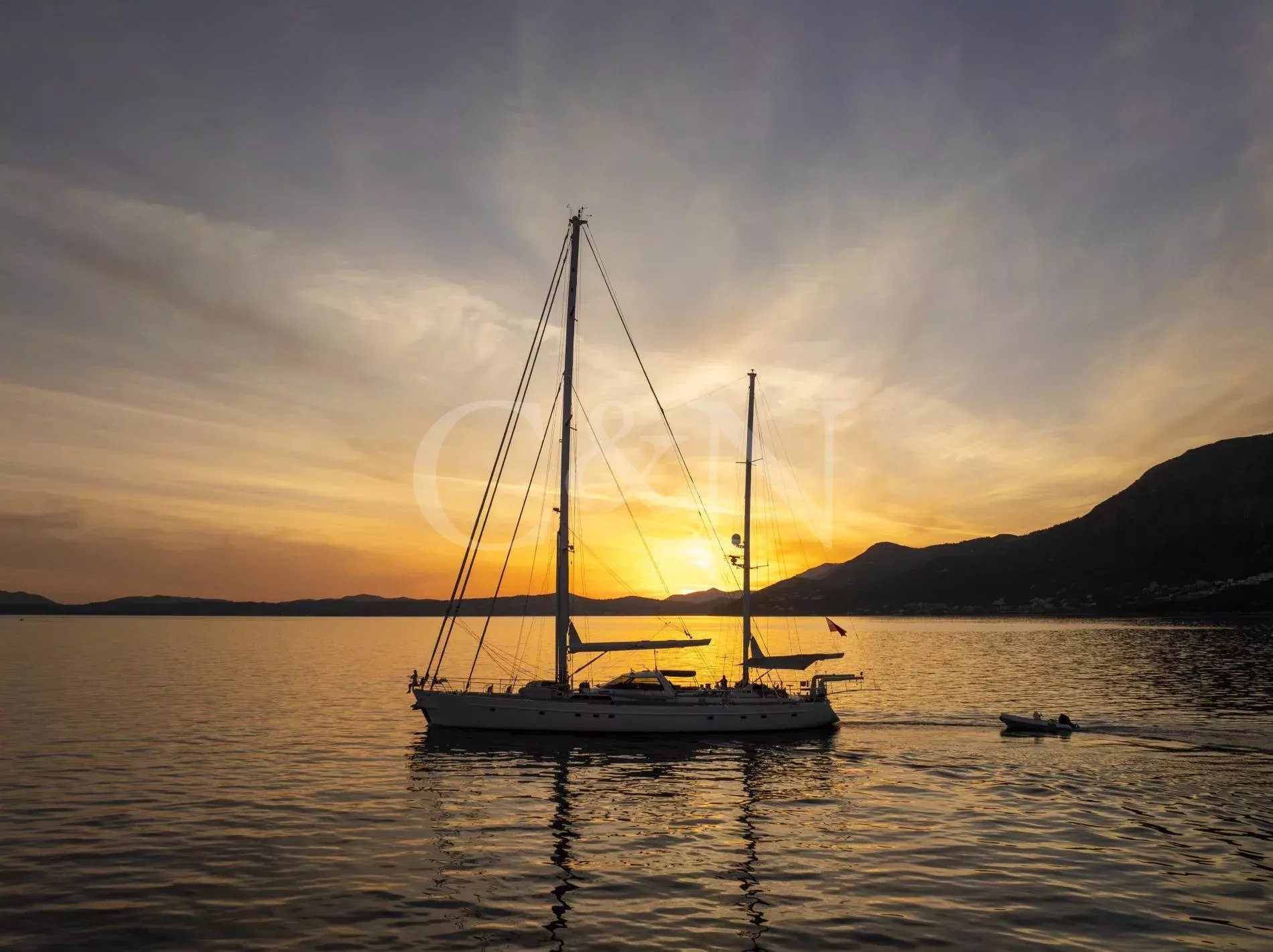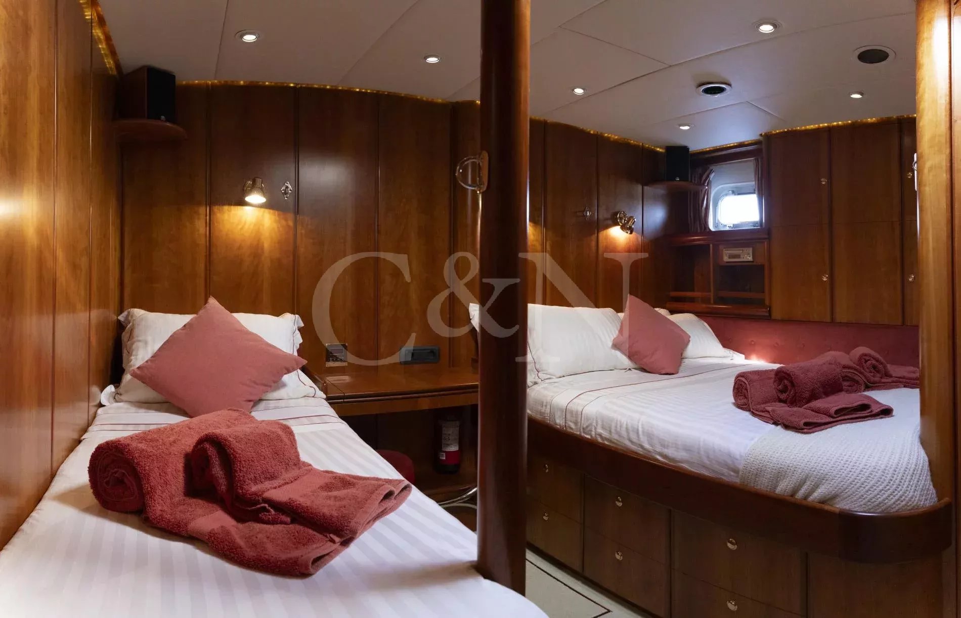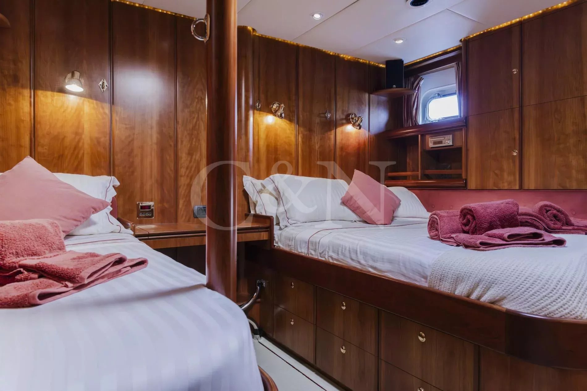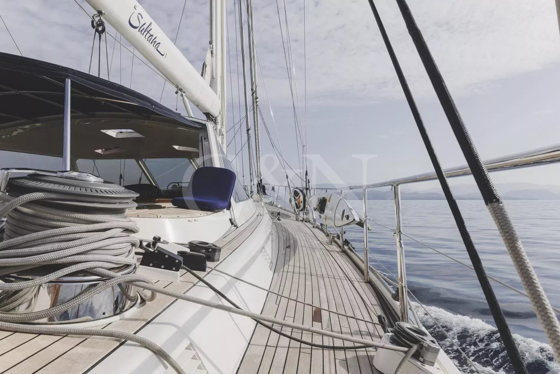 Built by Van Dam Nordia and designed by Robert Van Dam, Sultana is a custom bluewater ketch delivered to an experienced owner in 2003. Her construction followed an exacting brief for a vessel capable of coastal cruising and offshore passages, combining a strong aluminium build, a safe ketch rig and systems specified for reliability at sea.Sultana features Hall Spars masts, Reckman headsail furlers and Lewmar winches, while her ketch sail plan divides power across two smaller mains, keeping loads manageable and making reefing and trimming more controlled in heavy weather. A protected cockpit offers a sheltered position when underway and serves as the primary social space on deck at anchor.Her interior is traditional in style with an open galley, comfortable seating and a large screen forming the main living area. The joinery shows Dutch workmanship in both guest and crew spaces, and ventilation, stowage and equipment are arranged with usability in mind.Sultana accommodates eight guests in three en suite cabins: the owner’s cabin aft offers generous space, while the two guest cabins each sleep three. Crew spaces forward and aft support three crew.Sultana is powered by a single 425 hp Lugger engine with an engine room often compared to those on much larger yachts. Major works include new teak decks and a full repaint (2014), rebuilt machinery (2014), updated navigation instruments (2021), full line replacement (2022), serviced cockpit winches (2023) and serviced hydraulic furlers (2024).