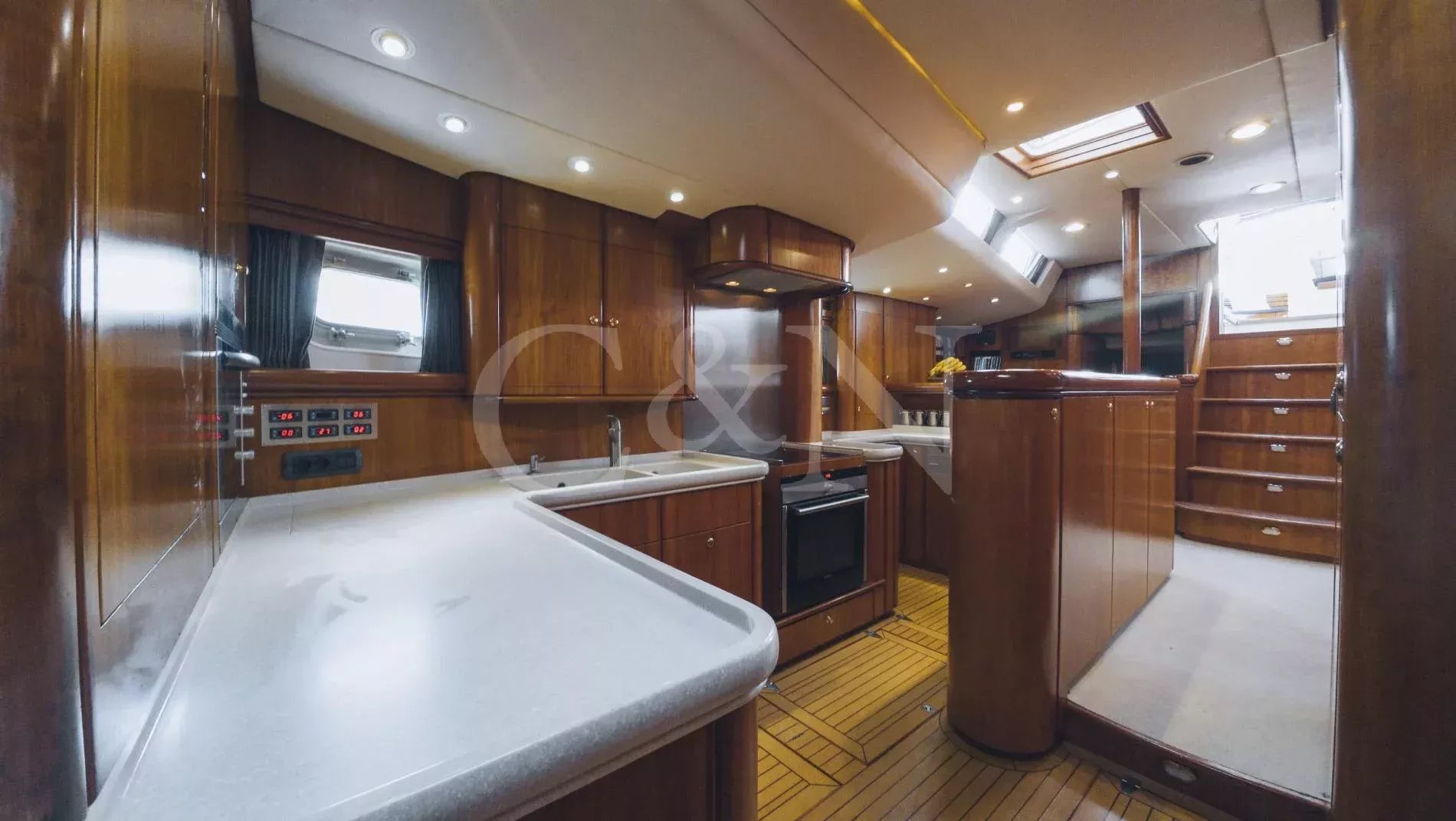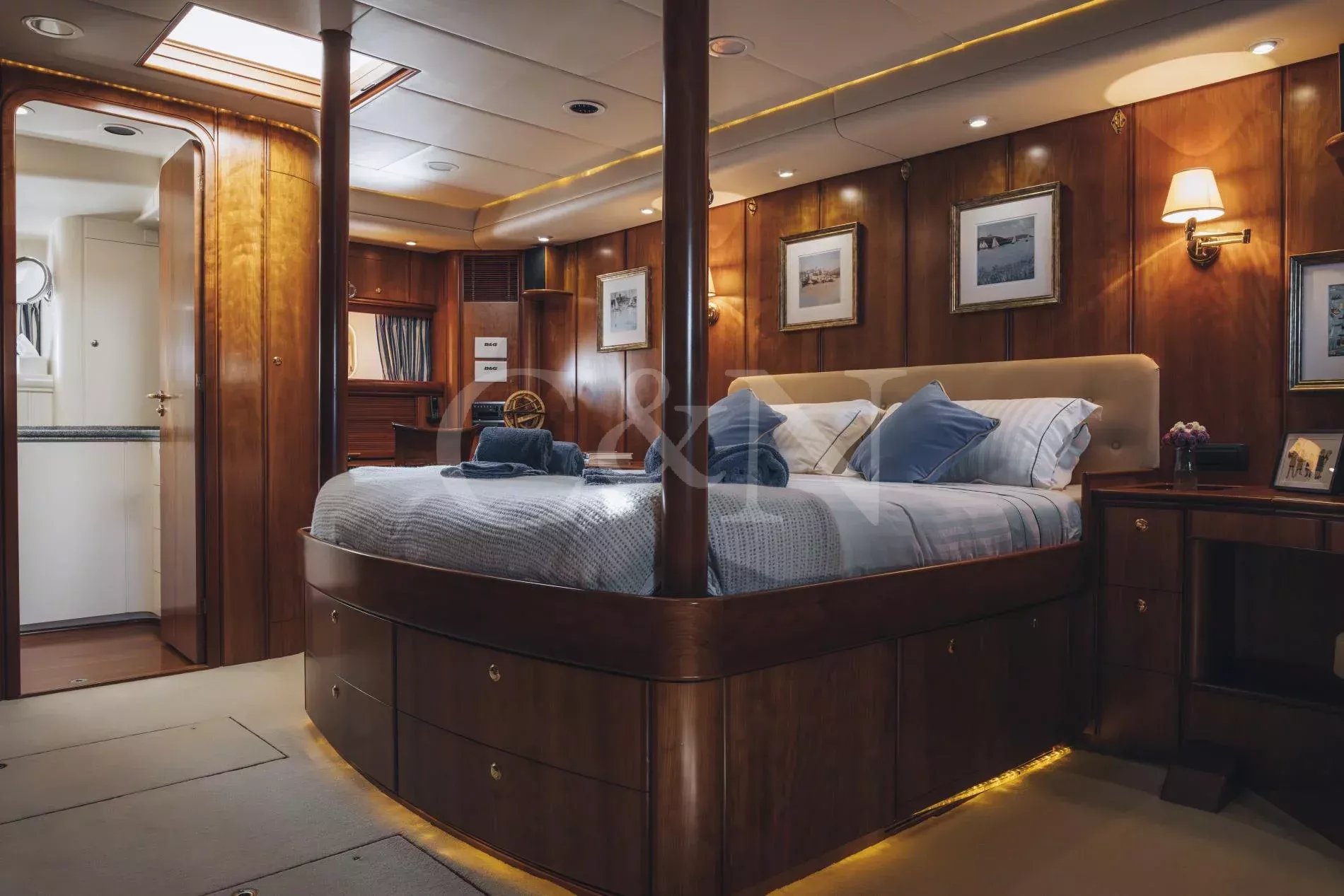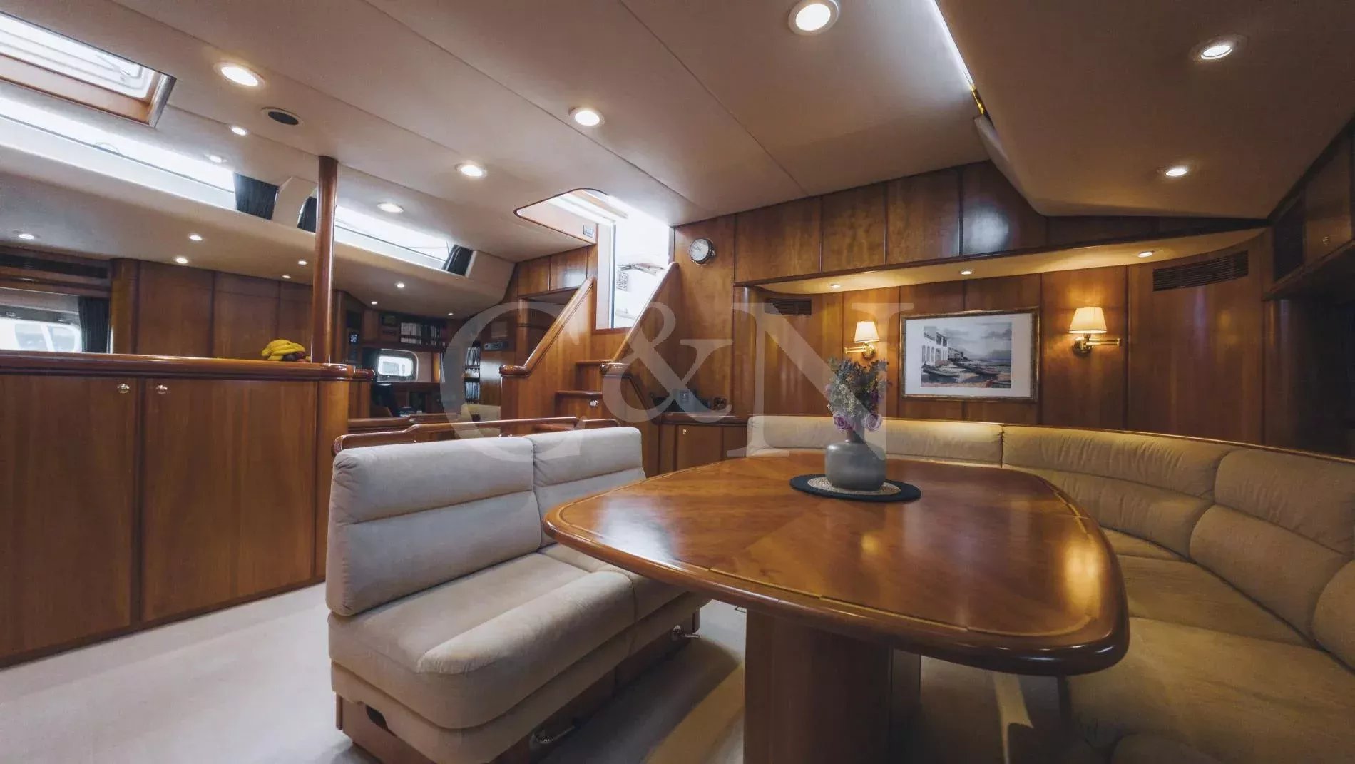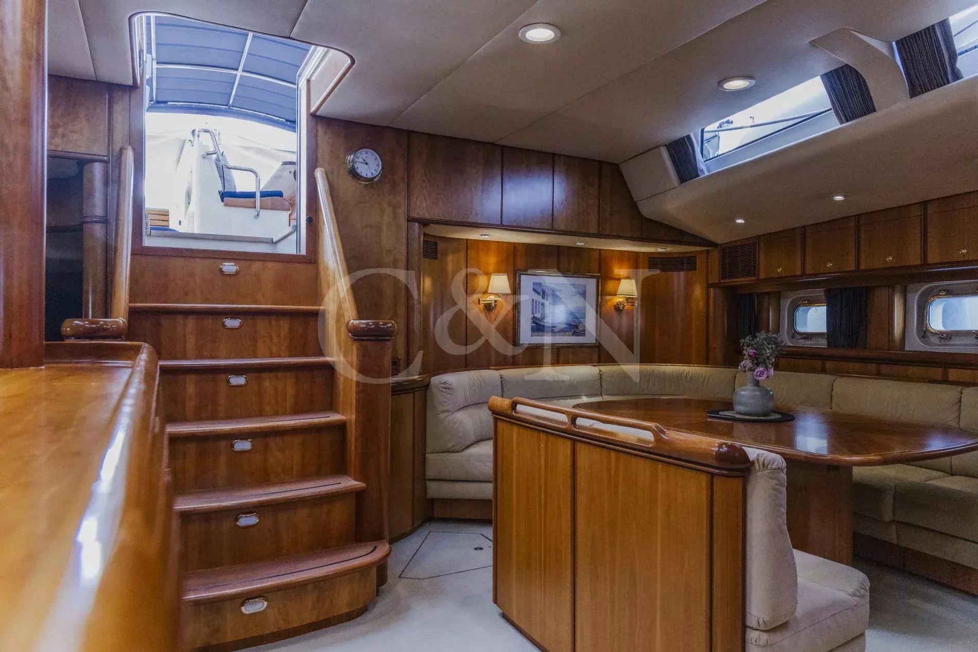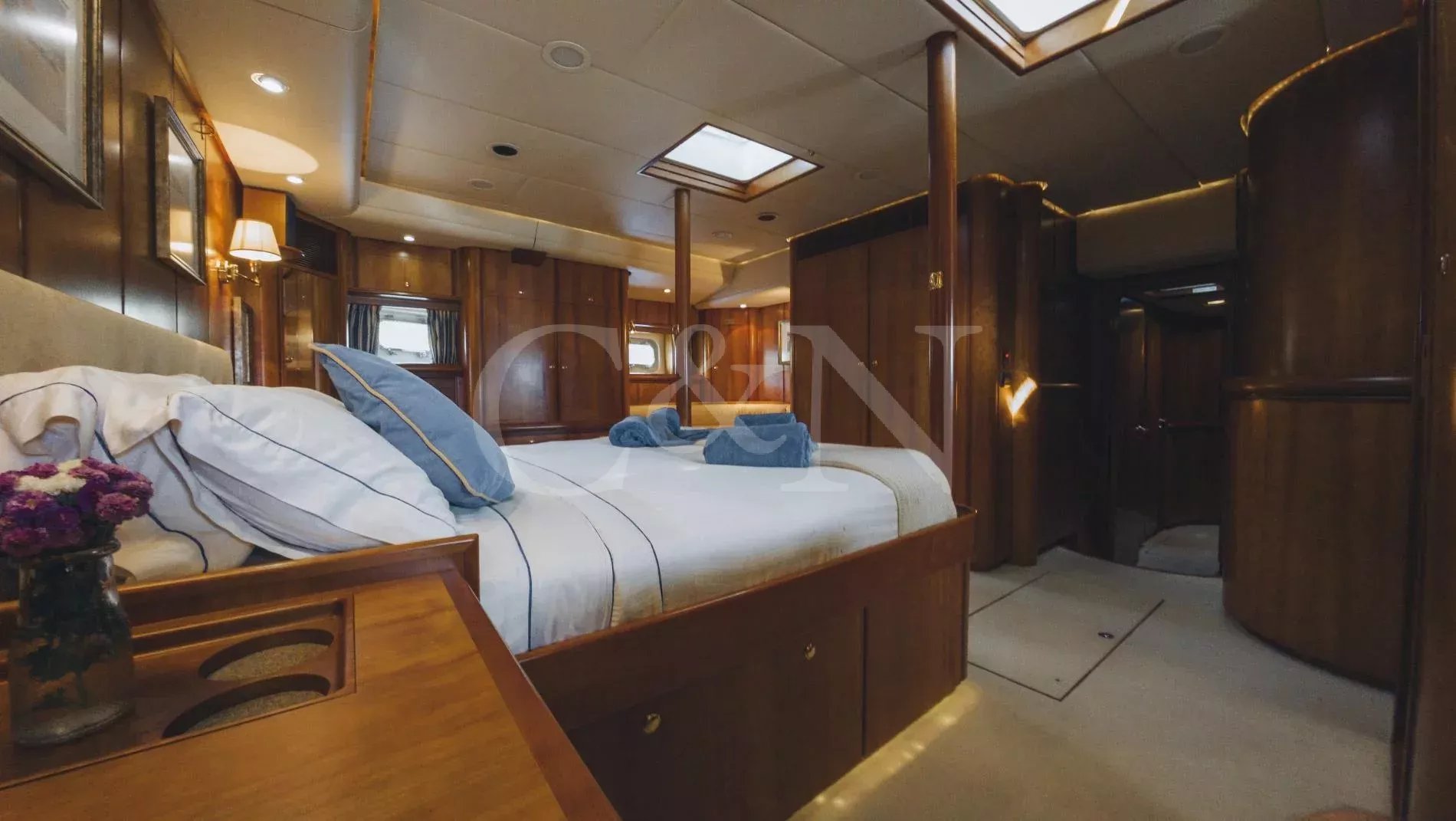 Built by Van Dam Nordia and designed by Robert Van Dam, Sultana is a custom bluewater ketch delivered to an experienced owner in 2003. Her construction followed an exacting brief for a vessel capable of coastal cruising and offshore passages, combining a strong aluminium build, a safe ketch rig and systems specified for reliability at sea.Sultana features Hall Spars masts, Reckman headsail furlers and Lewmar winches, while her ketch sail plan divides power across two smaller mains, keeping loads manageable and making reefing and trimming more controlled in heavy weather. A protected cockpit offers a sheltered position when underway and serves as the primary social space on deck at anchor.Her interior is traditional in style with an open galley, comfortable seating and a large screen forming the main living area. The joinery shows Dutch workmanship in both guest and crew spaces, and ventilation, stowage and equipment are arranged with usability in mind.Sultana accommodates eight guests in three en suite cabins: the owner’s cabin aft offers generous space, while the two guest cabins each sleep three. Crew spaces forward and aft support three crew.Sultana is powered by a single 425 hp Lugger engine with an engine room often compared to those on much larger yachts. Major works include new teak decks and a full repaint (2014), rebuilt machinery (2014), updated navigation instruments (2021), full line replacement (2022), serviced cockpit winches (2023) and serviced hydraulic furlers (2024).