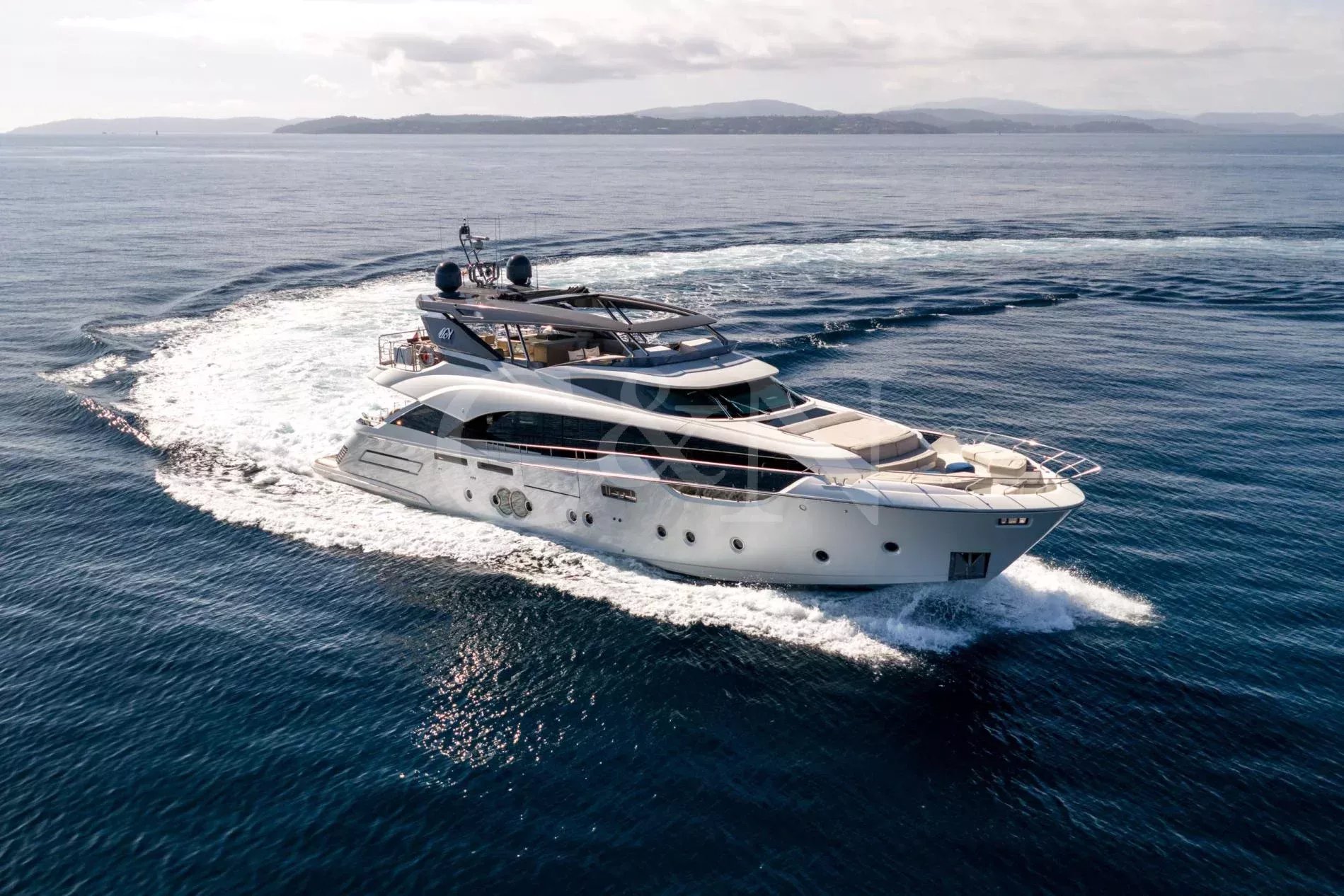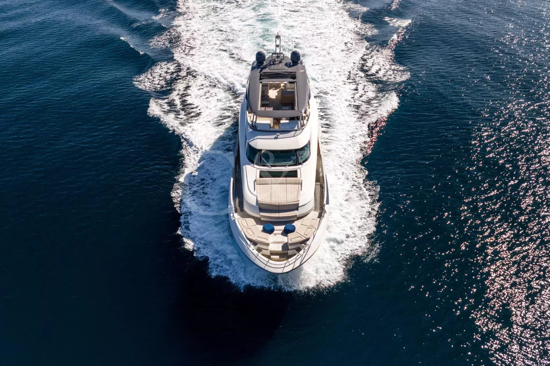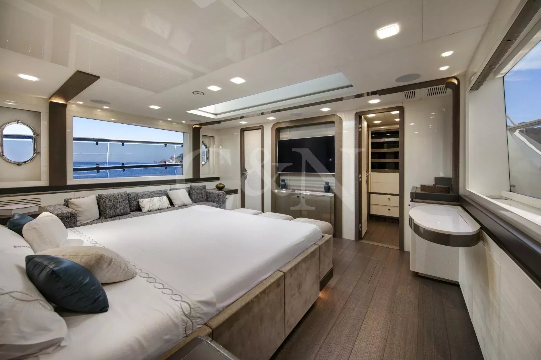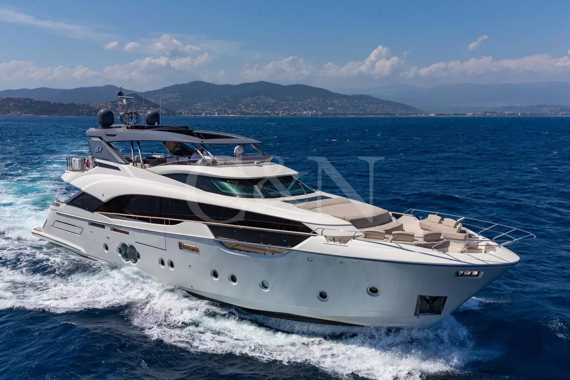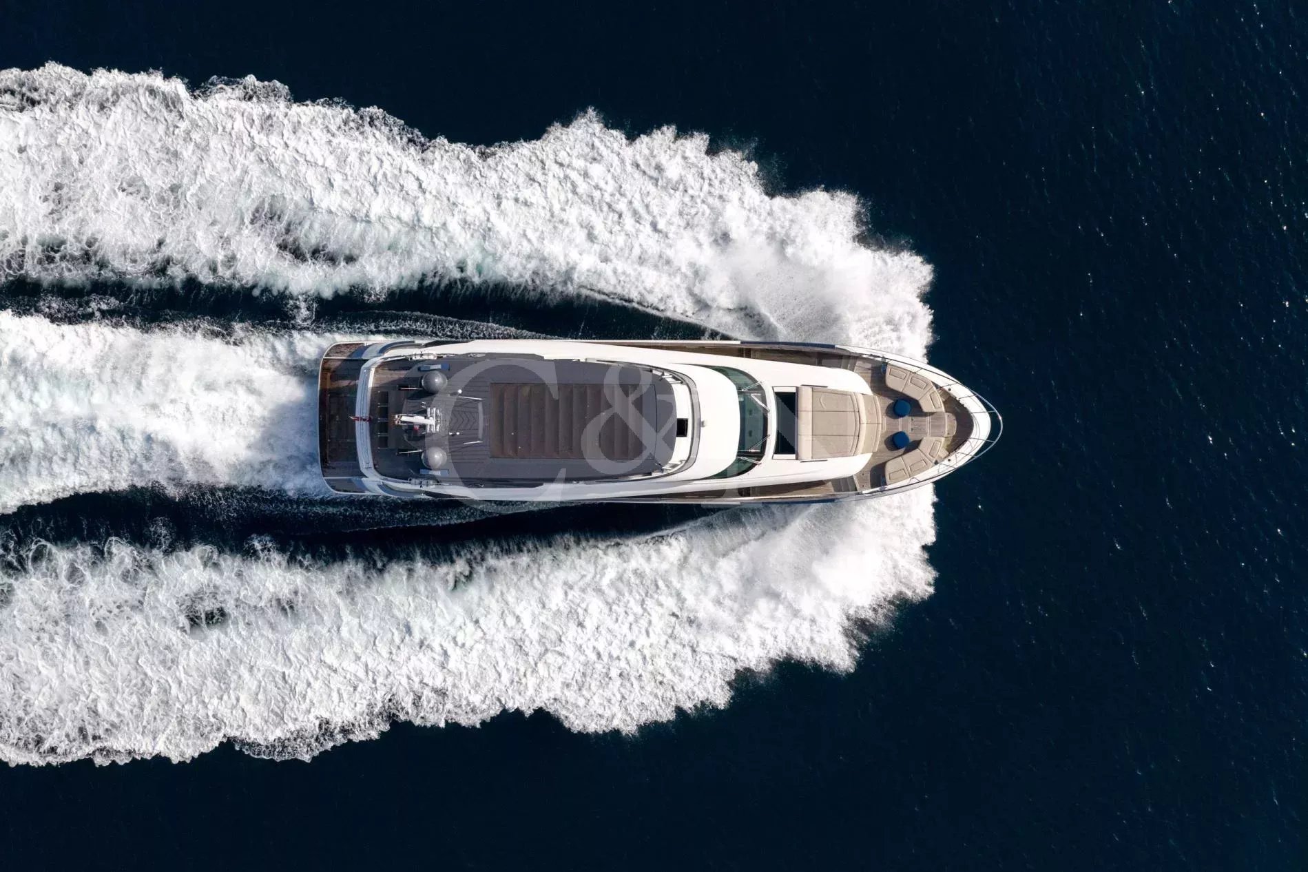 Esmeralda of the Seas stands as a notable example of Monte Carlo Yachts’ MCY 96, a series conceived to deliver exceptional comfort and space within a 29.26-metre footprint. She offers class-leading volume for her length thanks to the shipyard’s collaboration with Nuvolari Lenard, who distilled their experience in larger custom projects into a sub-30-metre design. Sporty lines and signature interlocking portlights give the MCY 96 a distinctive identity, supported by expansive glazing and generous interior spaces that appeal to owners seeking space and capability in this size range.Esmeralda of the Seas offers a well-arranged exterior layout, providing a trio of spaces for dining, lounging and entertaining. The main deck aft serves as the primary al fresco dining space overlooking the wake, while the foredeck features a generous sun lounge with adjustable sunpads. The area remains naturally private when berthed stern-to.Above, the flybridge is sheltered by a carbon-fibre hard top with a fully opening sunroof for sun or shade on demand, with a dining area, jacuzzi, extensive sofa seating and a well-equipped bar with refrigeration. At the stern is a large swim platform with a tender garage housing the Williams 445 and other watersports equipment.Her interior features an open-plan salon framed by full-height glazing that brings abundant natural light into the space. A large U-shaped lounge sits beneath architectural ceiling elements with recessed contrasting panels with vertical columns and beams that subtle structure without breaking the flow. A forward dining area seats up to ten with sliding doors on either side that open onto fold-down balconies, giving the main deck an expansive indoor–outdoor arrangement rarely found in this size range. A bar with an ice maker, refrigerator and integrated multimedia systems are hidden from view, while loose furniture provides the flexibility to reconfigure the space.Esmeralda of the Seas offers accommodation for up to eleven guests across five cabins, giving the yacht notable capacity and flexibility within its class. The owner’s suite is positioned on the main deck and takes full advantage of the MCY 96’s forward glazing, with sweeping 180-degree views that bring natural light deep into the cabin. The space includes a generous dressing area and a beautifully appointed en suite bathroom.Four guest cabins are arranged on the lower deck, including one with a Pullman berth, suited to family cruising or charter operations. Further accommodation sleeps a crew of five.Esmeralda of the Seas is powered by MTU 16V 2000 M86 engines, giving her a 20-knot cruising speed and a top speed of 26 knots. CMC electric stabilisers operate both underway and at anchor to enhance comfort. RINA classification and commercial registration under 24 metres expand her operational scope for private use or continued charter activity.