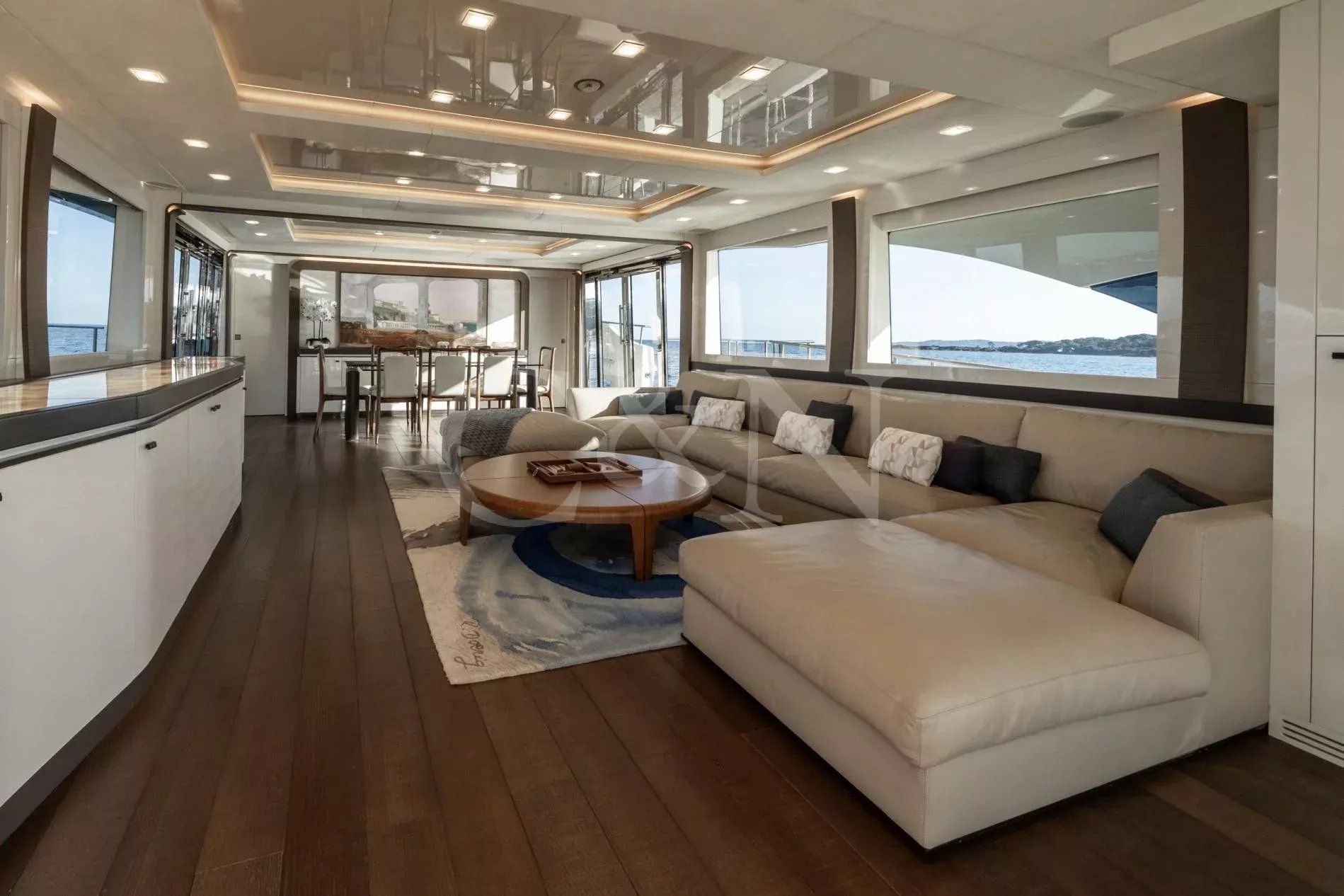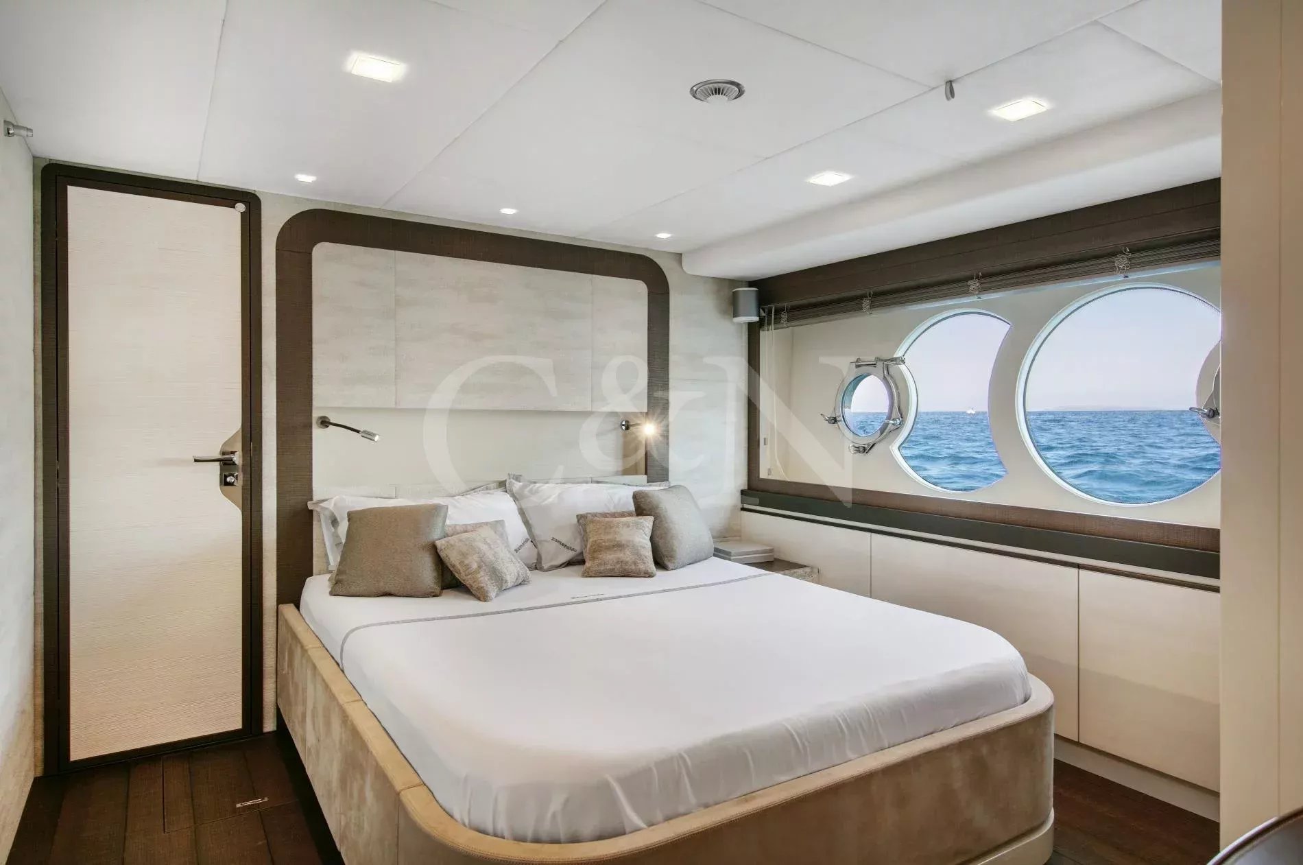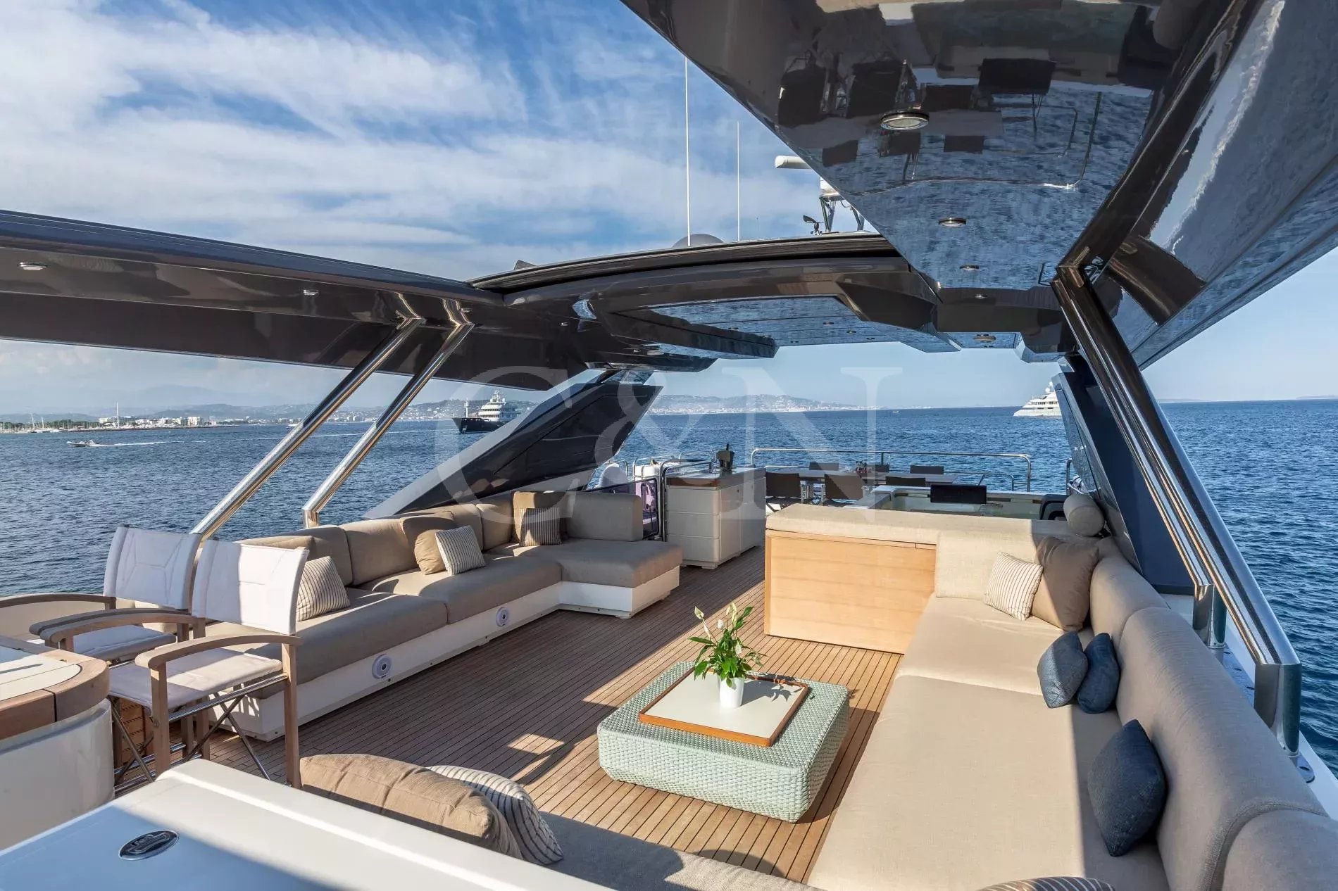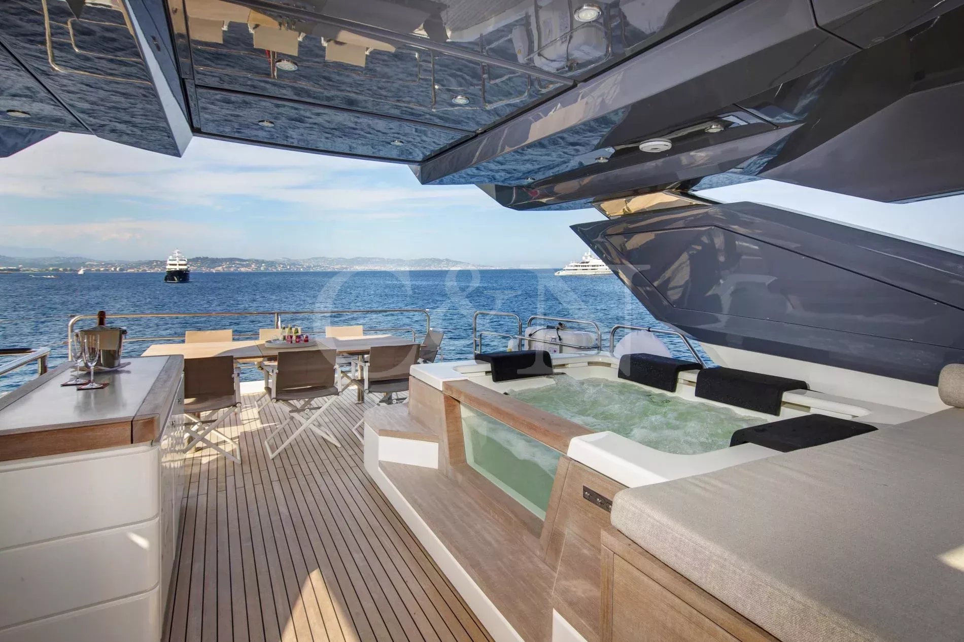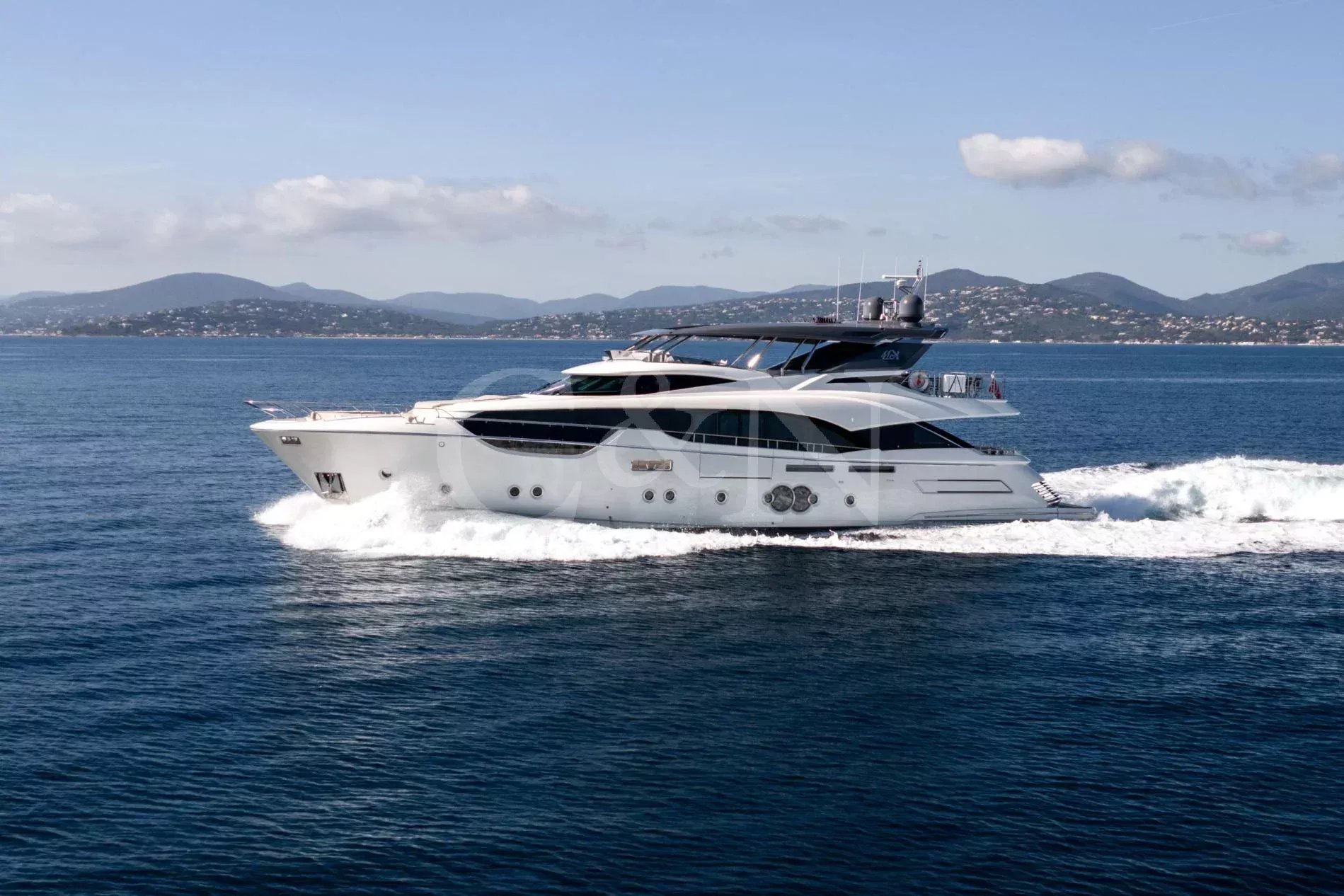 Esmeralda of the Seas stands as a notable example of Monte Carlo Yachts’ MCY 96, a series conceived to deliver exceptional comfort and space within a 29.26-metre footprint. She offers class-leading volume for her length thanks to the shipyard’s collaboration with Nuvolari Lenard, who distilled their experience in larger custom projects into a sub-30-metre design. Sporty lines and signature interlocking portlights give the MCY 96 a distinctive identity, supported by expansive glazing and generous interior spaces that appeal to owners seeking space and capability in this size range.Esmeralda of the Seas offers a well-arranged exterior layout, providing a trio of spaces for dining, lounging and entertaining. The main deck aft serves as the primary al fresco dining space overlooking the wake, while the foredeck features a generous sun lounge with adjustable sunpads. The area remains naturally private when berthed stern-to.Above, the flybridge is sheltered by a carbon-fibre hard top with a fully opening sunroof for sun or shade on demand, with a dining area, jacuzzi, extensive sofa seating and a well-equipped bar with refrigeration. At the stern is a large swim platform with a tender garage housing the Williams 445 and other watersports equipment.Her interior features an open-plan salon framed by full-height glazing that brings abundant natural light into the space. A large U-shaped lounge sits beneath architectural ceiling elements with recessed contrasting panels with vertical columns and beams that subtle structure without breaking the flow. A forward dining area seats up to ten with sliding doors on either side that open onto fold-down balconies, giving the main deck an expansive indoor–outdoor arrangement rarely found in this size range. A bar with an ice maker, refrigerator and integrated multimedia systems are hidden from view, while loose furniture provides the flexibility to reconfigure the space.Esmeralda of the Seas offers accommodation for up to eleven guests across five cabins, giving the yacht notable capacity and flexibility within its class. The owner’s suite is positioned on the main deck and takes full advantage of the MCY 96’s forward glazing, with sweeping 180-degree views that bring natural light deep into the cabin. The space includes a generous dressing area and a beautifully appointed en suite bathroom.Four guest cabins are arranged on the lower deck, including one with a Pullman berth, suited to family cruising or charter operations. Further accommodation sleeps a crew of five.Esmeralda of the Seas is powered by MTU 16V 2000 M86 engines, giving her a 20-knot cruising speed and a top speed of 26 knots. CMC electric stabilisers operate both underway and at anchor to enhance comfort. RINA classification and commercial registration under 24 metres expand her operational scope for private use or continued charter activity.