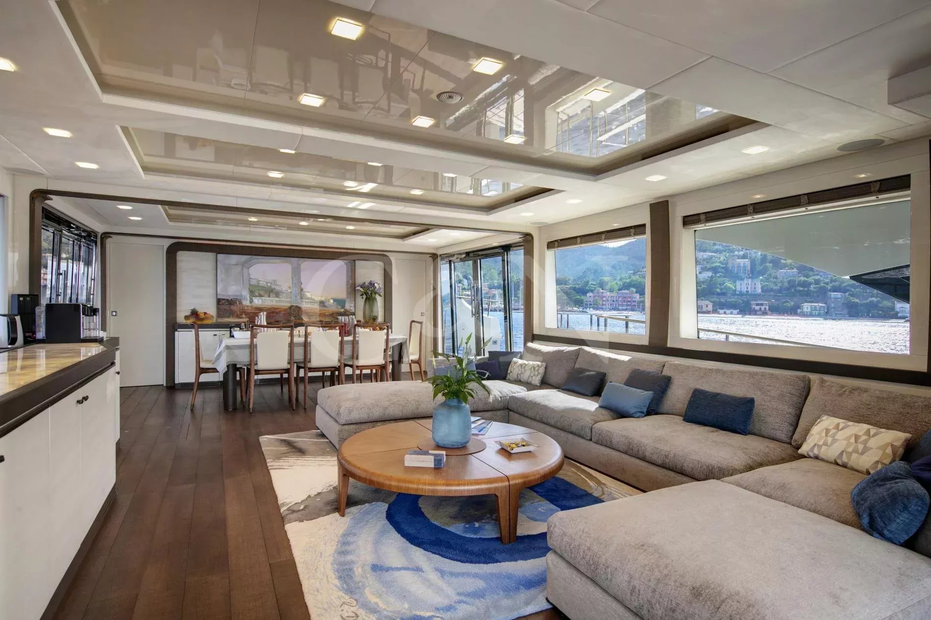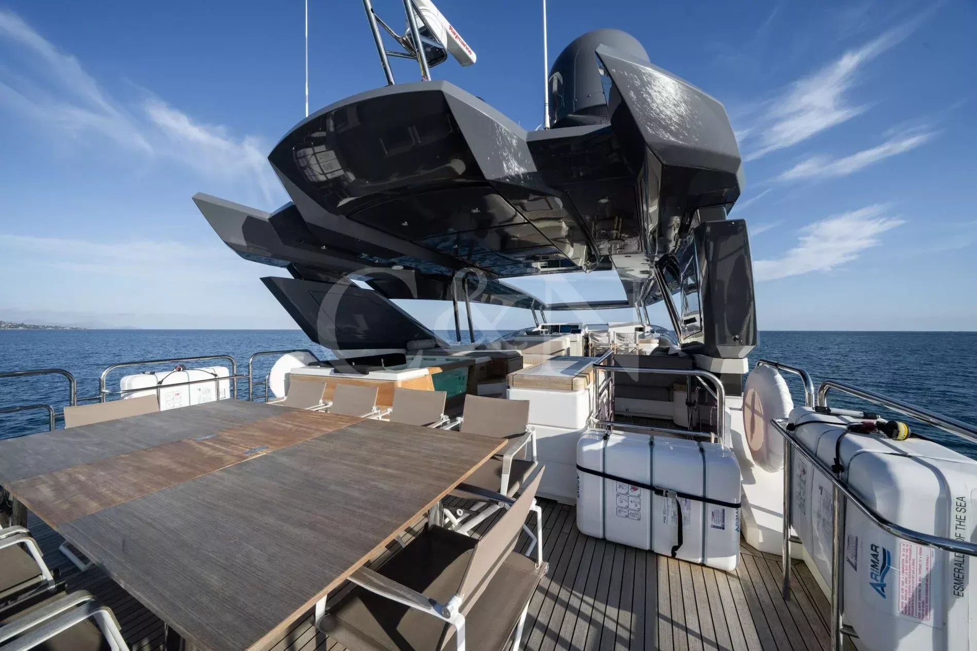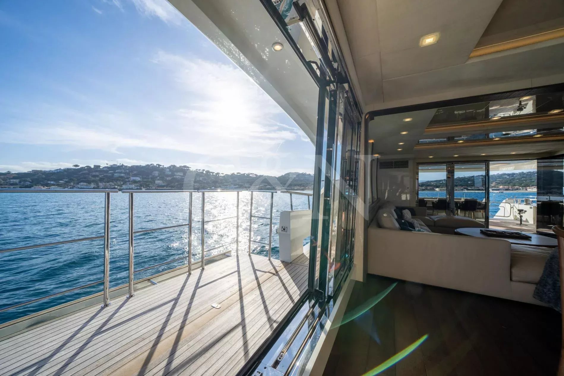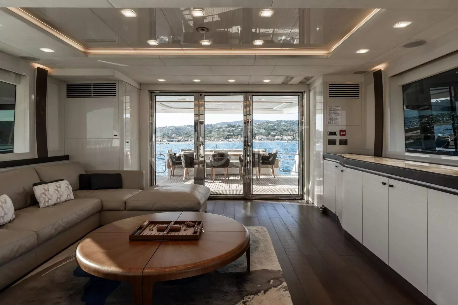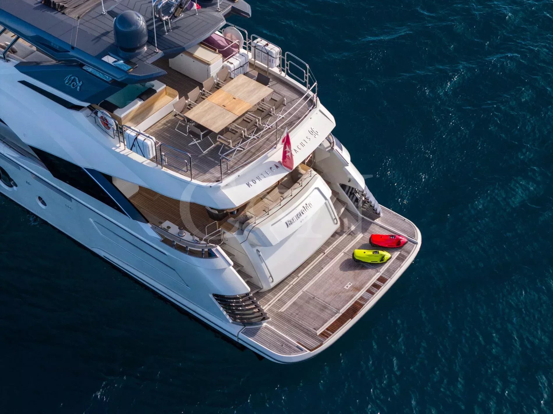 Esmeralda of the Seas stands as a notable example of Monte Carlo Yachts’ MCY 96, a series conceived to deliver exceptional comfort and space within a 29.26-metre footprint. She offers class-leading volume for her length thanks to the shipyard’s collaboration with Nuvolari Lenard, who distilled their experience in larger custom projects into a sub-30-metre design. Sporty lines and signature interlocking portlights give the MCY 96 a distinctive identity, supported by expansive glazing and generous interior spaces that appeal to owners seeking space and capability in this size range.Esmeralda of the Seas offers a well-arranged exterior layout, providing a trio of spaces for dining, lounging and entertaining. The main deck aft serves as the primary al fresco dining space overlooking the wake, while the foredeck features a generous sun lounge with adjustable sunpads. The area remains naturally private when berthed stern-to.Above, the flybridge is sheltered by a carbon-fibre hard top with a fully opening sunroof for sun or shade on demand, with a dining area, jacuzzi, extensive sofa seating and a well-equipped bar with refrigeration. At the stern is a large swim platform with a tender garage housing the Williams 445 and other watersports equipment.Her interior features an open-plan salon framed by full-height glazing that brings abundant natural light into the space. A large U-shaped lounge sits beneath architectural ceiling elements with recessed contrasting panels with vertical columns and beams that subtle structure without breaking the flow. A forward dining area seats up to ten with sliding doors on either side that open onto fold-down balconies, giving the main deck an expansive indoor–outdoor arrangement rarely found in this size range. A bar with an ice maker, refrigerator and integrated multimedia systems are hidden from view, while loose furniture provides the flexibility to reconfigure the space.Esmeralda of the Seas offers accommodation for up to eleven guests across five cabins, giving the yacht notable capacity and flexibility within its class. The owner’s suite is positioned on the main deck and takes full advantage of the MCY 96’s forward glazing, with sweeping 180-degree views that bring natural light deep into the cabin. The space includes a generous dressing area and a beautifully appointed en suite bathroom.Four guest cabins are arranged on the lower deck, including one with a Pullman berth, suited to family cruising or charter operations. Further accommodation sleeps a crew of five.Esmeralda of the Seas is powered by MTU 16V 2000 M86 engines, giving her a 20-knot cruising speed and a top speed of 26 knots. CMC electric stabilisers operate both underway and at anchor to enhance comfort. RINA classification and commercial registration under 24 metres expand her operational scope for private use or continued charter activity.