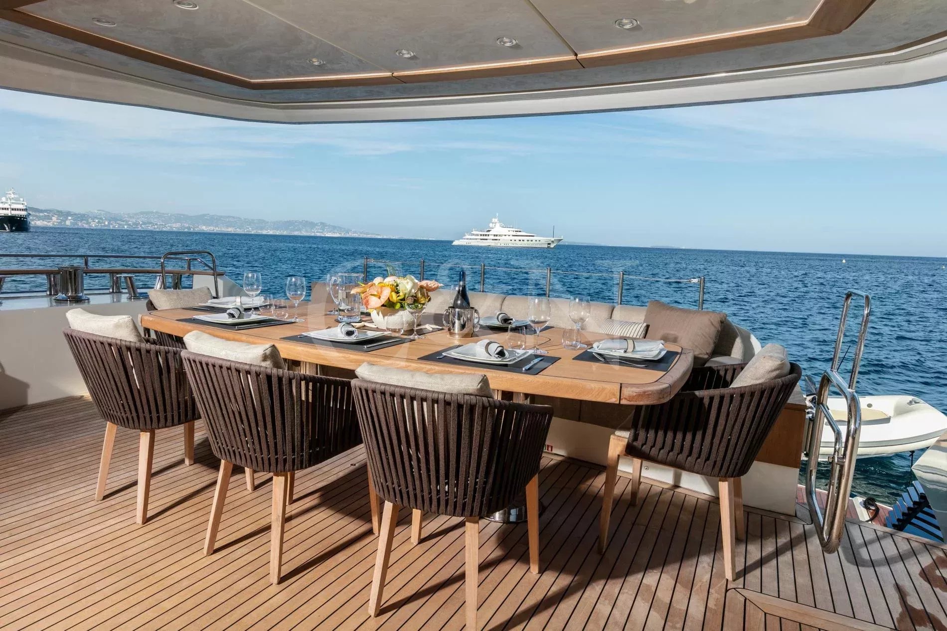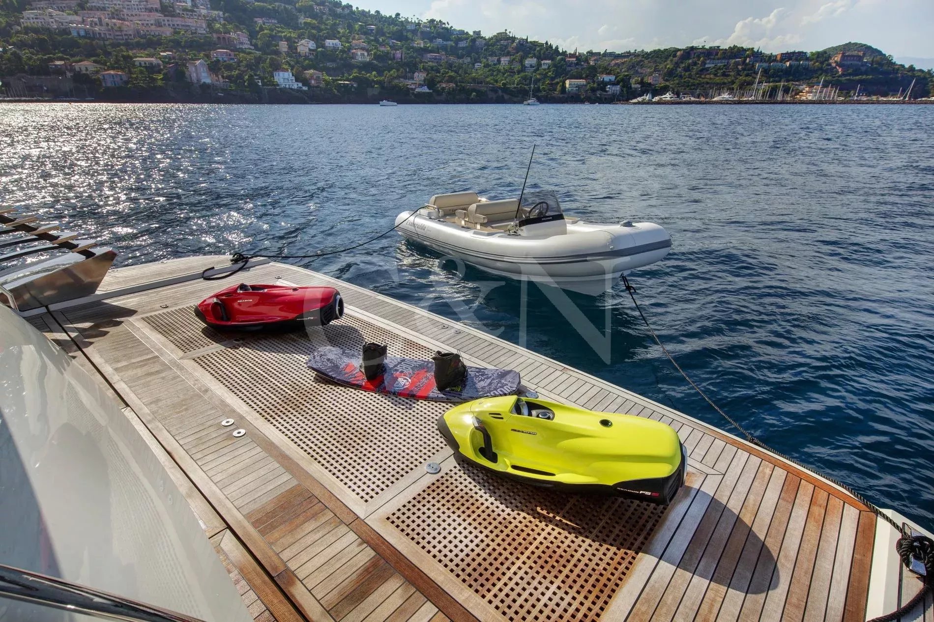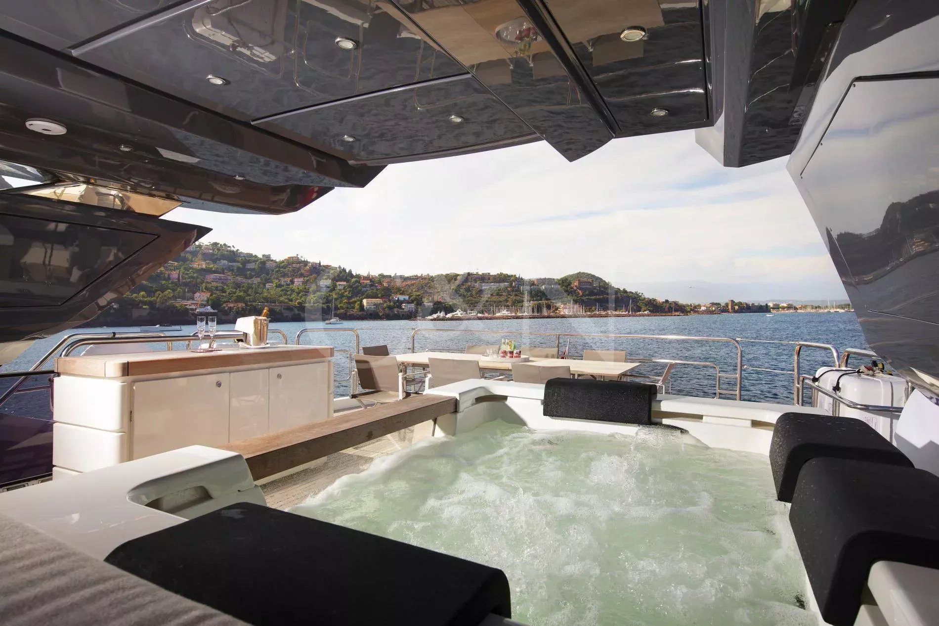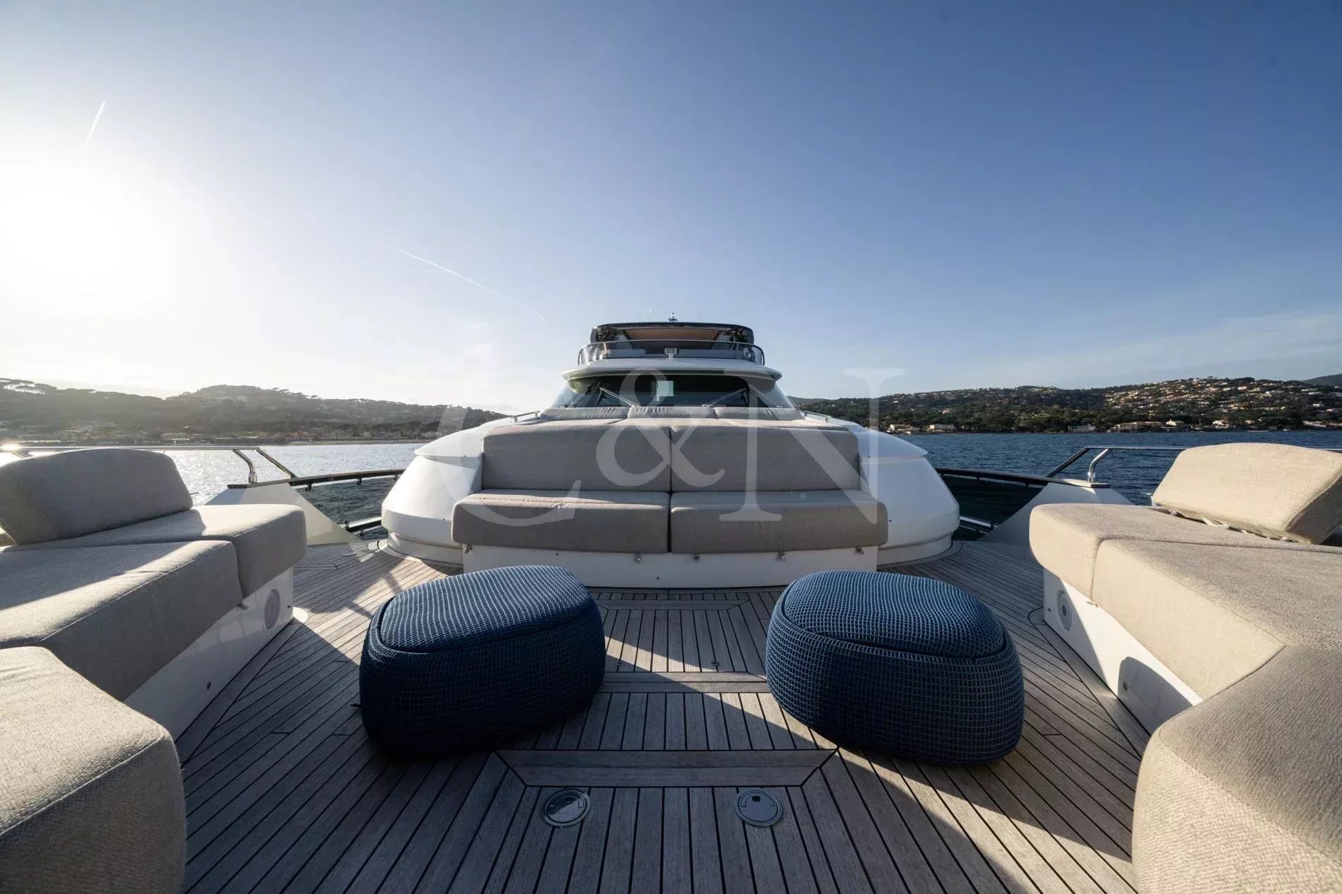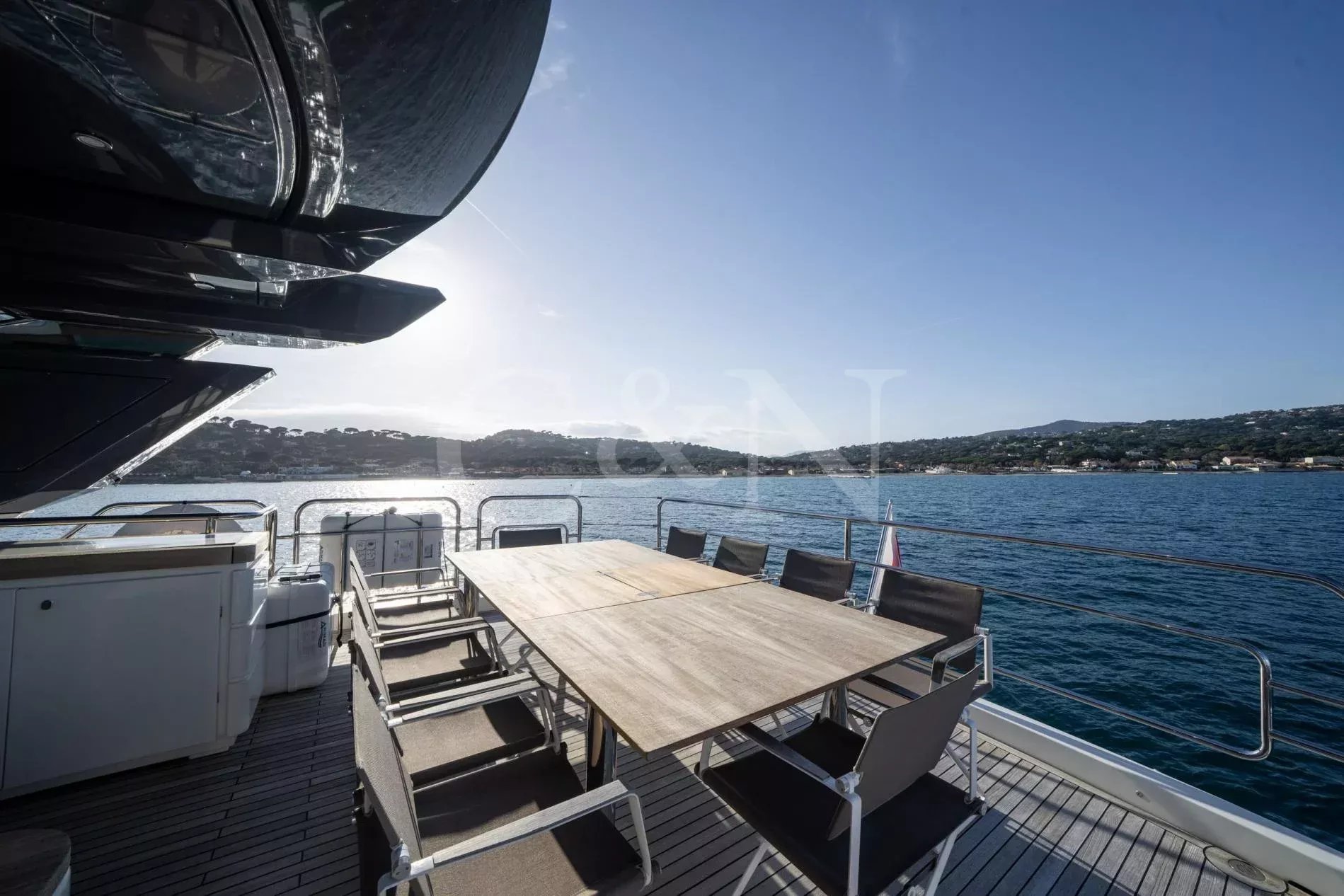 Esmeralda of the Seas stands as a notable example of Monte Carlo Yachts’ MCY 96, a series conceived to deliver exceptional comfort and space within a 29.26-metre footprint. She offers class-leading volume for her length thanks to the shipyard’s collaboration with Nuvolari Lenard, who distilled their experience in larger custom projects into a sub-30-metre design. Sporty lines and signature interlocking portlights give the MCY 96 a distinctive identity, supported by expansive glazing and generous interior spaces that appeal to owners seeking space and capability in this size range.Esmeralda of the Seas offers a well-arranged exterior layout, providing a trio of spaces for dining, lounging and entertaining. The main deck aft serves as the primary al fresco dining space overlooking the wake, while the foredeck features a generous sun lounge with adjustable sunpads. The area remains naturally private when berthed stern-to.Above, the flybridge is sheltered by a carbon-fibre hard top with a fully opening sunroof for sun or shade on demand, with a dining area, jacuzzi, extensive sofa seating and a well-equipped bar with refrigeration. At the stern is a large swim platform with a tender garage housing the Williams 445 and other watersports equipment.Her interior features an open-plan salon framed by full-height glazing that brings abundant natural light into the space. A large U-shaped lounge sits beneath architectural ceiling elements with recessed contrasting panels with vertical columns and beams that subtle structure without breaking the flow. A forward dining area seats up to ten with sliding doors on either side that open onto fold-down balconies, giving the main deck an expansive indoor–outdoor arrangement rarely found in this size range. A bar with an ice maker, refrigerator and integrated multimedia systems are hidden from view, while loose furniture provides the flexibility to reconfigure the space.Esmeralda of the Seas offers accommodation for up to eleven guests across five cabins, giving the yacht notable capacity and flexibility within its class. The owner’s suite is positioned on the main deck and takes full advantage of the MCY 96’s forward glazing, with sweeping 180-degree views that bring natural light deep into the cabin. The space includes a generous dressing area and a beautifully appointed en suite bathroom.Four guest cabins are arranged on the lower deck, including one with a Pullman berth, suited to family cruising or charter operations. Further accommodation sleeps a crew of five.Esmeralda of the Seas is powered by MTU 16V 2000 M86 engines, giving her a 20-knot cruising speed and a top speed of 26 knots. CMC electric stabilisers operate both underway and at anchor to enhance comfort. RINA classification and commercial registration under 24 metres expand her operational scope for private use or continued charter activity.