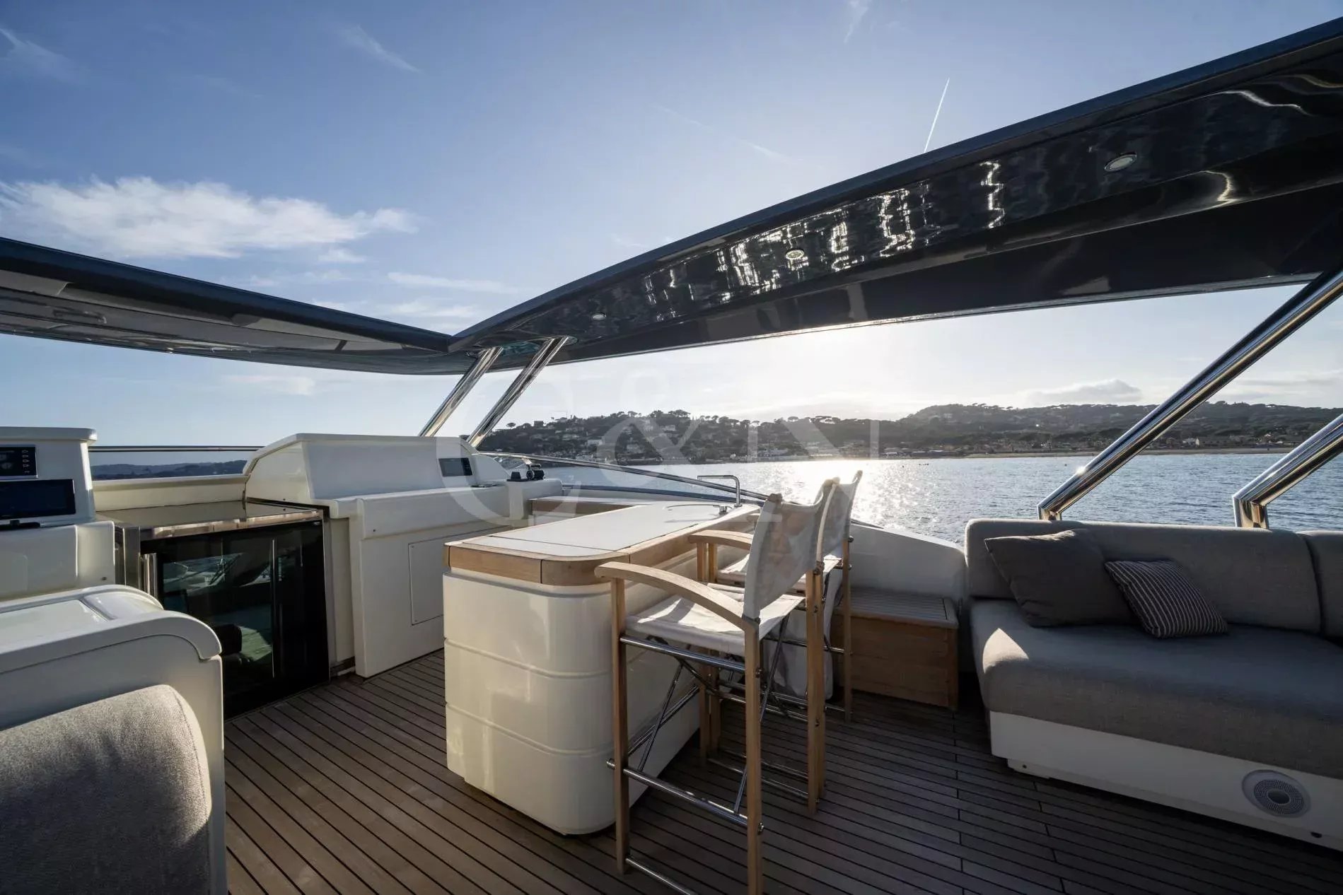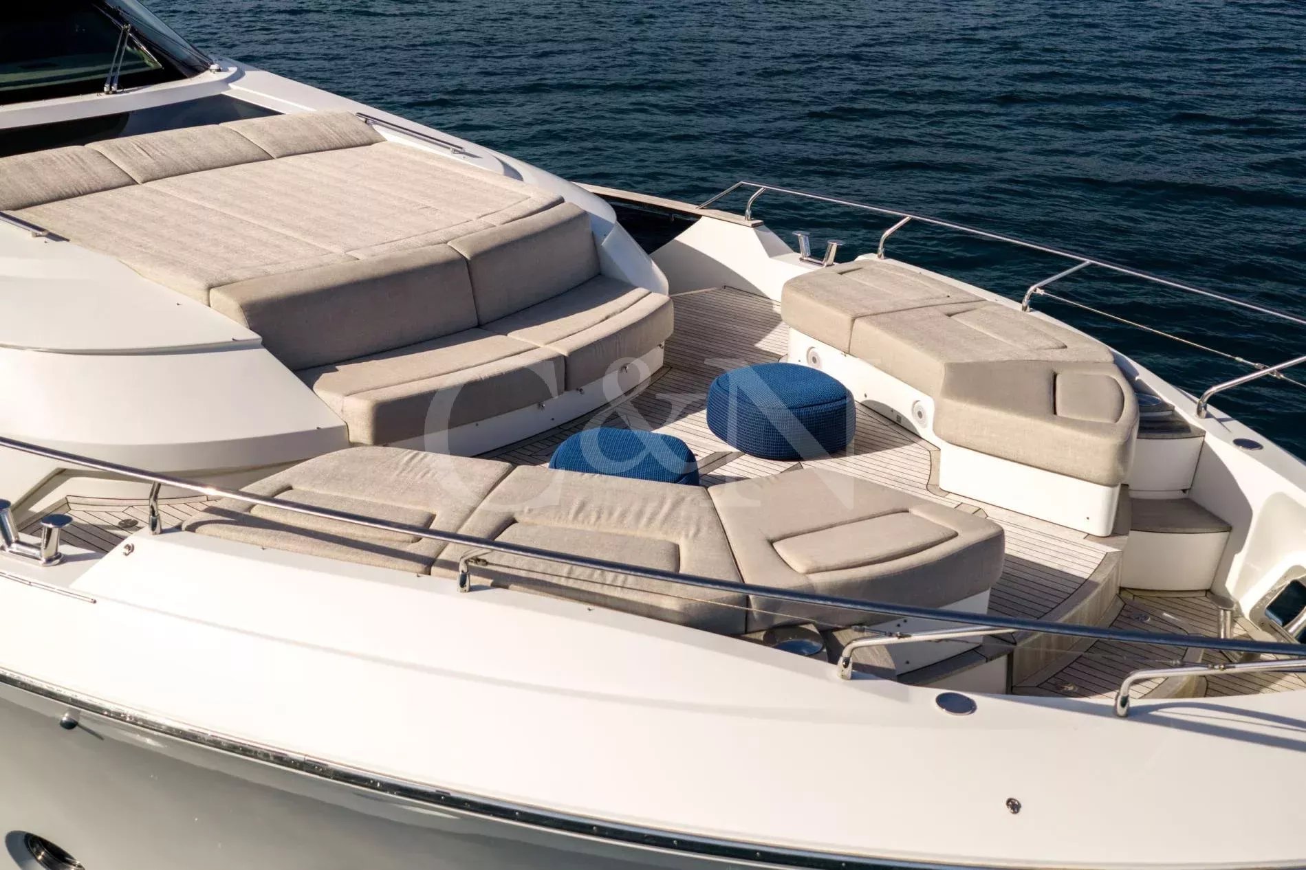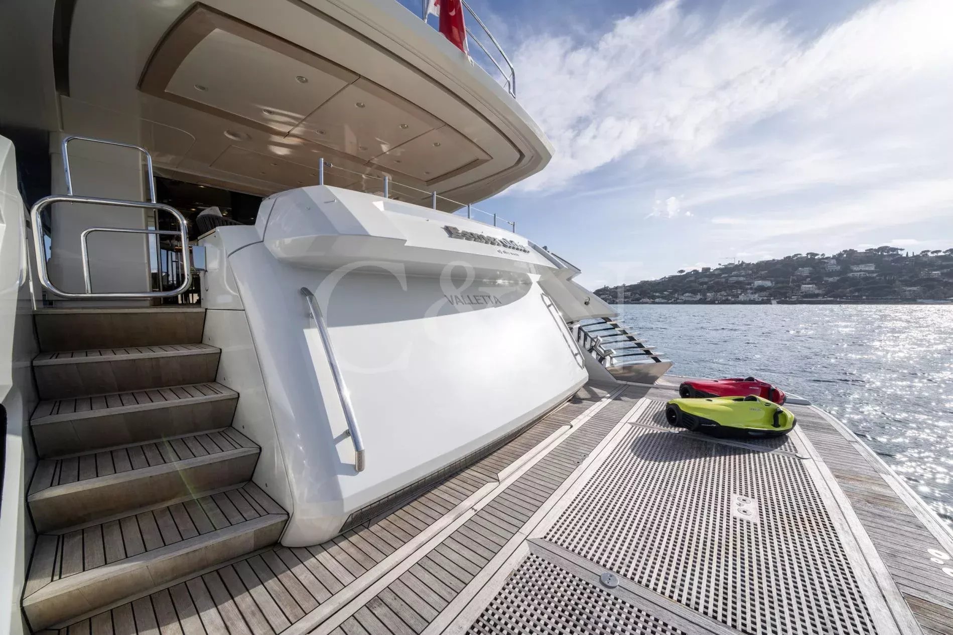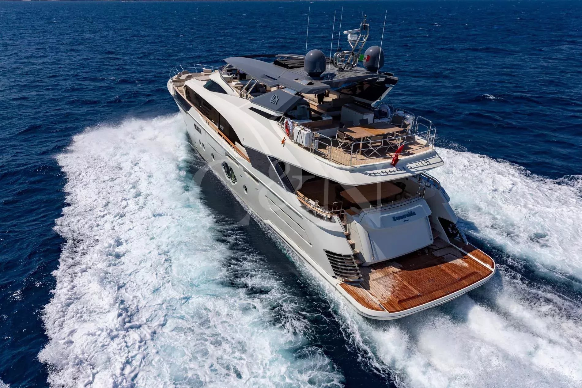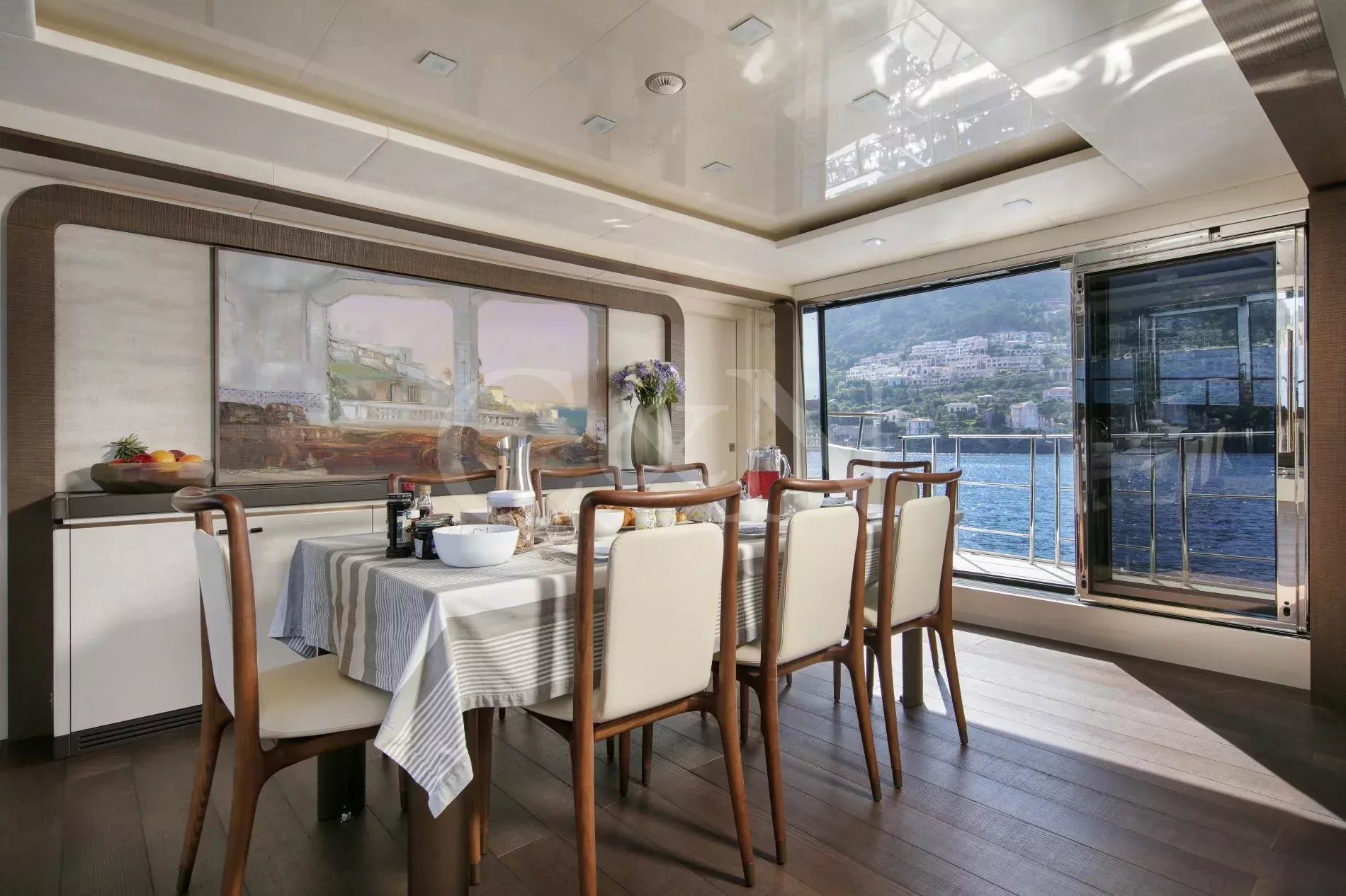 Esmeralda of the Seas stands as a notable example of Monte Carlo Yachts’ MCY 96, a series conceived to deliver exceptional comfort and space within a 29.26-metre footprint. She offers class-leading volume for her length thanks to the shipyard’s collaboration with Nuvolari Lenard, who distilled their experience in larger custom projects into a sub-30-metre design. Sporty lines and signature interlocking portlights give the MCY 96 a distinctive identity, supported by expansive glazing and generous interior spaces that appeal to owners seeking space and capability in this size range.Esmeralda of the Seas offers a well-arranged exterior layout, providing a trio of spaces for dining, lounging and entertaining. The main deck aft serves as the primary al fresco dining space overlooking the wake, while the foredeck features a generous sun lounge with adjustable sunpads. The area remains naturally private when berthed stern-to.Above, the flybridge is sheltered by a carbon-fibre hard top with a fully opening sunroof for sun or shade on demand, with a dining area, jacuzzi, extensive sofa seating and a well-equipped bar with refrigeration. At the stern is a large swim platform with a tender garage housing the Williams 445 and other watersports equipment.Her interior features an open-plan salon framed by full-height glazing that brings abundant natural light into the space. A large U-shaped lounge sits beneath architectural ceiling elements with recessed contrasting panels with vertical columns and beams that subtle structure without breaking the flow. A forward dining area seats up to ten with sliding doors on either side that open onto fold-down balconies, giving the main deck an expansive indoor–outdoor arrangement rarely found in this size range. A bar with an ice maker, refrigerator and integrated multimedia systems are hidden from view, while loose furniture provides the flexibility to reconfigure the space.Esmeralda of the Seas offers accommodation for up to eleven guests across five cabins, giving the yacht notable capacity and flexibility within its class. The owner’s suite is positioned on the main deck and takes full advantage of the MCY 96’s forward glazing, with sweeping 180-degree views that bring natural light deep into the cabin. The space includes a generous dressing area and a beautifully appointed en suite bathroom.Four guest cabins are arranged on the lower deck, including one with a Pullman berth, suited to family cruising or charter operations. Further accommodation sleeps a crew of five.Esmeralda of the Seas is powered by MTU 16V 2000 M86 engines, giving her a 20-knot cruising speed and a top speed of 26 knots. CMC electric stabilisers operate both underway and at anchor to enhance comfort. RINA classification and commercial registration under 24 metres expand her operational scope for private use or continued charter activity.