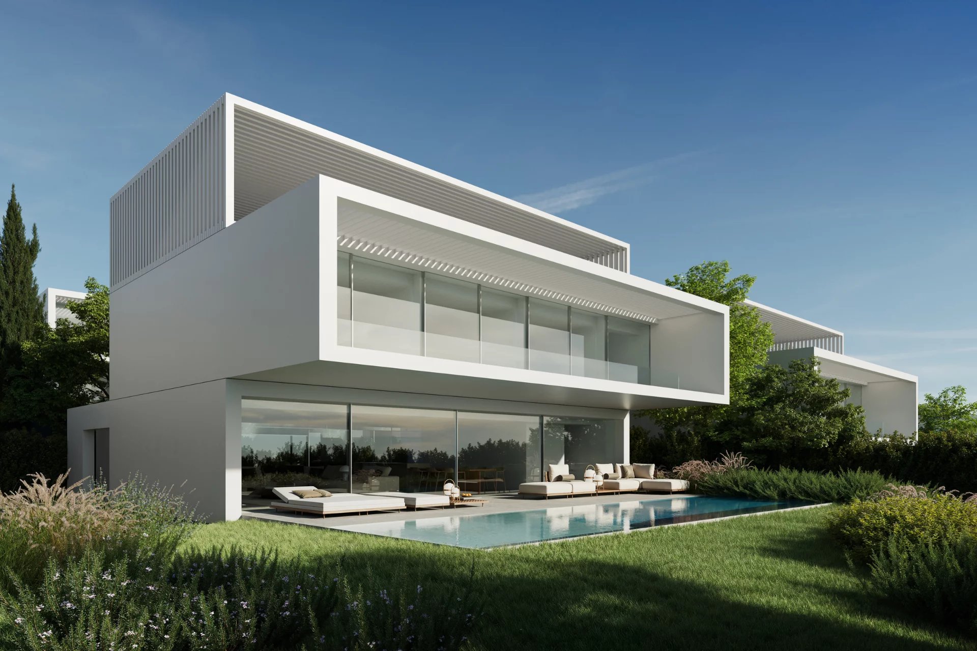 Our villas feature an advanced air purification system using UV technology and photocatalysis for a clean environment. Large windows improve cross ventilation and indoor comfort. Water is treated with a triple-filtration reverse osmosis system, which eliminates odors and improves skin care with an integrated water softener. Natural light is maximized through high-end windows, ensuring a seamless connection between indoors and outdoors.