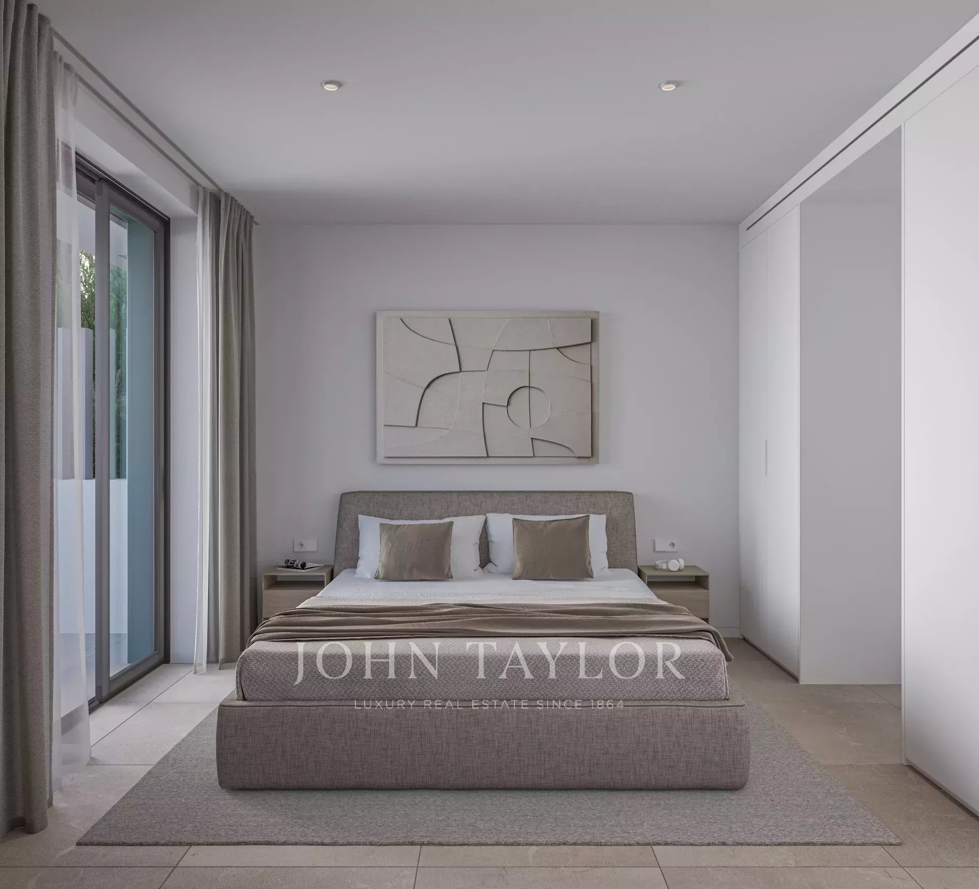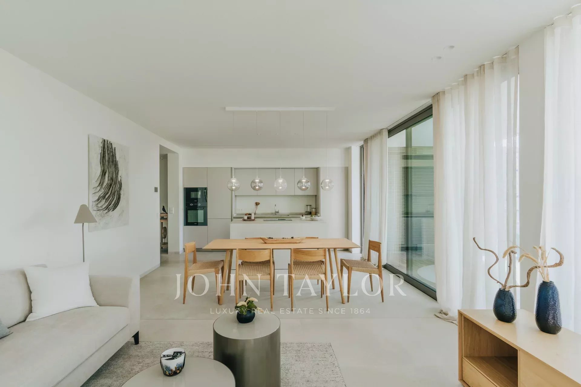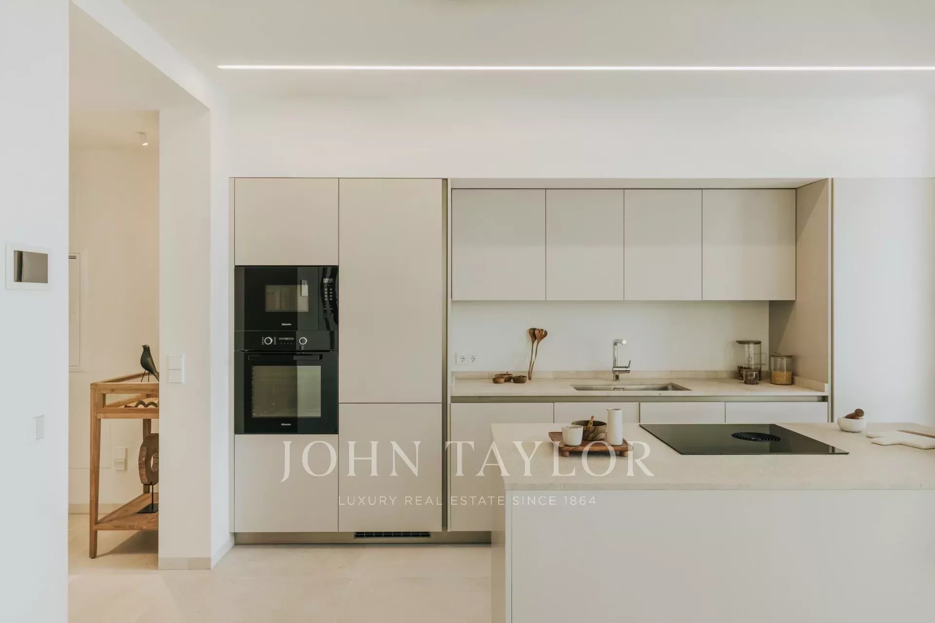 The interior of the flat building was inspired by the Mallorcan way of life. Floor-to-ceiling window fronts, ceiling-high door and cupboard elements and full-surface stone floors allow rooms to flow into one another and lend each apartement a special elegance. Coupled with the modern, straightforward and functional design and the light, Mediterranean colour palette, the interiors develop their very own, timelessly modern character.