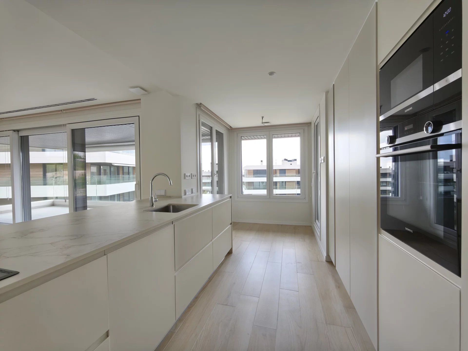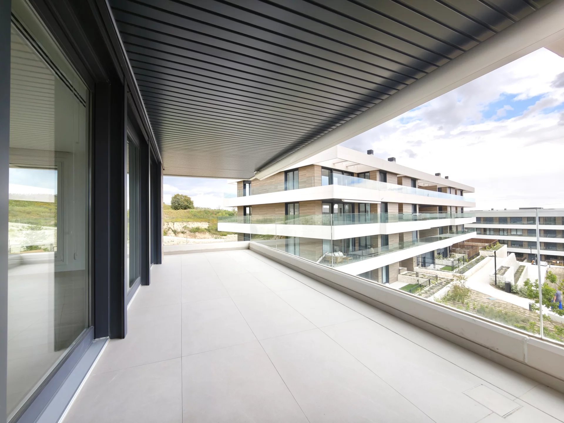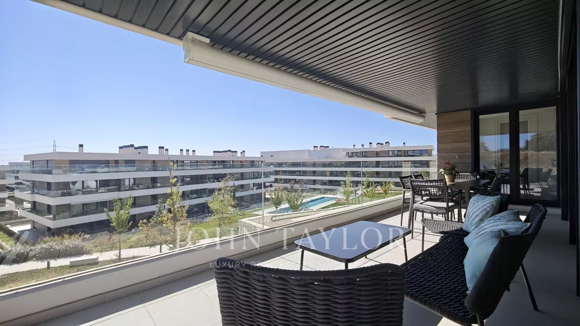 Spectacular corner apartment with terrace that turns around, 4 double bedrooms and 3 bathrooms. In The Garden La Moraleja. In the highest area of the urbanization with the best views. South facing. It has underfloor heating and air conditioning in every room, controlled by an easy to use home automation system.