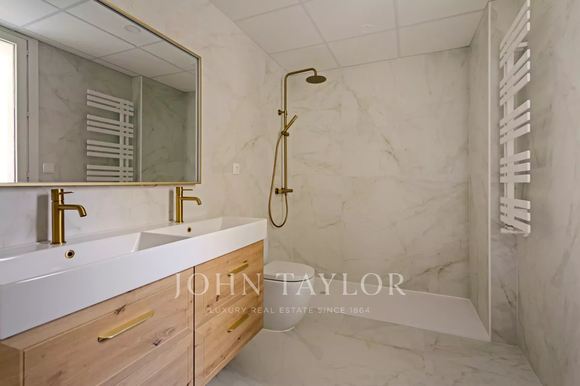 The apartment has three bedrooms, all with built-in closets. The main one has an en-suite bathroom and the other two share a full bathroom.