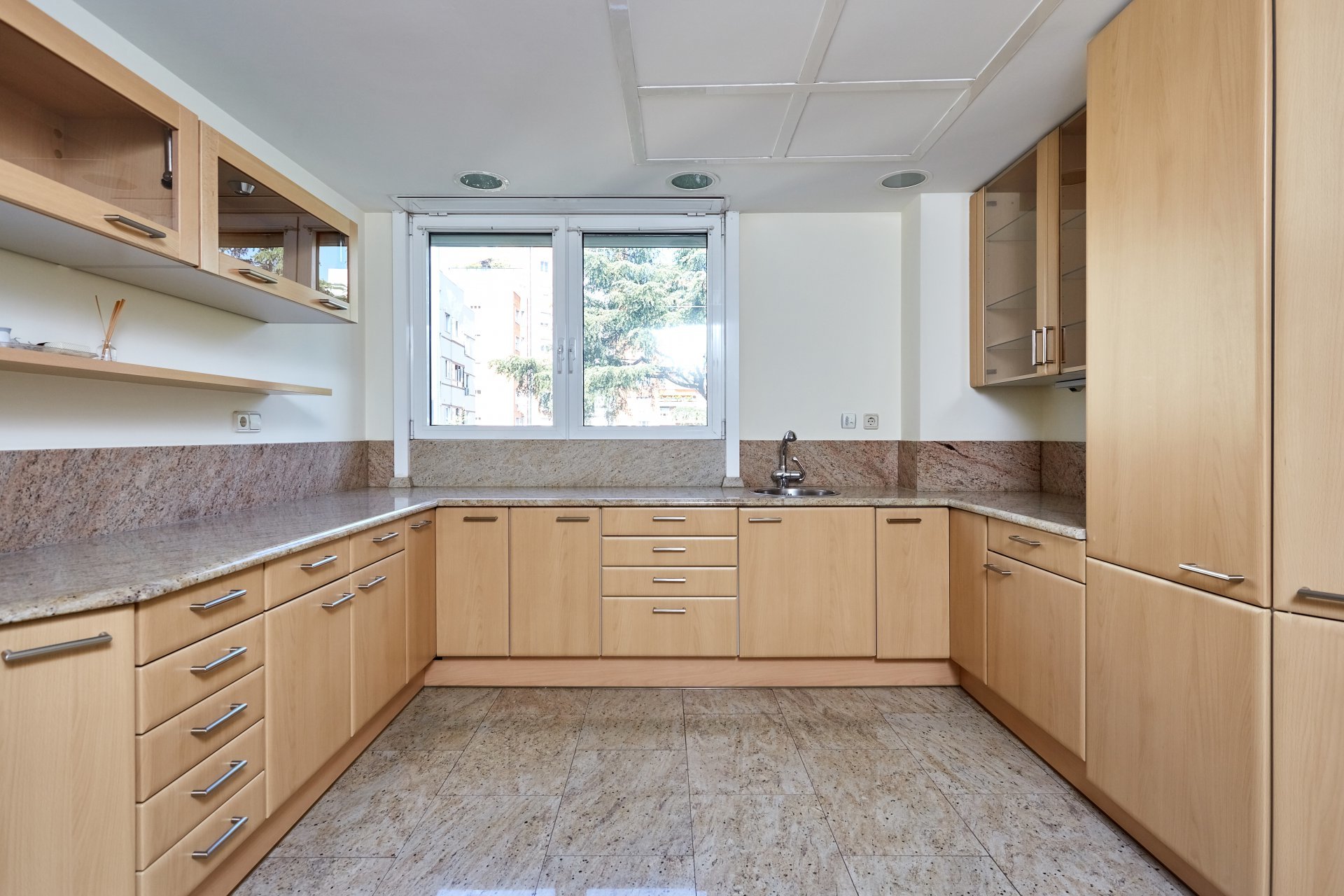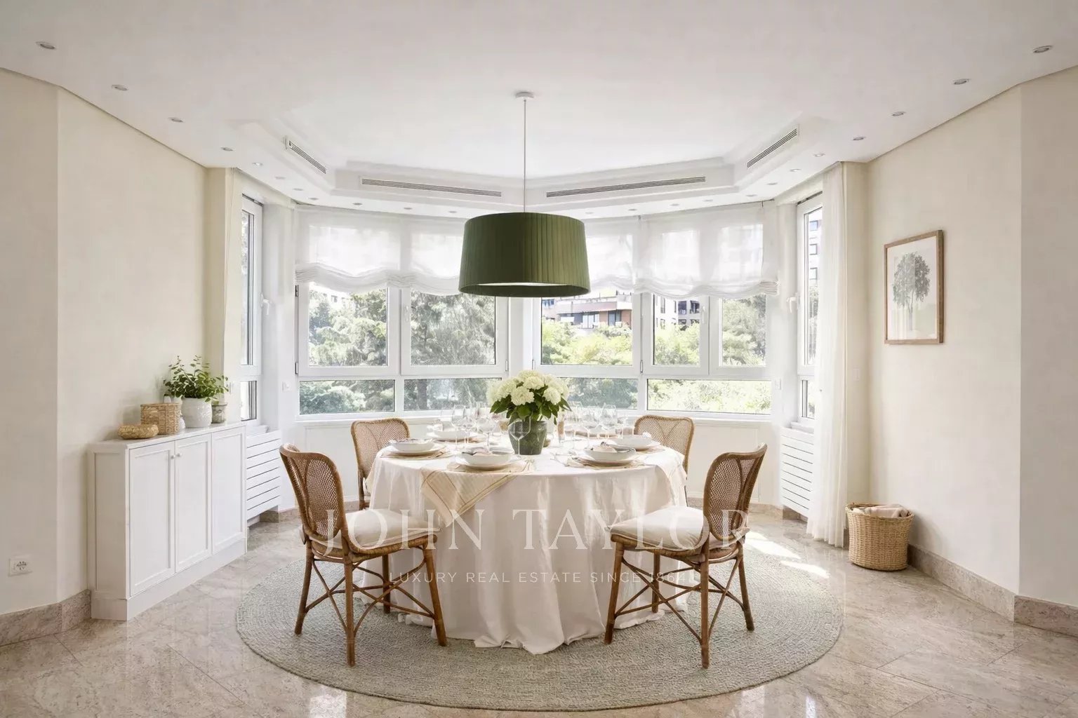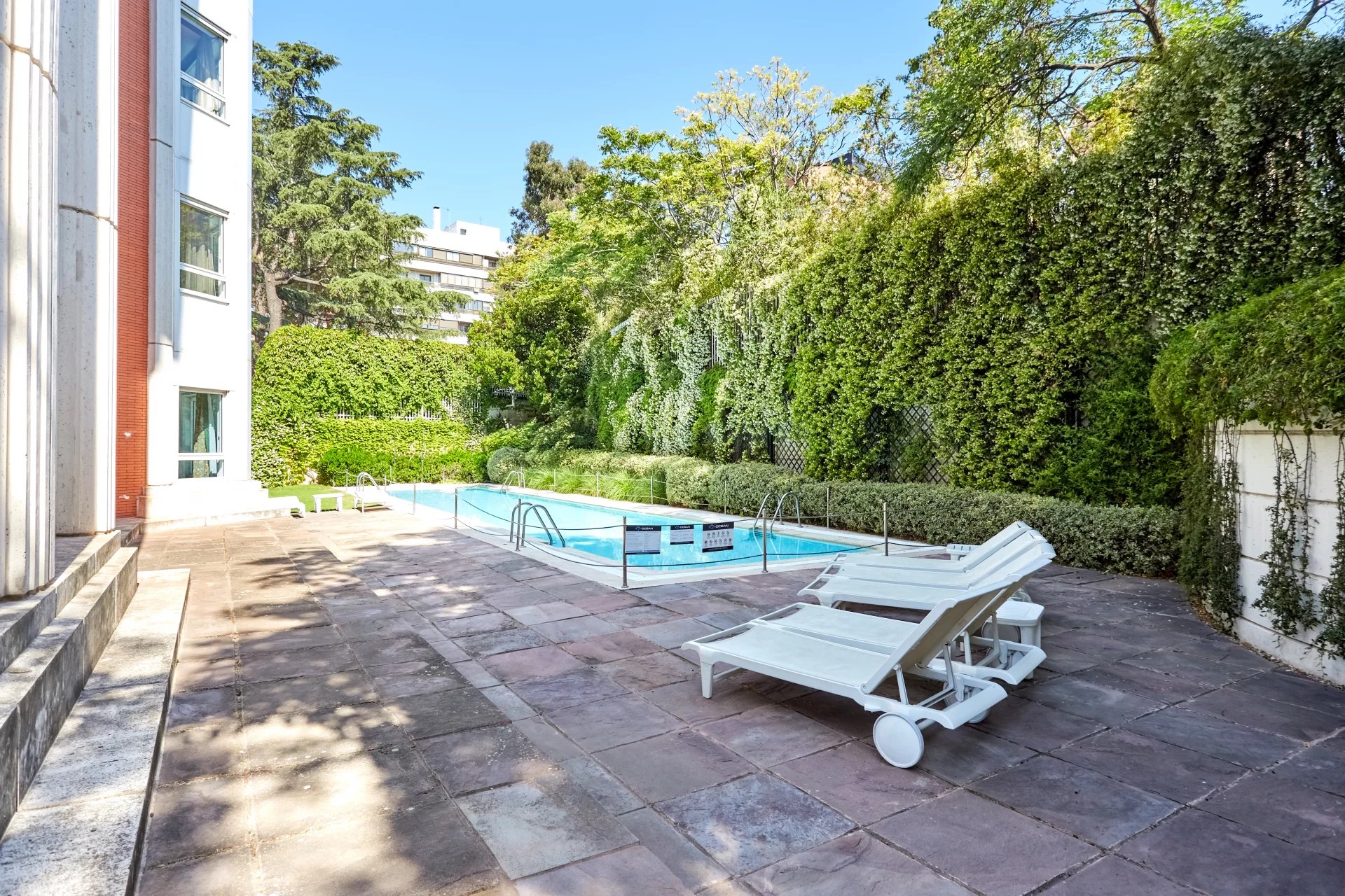 We access the house, a fourth floor, through a large welcoming hall, which leads to a living room and a dining room, both very spacious with large windows overlooking the garden, the pool and a large green area. Next to the hall there is a guest toilet. The apartment has a large kitchen (with separate office area) and a complete service area with independent access.