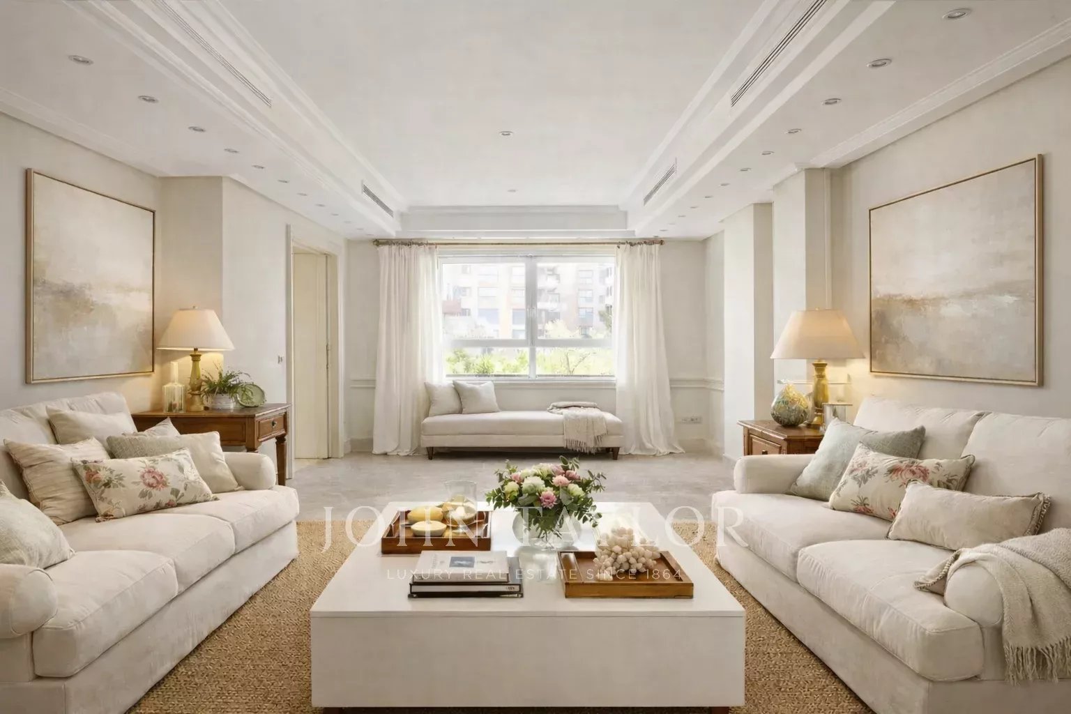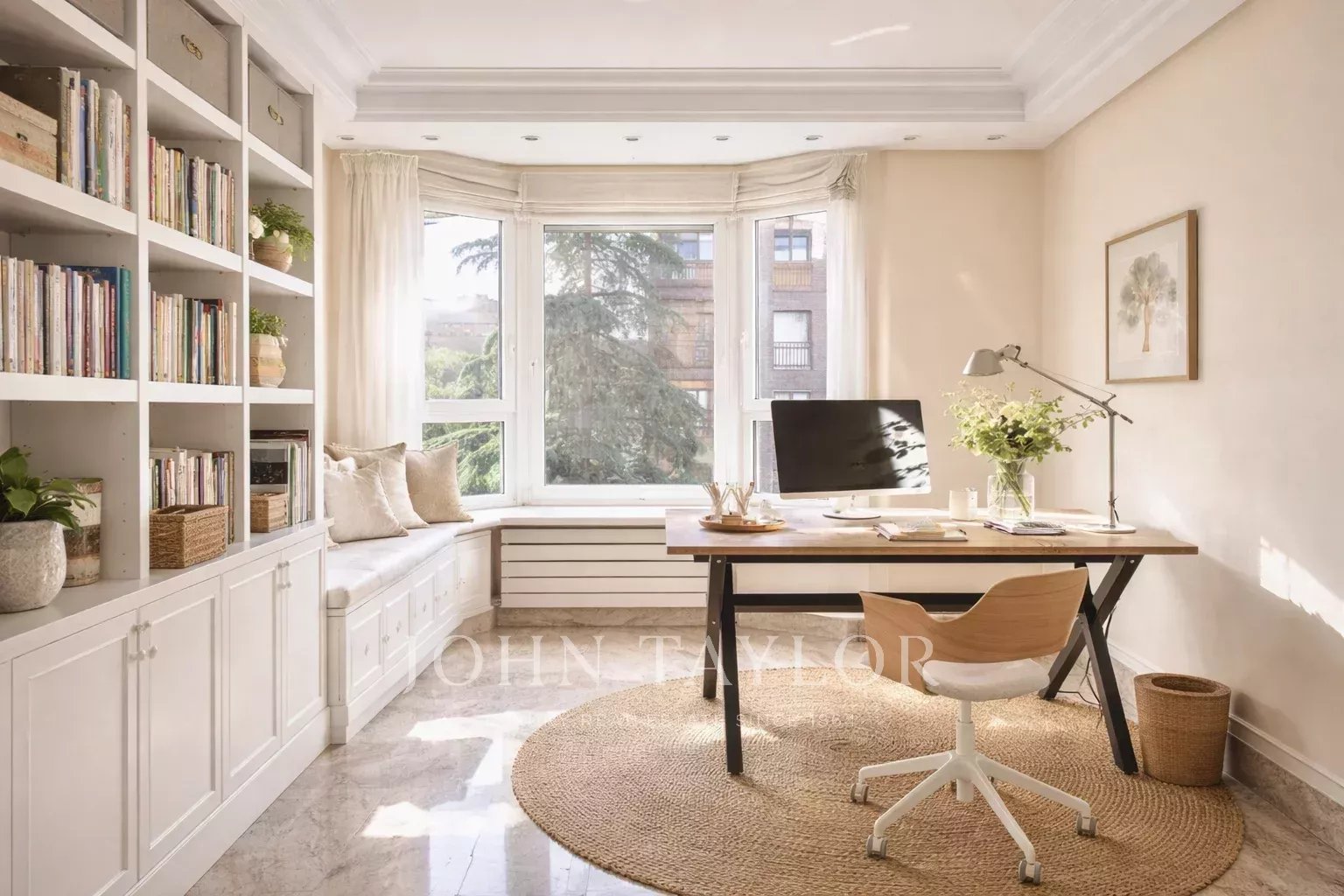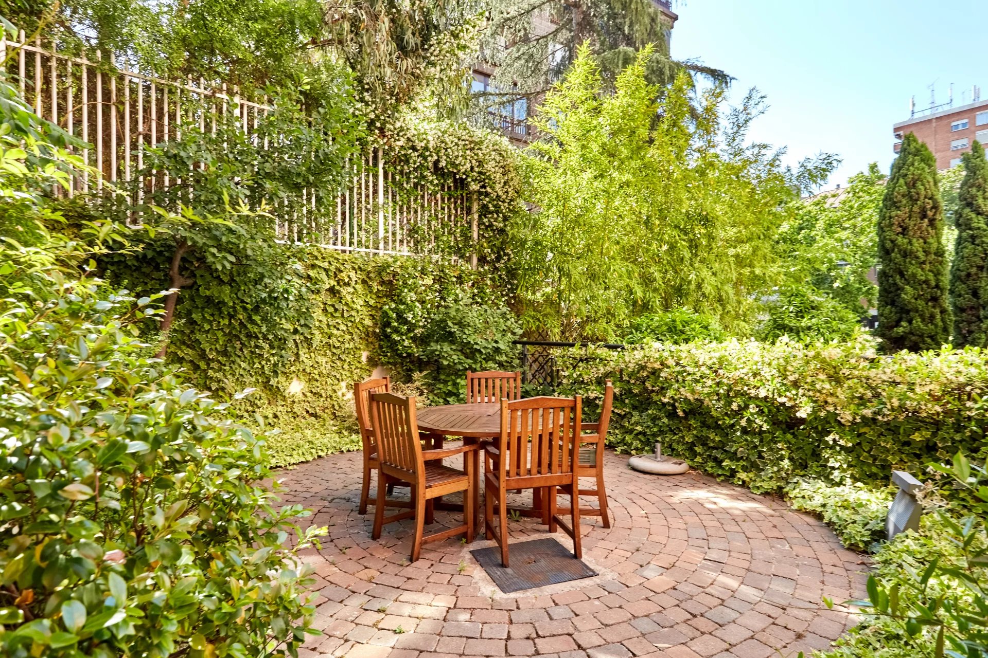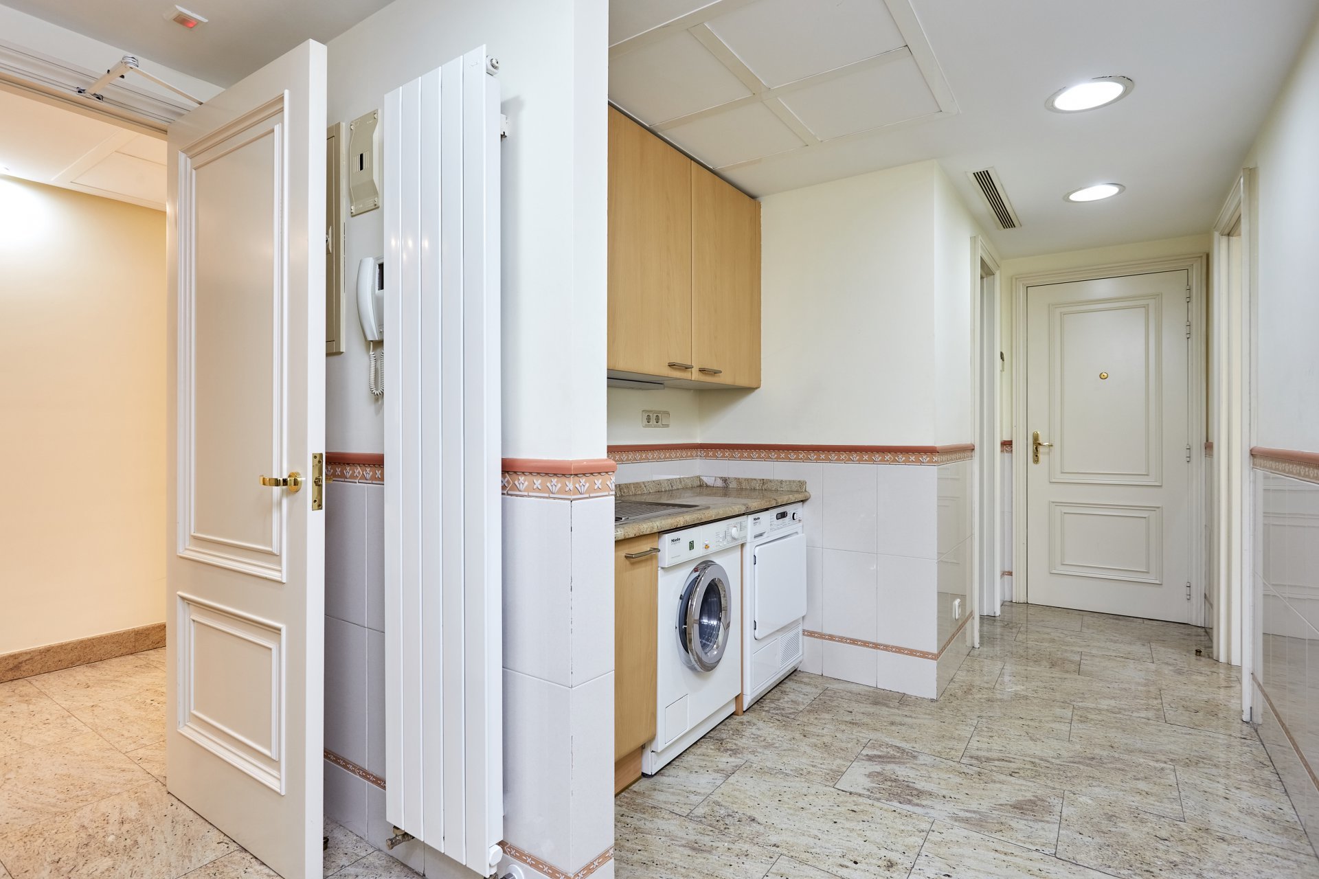 We access the house, a fourth floor, through a large welcoming hall, which leads to a living room and a dining room, both very spacious with large windows overlooking the garden, the pool and a large green area. Next to the hall there is a guest toilet. The apartment has a large kitchen (with separate office area) and a complete service area with independent access.