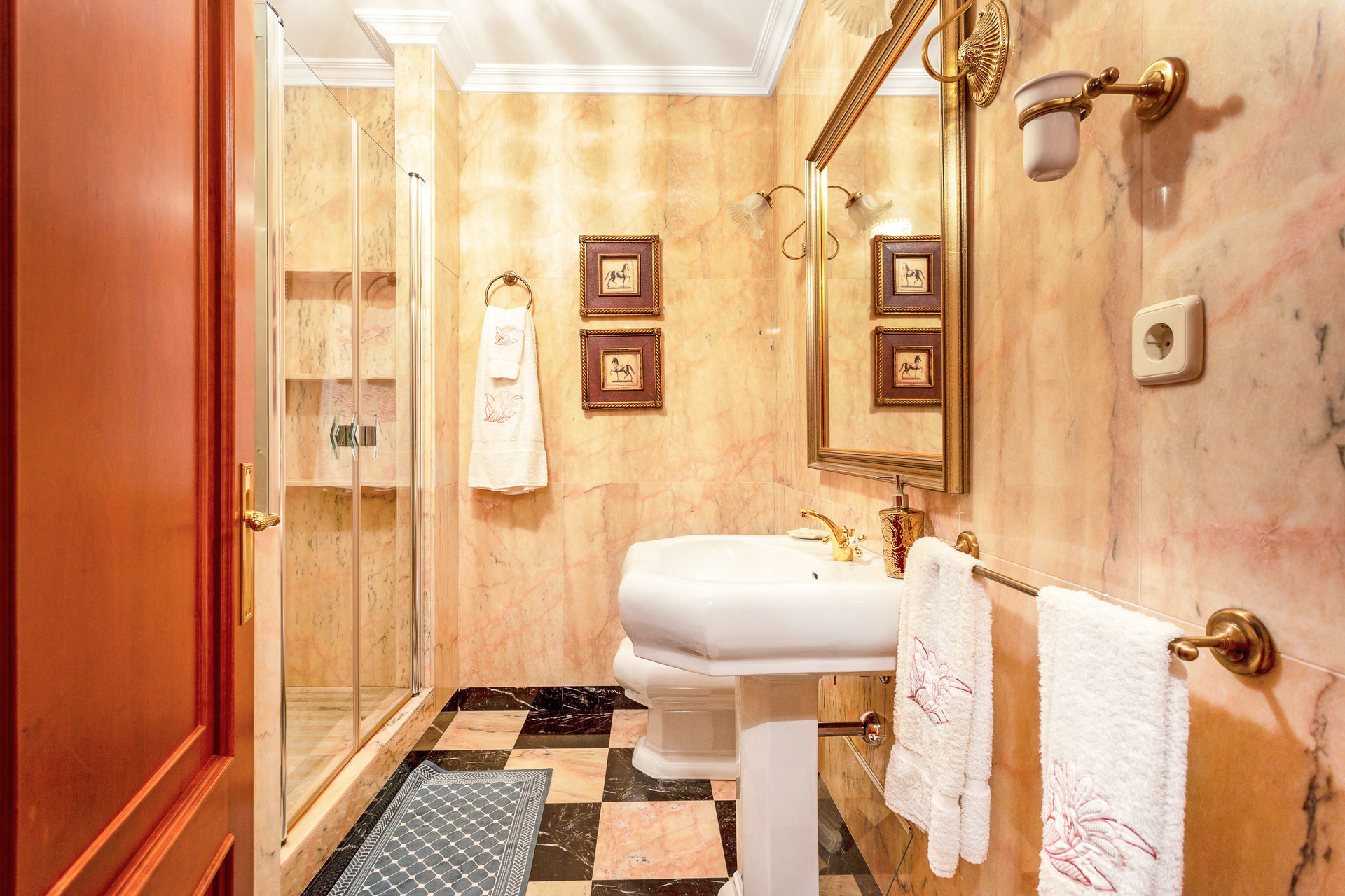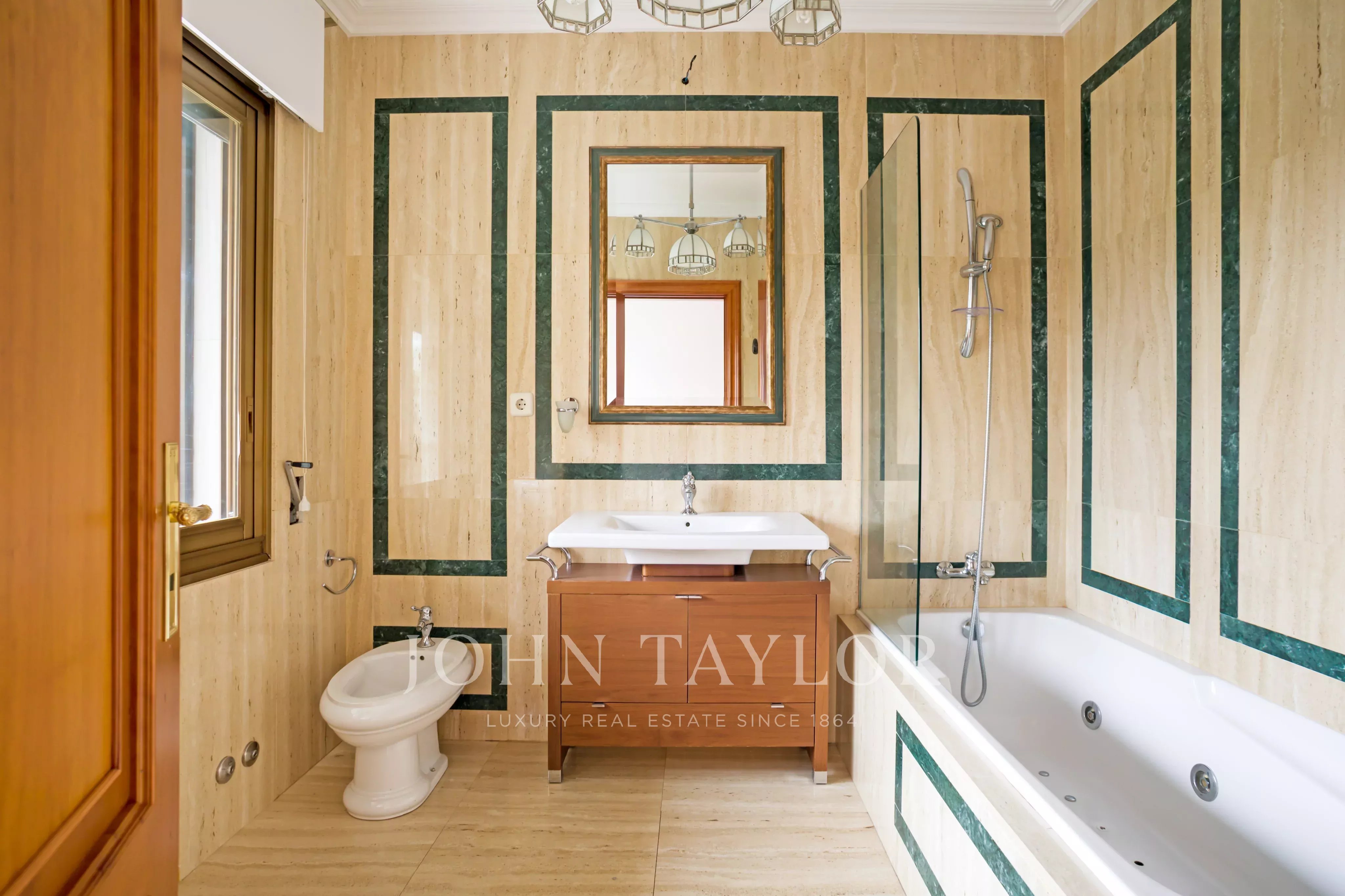 The apartment has three bedrooms, two of them with en-suite bathrooms and the third with a bathroom in the hallway, plus a service bedroom with its own bathroom.