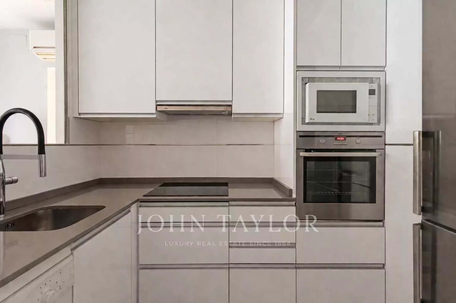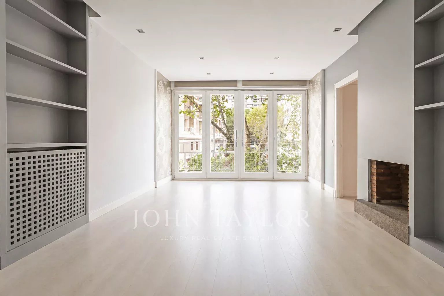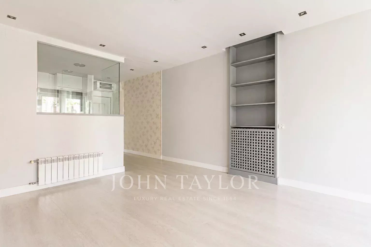 This modern two-bedroom apartment is located in the prestigious Chamartín district, Nueva España area, Madrid. The home boasts abundant natural light from large windows in the spacious living room, complemented by neutral contemporary finishes and built-in shelving for elegant storage solutions.