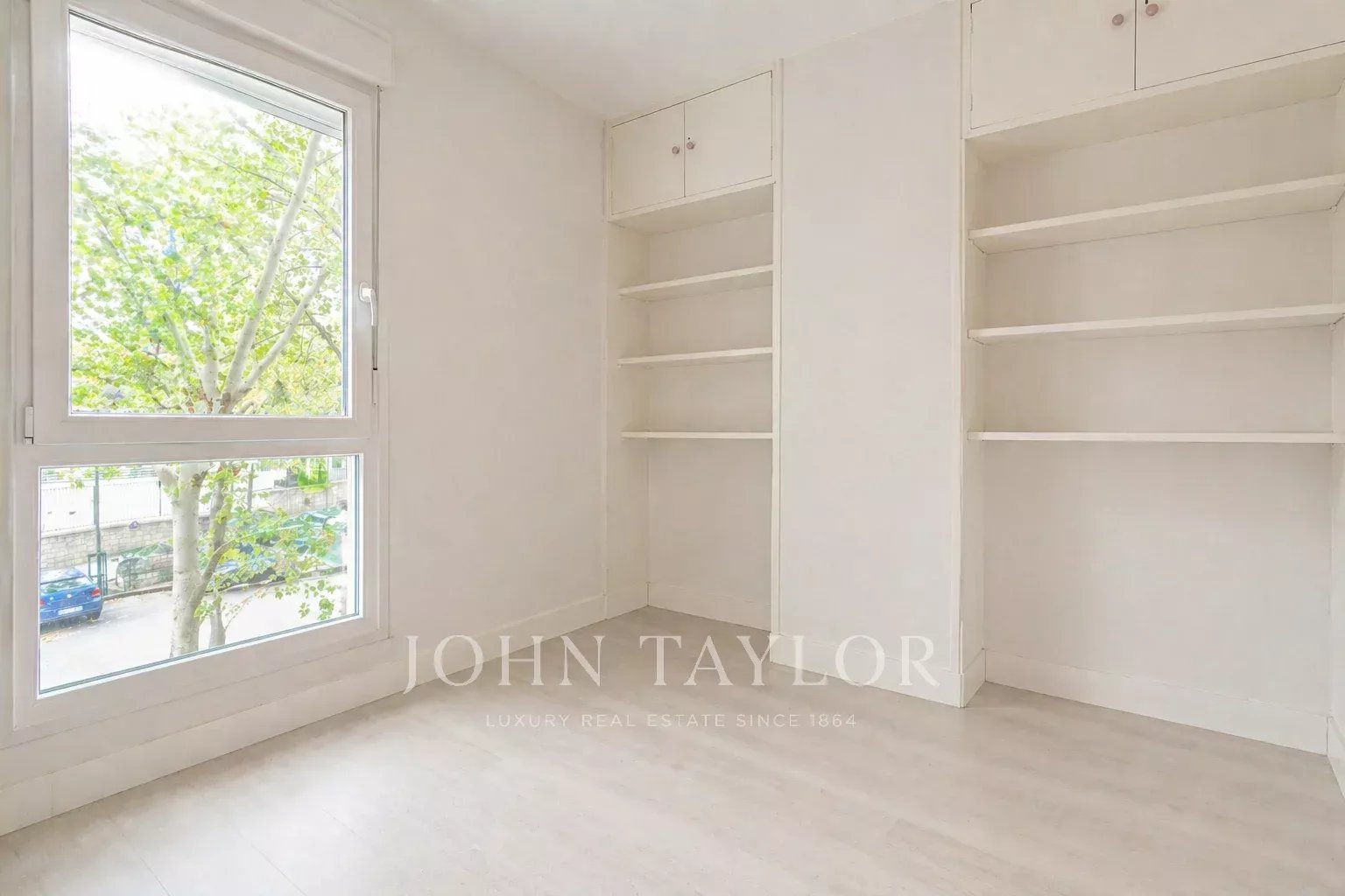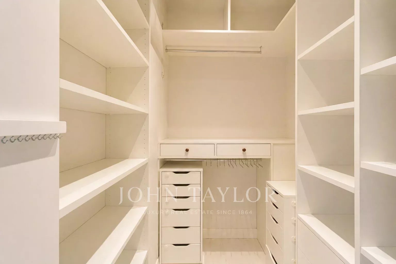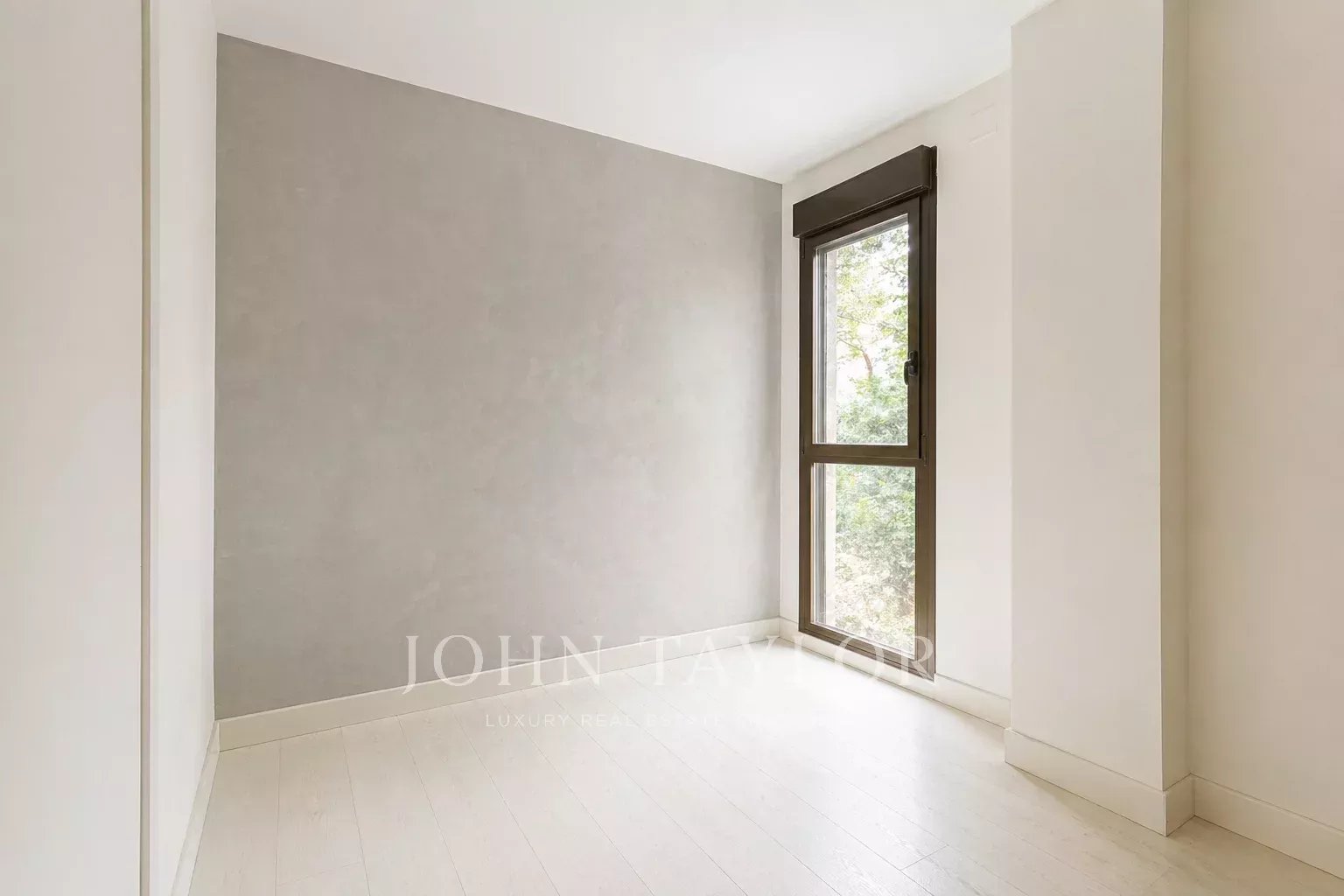 This modern two-bedroom apartment is located in the prestigious Chamartín district, Nueva España area, Madrid. The home boasts abundant natural light from large windows in the spacious living room, complemented by neutral contemporary finishes and built-in shelving for elegant storage solutions.