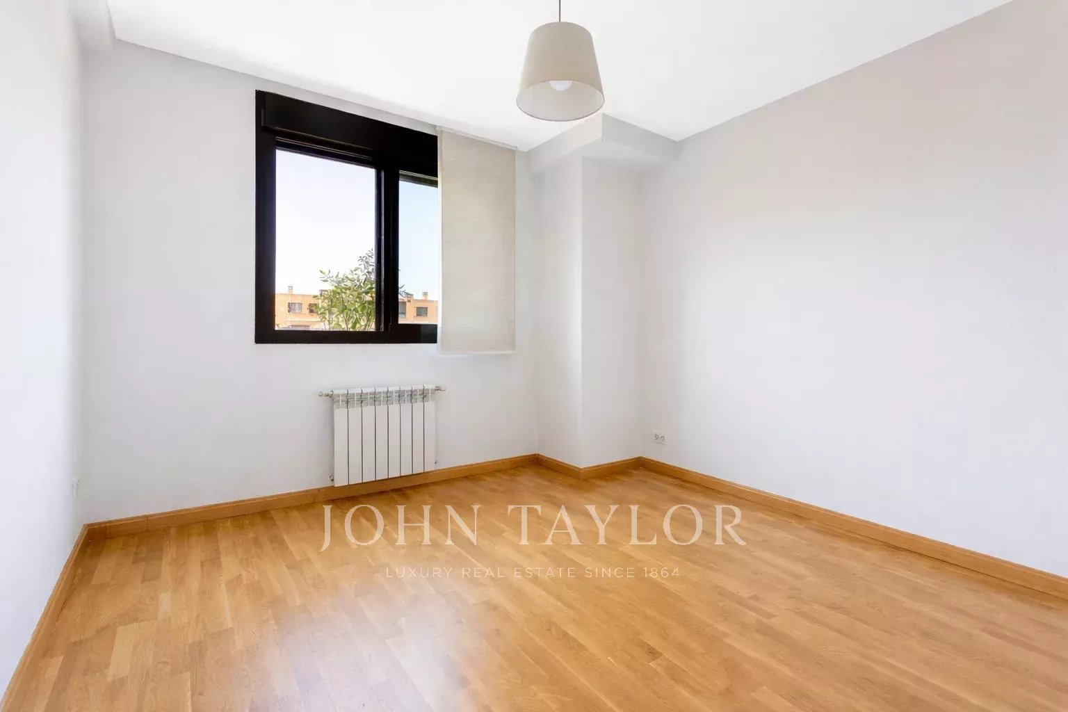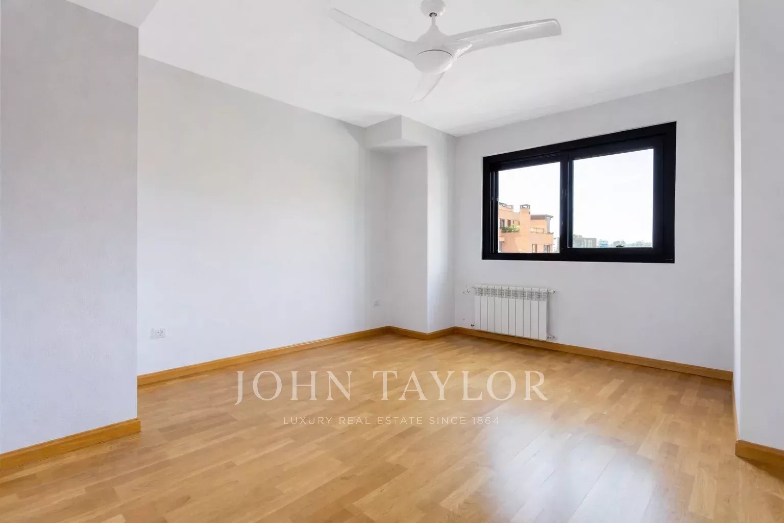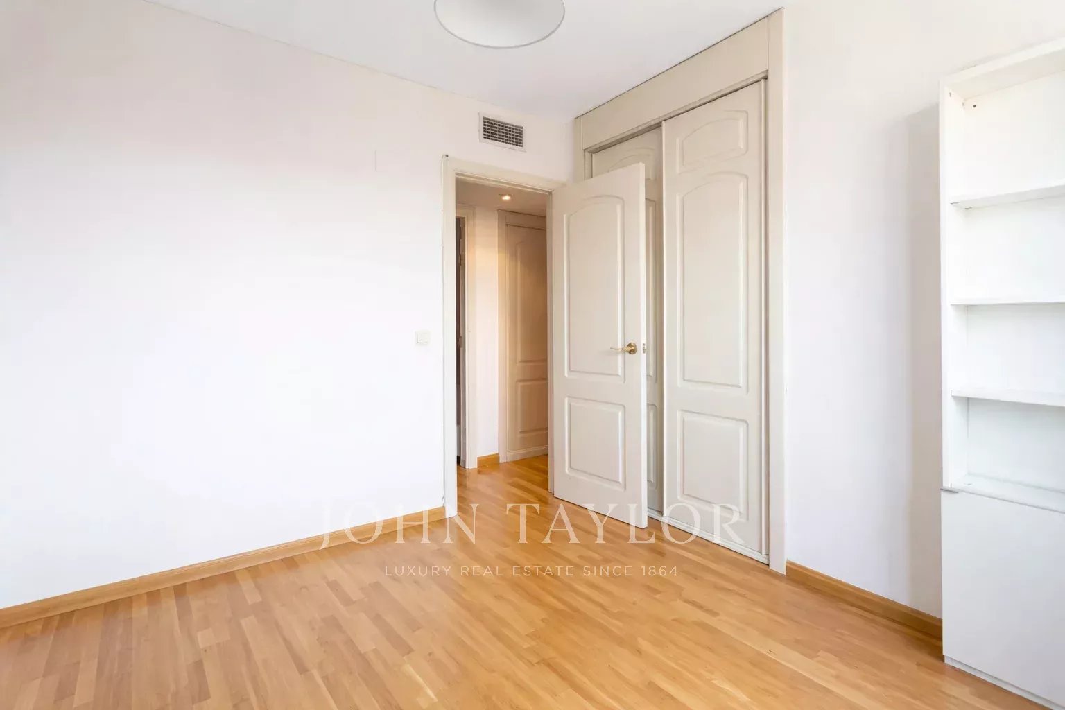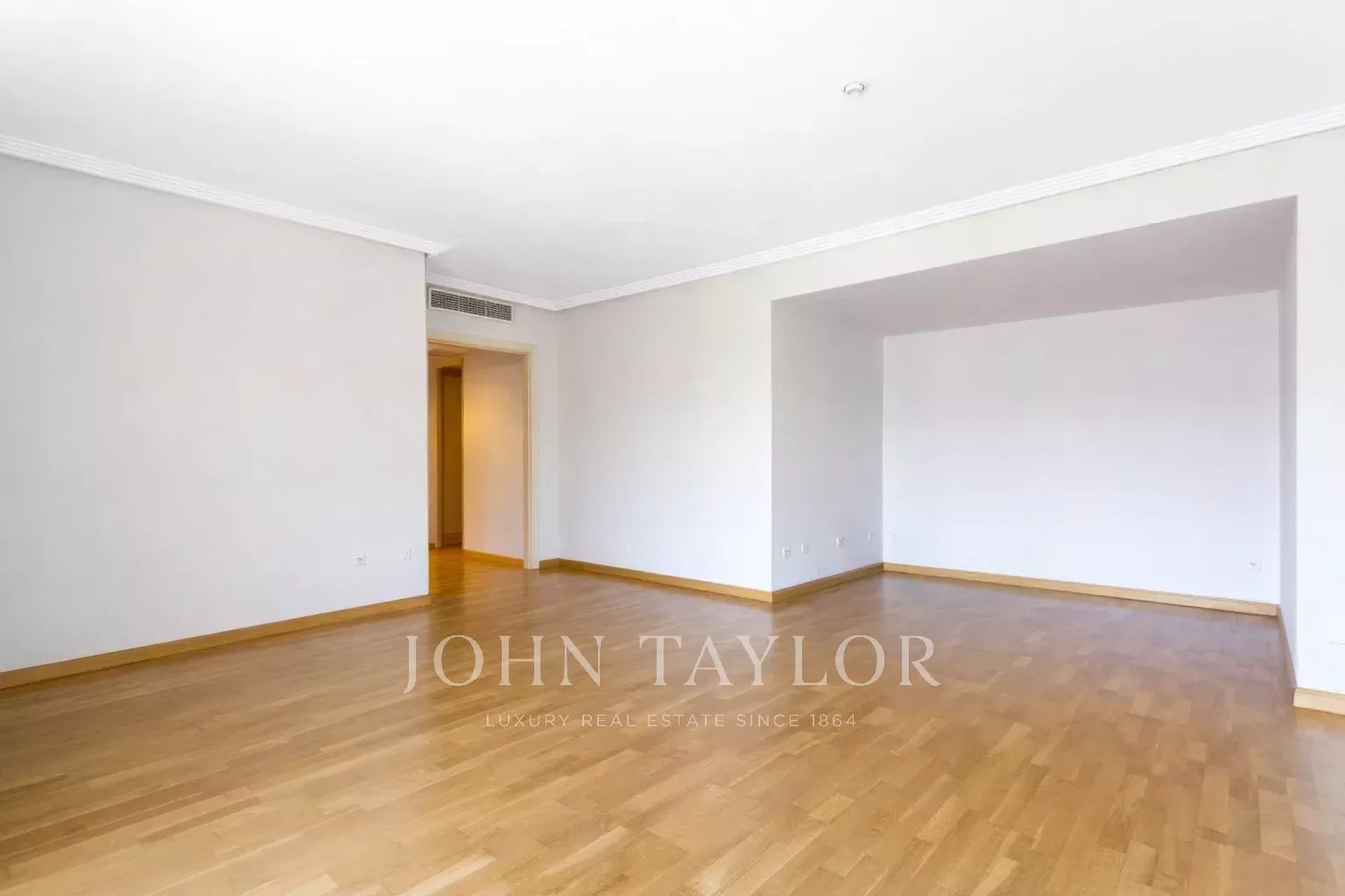 It has air conditioning, individual heating and hot water, oak flooring, white lacquered doors and double glazed aluminium windows. The flat is rented unfurnished and without electrical appliances except for the dishwasher. With two parking spaces and storage room.