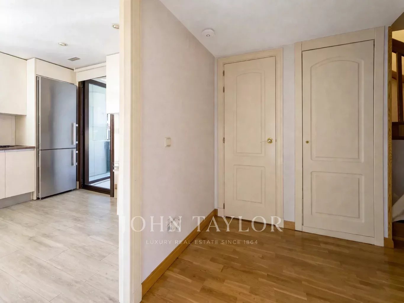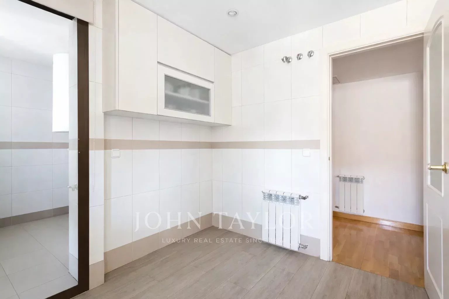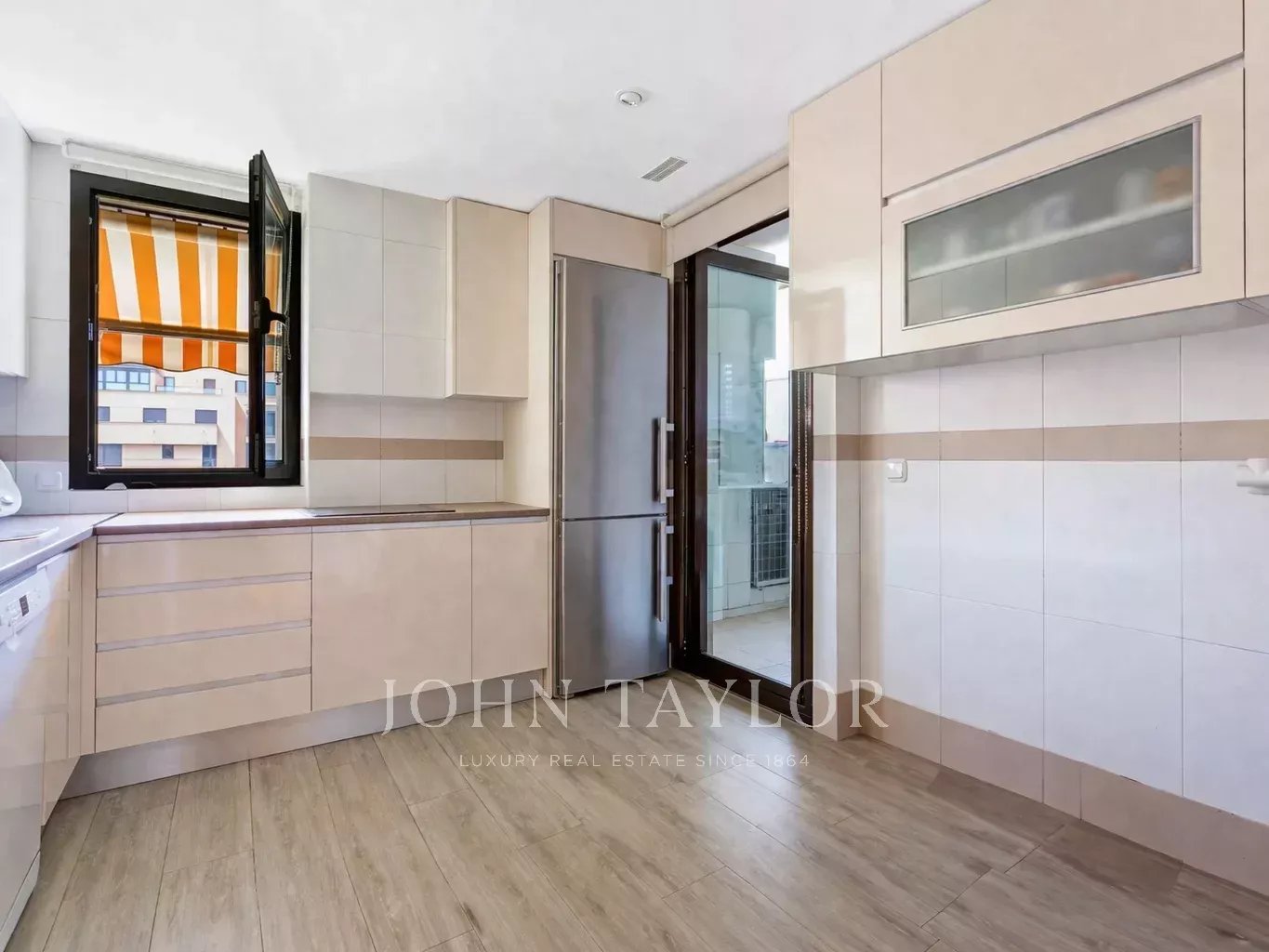 It has air conditioning, individual heating and hot water, oak flooring, white lacquered doors and double glazed aluminium windows. The flat is rented unfurnished and without electrical appliances except for the dishwasher. With two parking spaces and storage room.