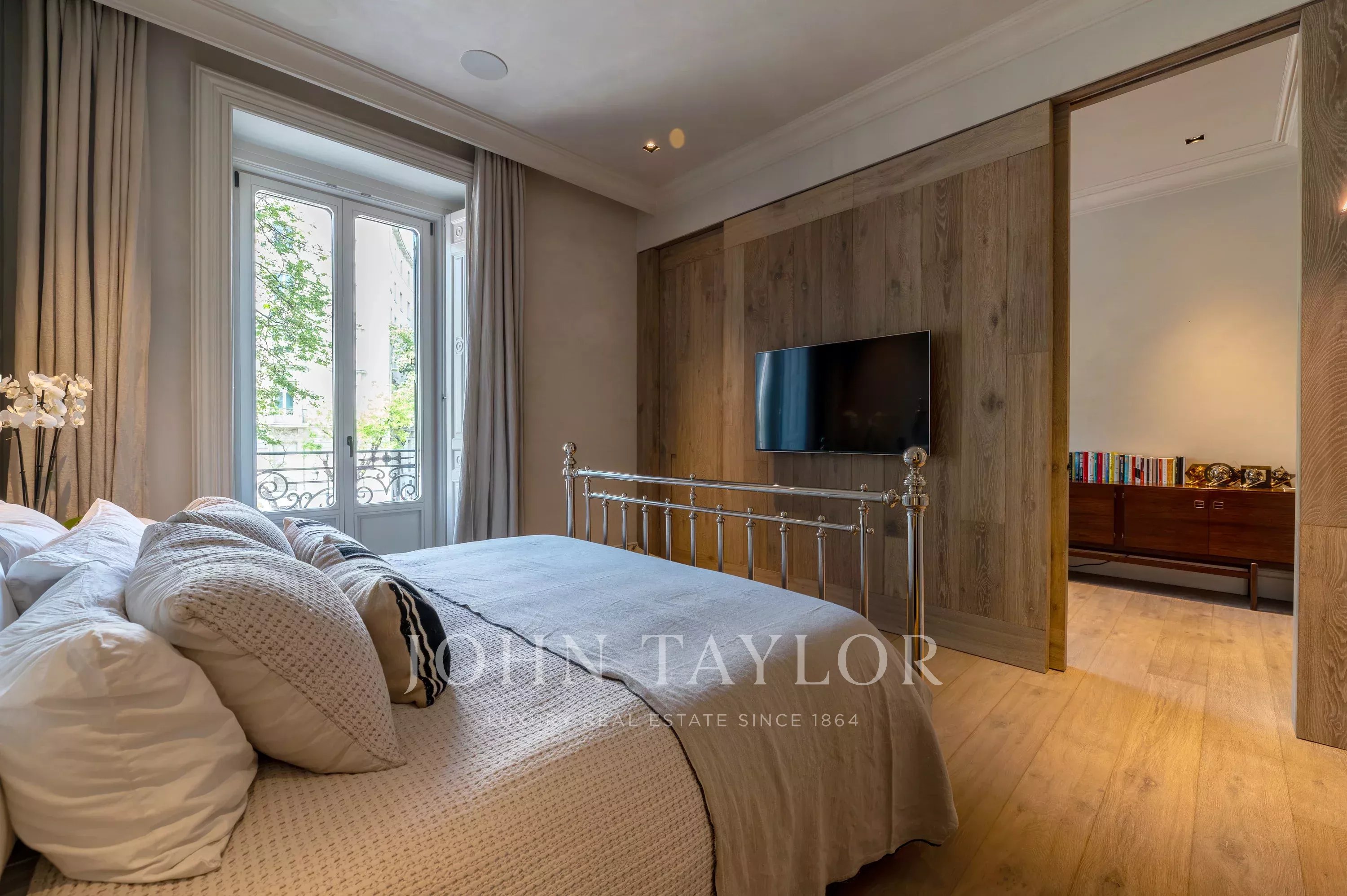 The master suite is presented as a genuine independent oasis, incorporating an elegant office area, a bedroom with privileged views of Alcalá Street, a spacious walk-in closet designed for fashion lovers, and a spectacular marble-lined bathroom.