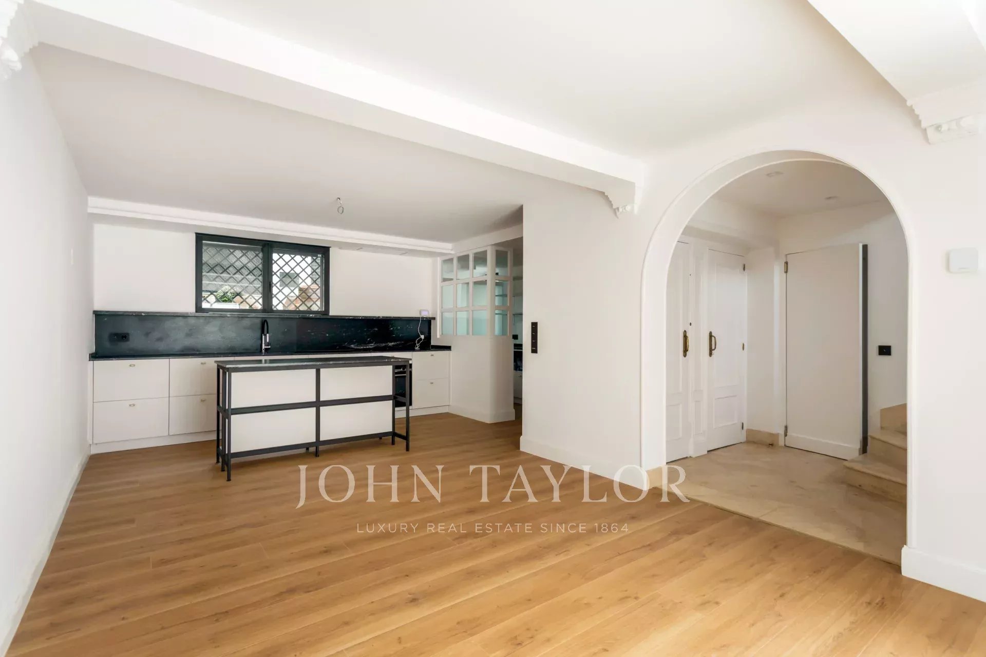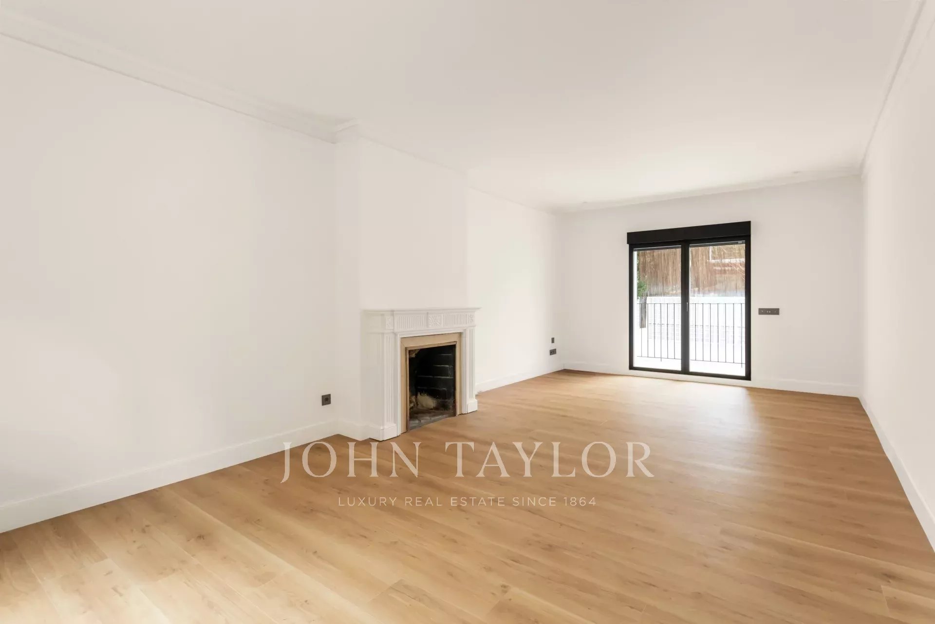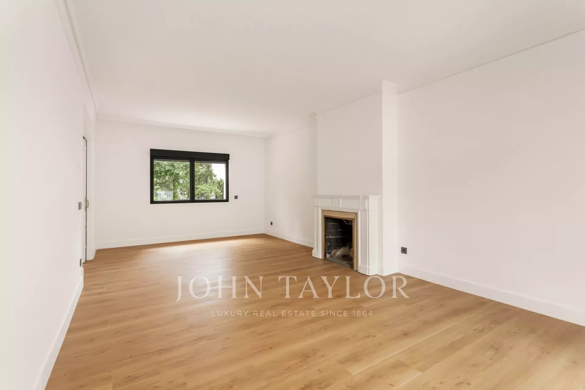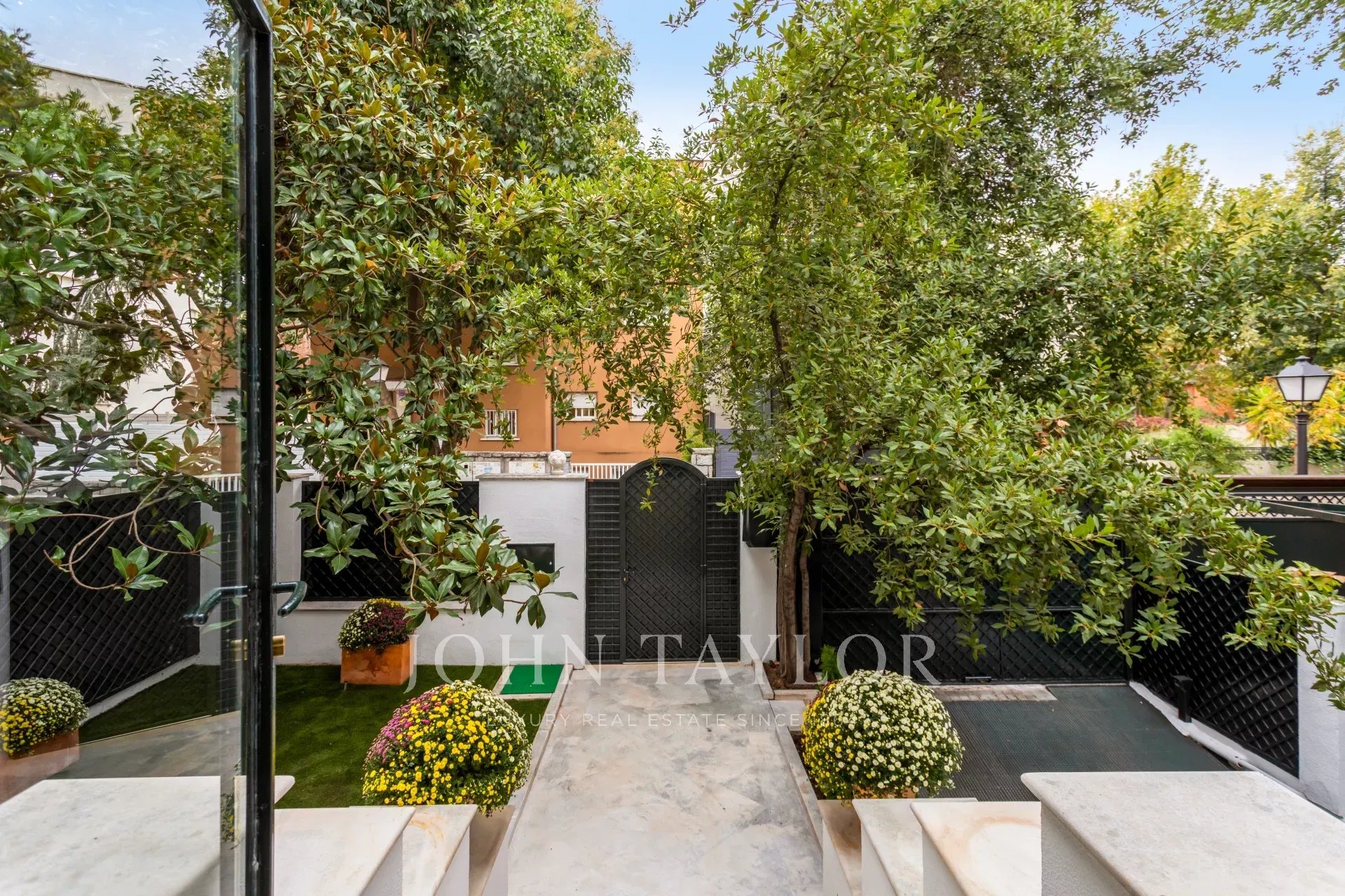 The main floor is entirely occupied by the reception area, with two spacious living rooms, one of which has a fireplace and access to a small terrace overlooking the rear garden.