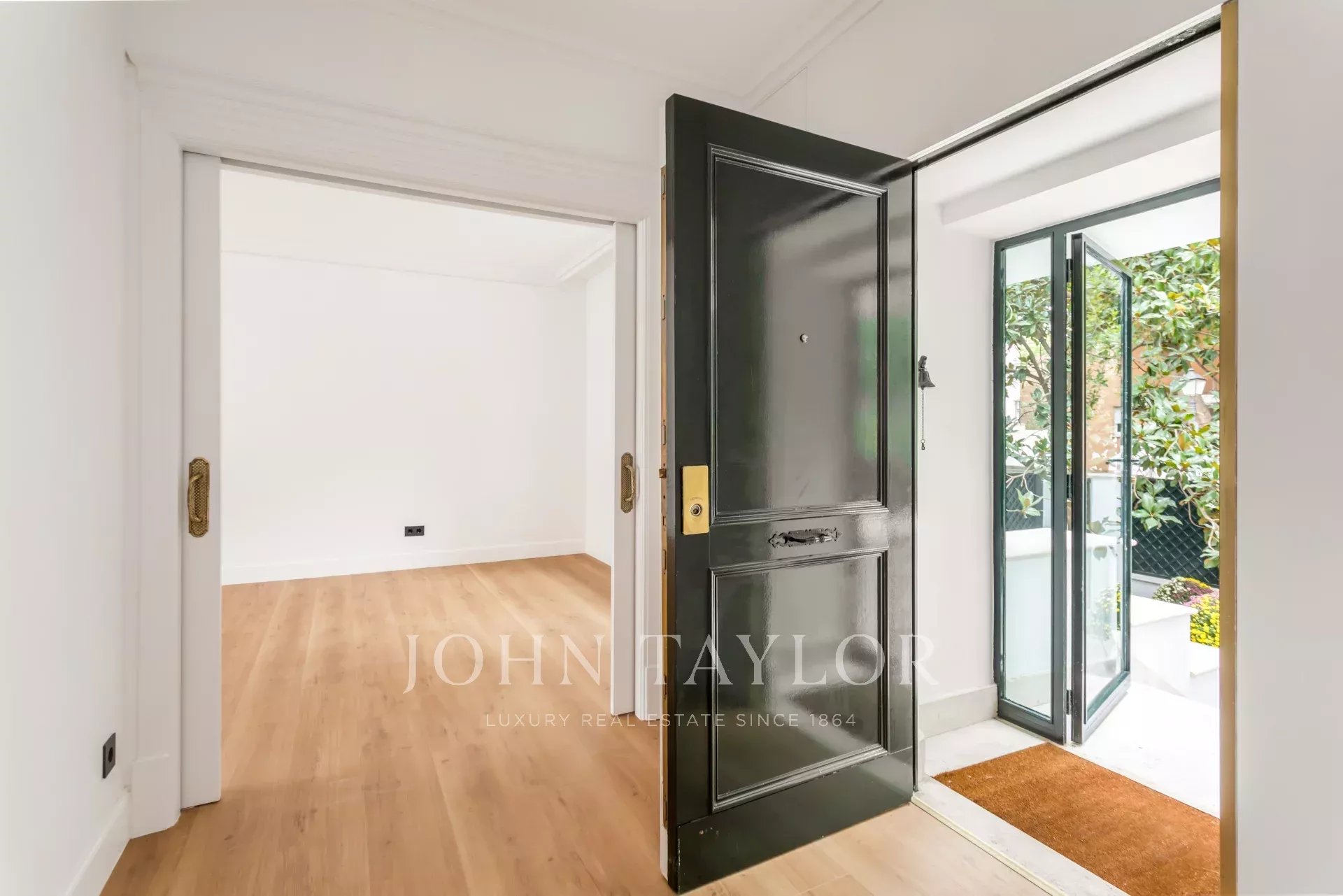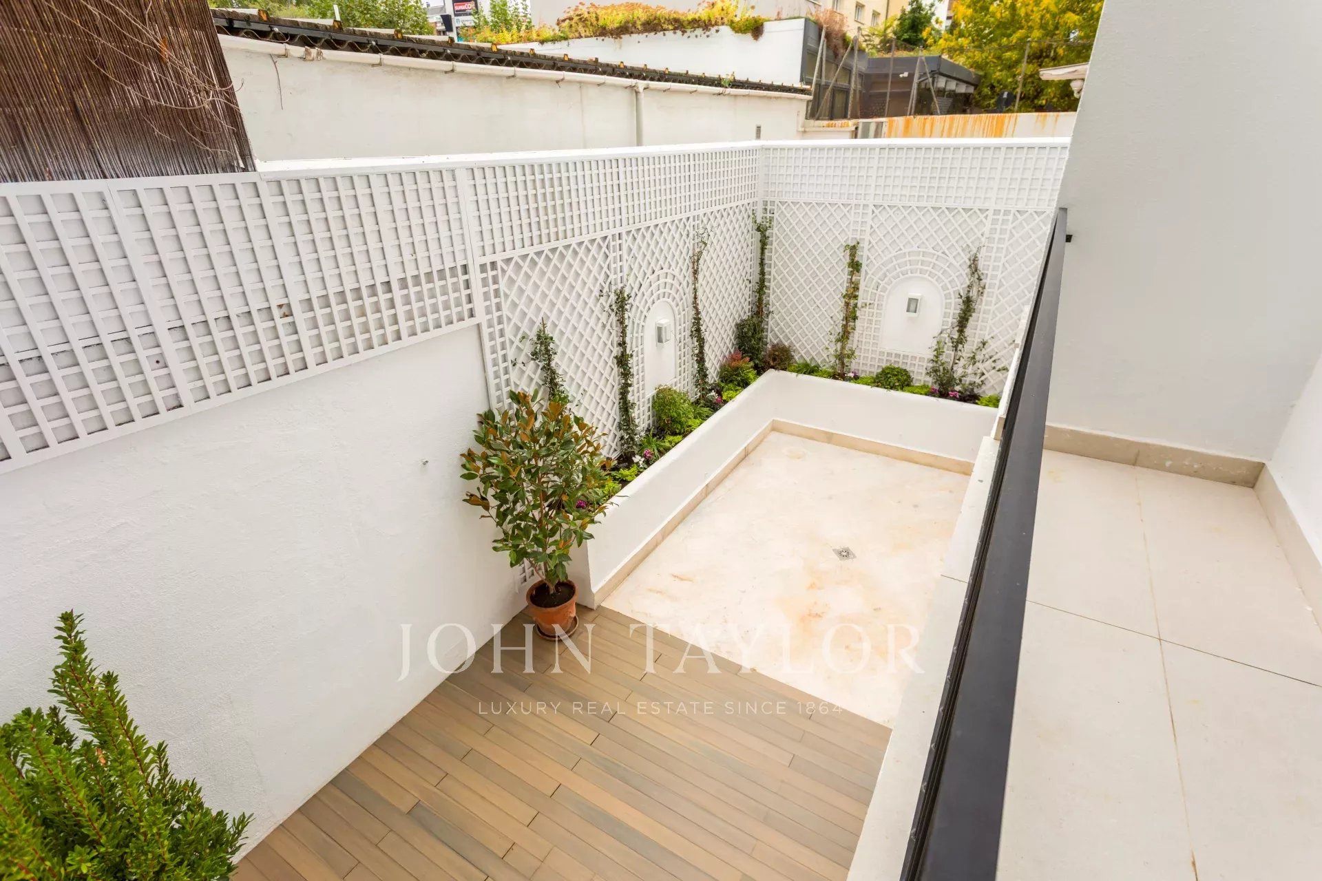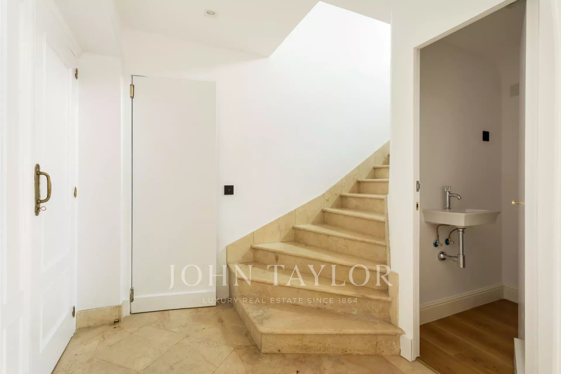 On the top floor there are also two bright bedrooms, each with a dressing room and en-suite bathroom, and both with access to a large terrace overlooking the front garden.