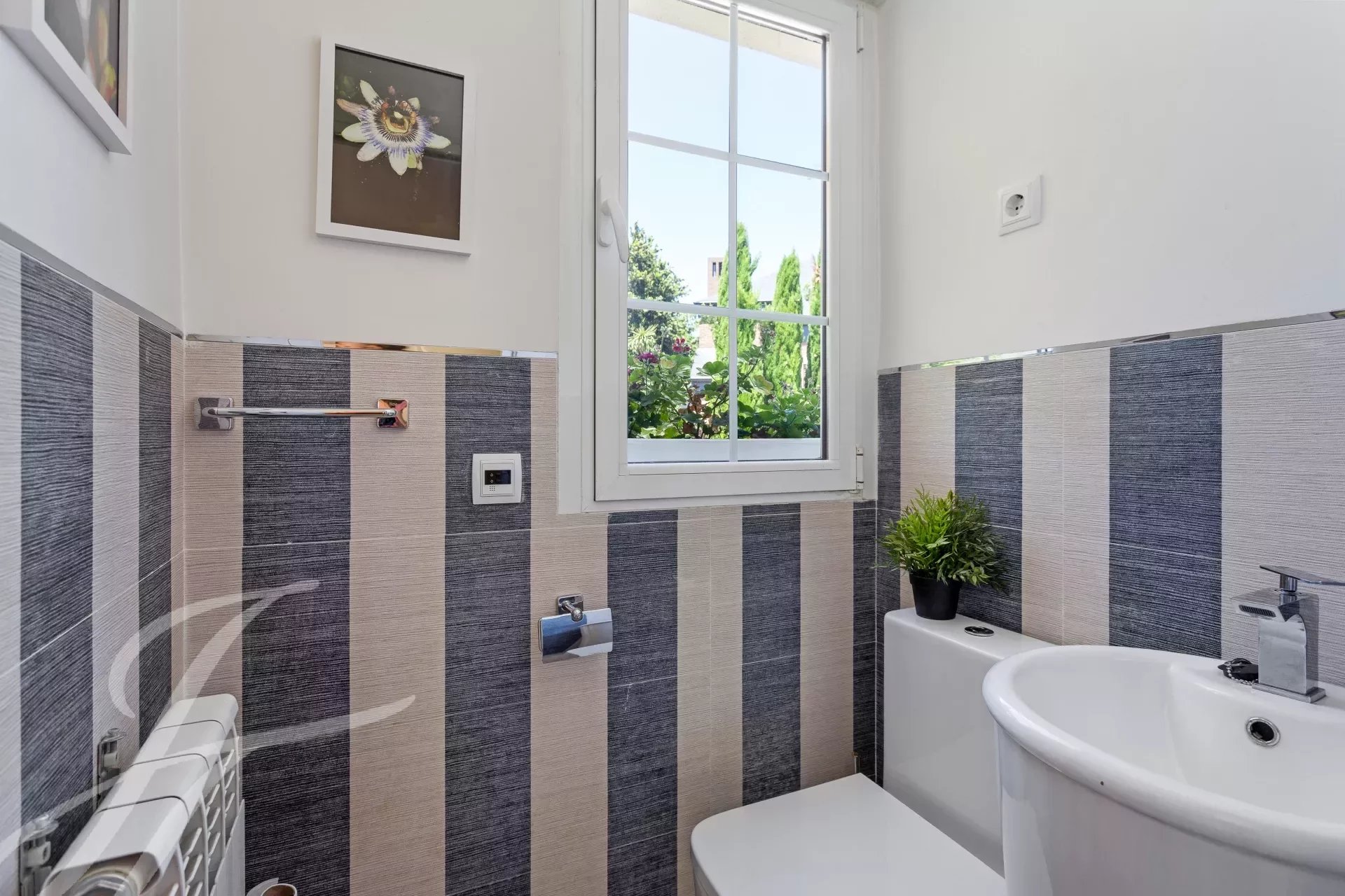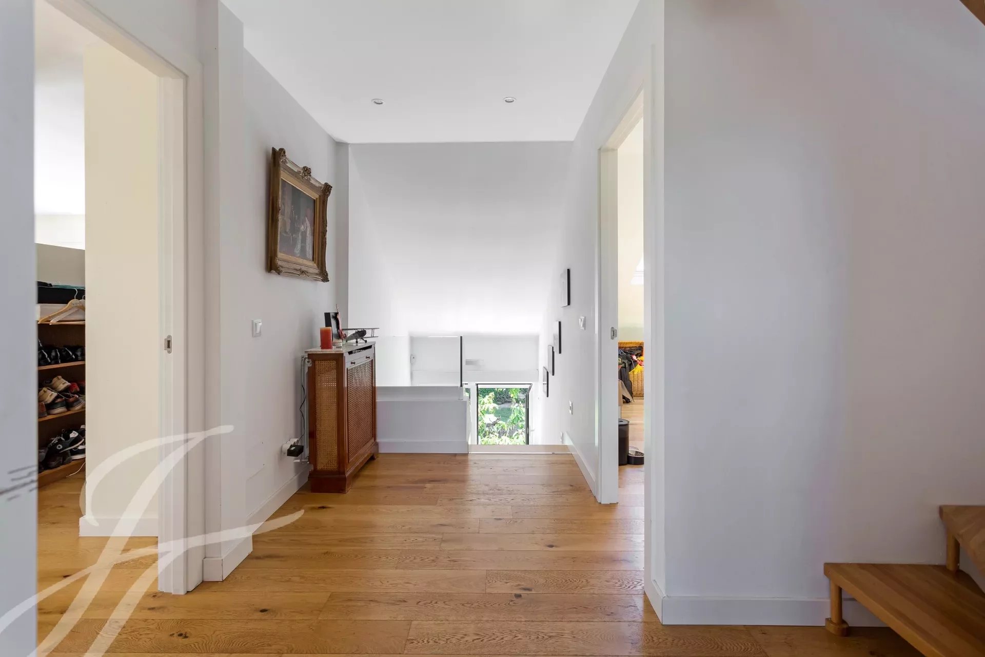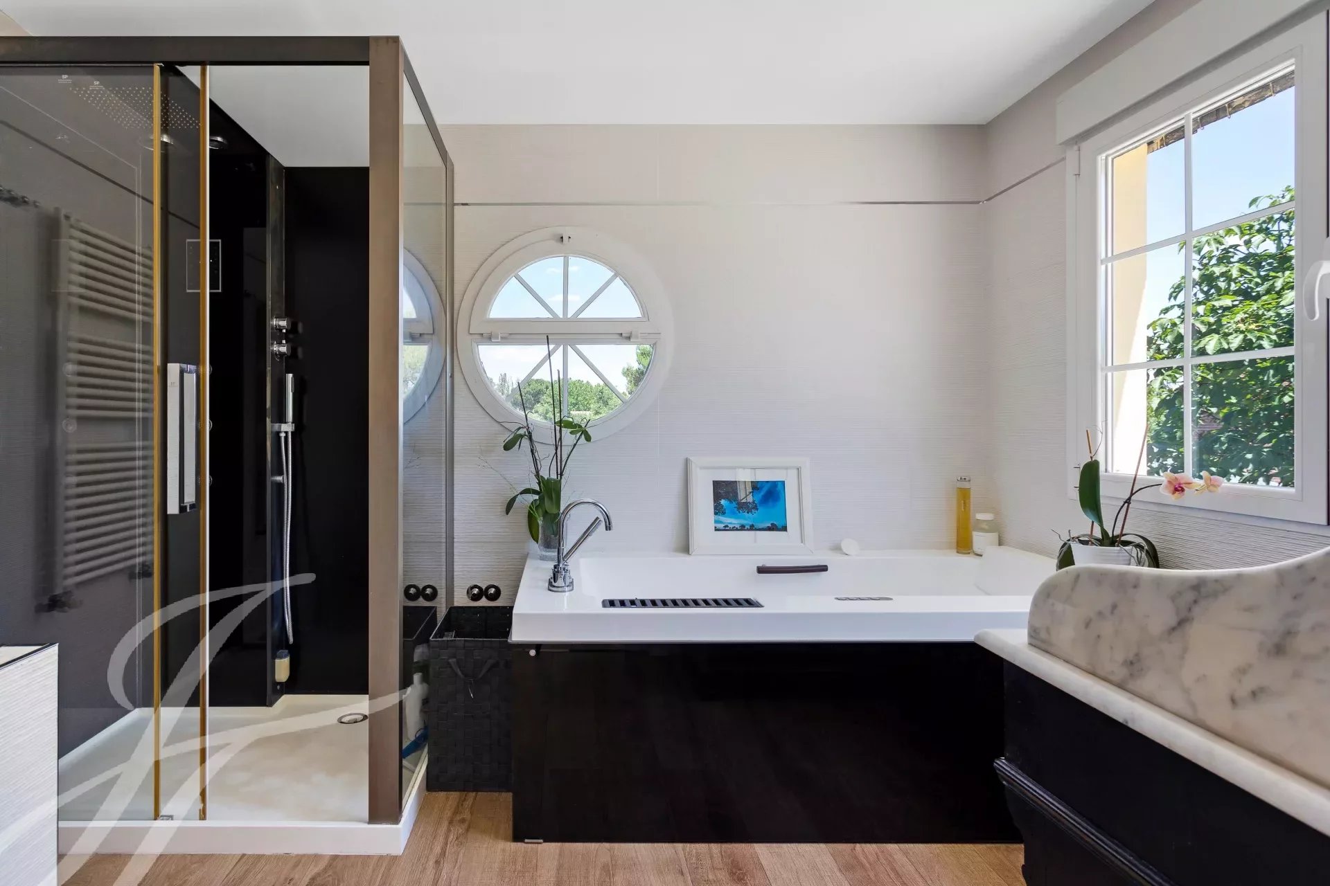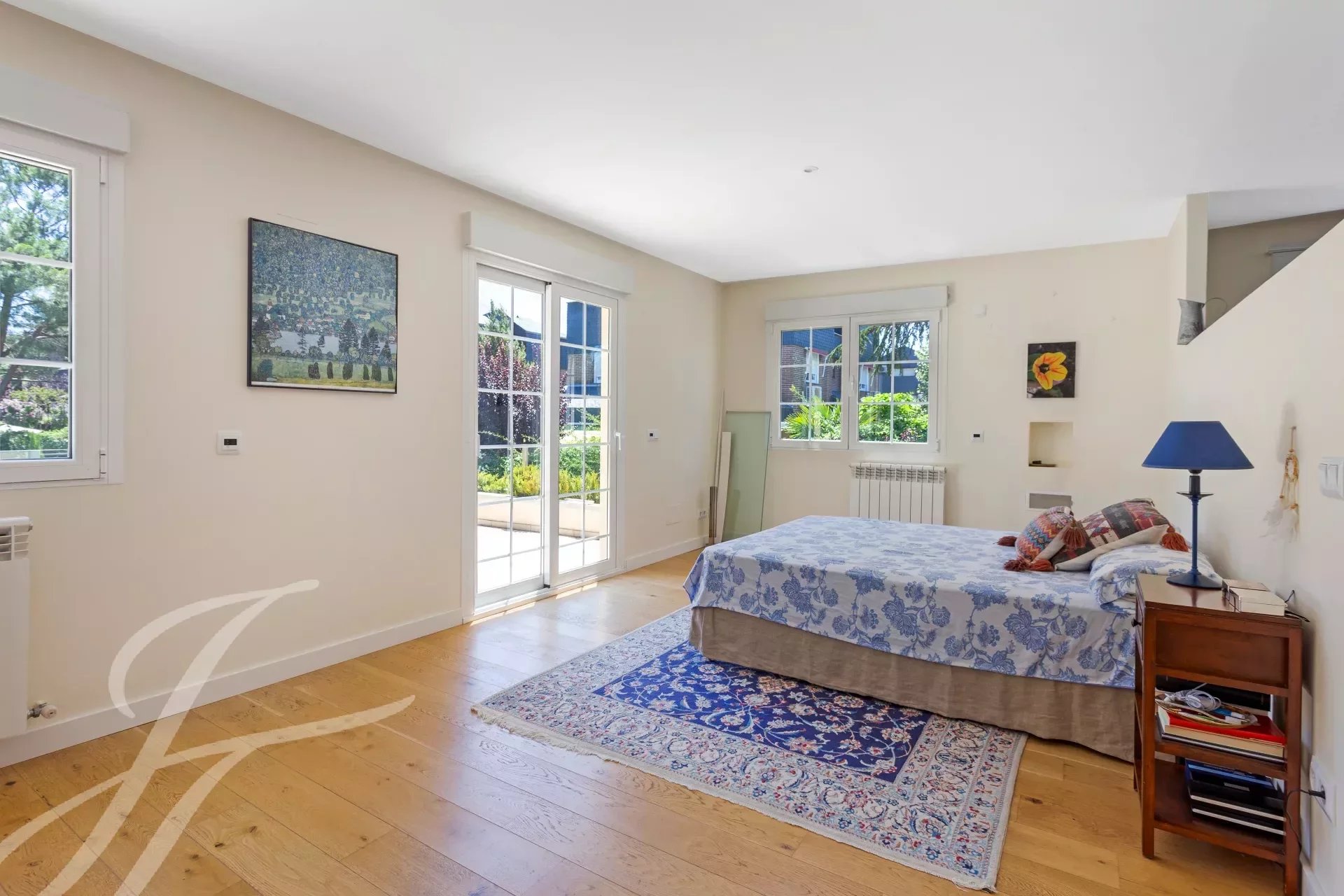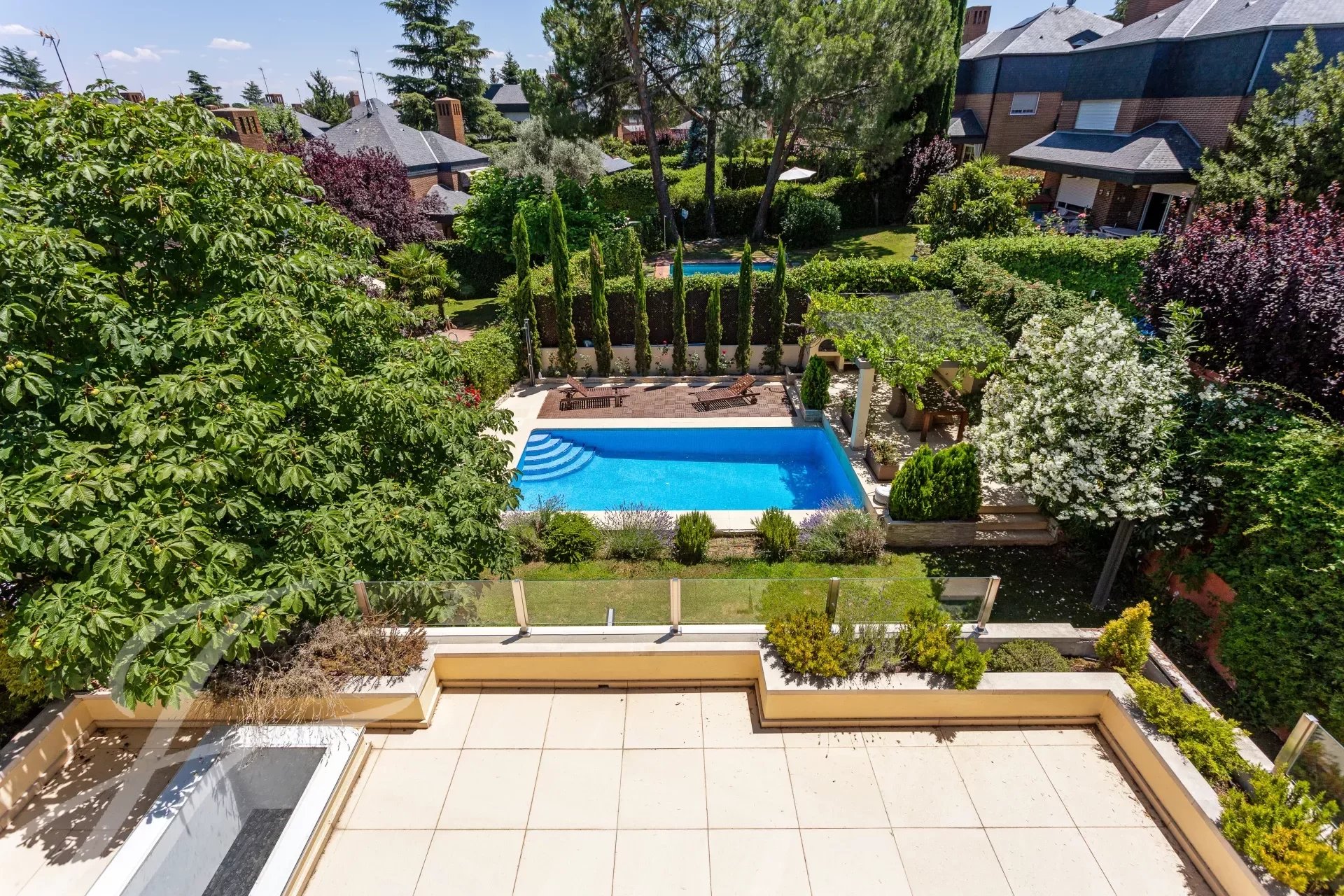 On the second floor, the master bedroom with en suite bathroom, dressing room, and huge terrace overlooking the garden and pool. In the bathroom, jacuzzi style bathtub, and steam cabin. Two additional bedrooms with shared bathroom.