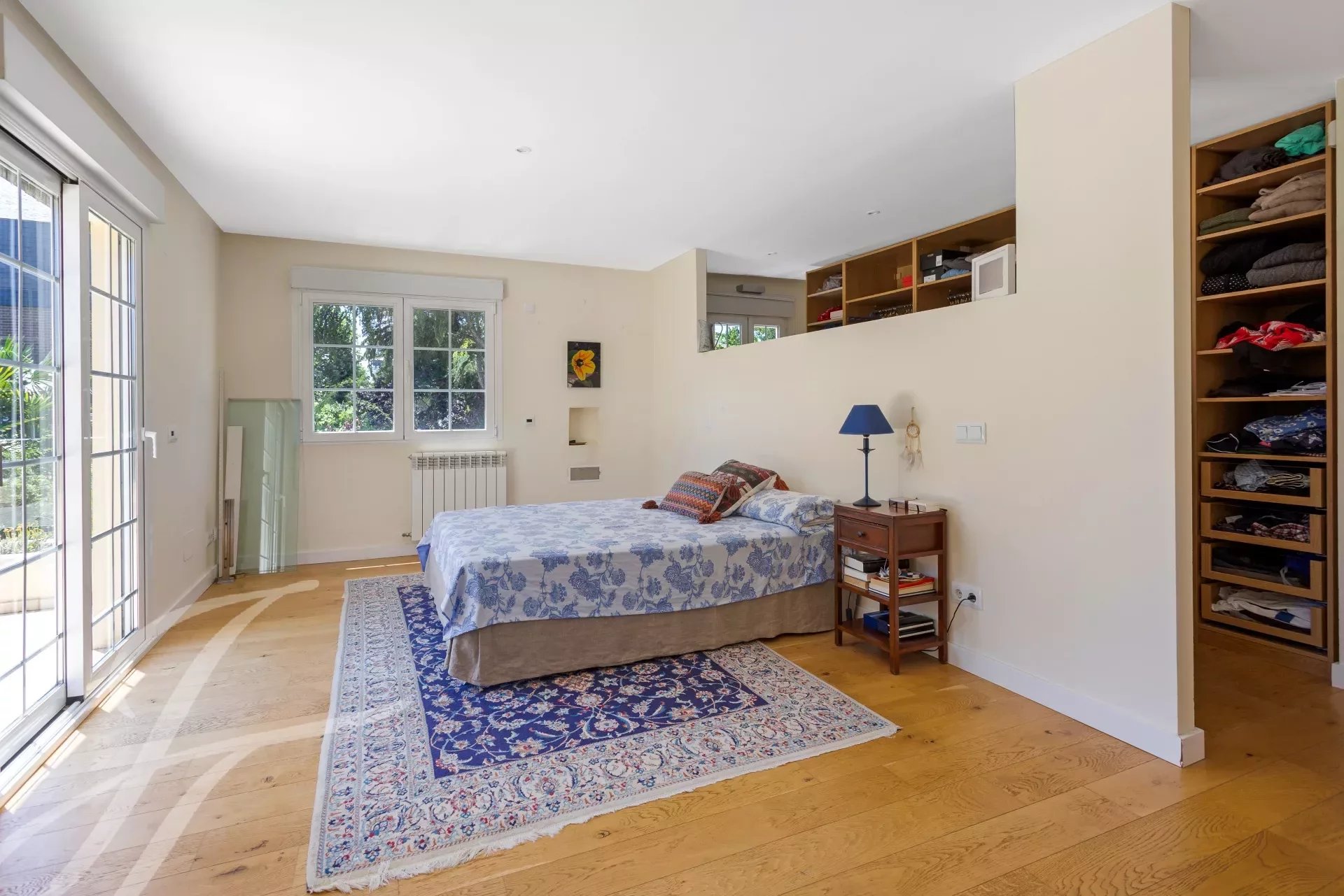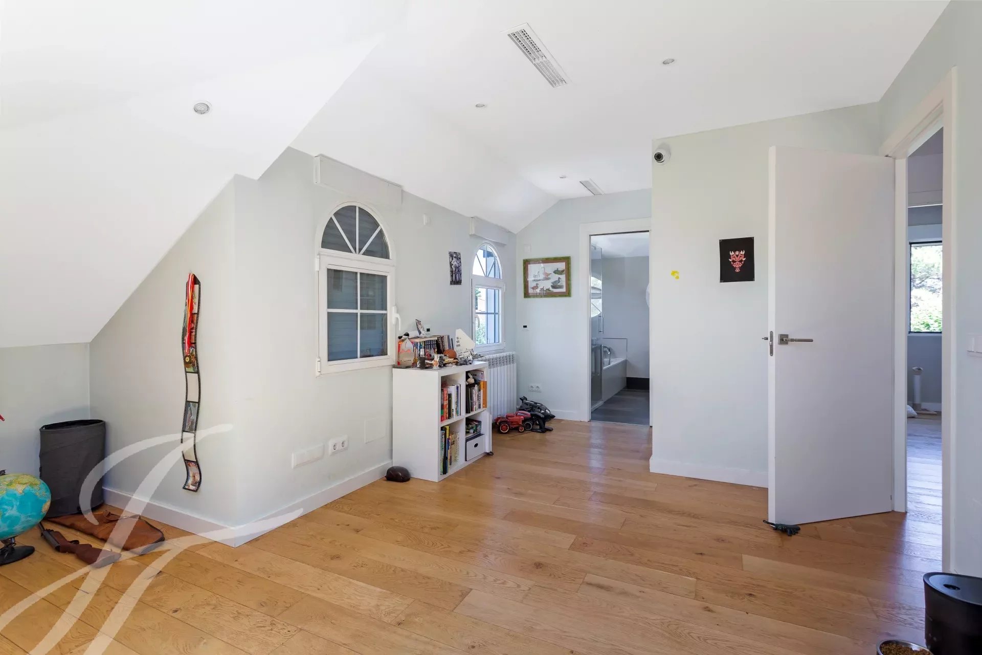 On the second floor is a huge bedroom with en suite bathroom and terrace overlooking the garden and pool, and large window facing the skyline of Madrid.