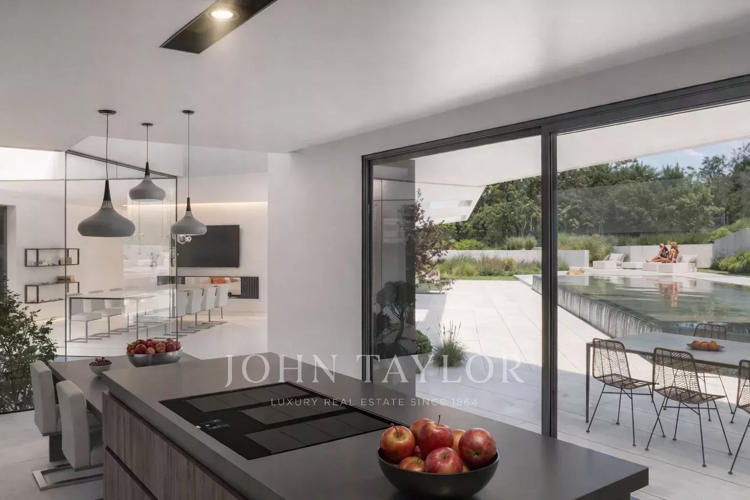 It is accessed through a wonderful hallway to a south facing living room that extends through several rooms, perfectly merging the interior with the exterior through the large windows.