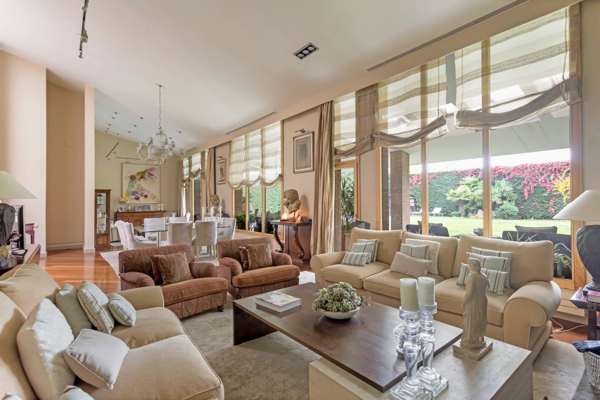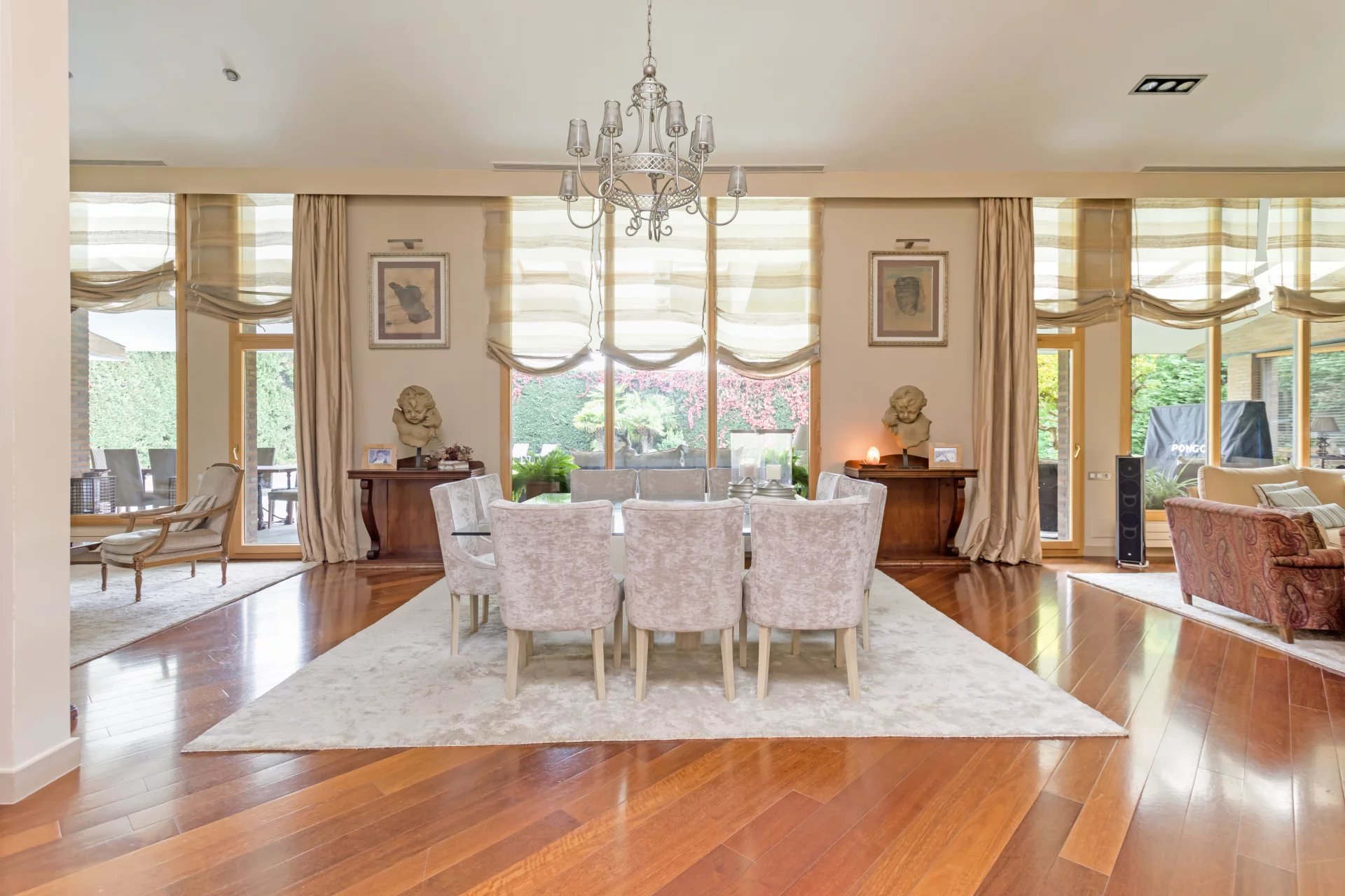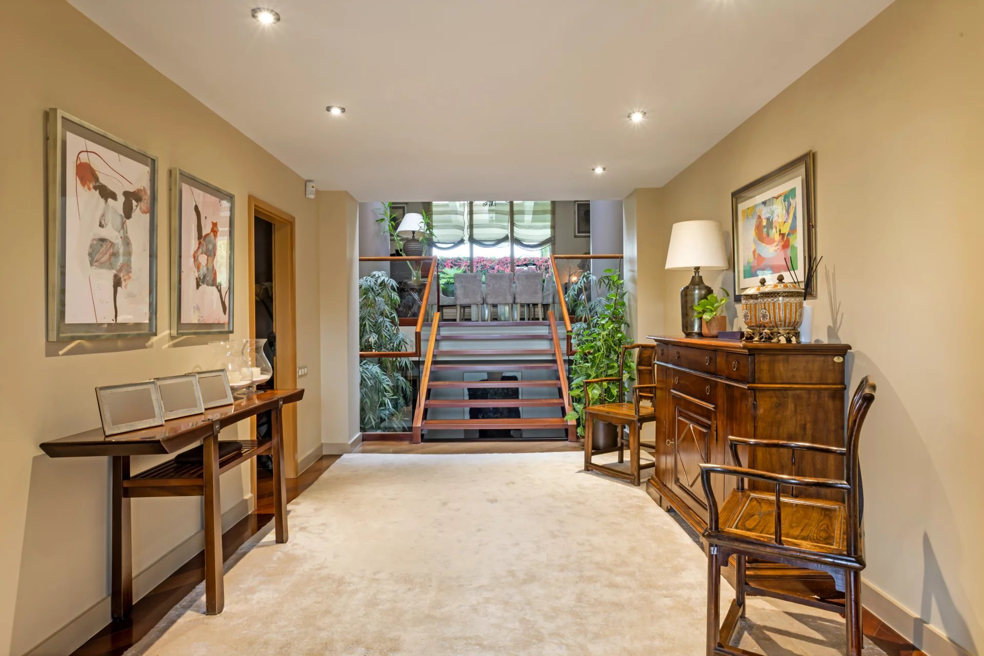 An elegant welcome area leads to a guest toilet, a cosy living room and a dining room.