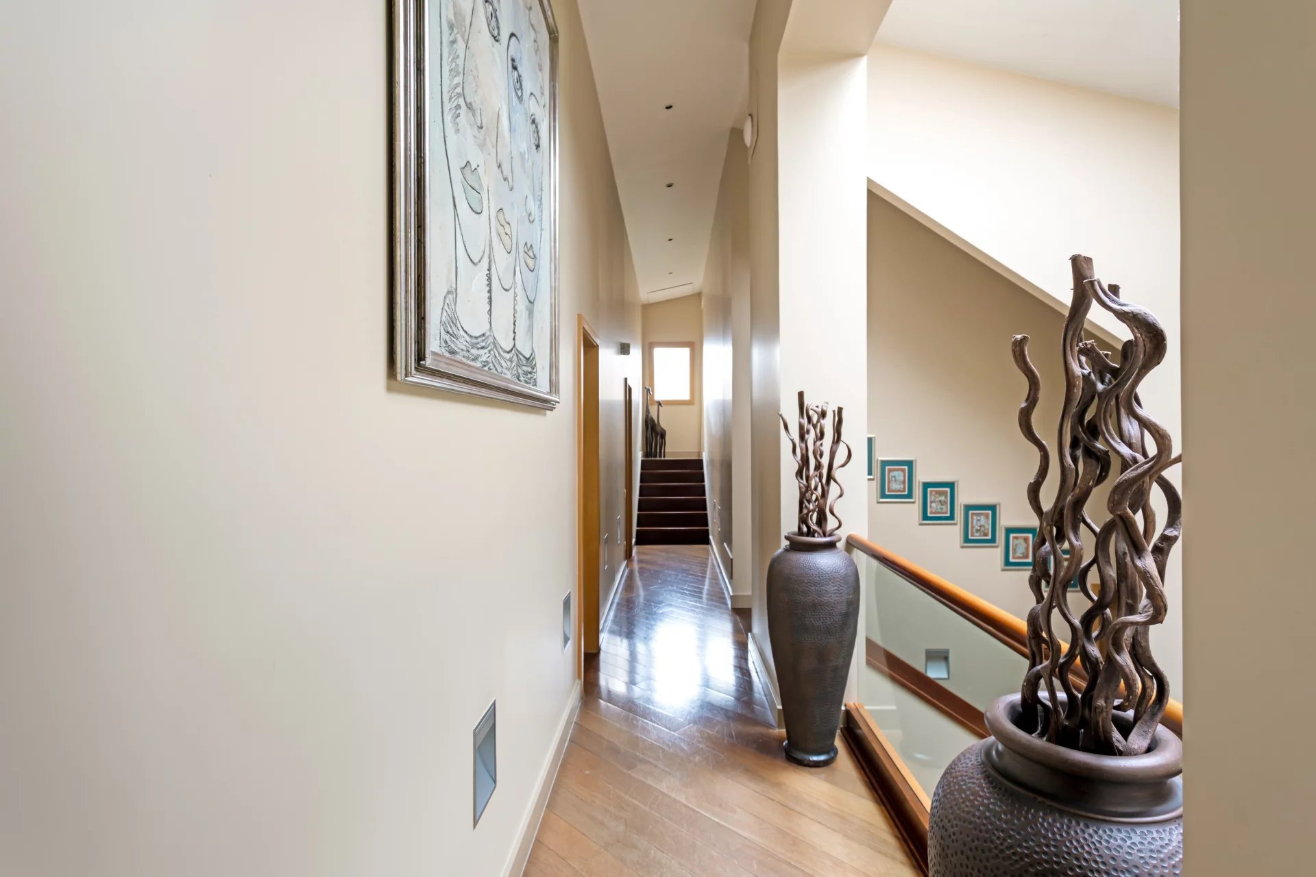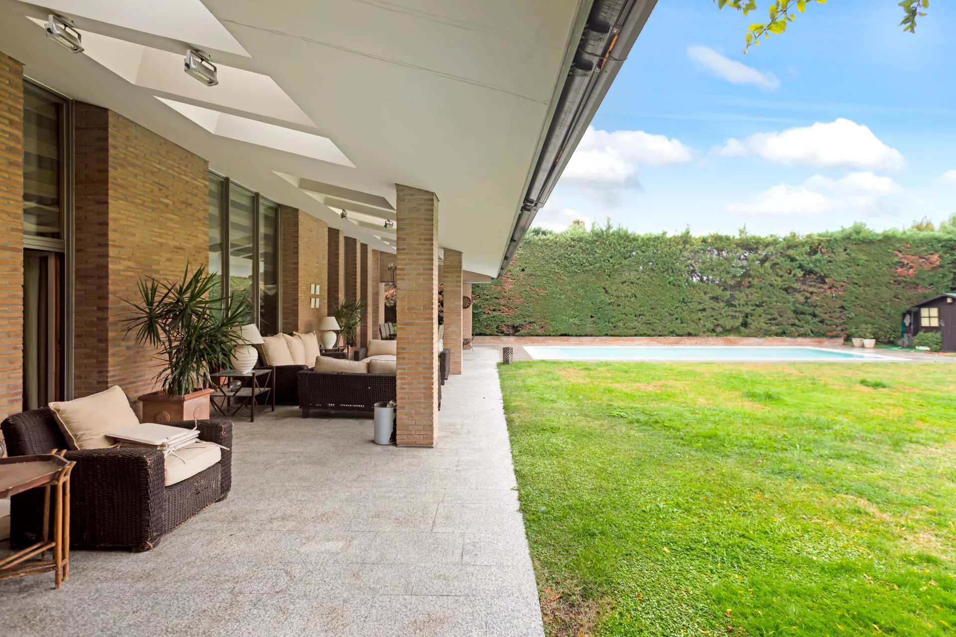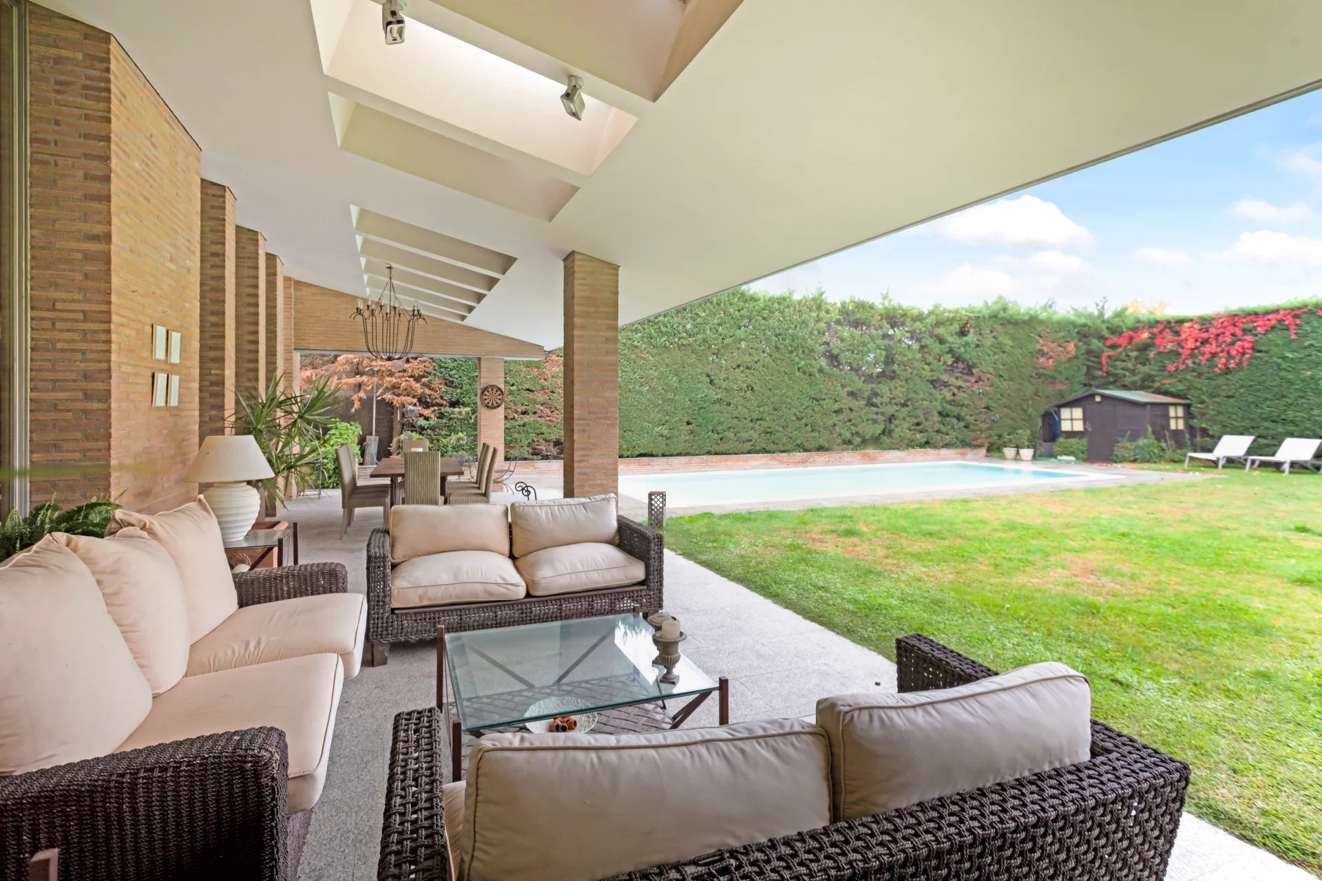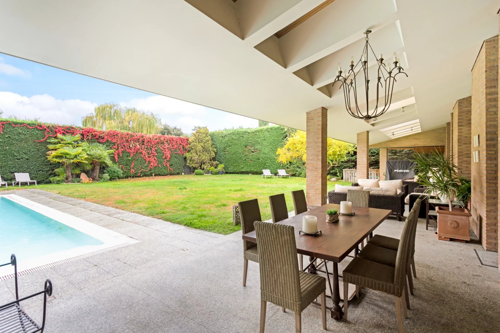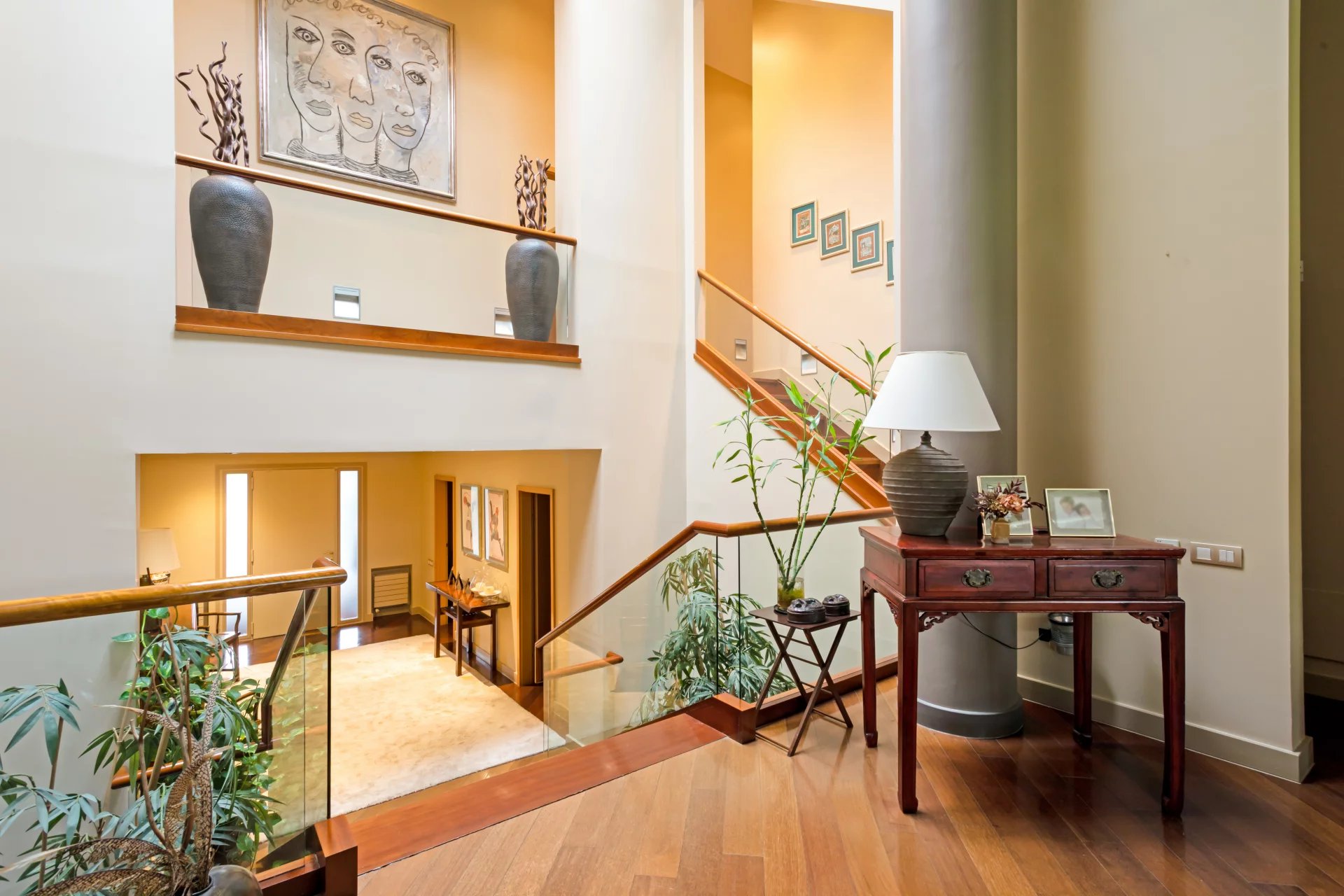 From the entrance area, a seven-step staircase leads to an intermediate level — a mezzanine — which distributes the main living room, kitchen, covered porch, pool area and direct access to the communal gardens.