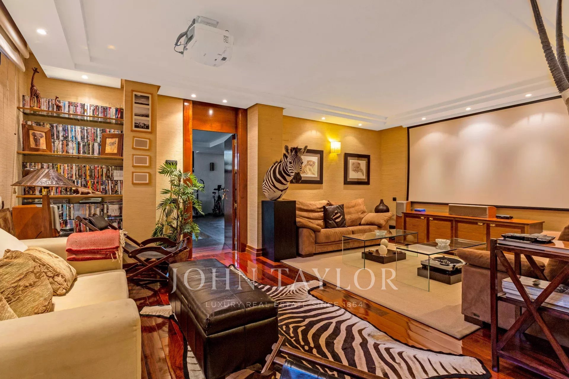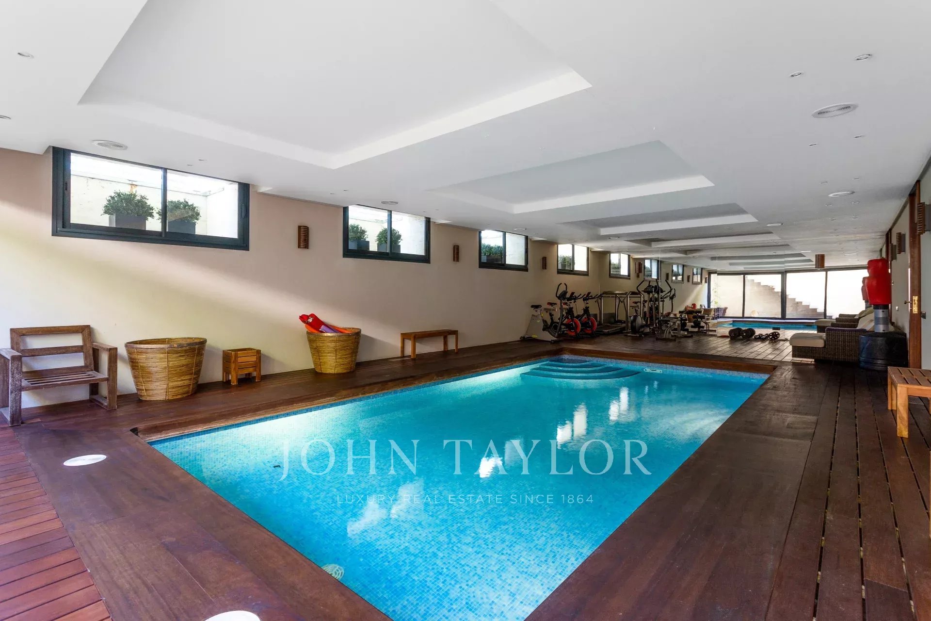 In the basement, there are two service bedrooms with bathroom, closet, and a small service kitchen. Internal garage for five/four cars, utility room and storage room. At the other end of the basement there is a projection room and service toilet that continues with the indoor pool area, and gym, attached full bathroom and sauna.