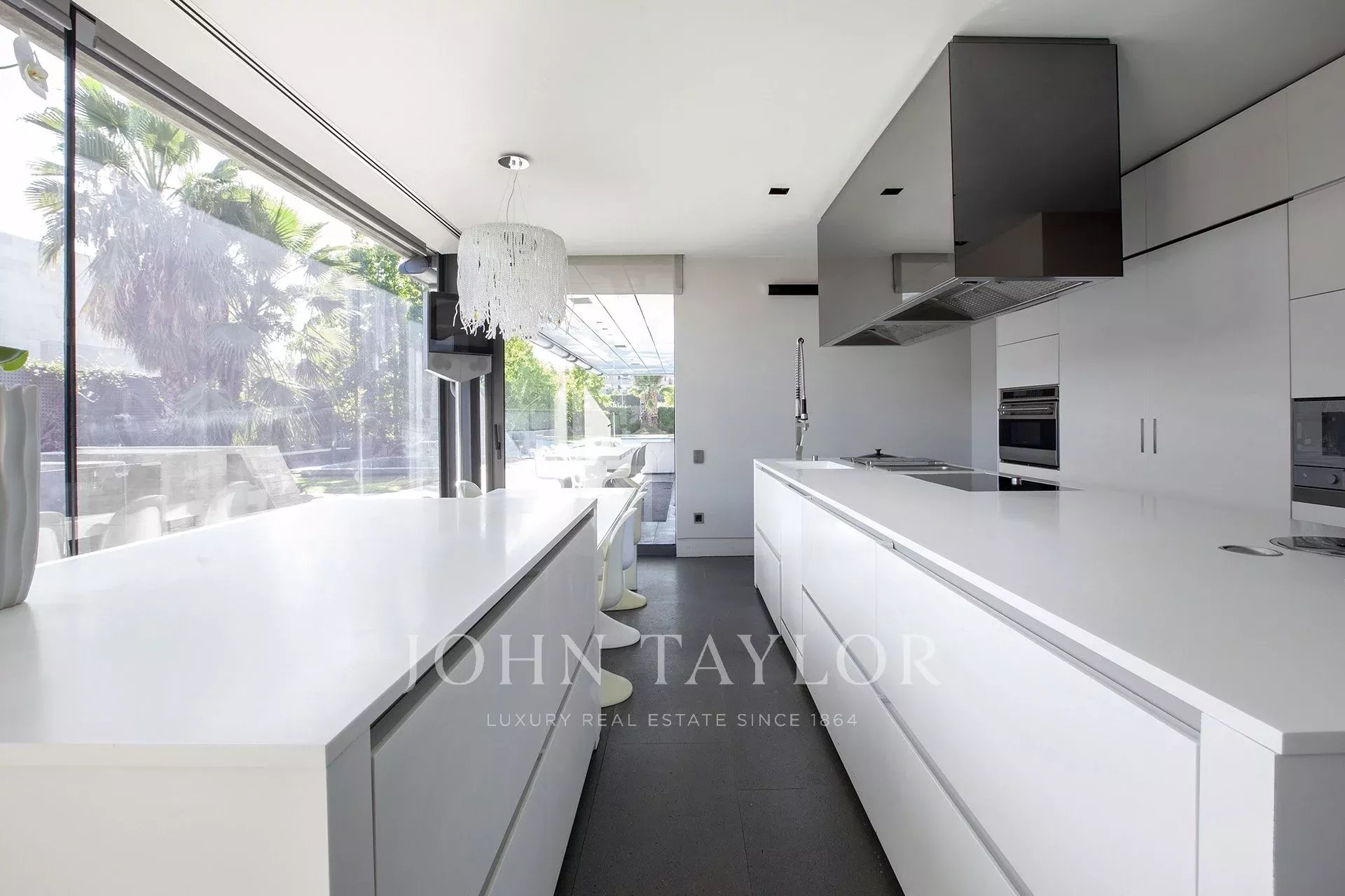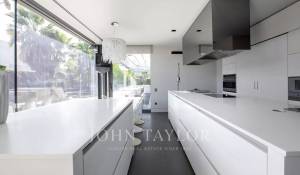 The white corian kitchen by BOFFI, with GAGGENAU induction hob and SUBZERO oven with two glazed walls leading to the garden and with a large daily office for crockery, pantry etc. and a cleaning room.