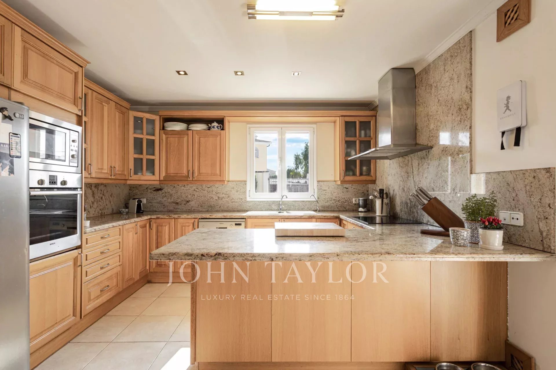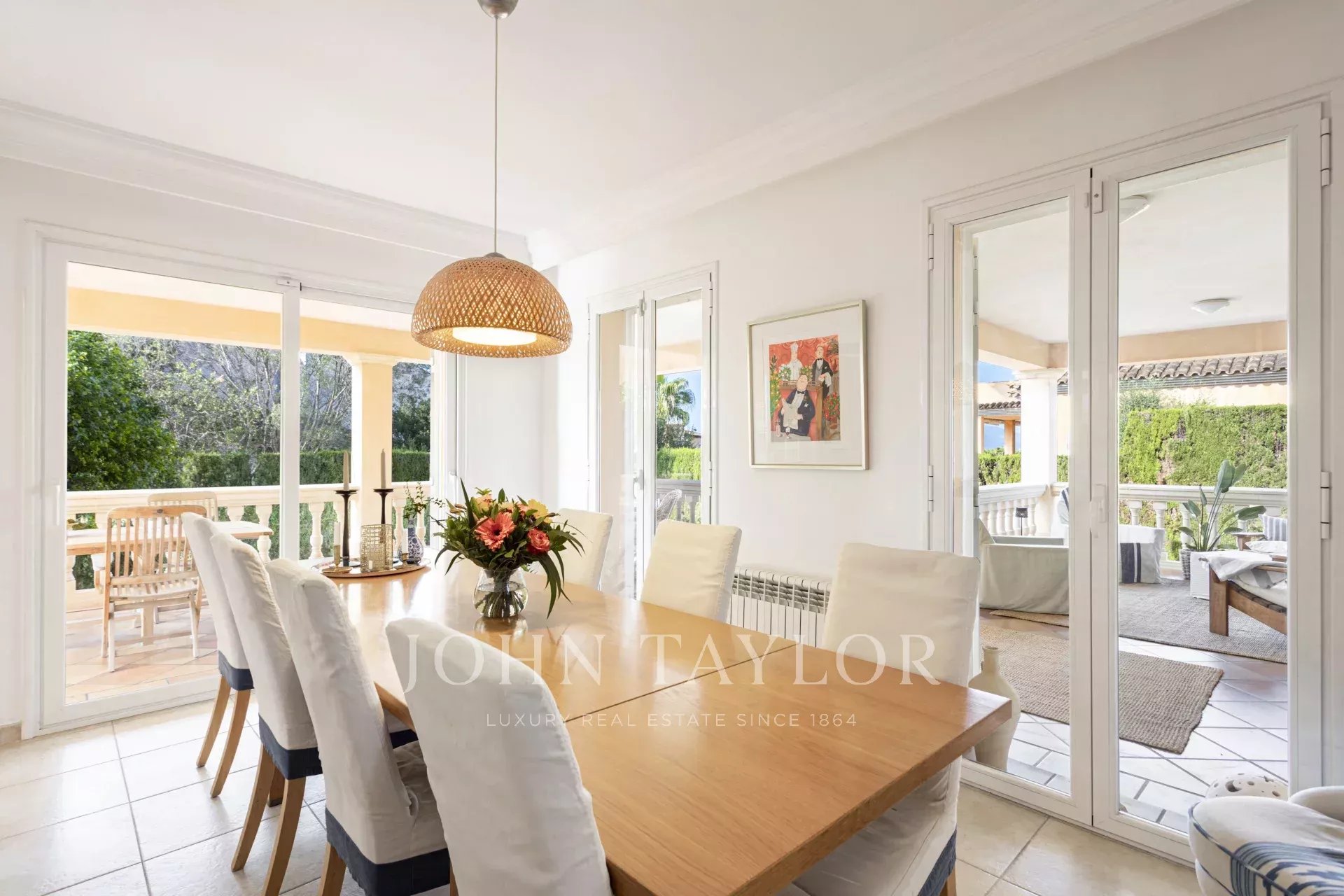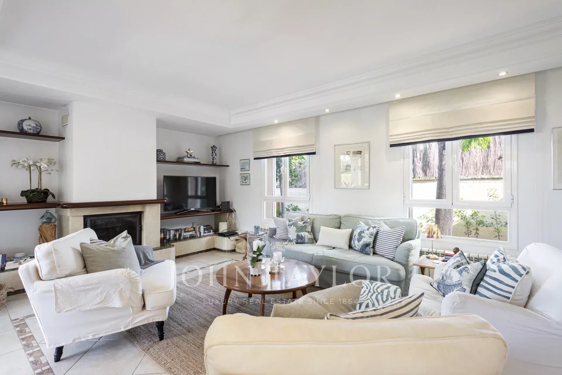 Step into a welcoming reception area that opens into a bright and spacious living-dining room, featuring a cozy fireplace—perfect for family gatherings. The fully equipped kitchen offers a separate dining and workspace, ideal for modern living. Enjoy seamless indoor-outdoor living with large open and covered terraces that lead directly into the private garden.
