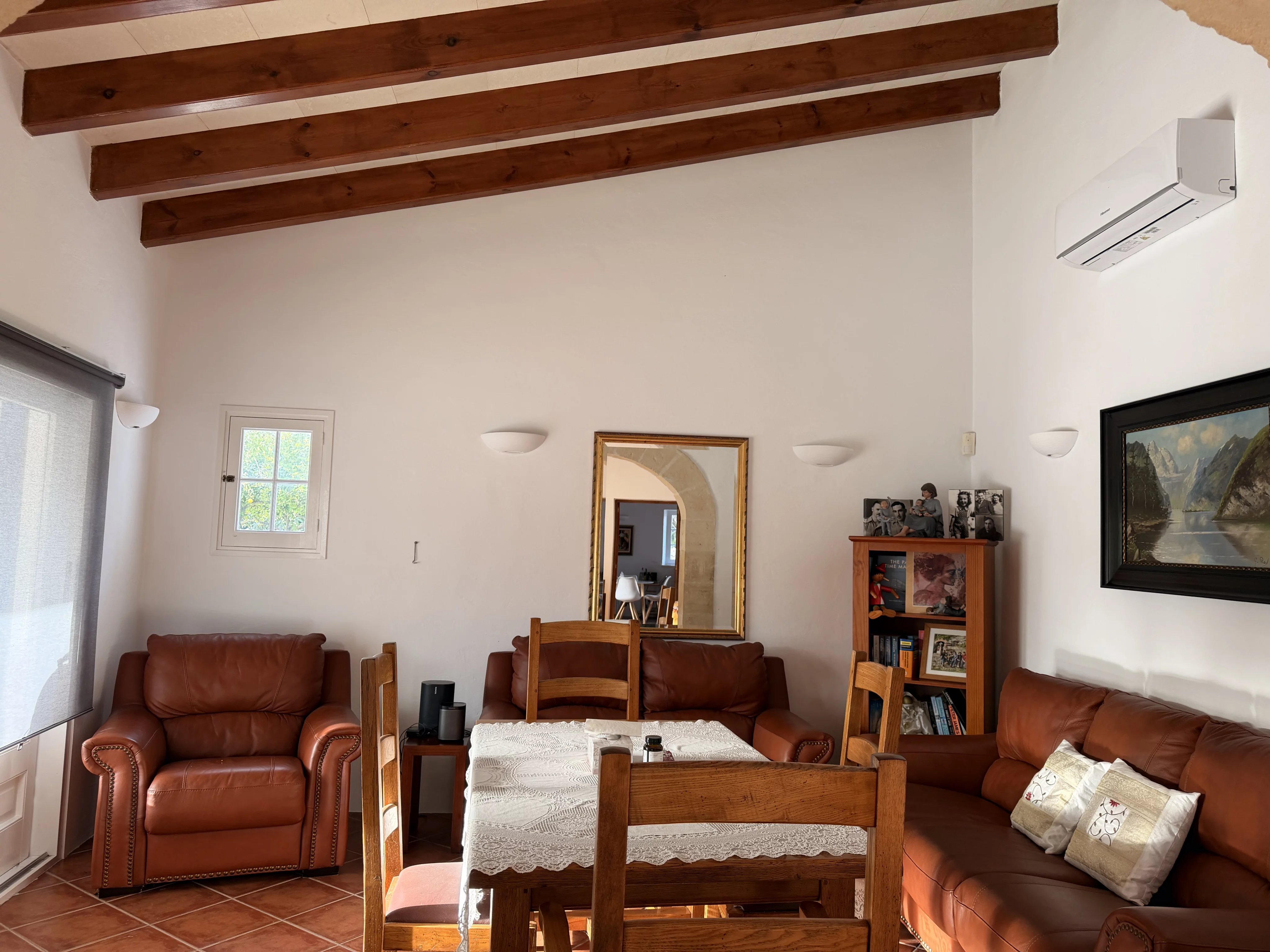 The day area offers a large and bright living-dining room, which opens to a fully renovated and equipped kitchen. From here, you access the back of the house, where a large outdoor terrace hosts the pool, an outdoor shower, and a perfect setting to enjoy the tranquility of the Minorcan countryside.