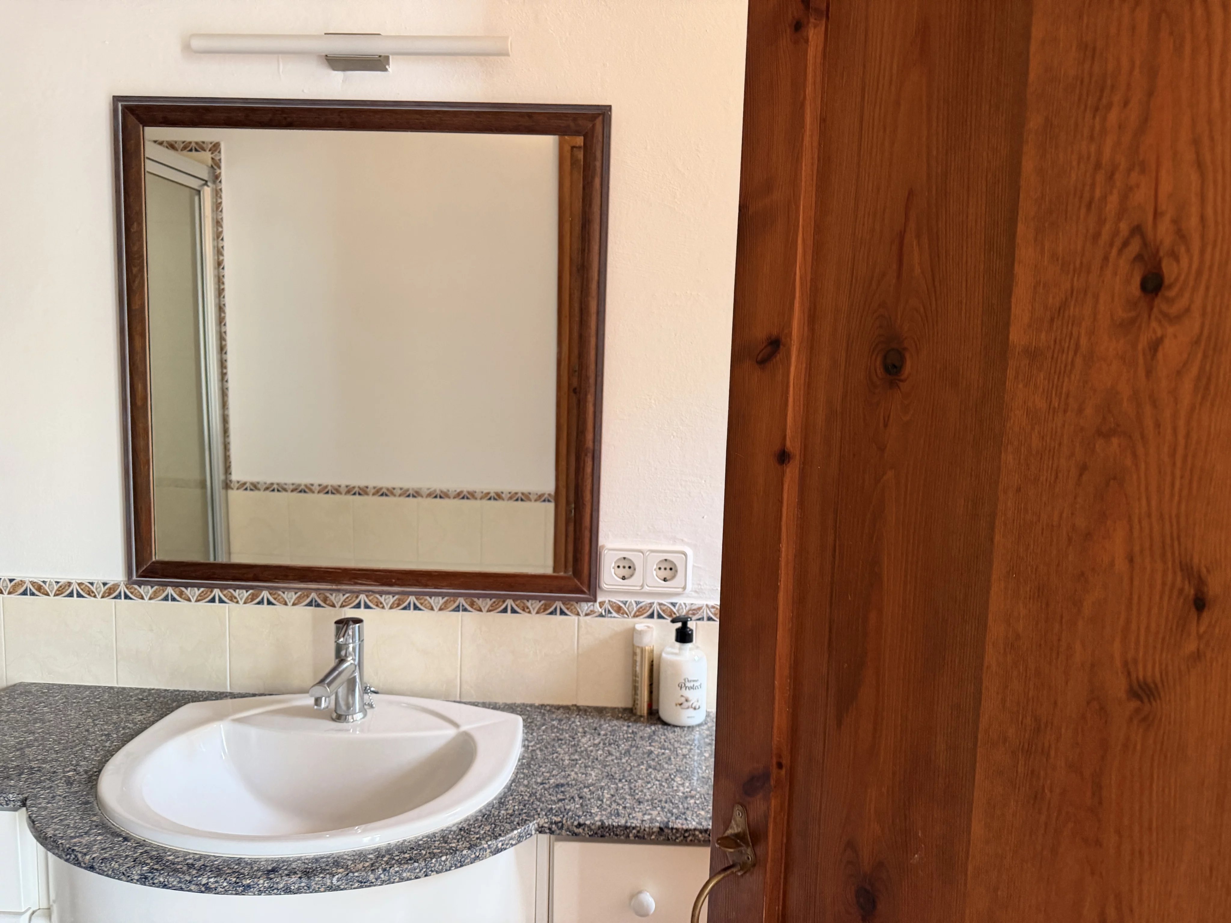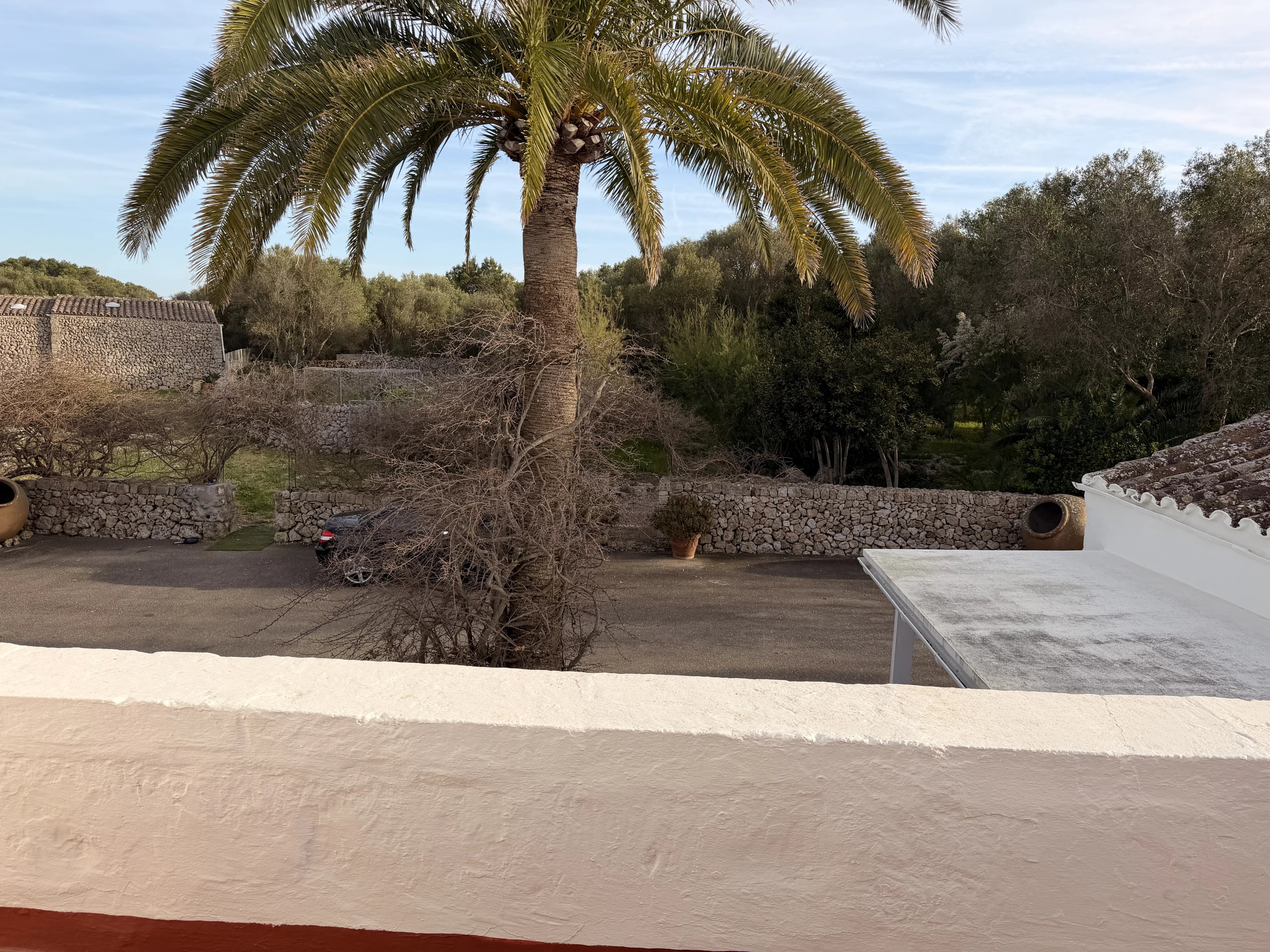 Upon entering the estate, a spacious garden welcomes you, along with a comfortable parking area. The main residence is mainly on the ground floor. Through a charming Minorcan porch, you access the reception hall that distributes two double bedrooms with two full bathrooms. Stairs lead to the master suite, which enjoys a private terrace with views of the natural surroundings, two dressing rooms, and a full bathroom.