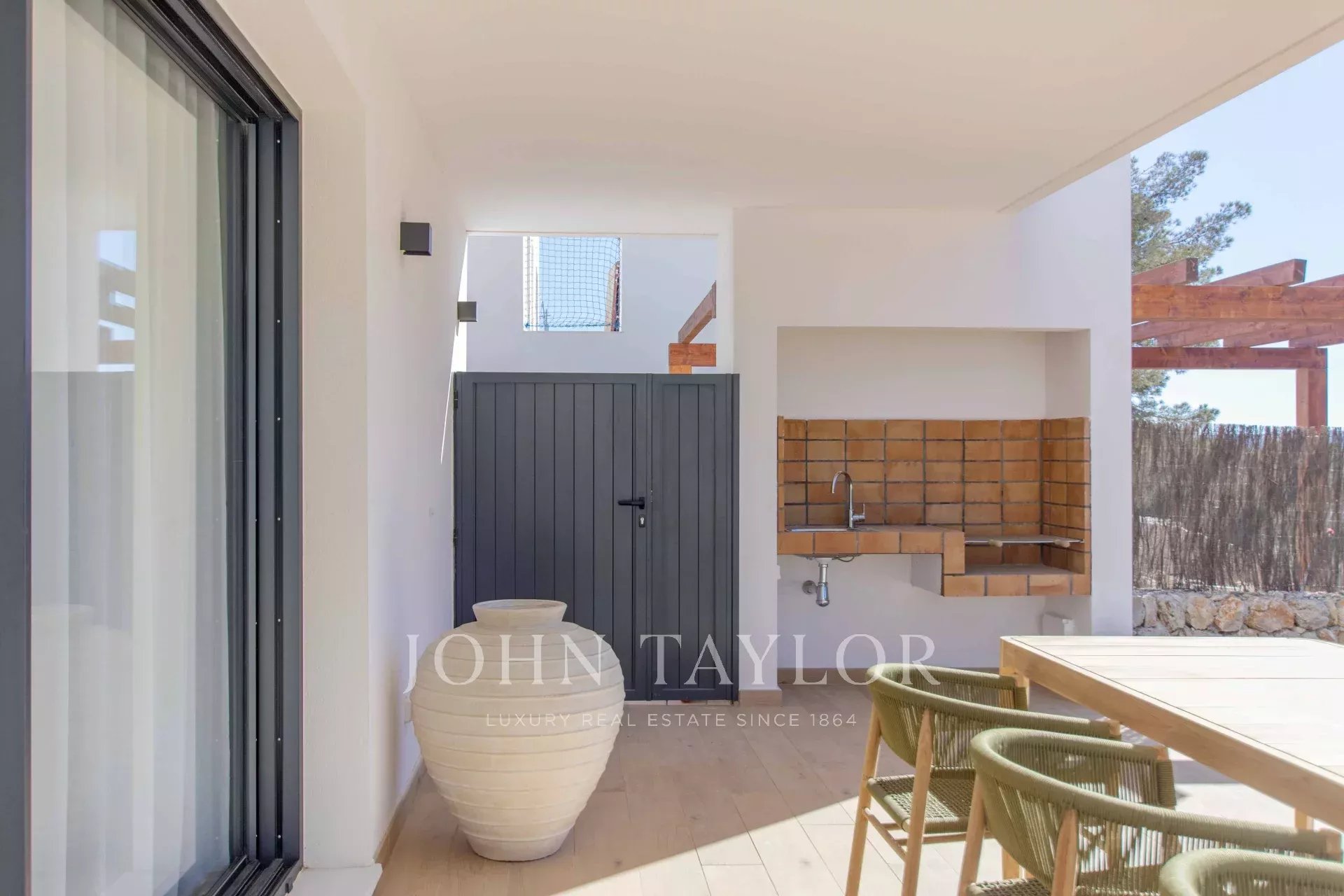 On the ground floor, you’ll find a double bedroom, a full bathroom, and a spacious open-plan living-dining area with an open kitchen. From here, step out onto the large terrace and porch with a barbecue—an ideal space for enjoying the garden and private pool.
