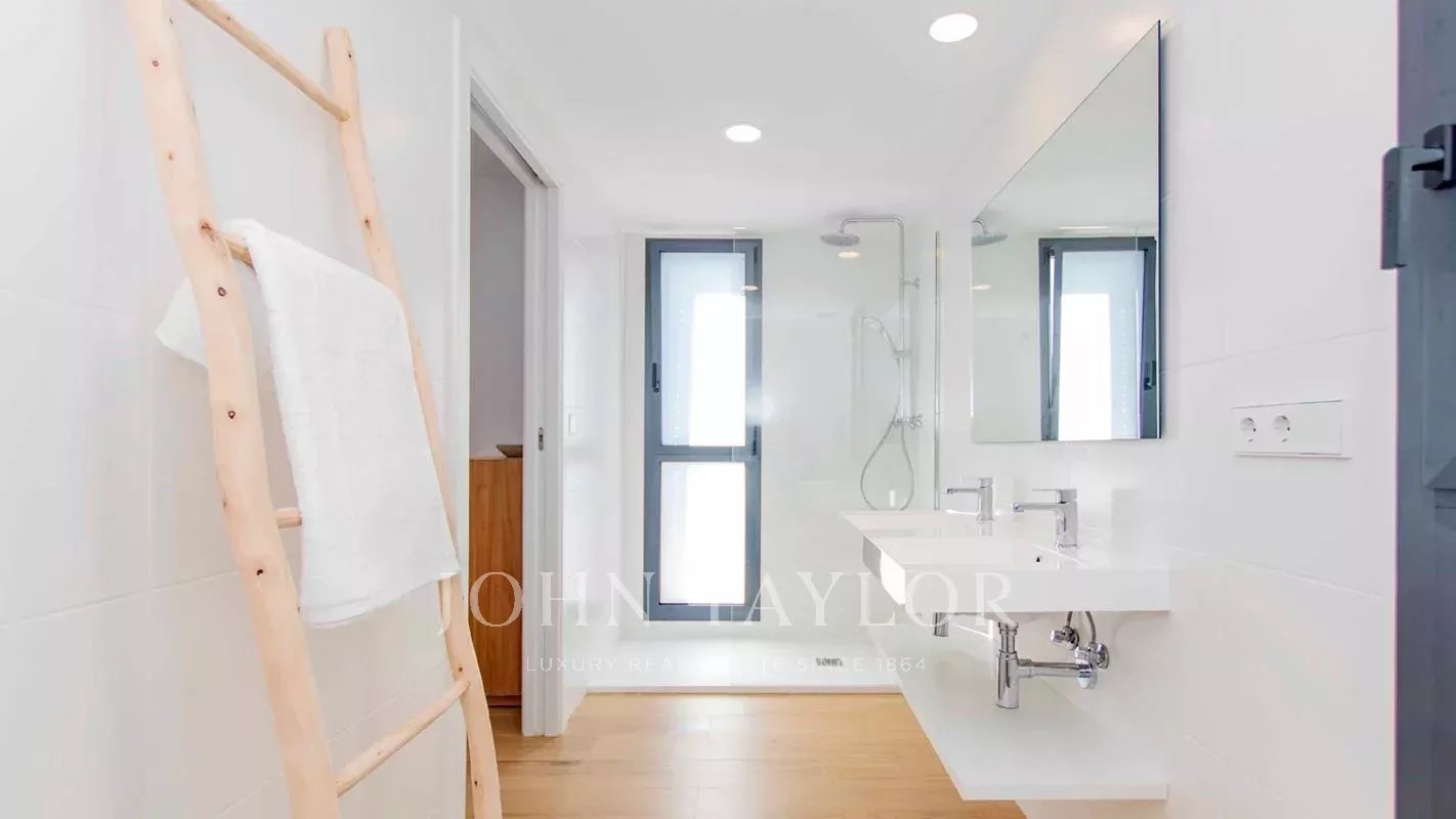 On the ground floor, you’ll find a double bedroom, a full bathroom, and a spacious open-plan living-dining area with an open kitchen. From here, step out onto the large terrace and porch with a barbecue—an ideal space for enjoying the garden and private pool.