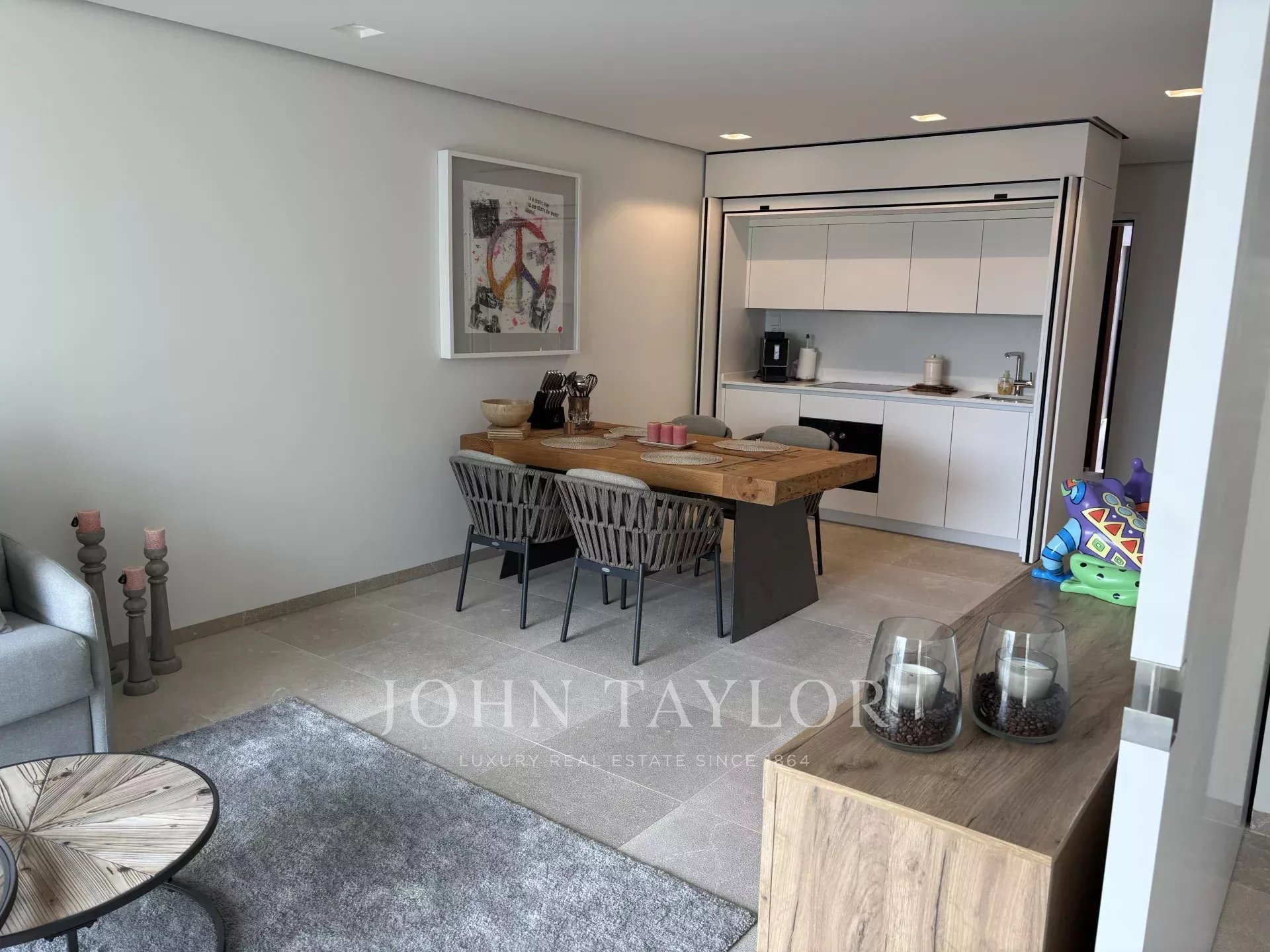 The entire building, along with the apartment—which features a bedroom with an en-suite bathroom, an open-plan living area with a kitchen, and a private parking space has been meticulously designed by the renowned architect Javier Armbruster.