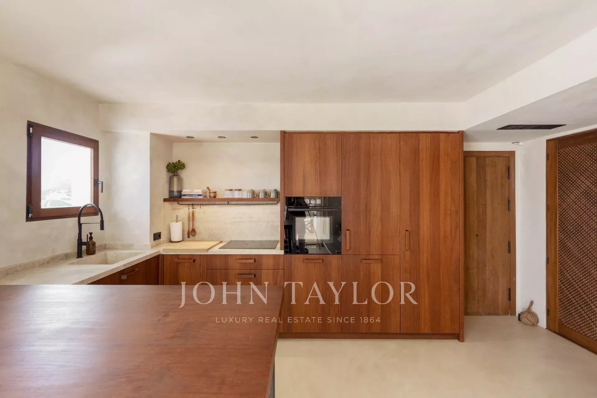 The interior design is contemporary and sophisticated, featuring microcement floors, underfloor heating, and floor-to-ceiling windows that flood the space with natural light.