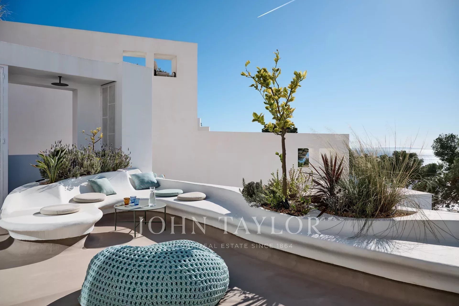 The private terrace is perfect for unwinding, with a built-in Ibizan-style chill-out area, ideal for enjoying the sun and the stunning Mediterranean views.