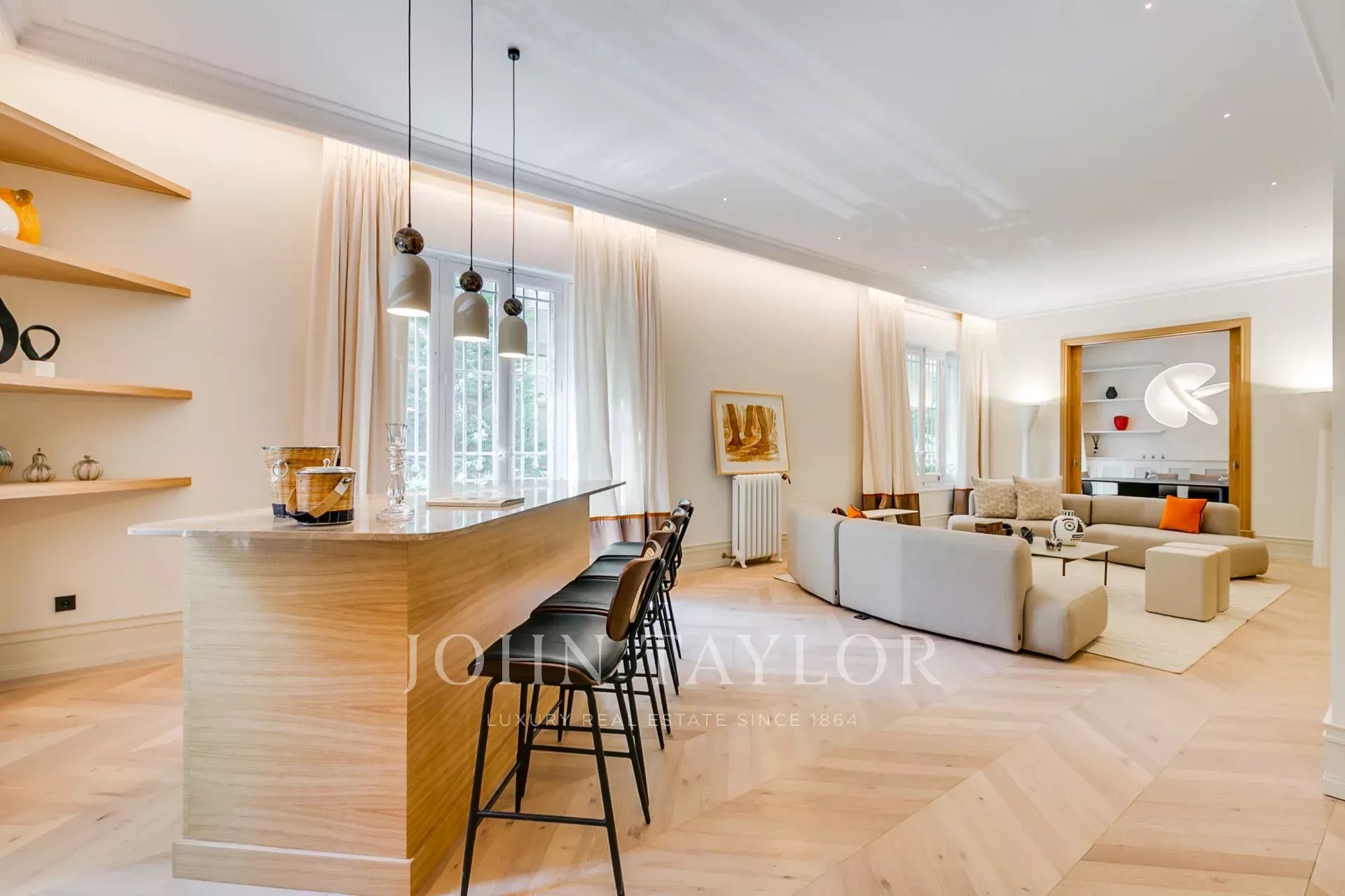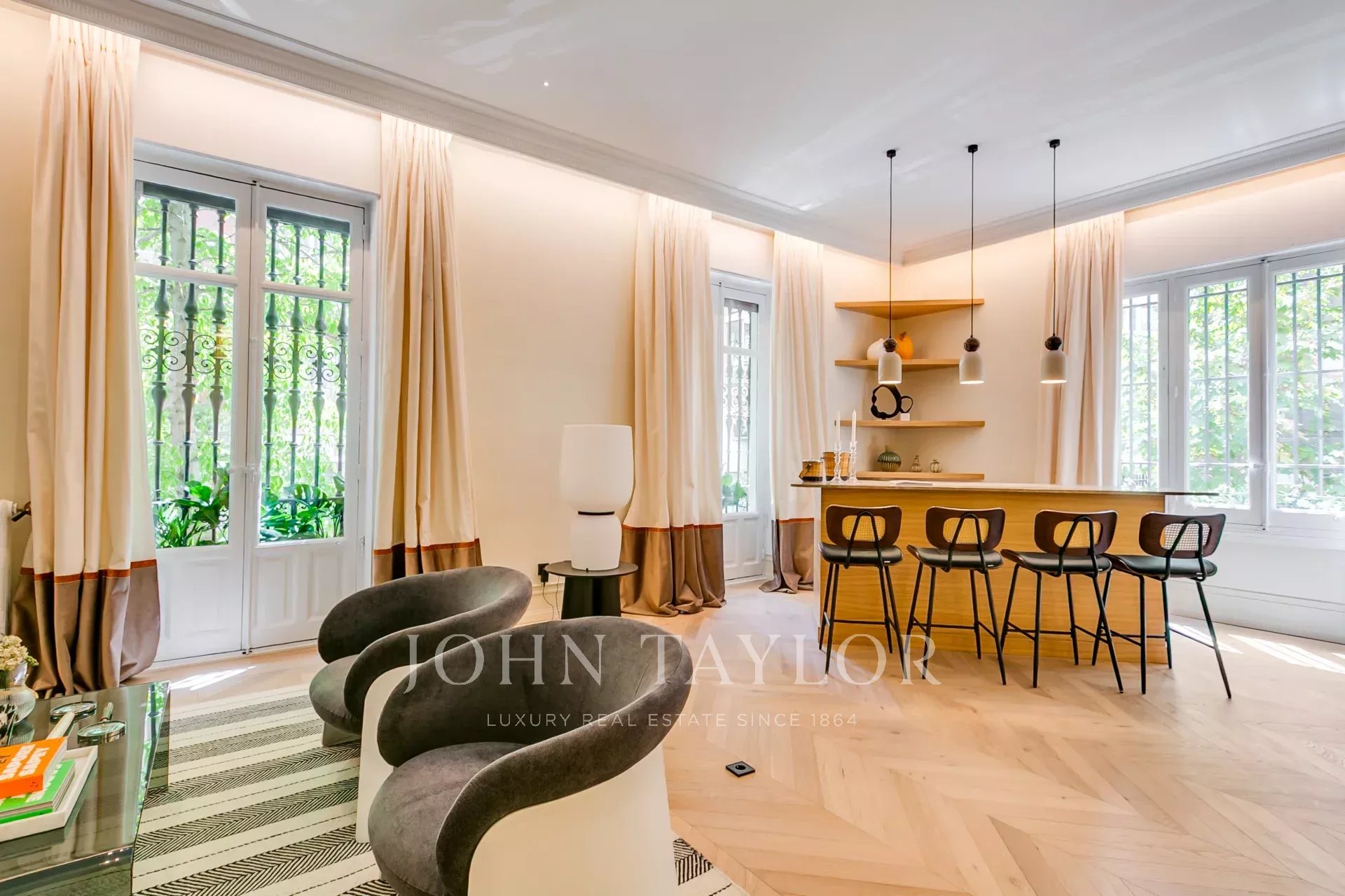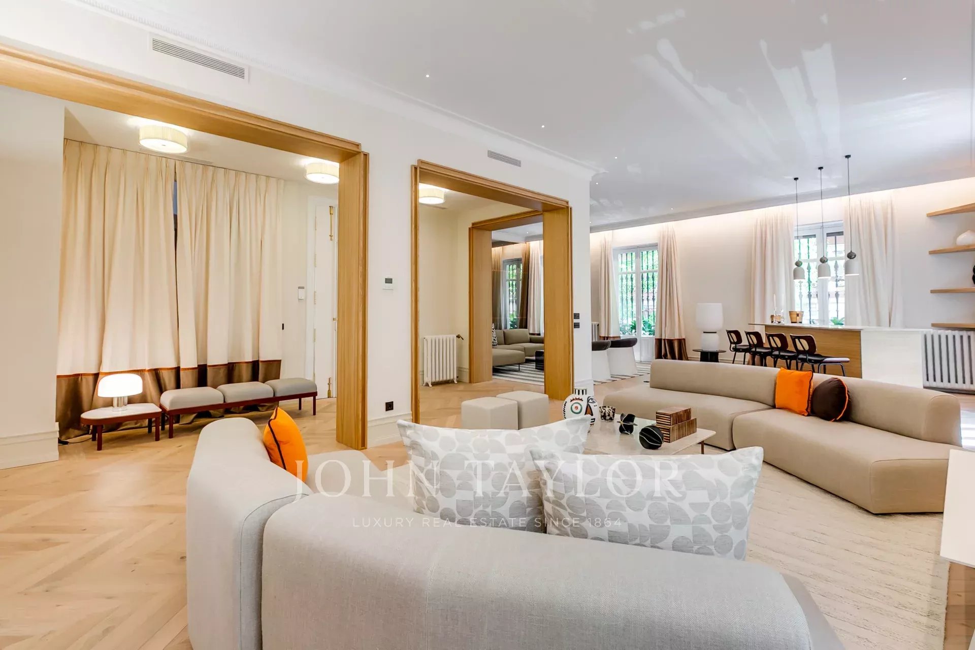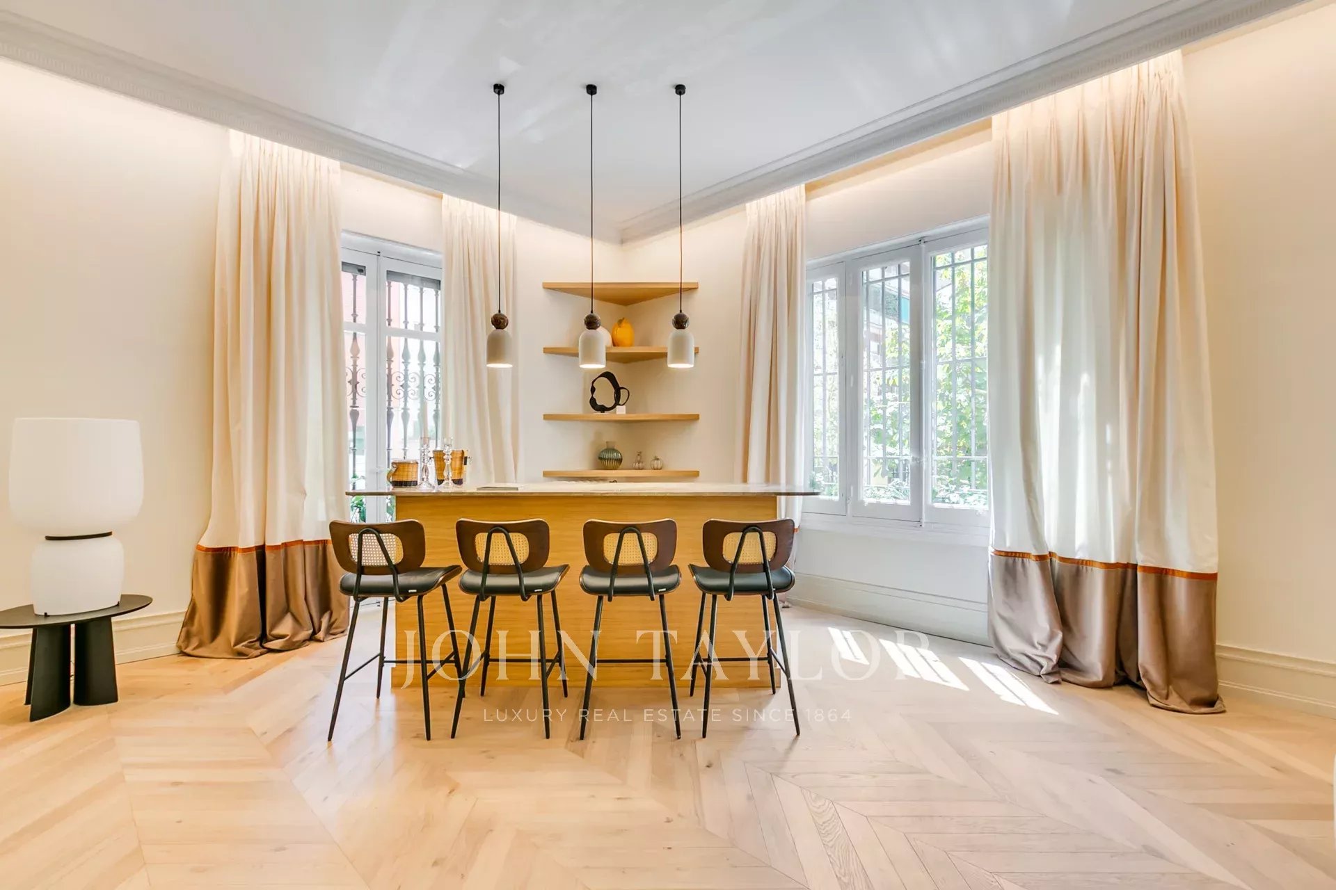 In a beautiful early 20th-century building with a classic façade in the heart of the Salamanca district, we find this fabulous renovated and furnished property next to Madrid's Golden Mile. It is located on a first floor with four beautiful windows overlooking the street and another 10 windows overlooking a private community garden.