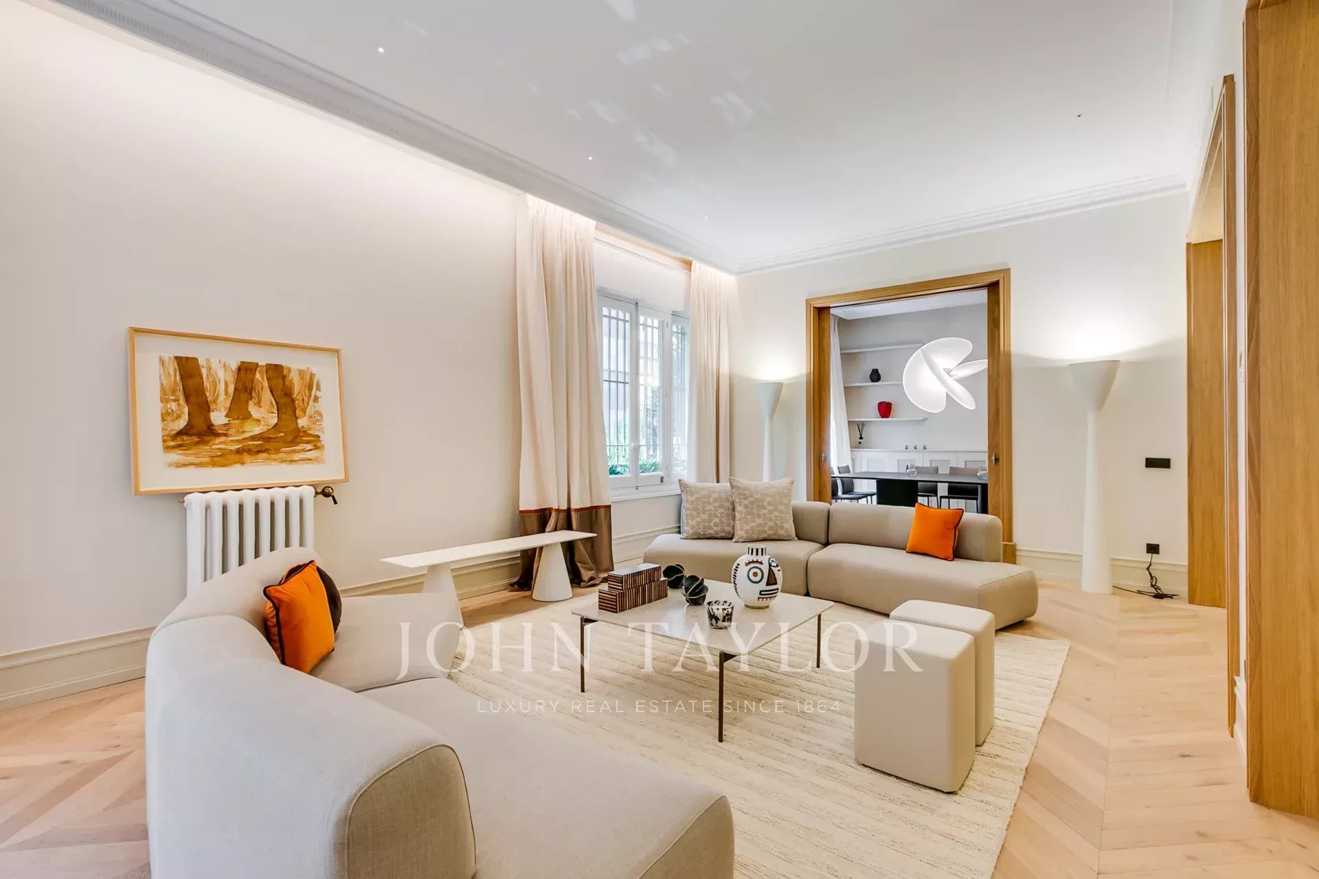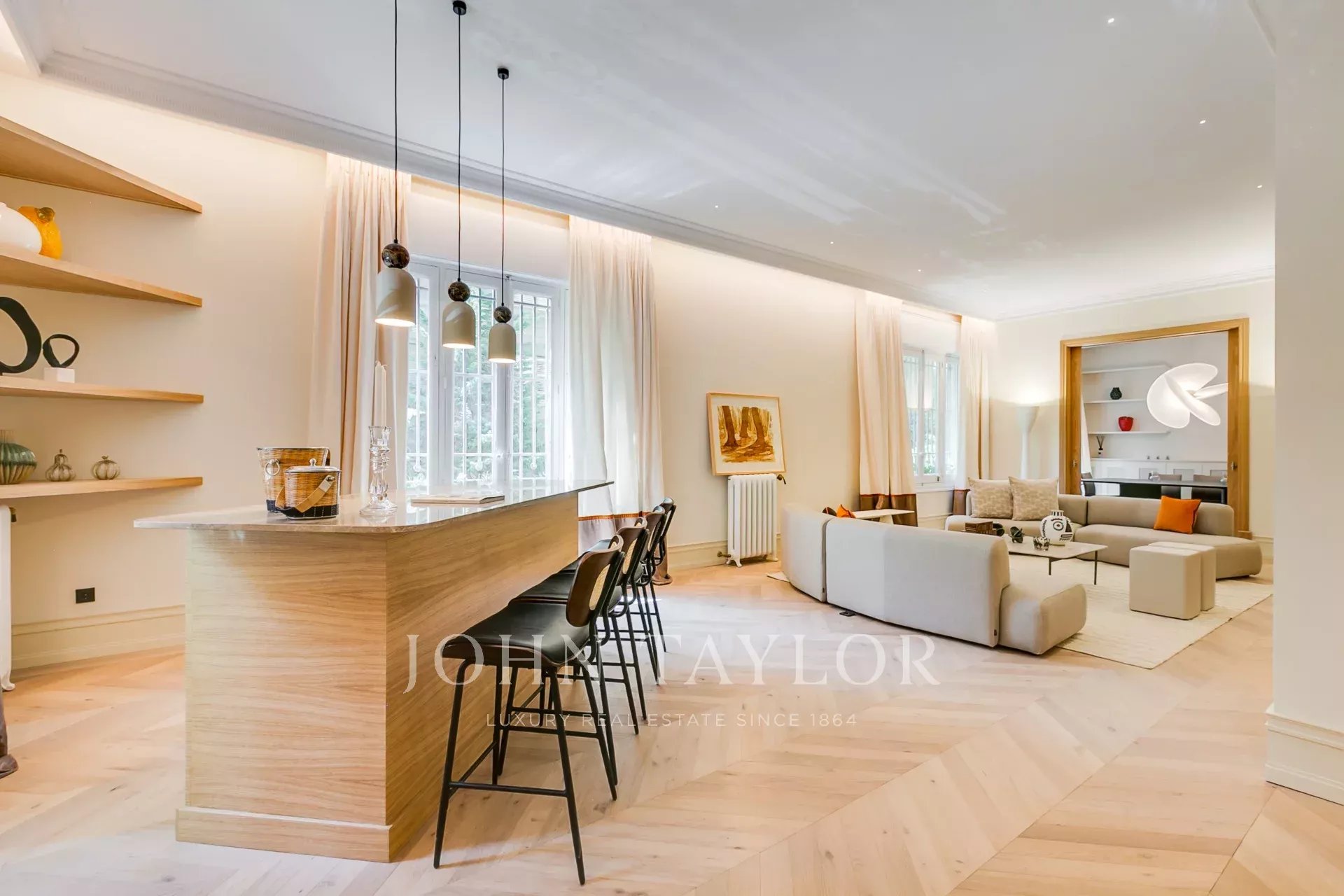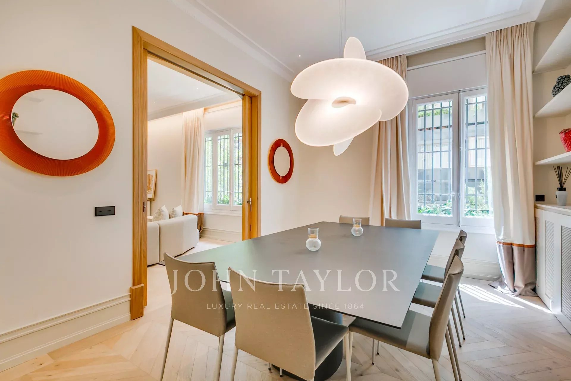 The private area includes four bedrooms, all with en-suite bathrooms and views of the communal garden. The master bedroom stands out, offering three good spaces with a sitting area, sleeping area and large dressing room-bathroom.