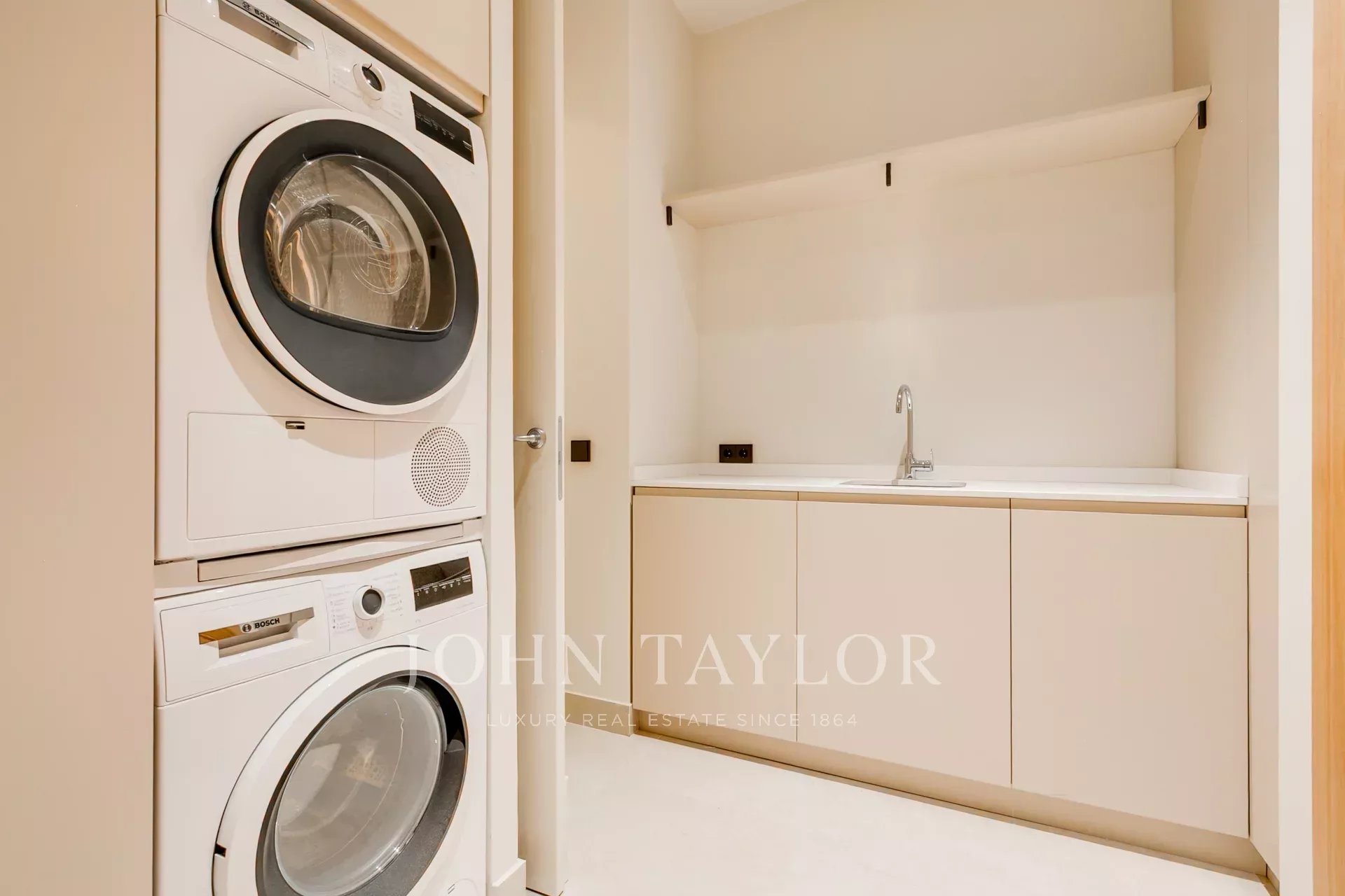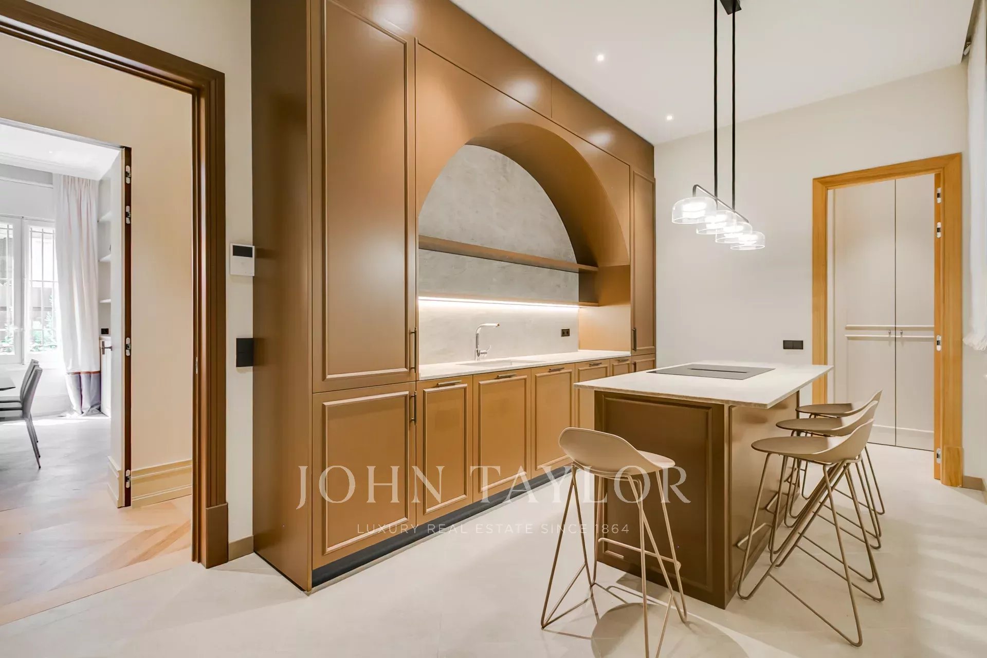 The social area is an open space with a living room, TV room or office, bar area and dining room. In this area, there is also a guest toilet. Next to this area is a spectacular independent designer kitchen, which has a laundry room and a room and bathroom for service.