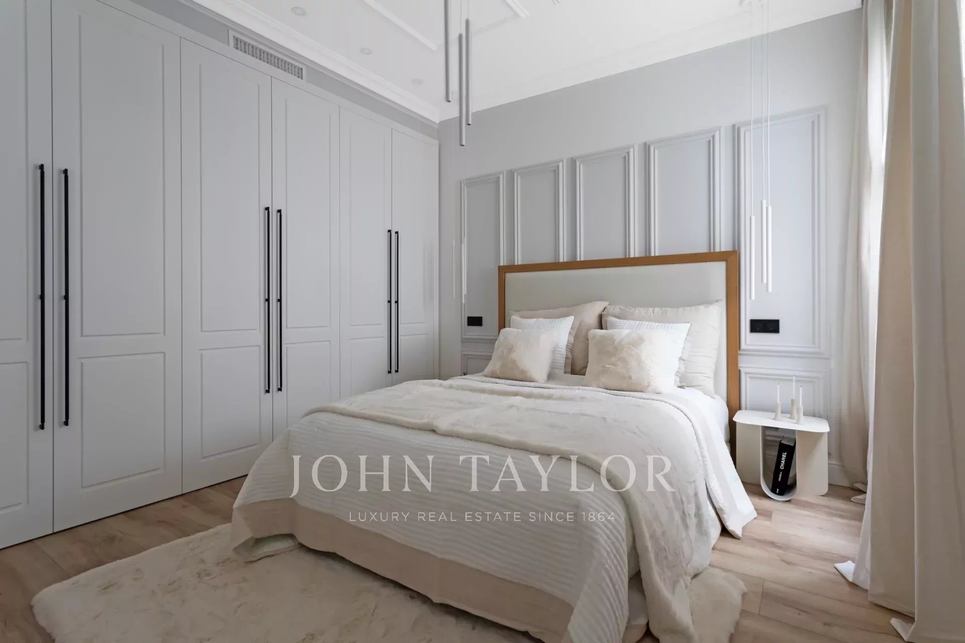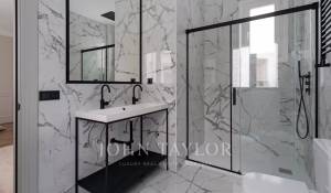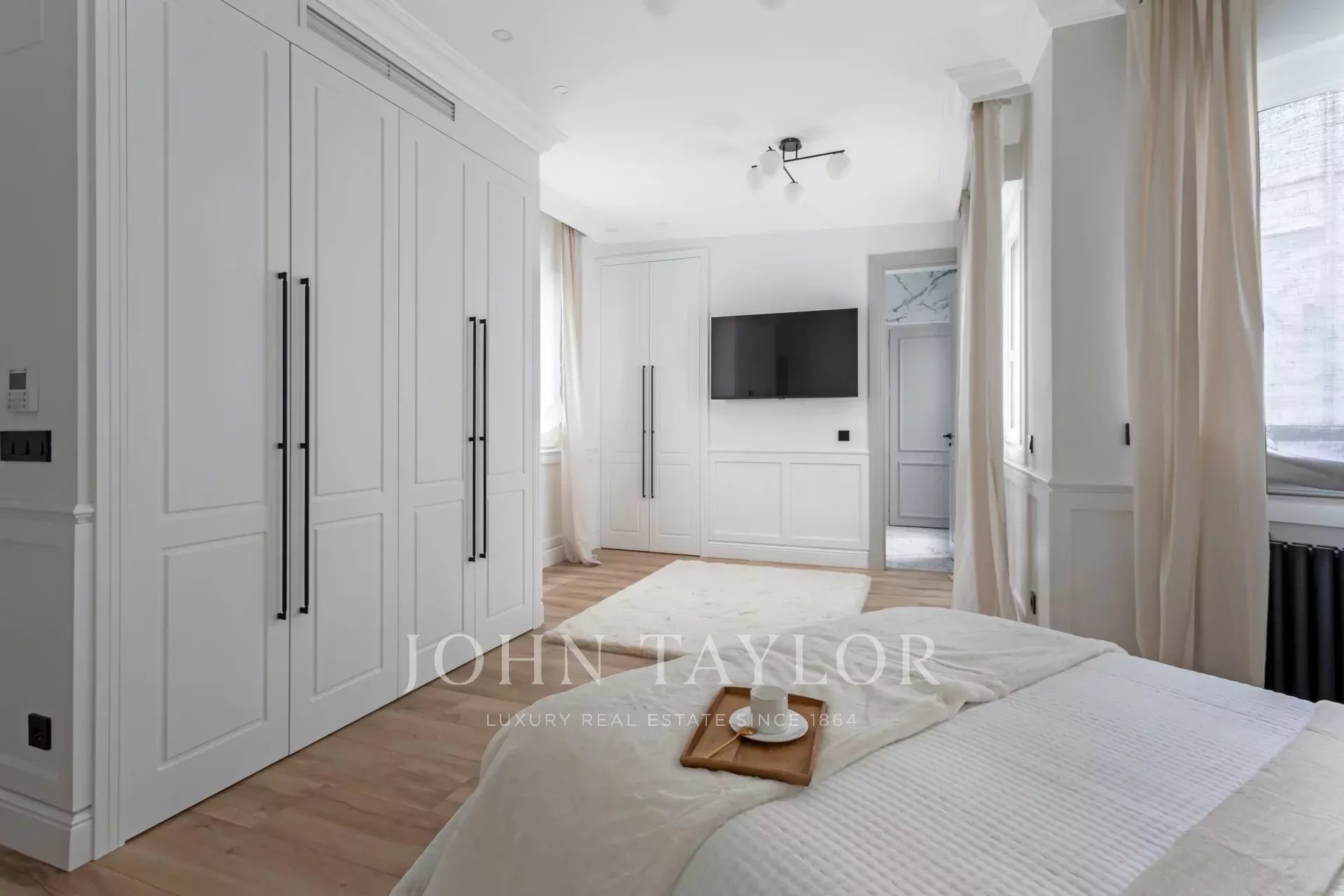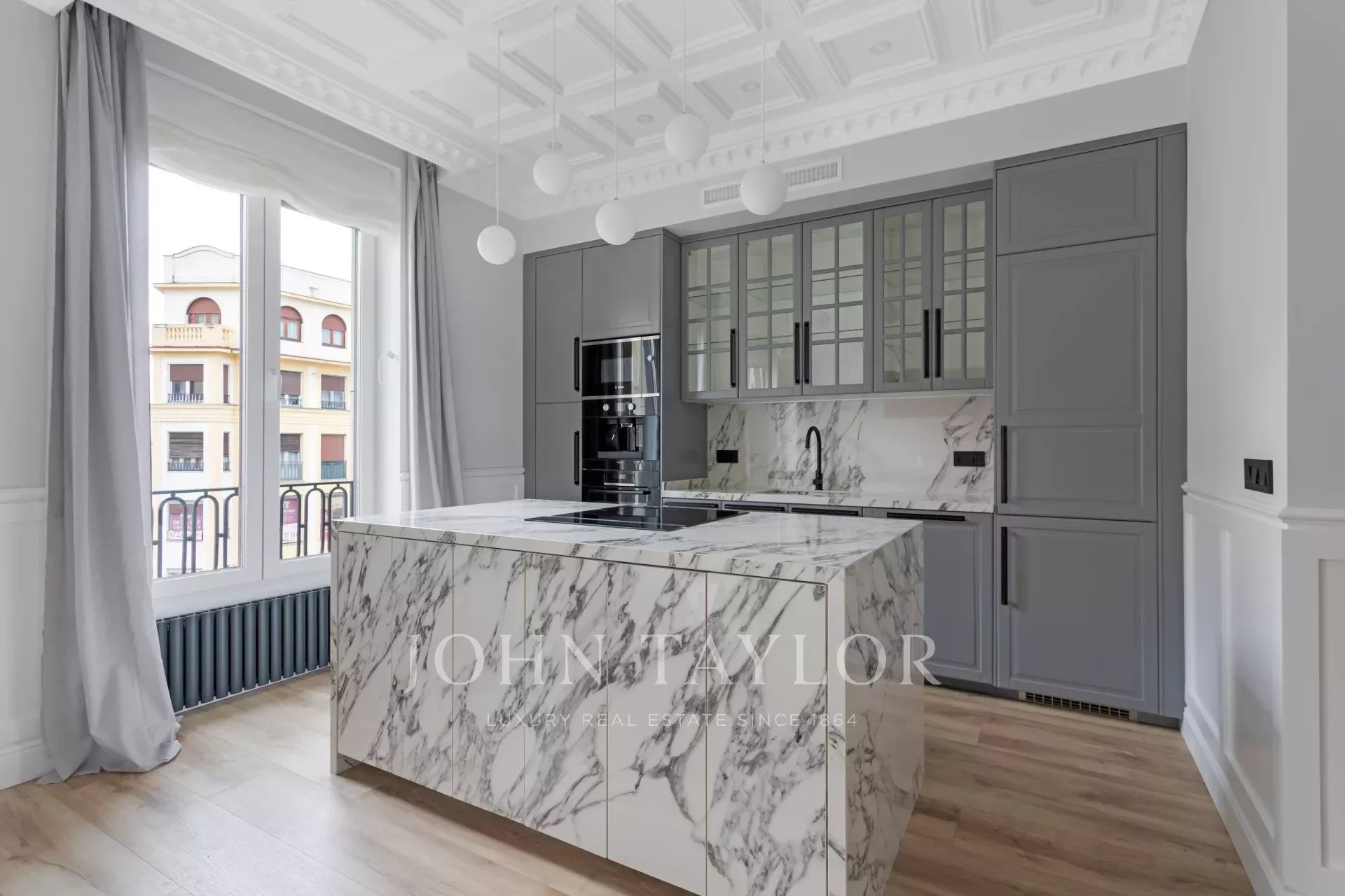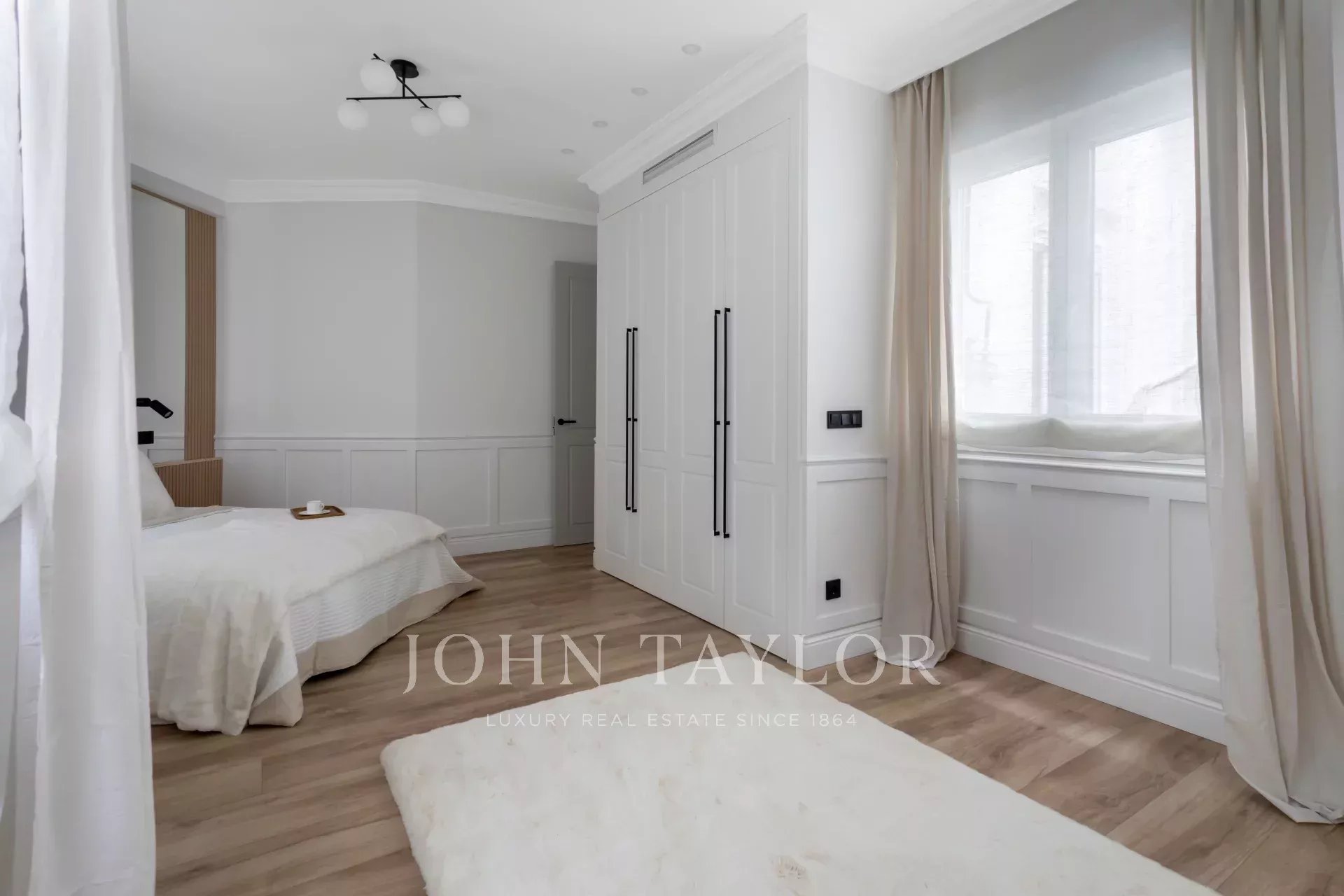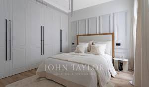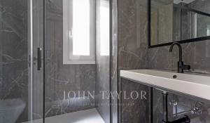A newly renovated apartment located on the fifth floor of a beautiful building with a classic facade.